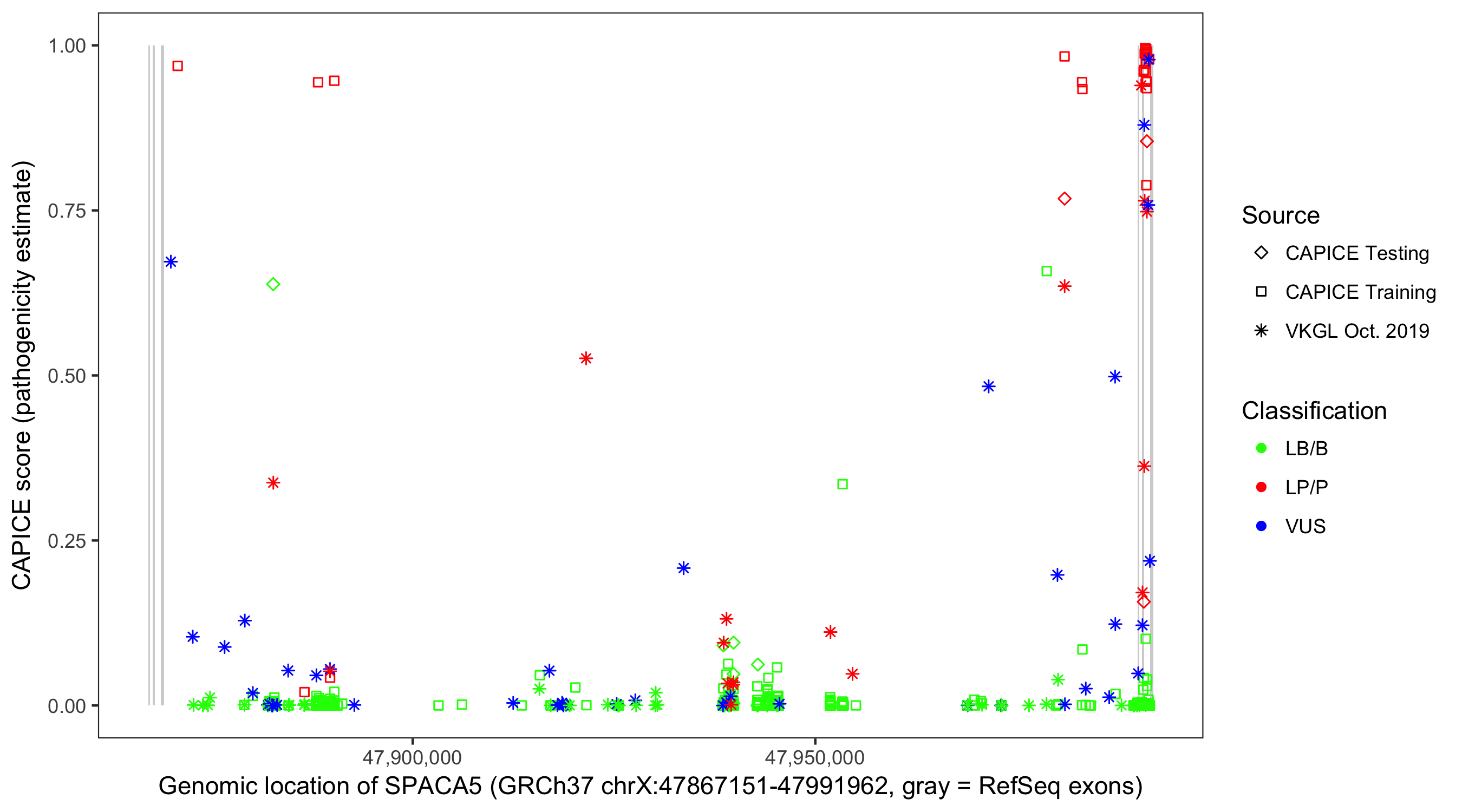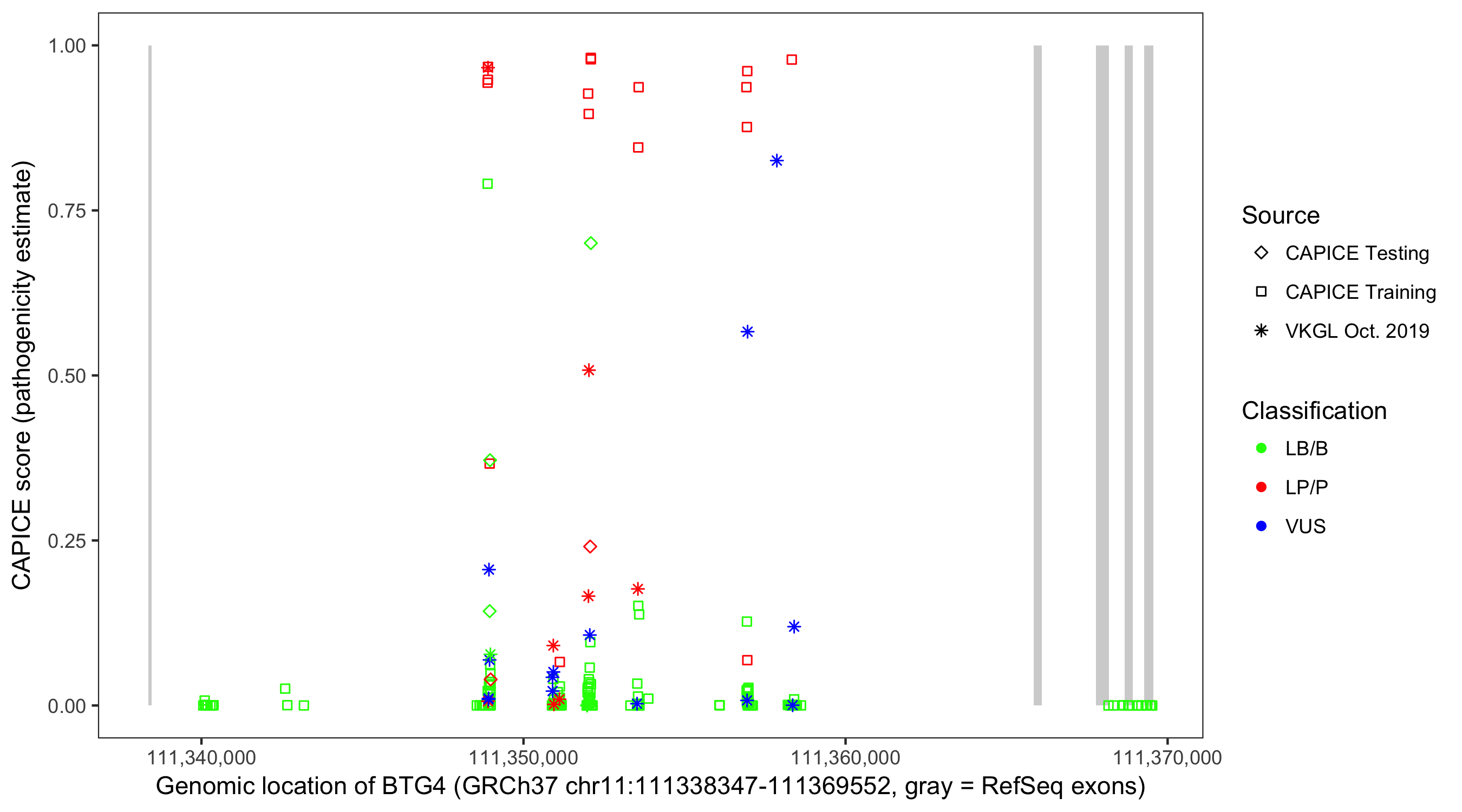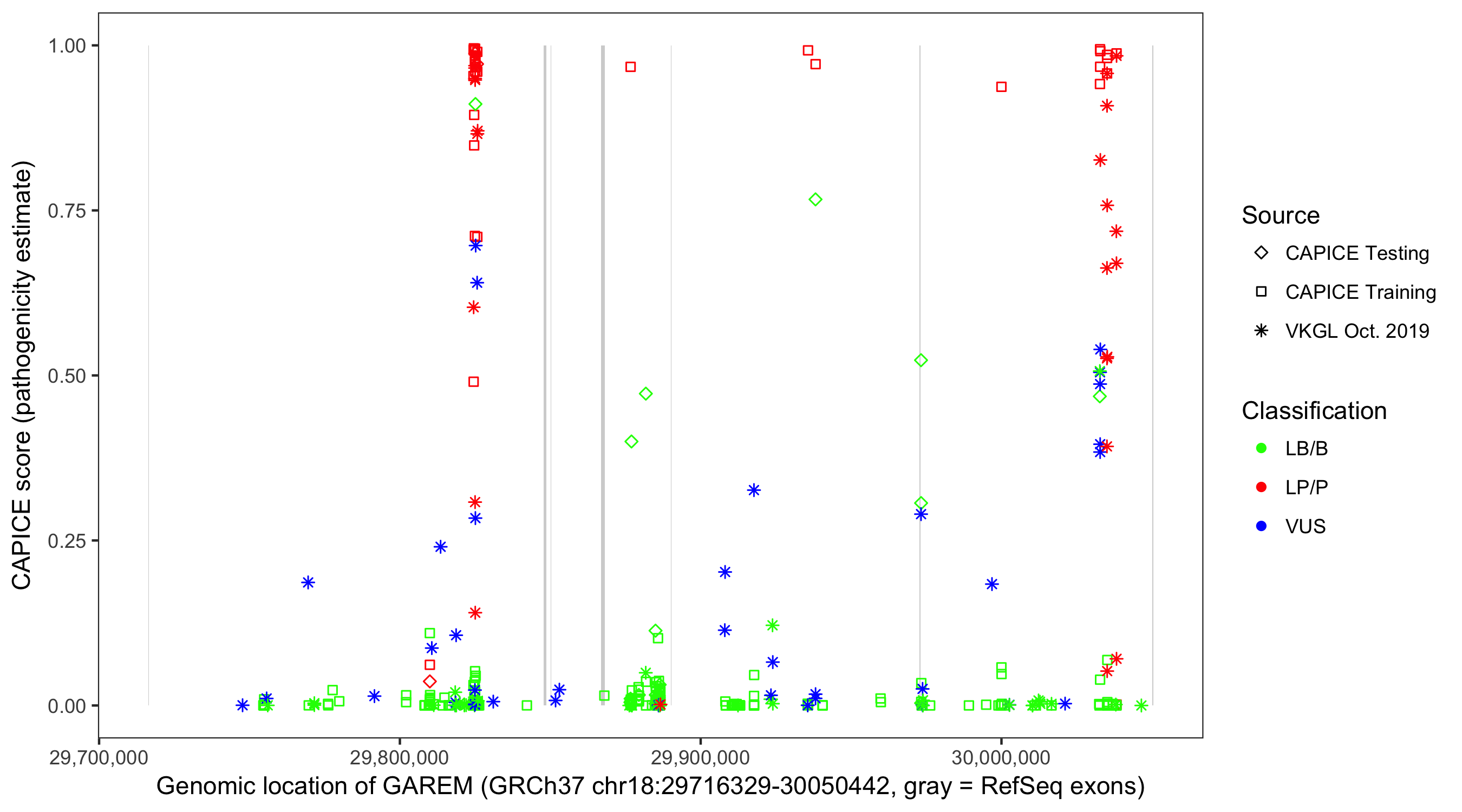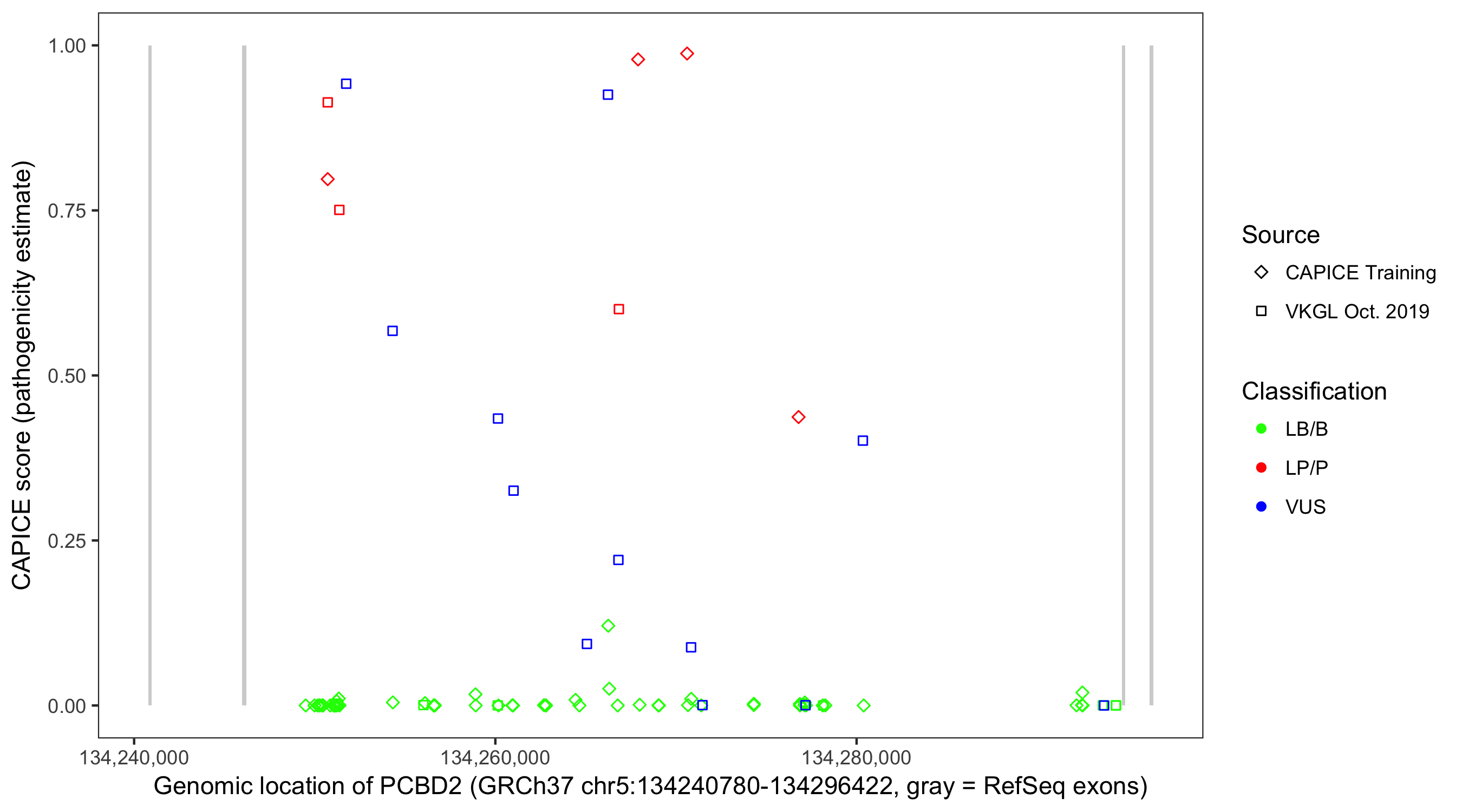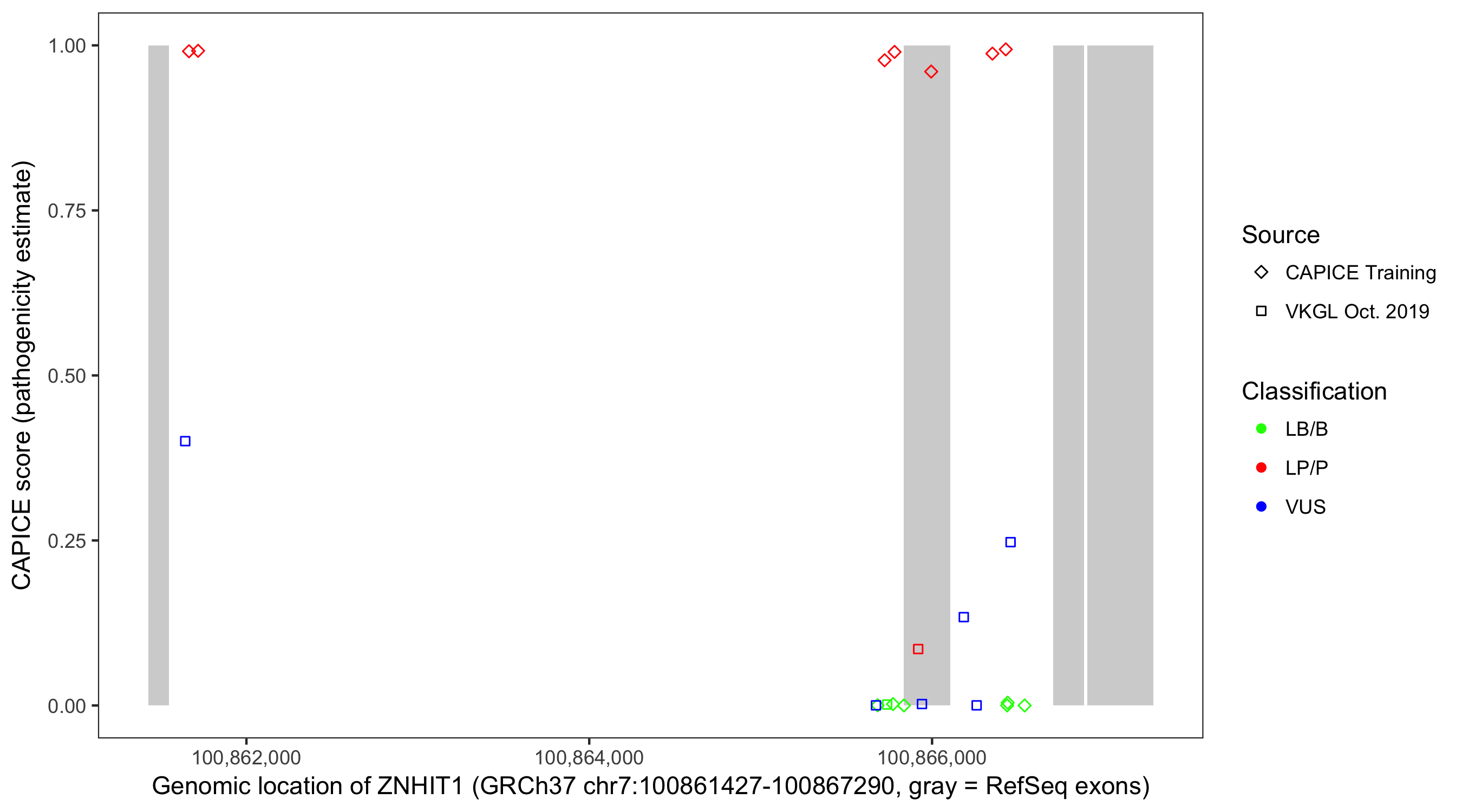 Shown are CAPICE train/test variants plus VKGL Oct 2019.