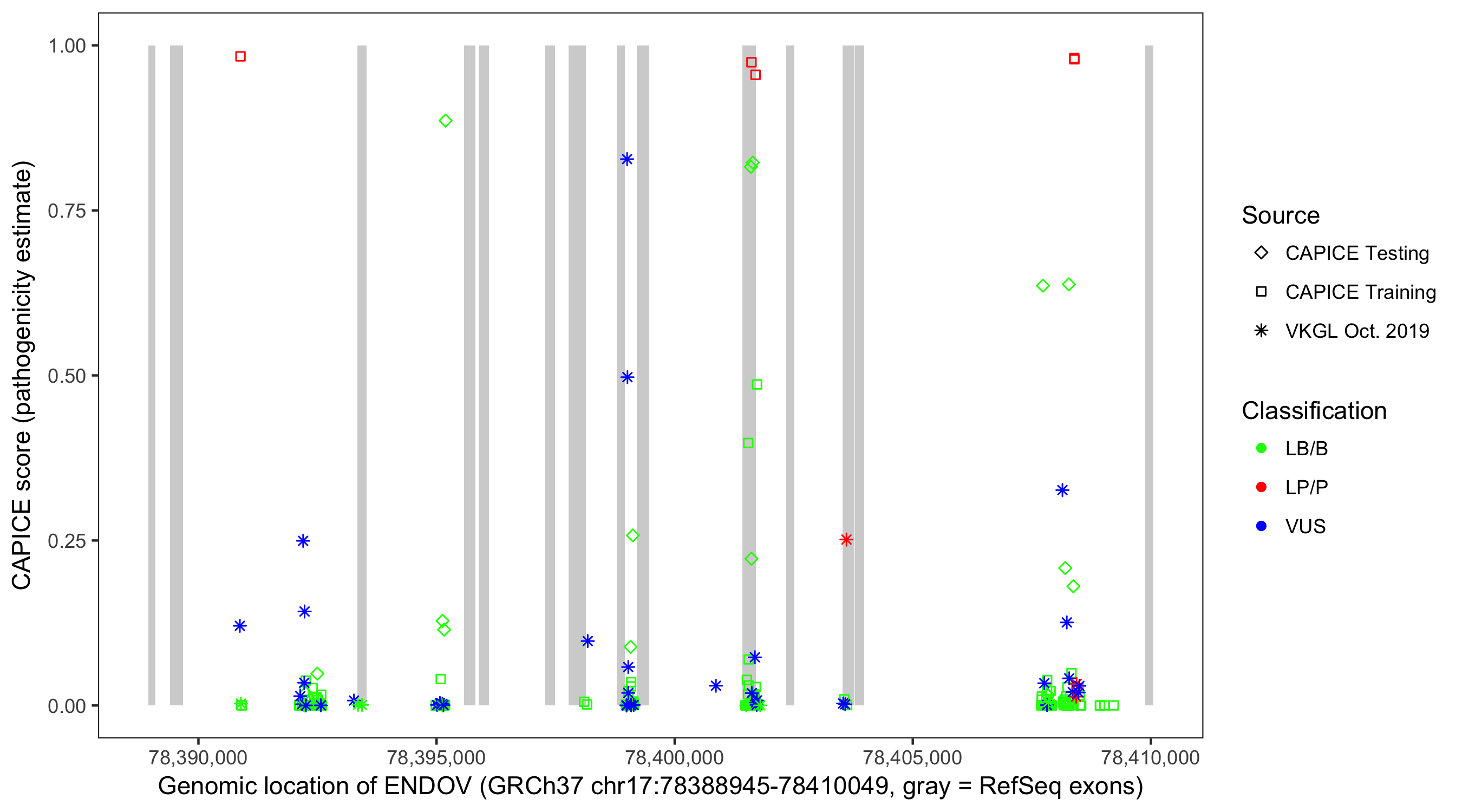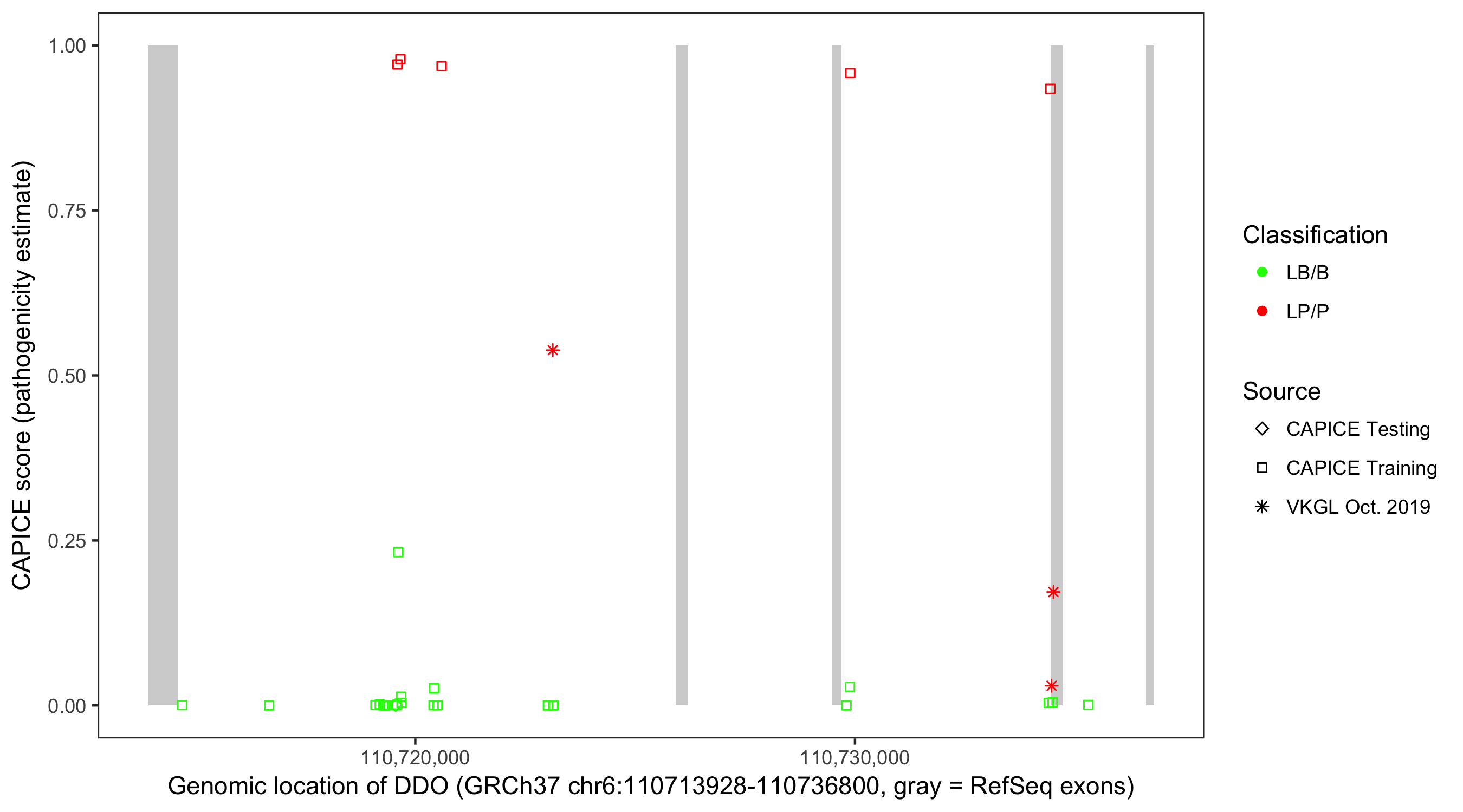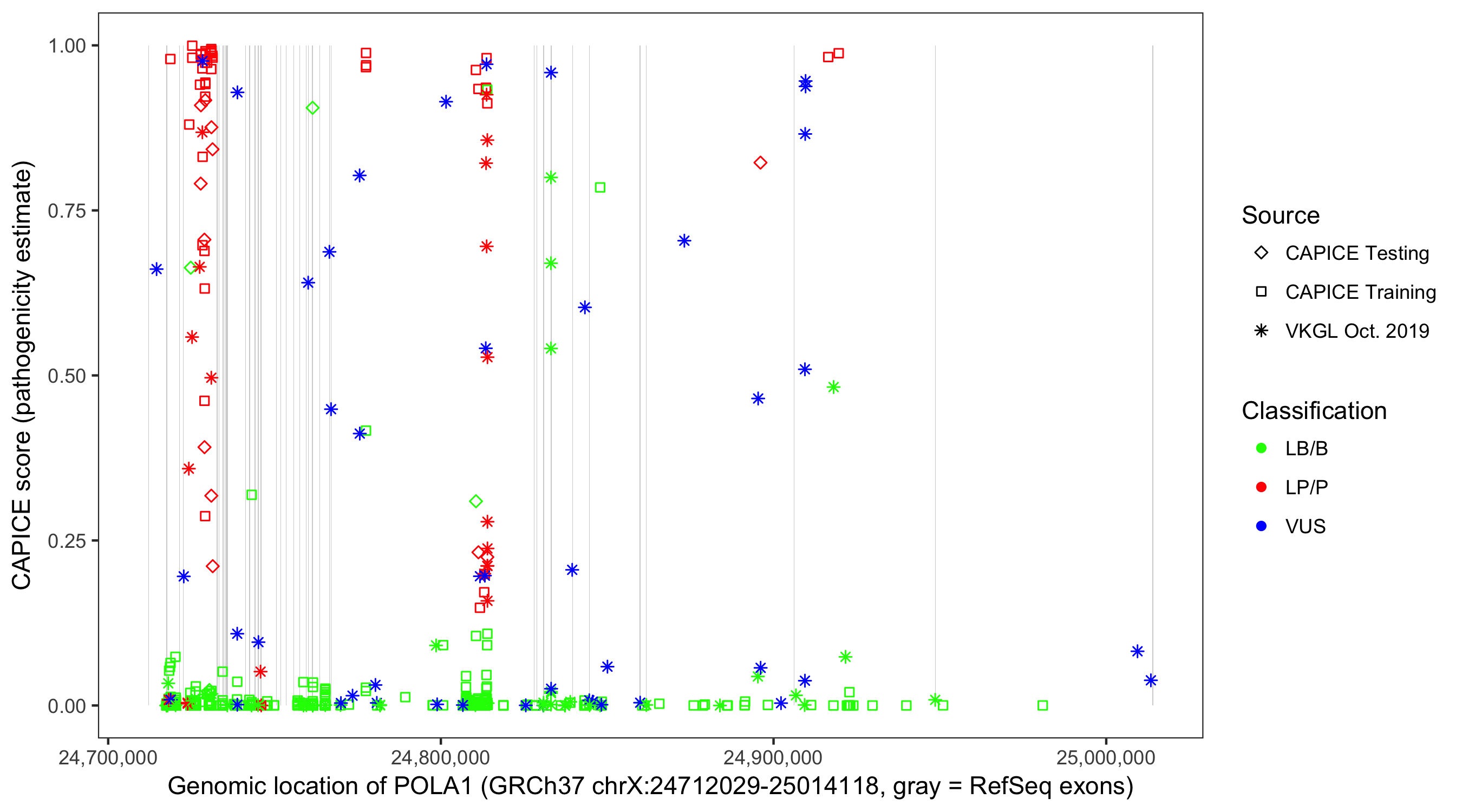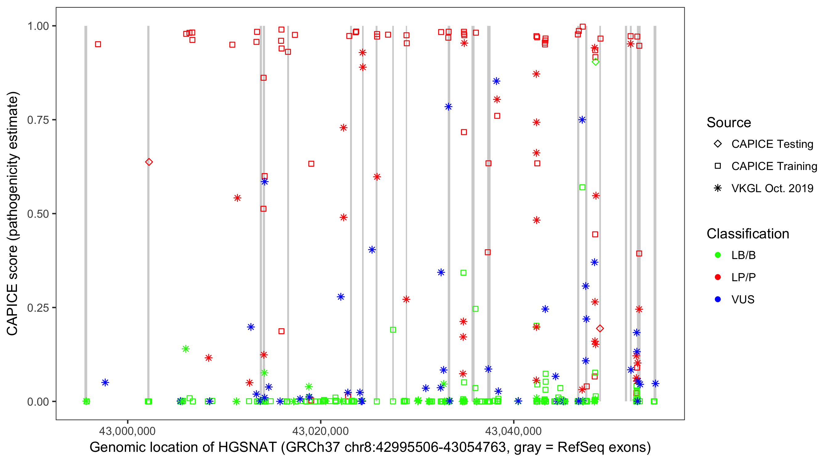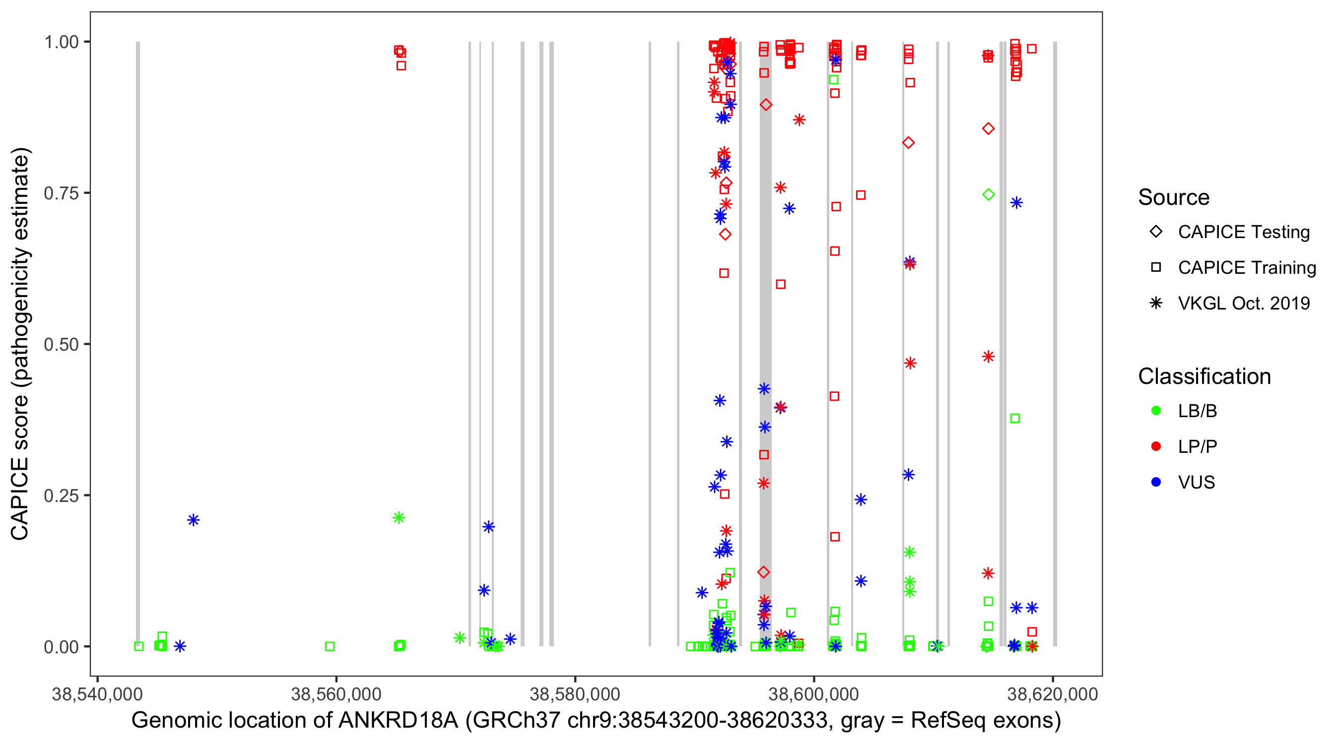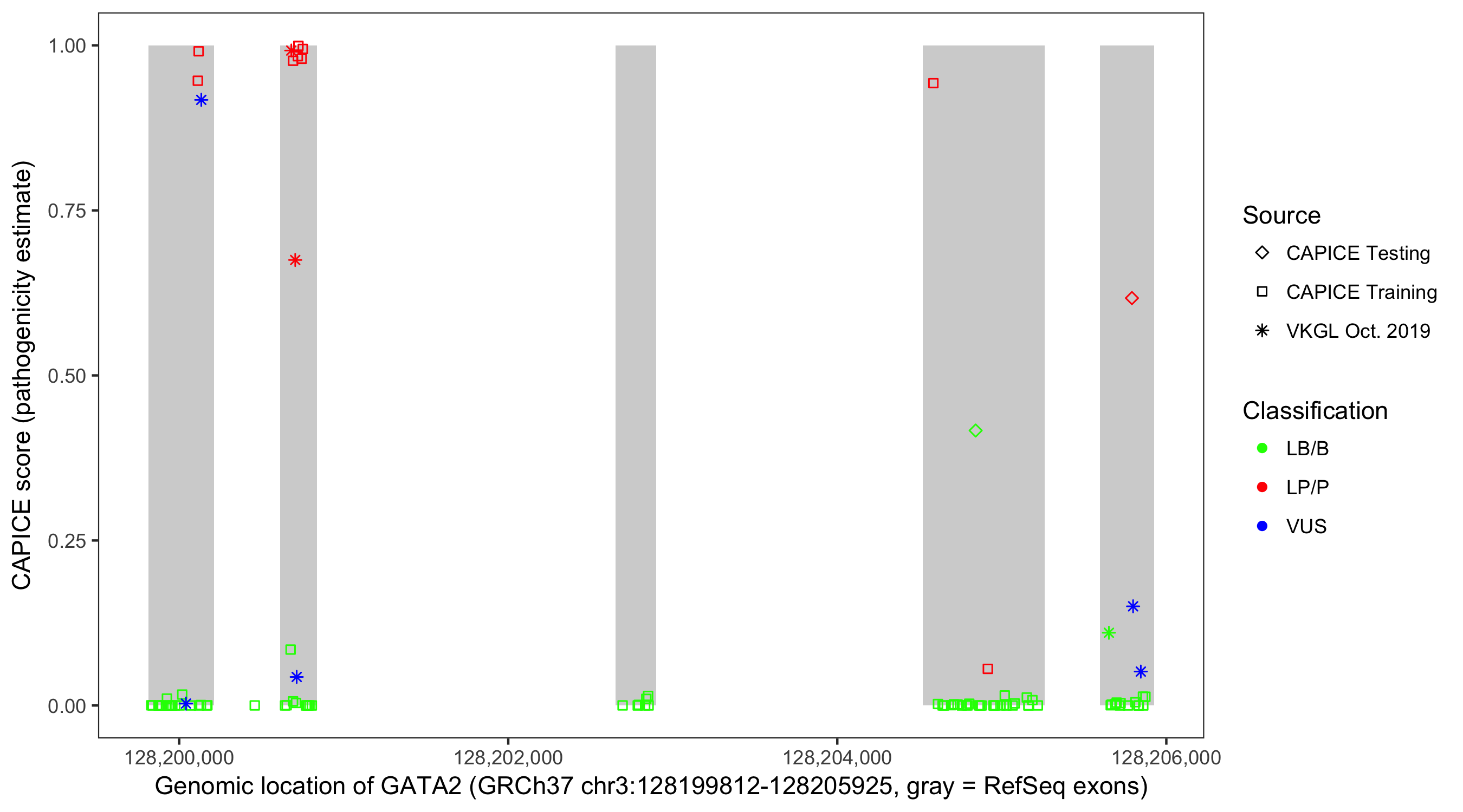 Shown are CAPICE train/test variants plus VKGL Oct 2019.