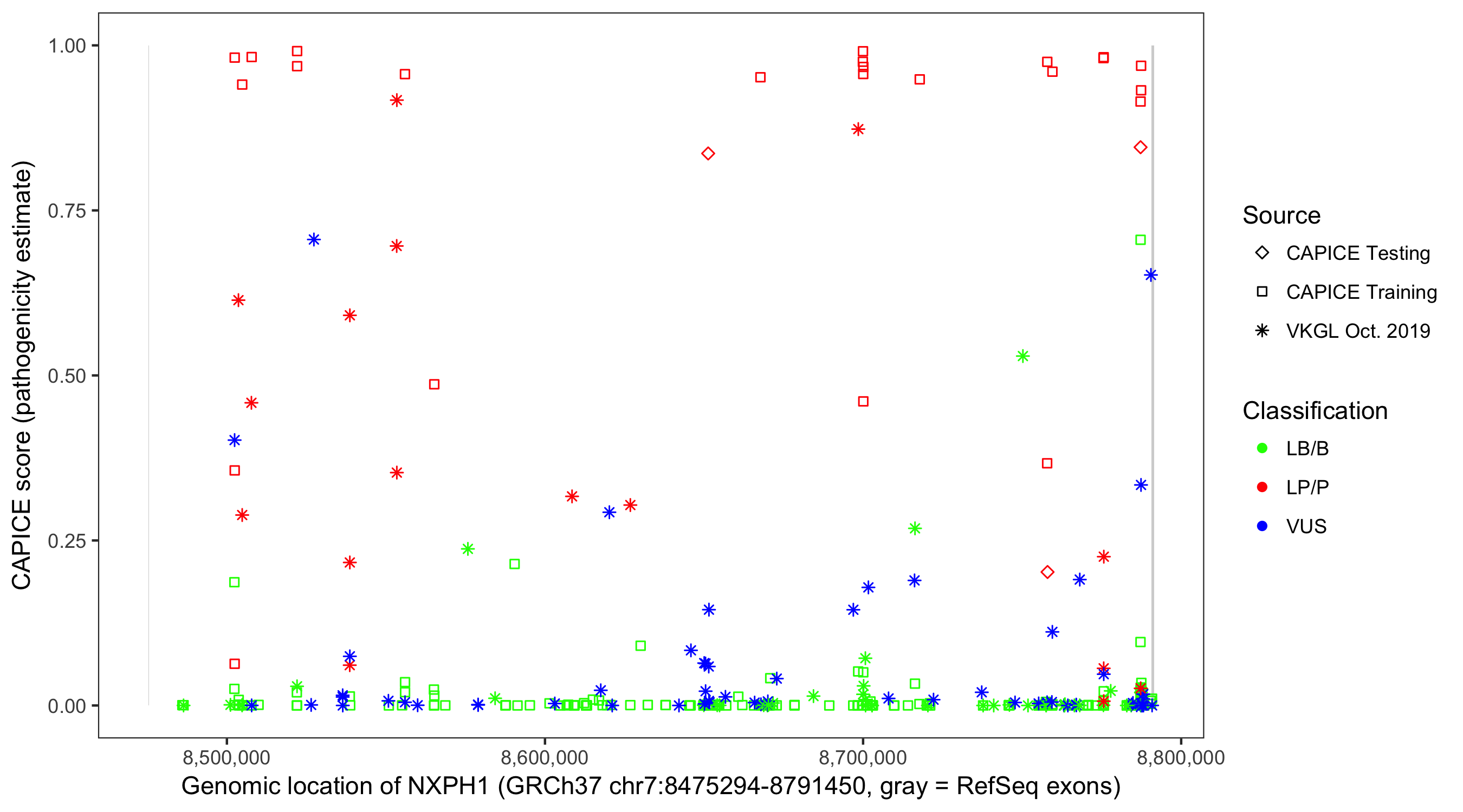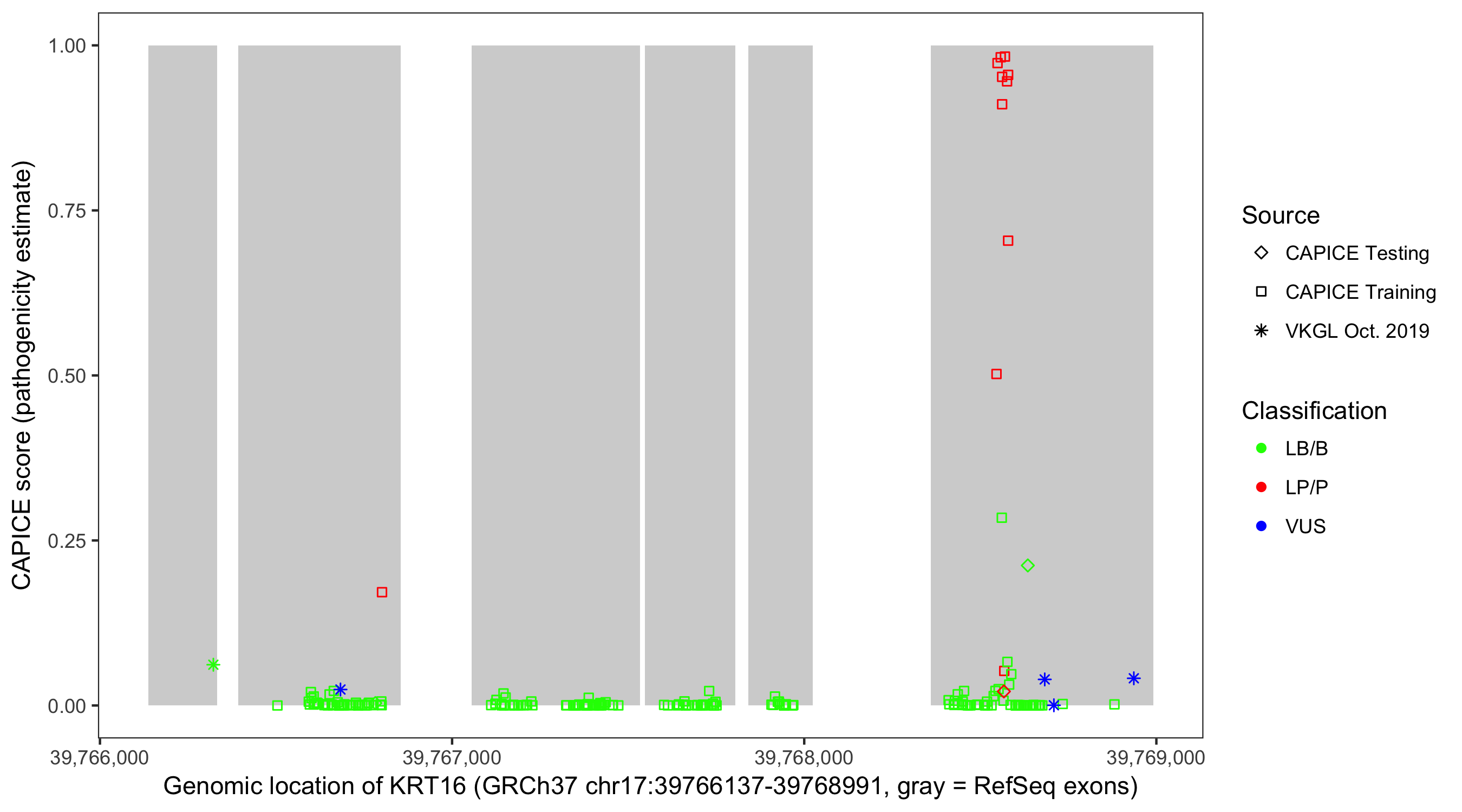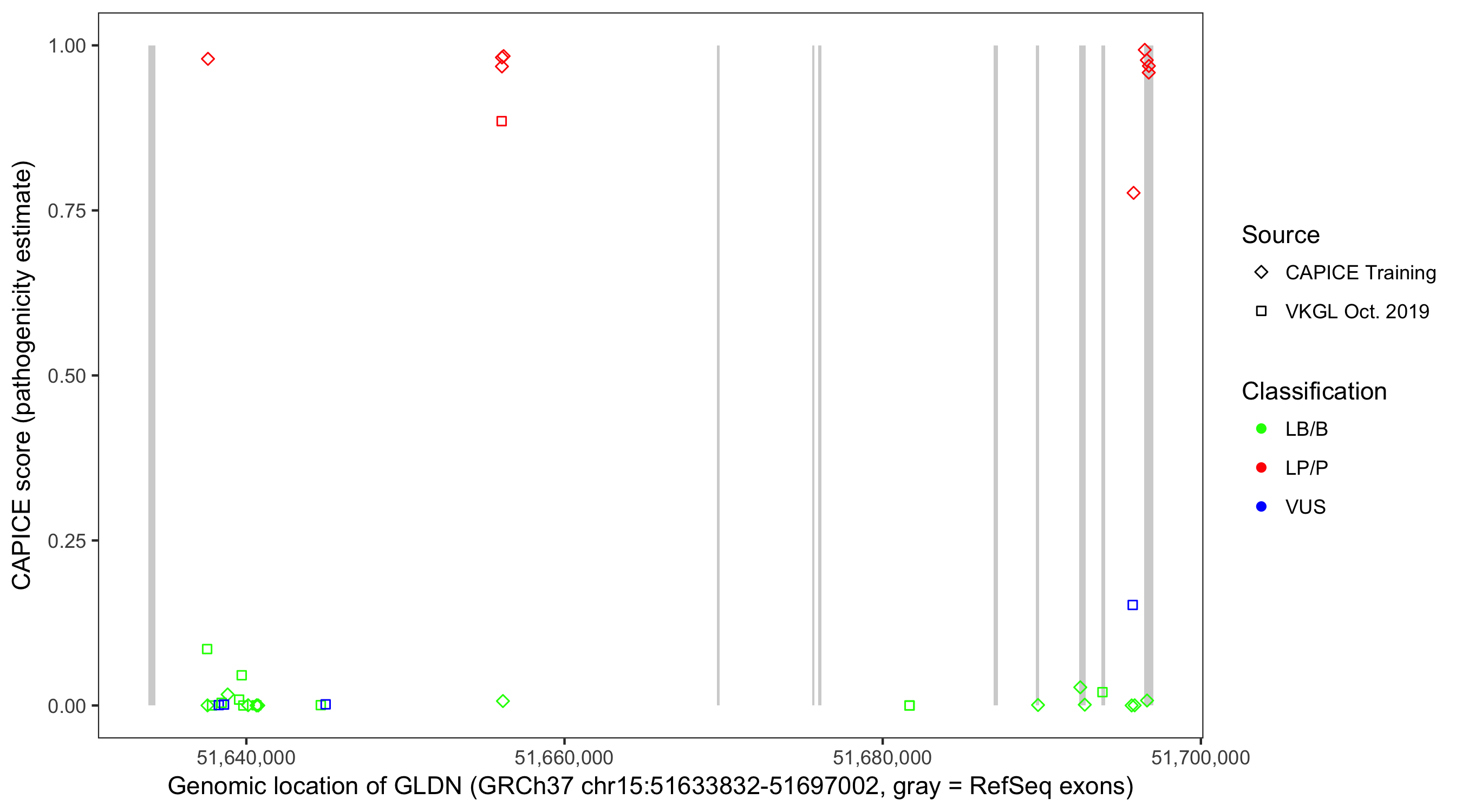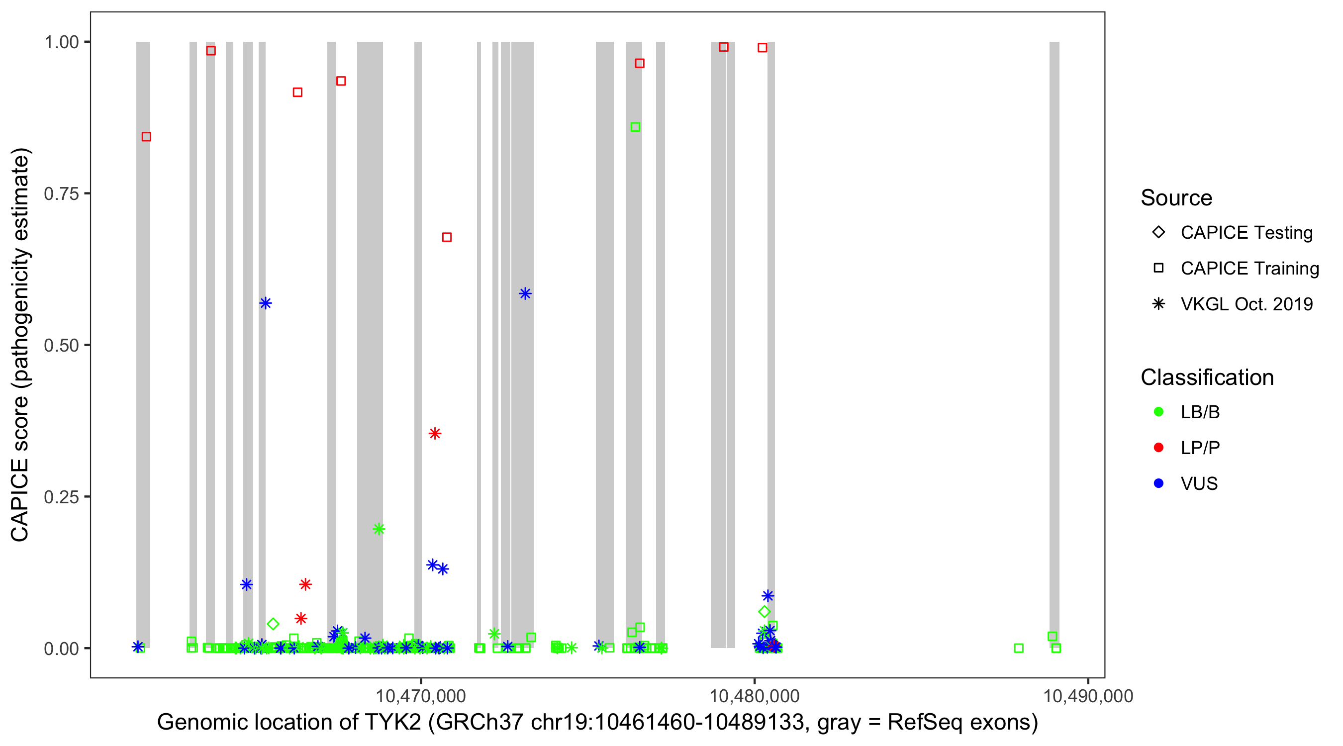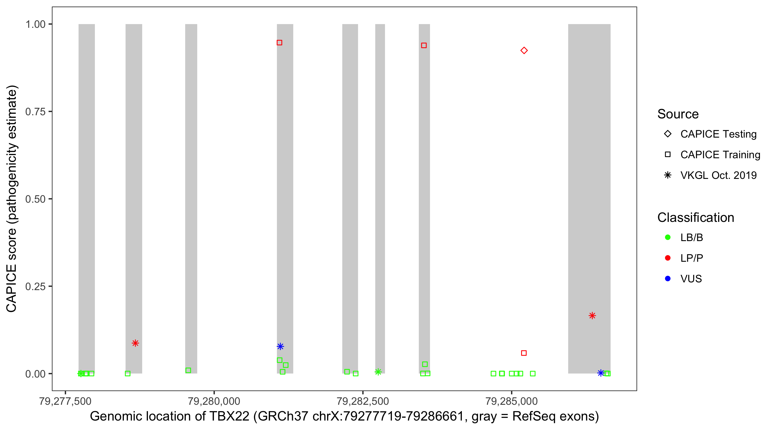 Shown are CAPICE train/test variants plus VKGL Oct 2019.