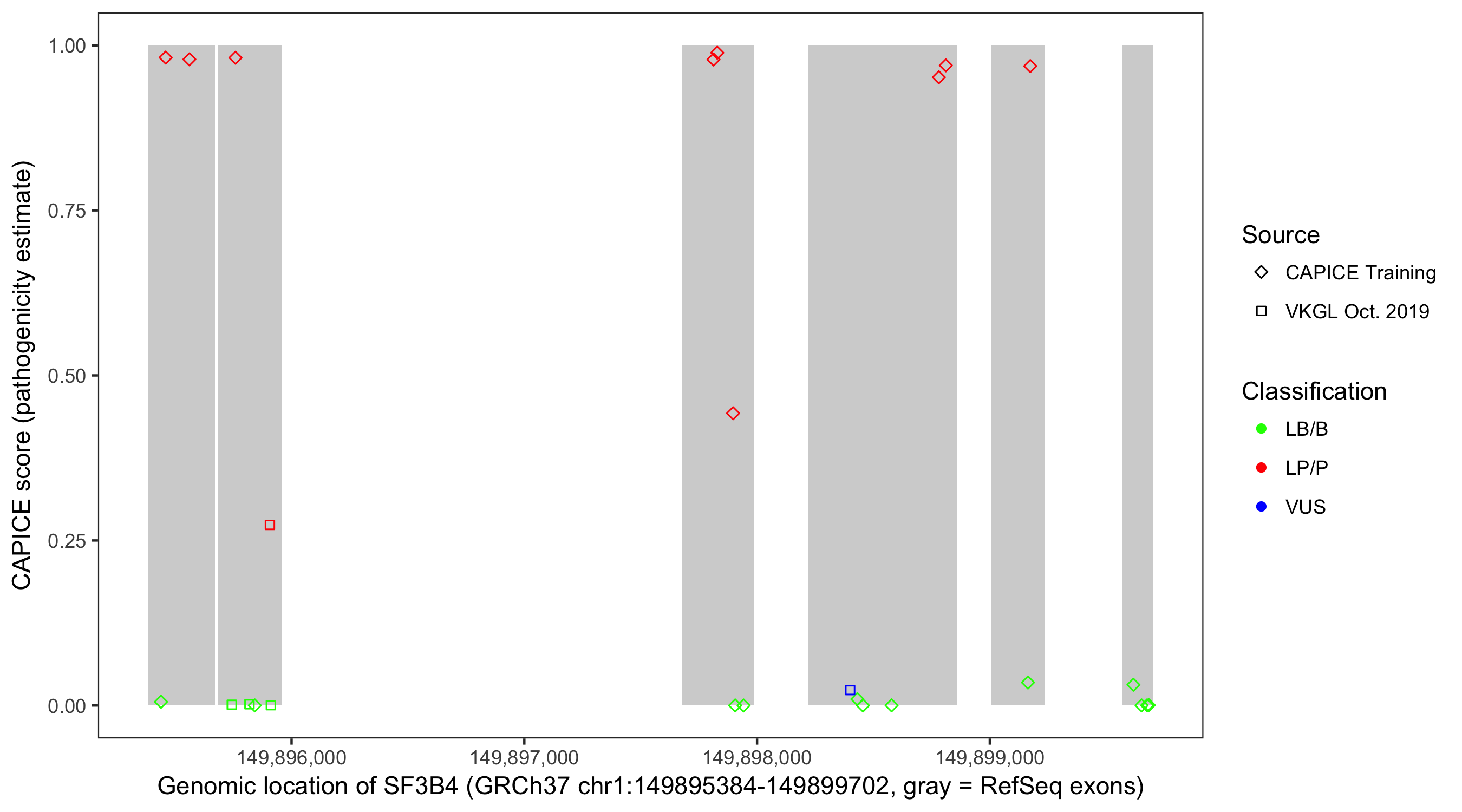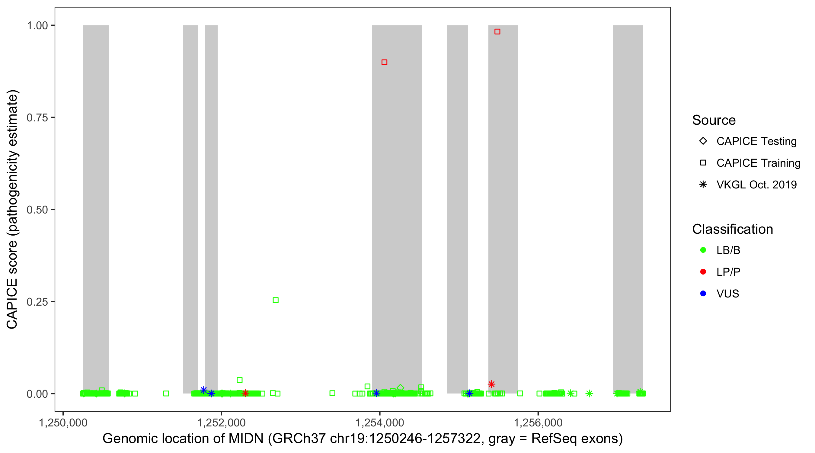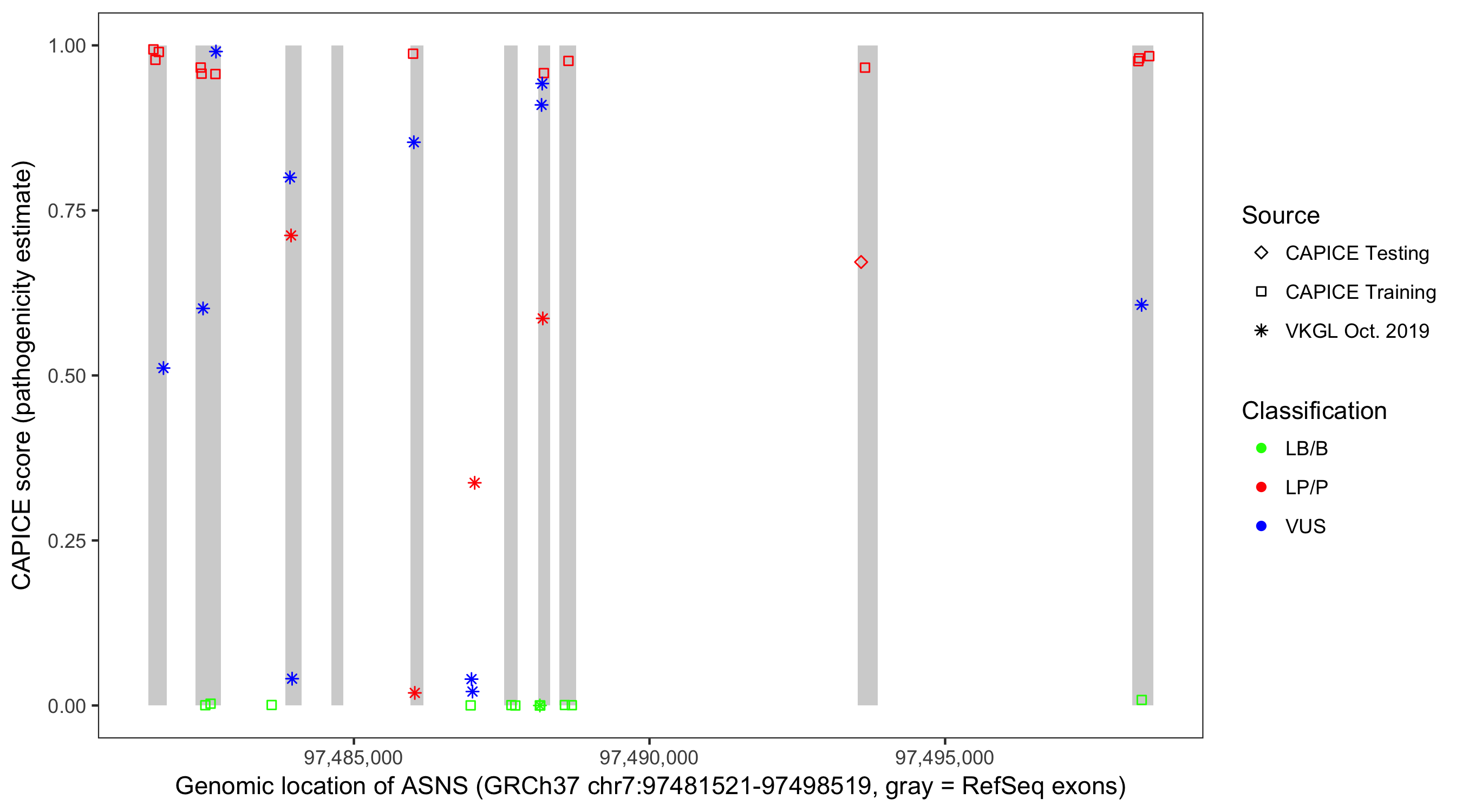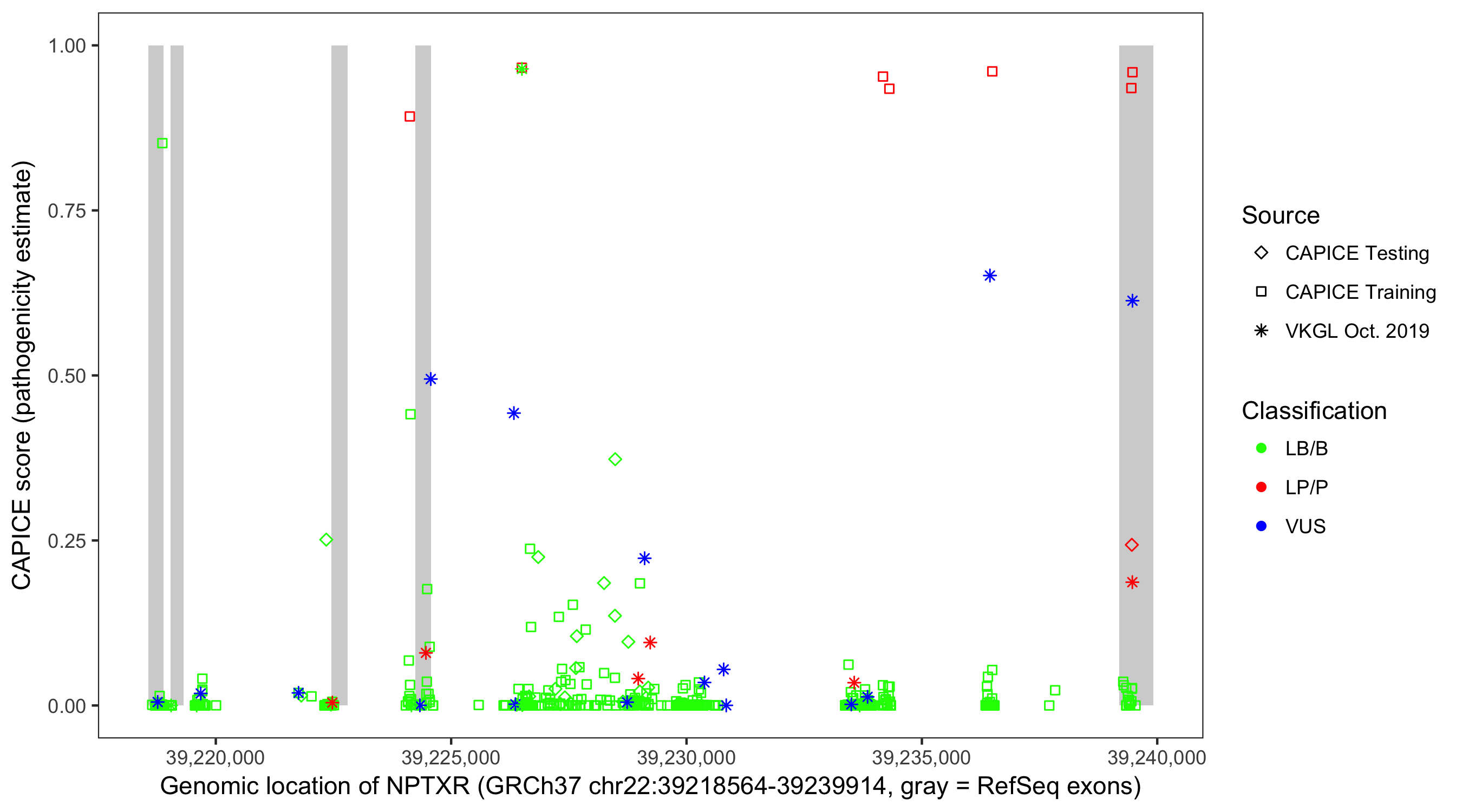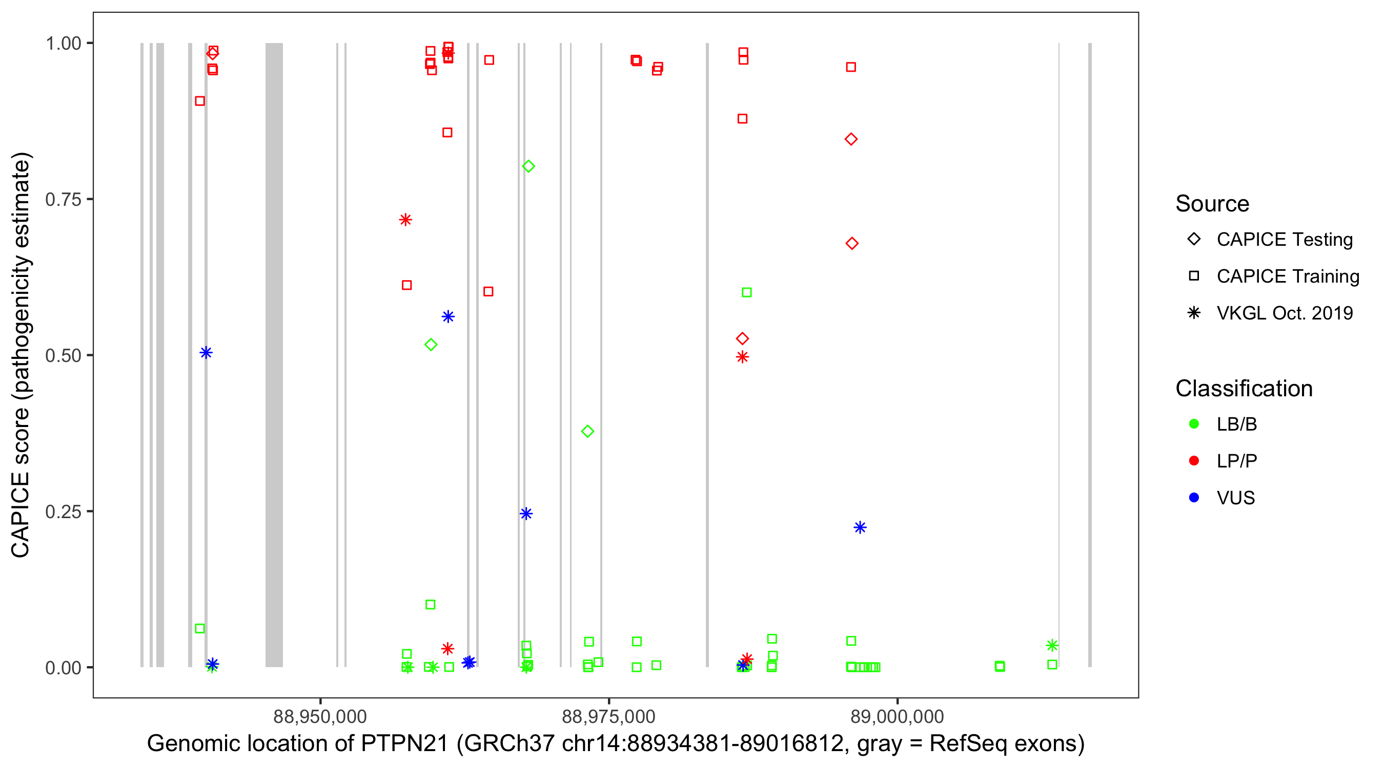 Shown are CAPICE train/test variants plus VKGL Oct 2019.