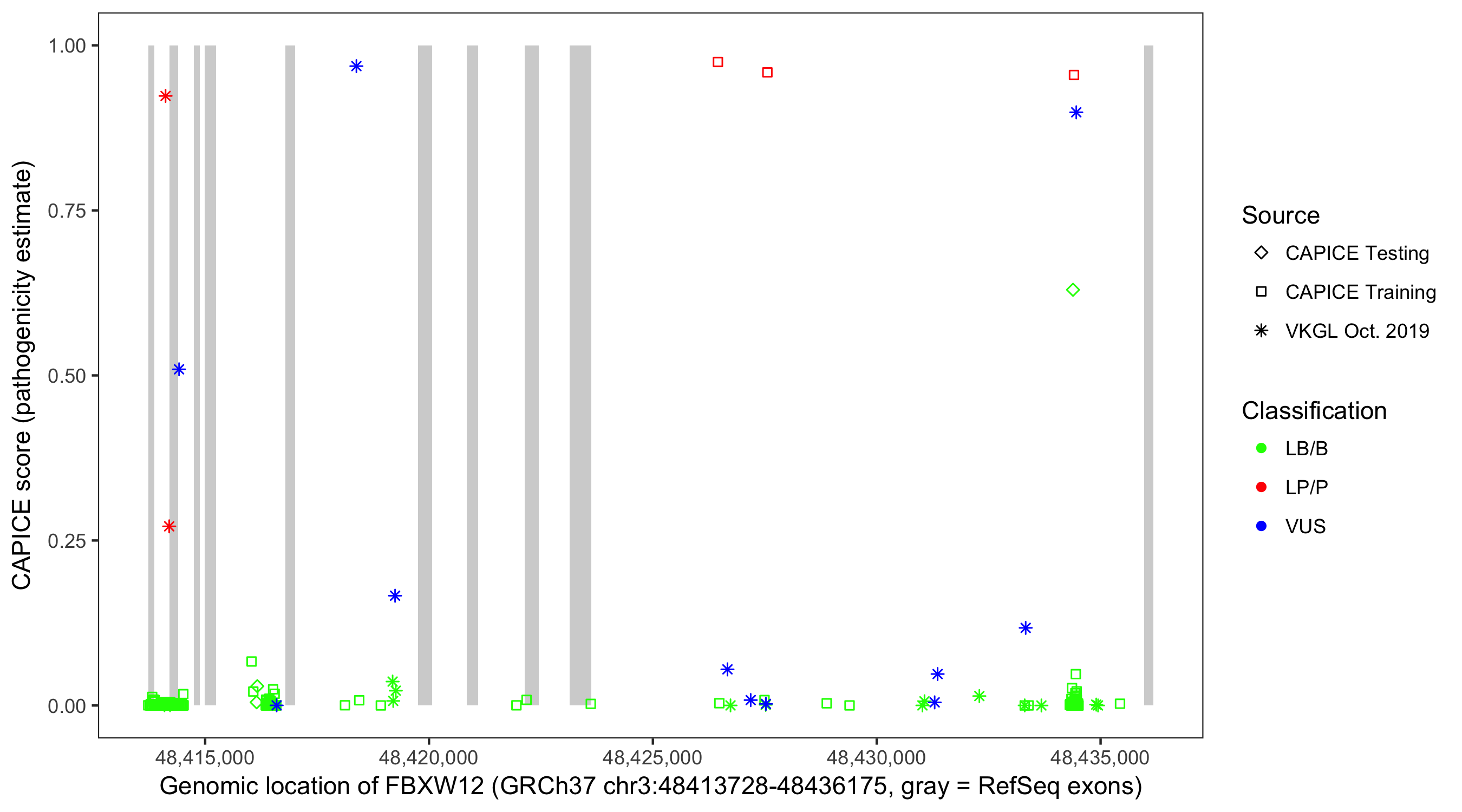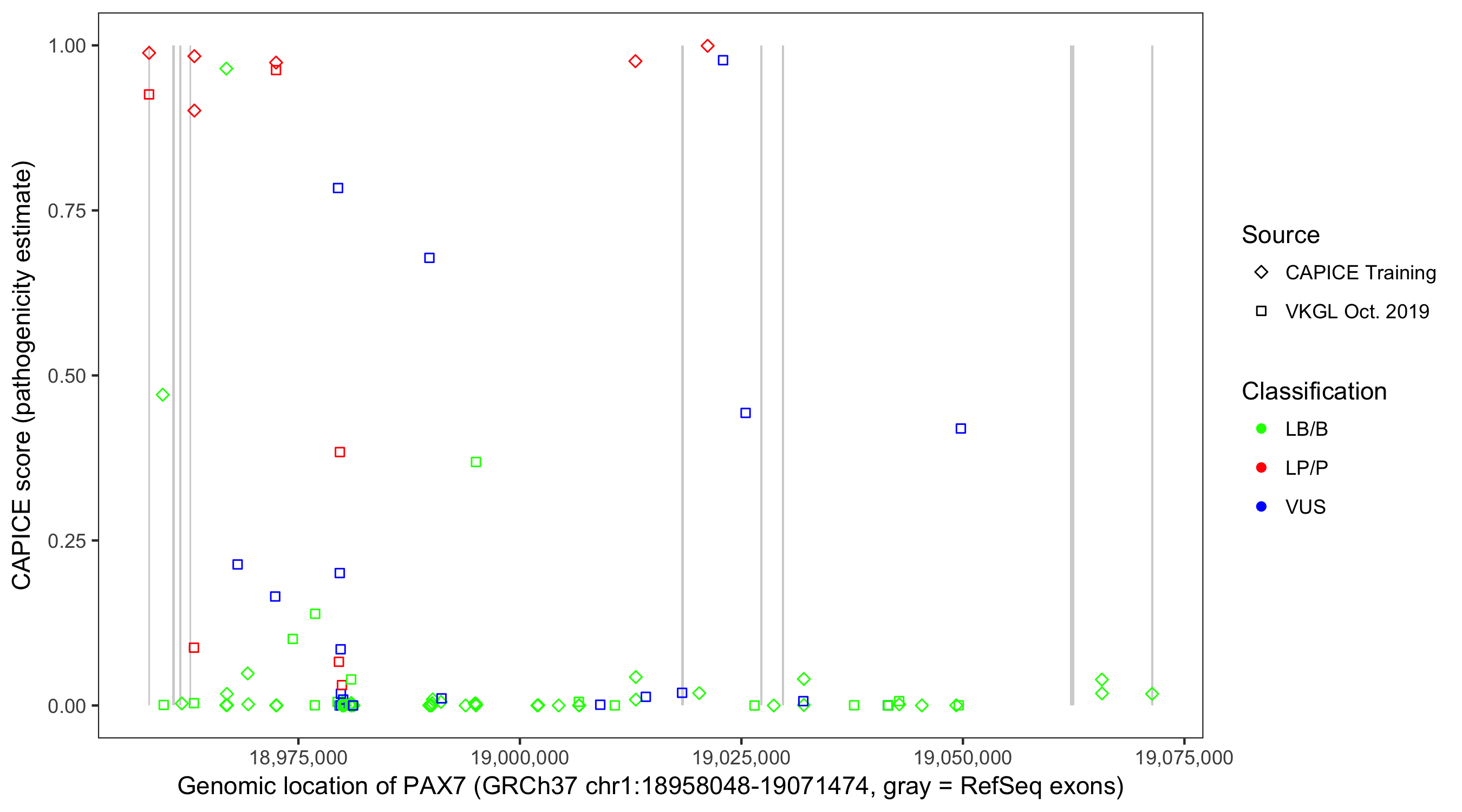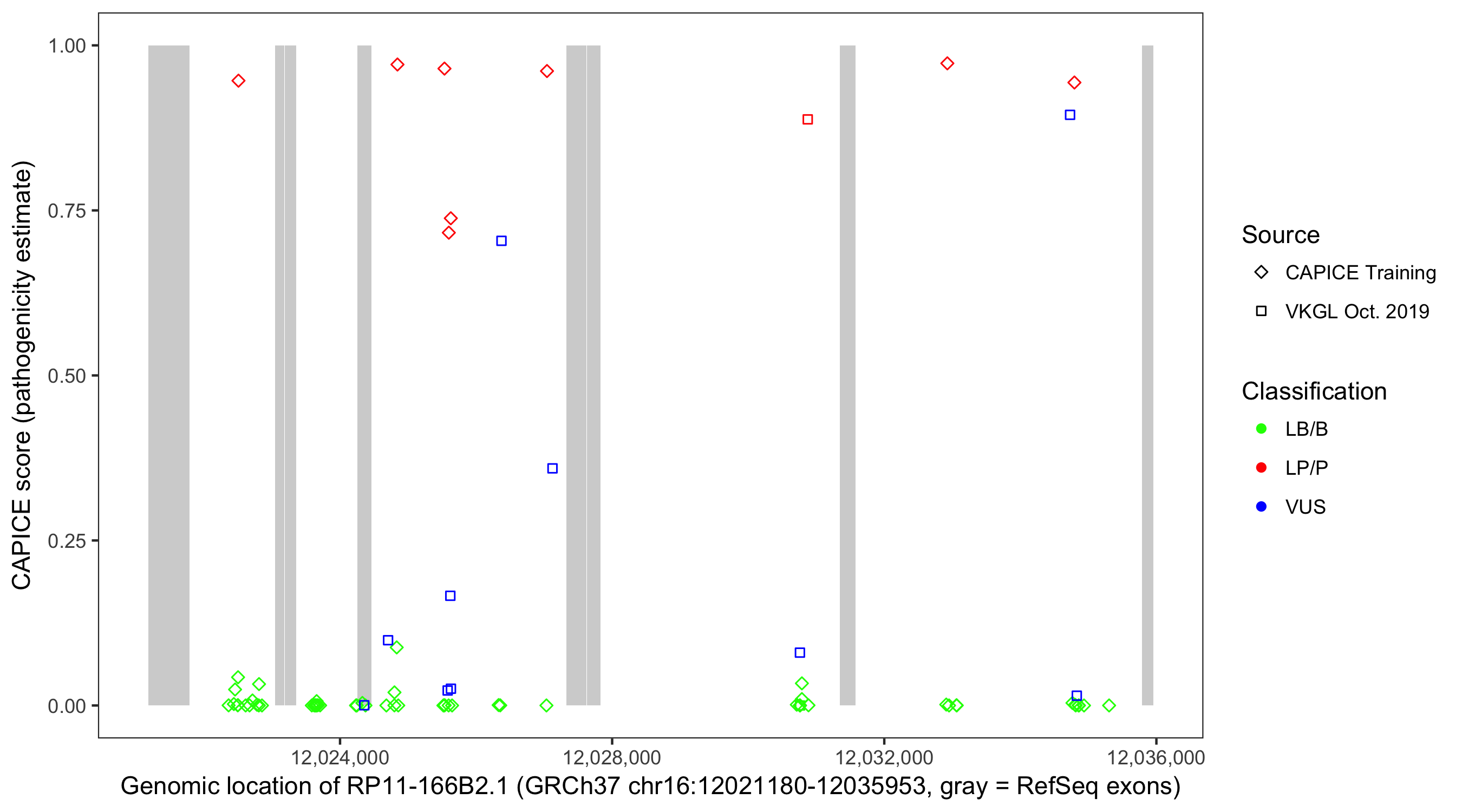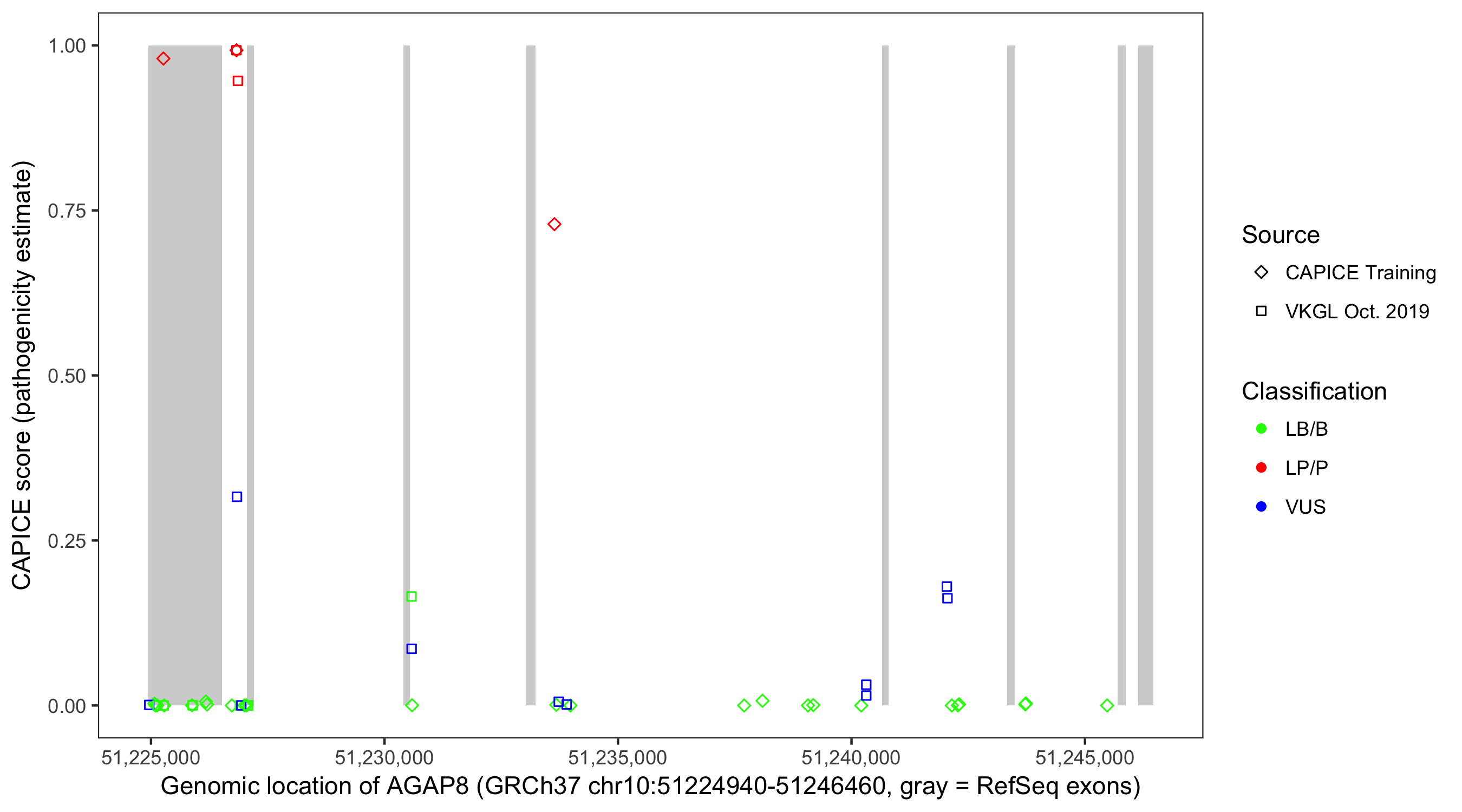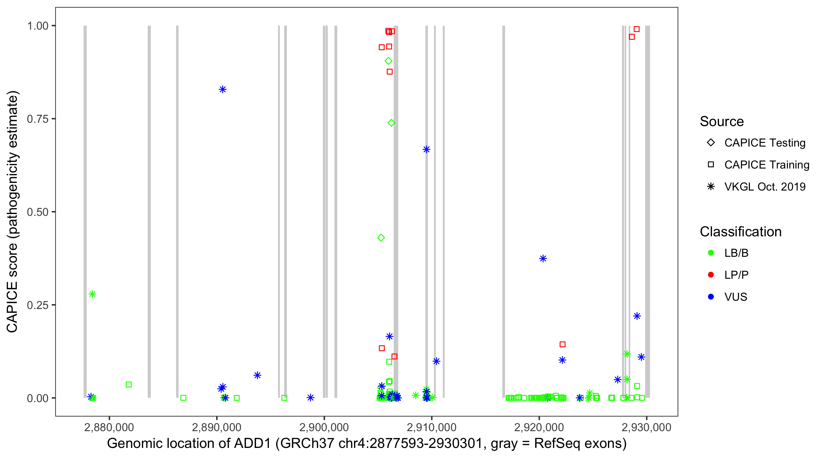 Shown are CAPICE train/test variants plus VKGL Oct 2019.