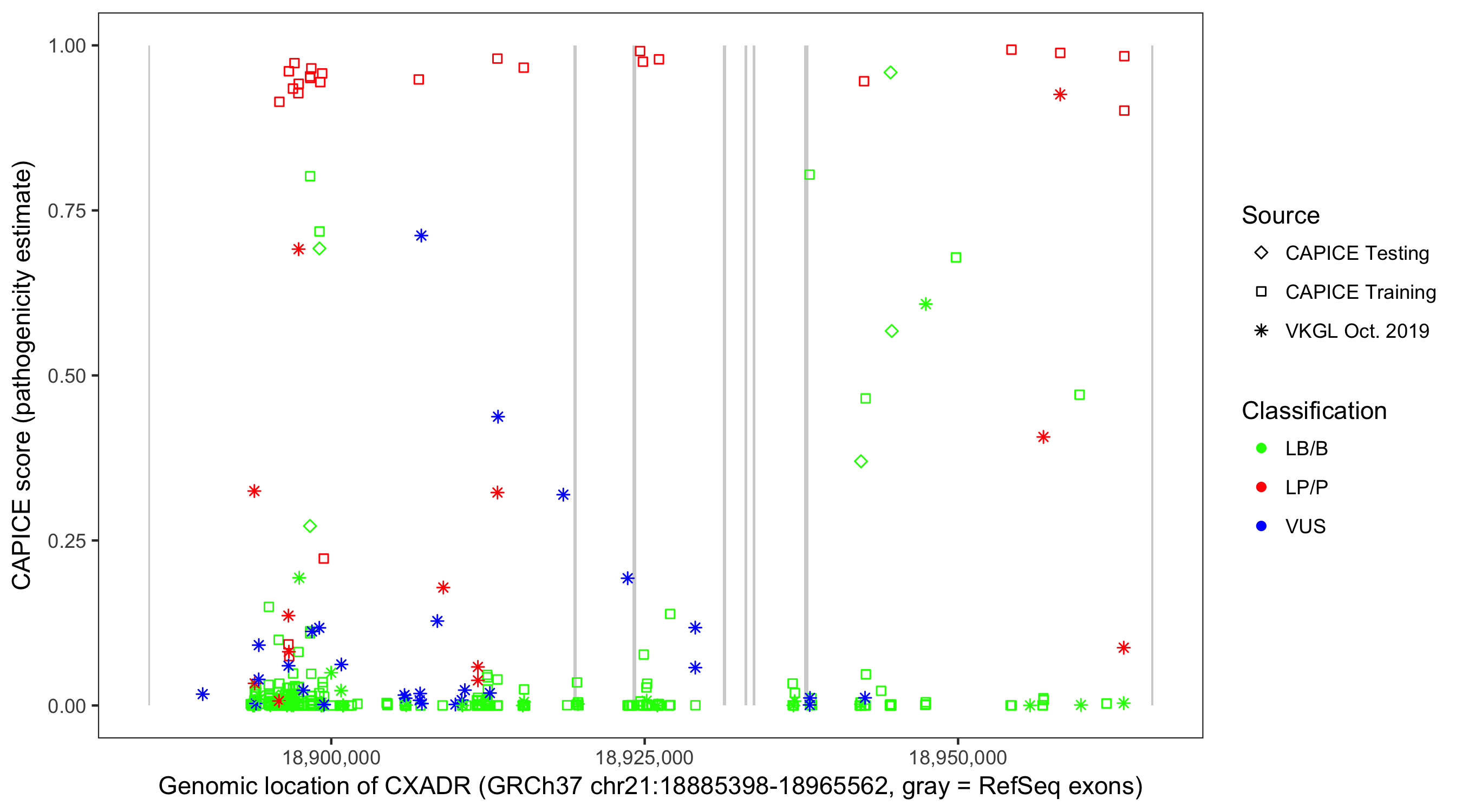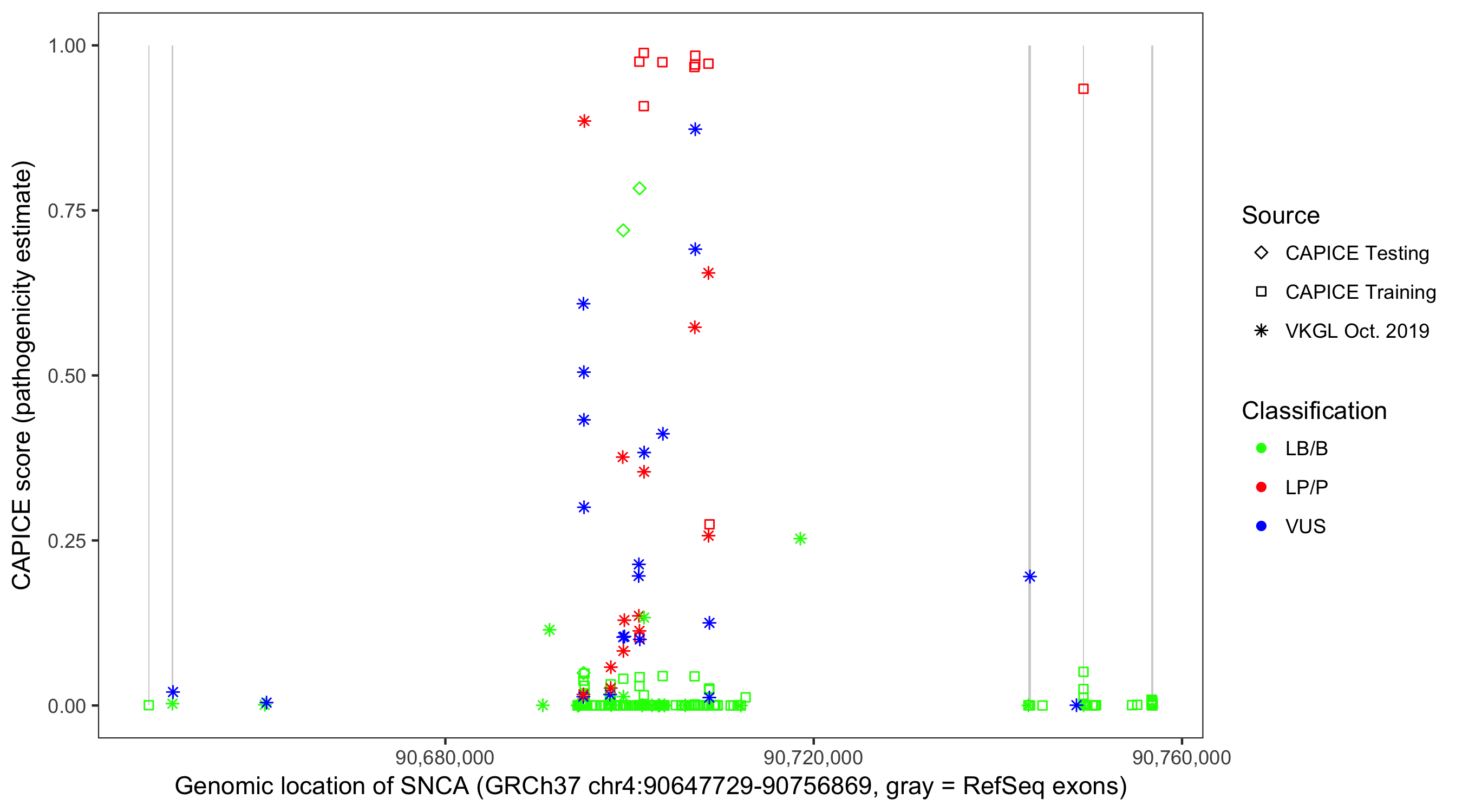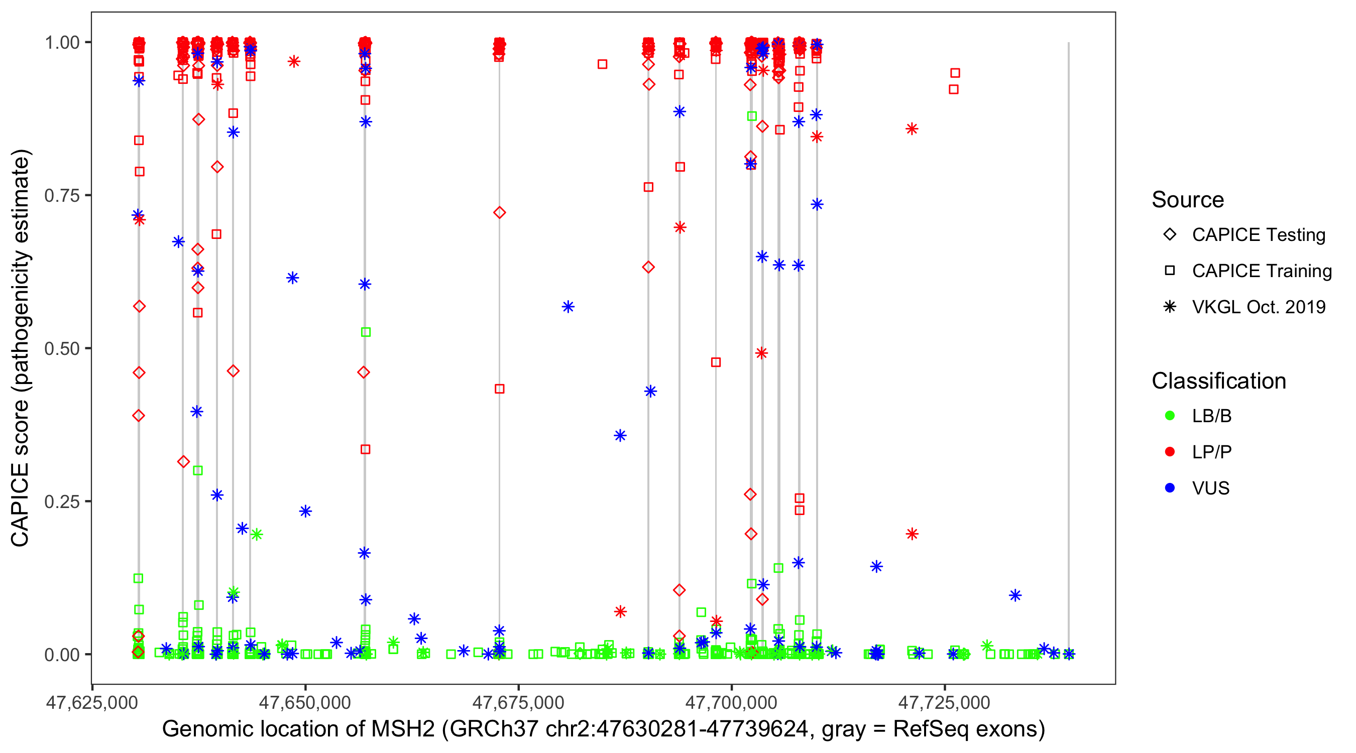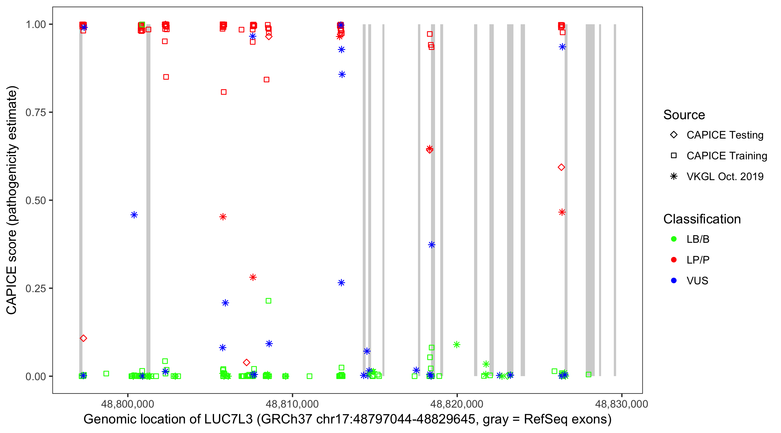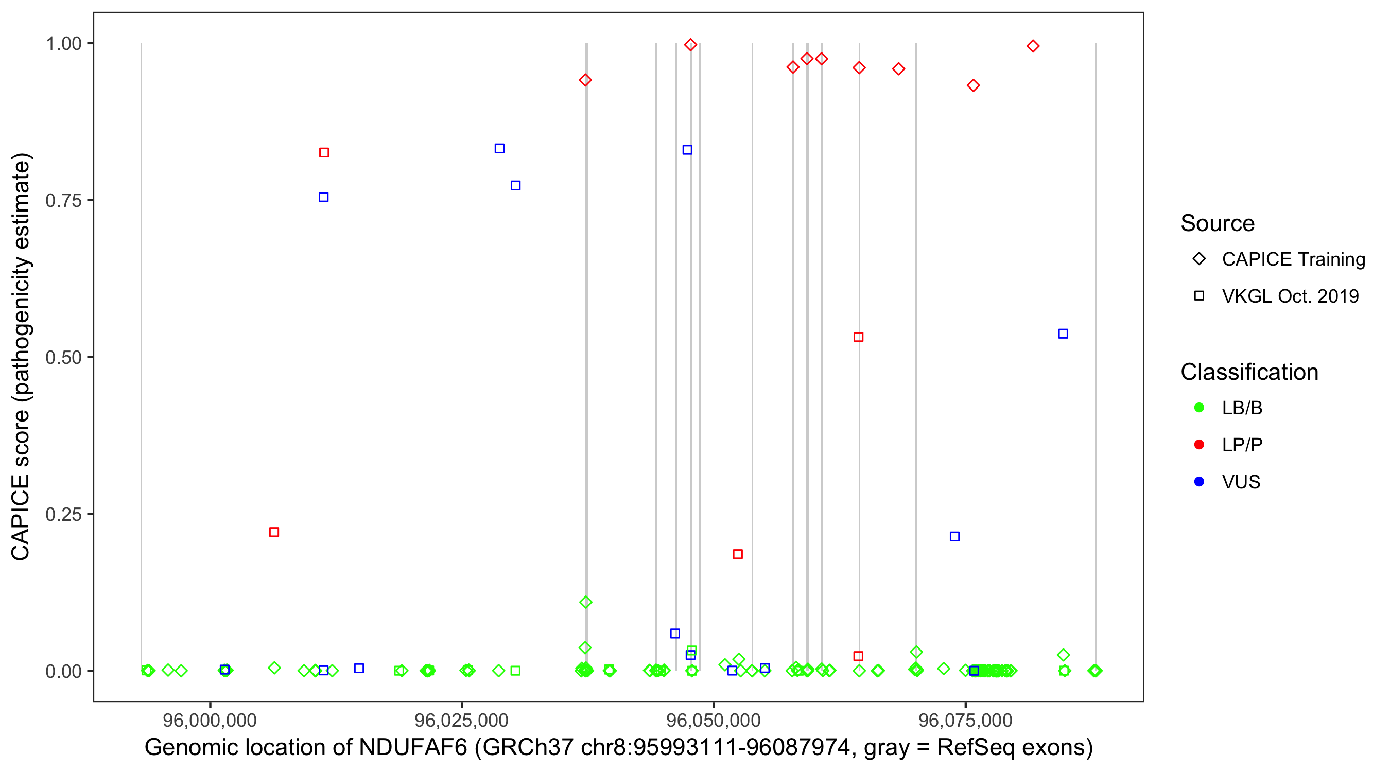Shown are CAPICE train/test variants plus VKGL Oct 2019.
