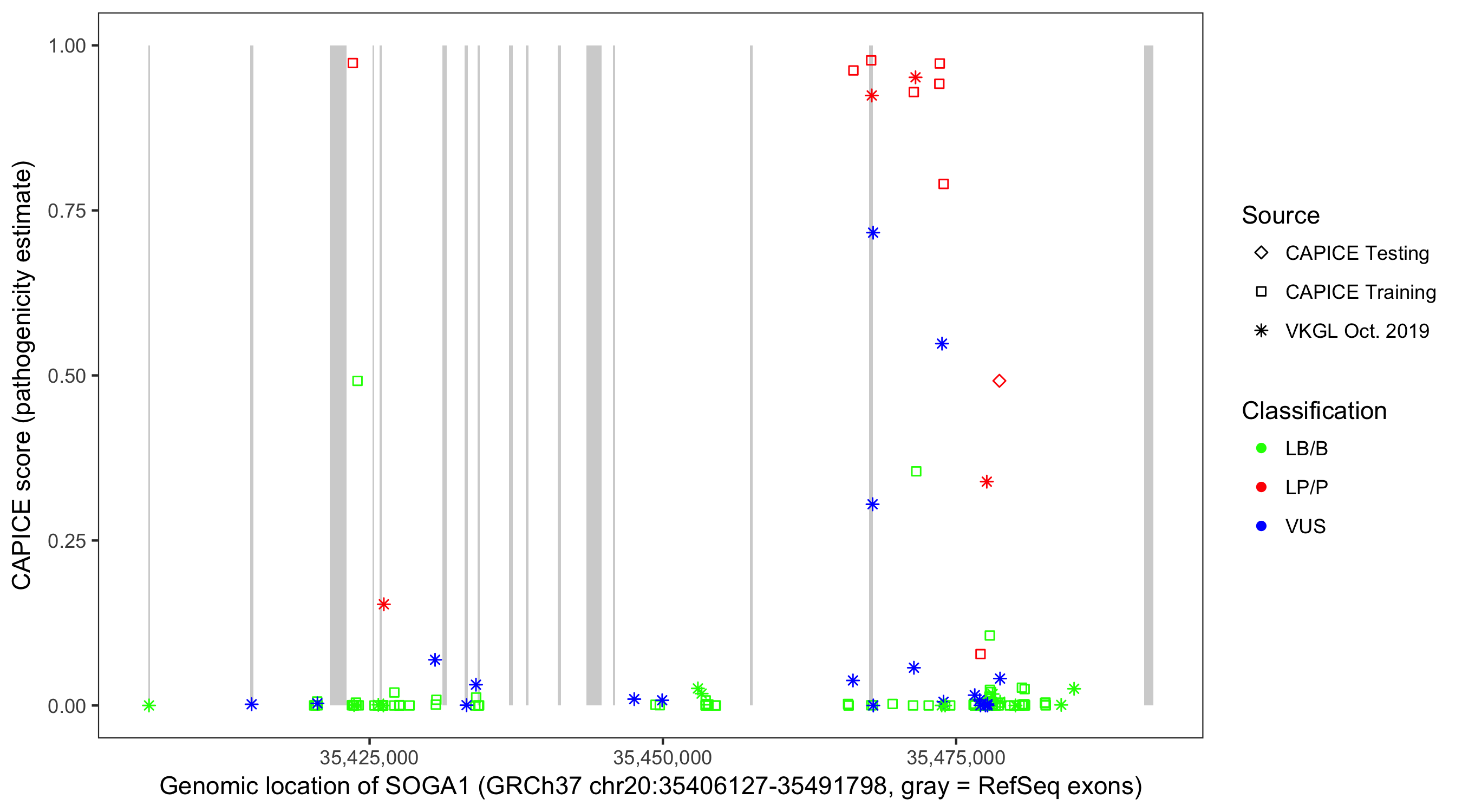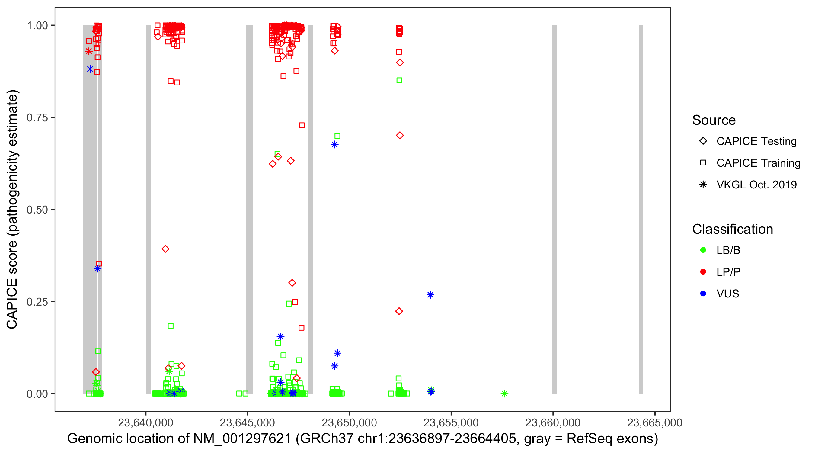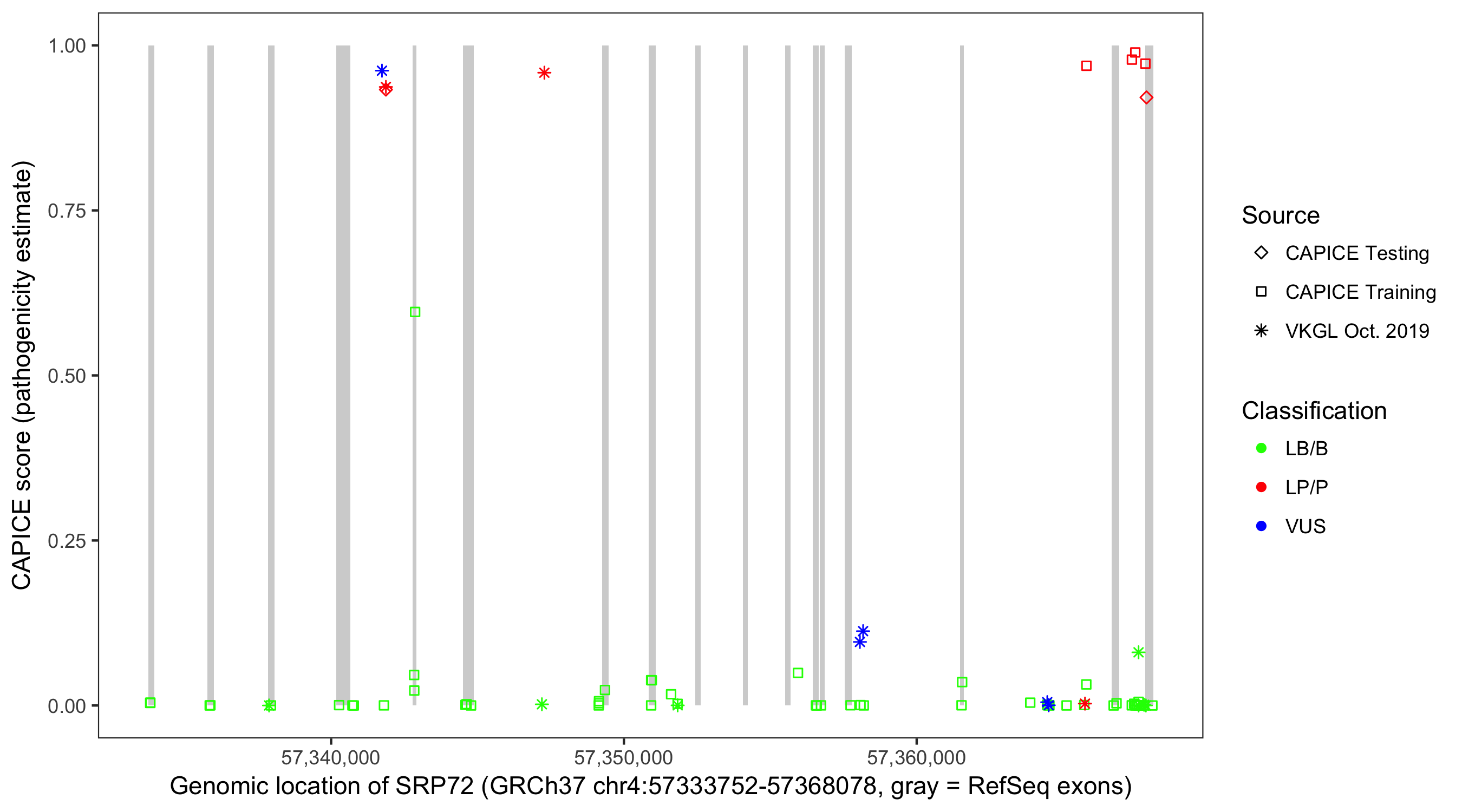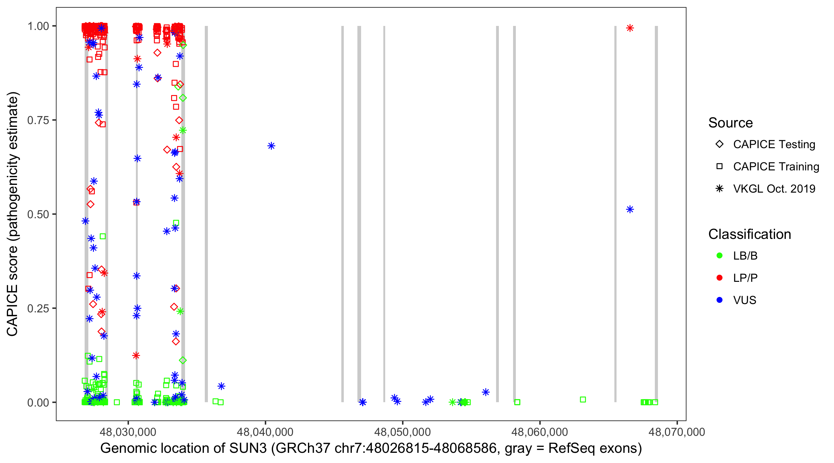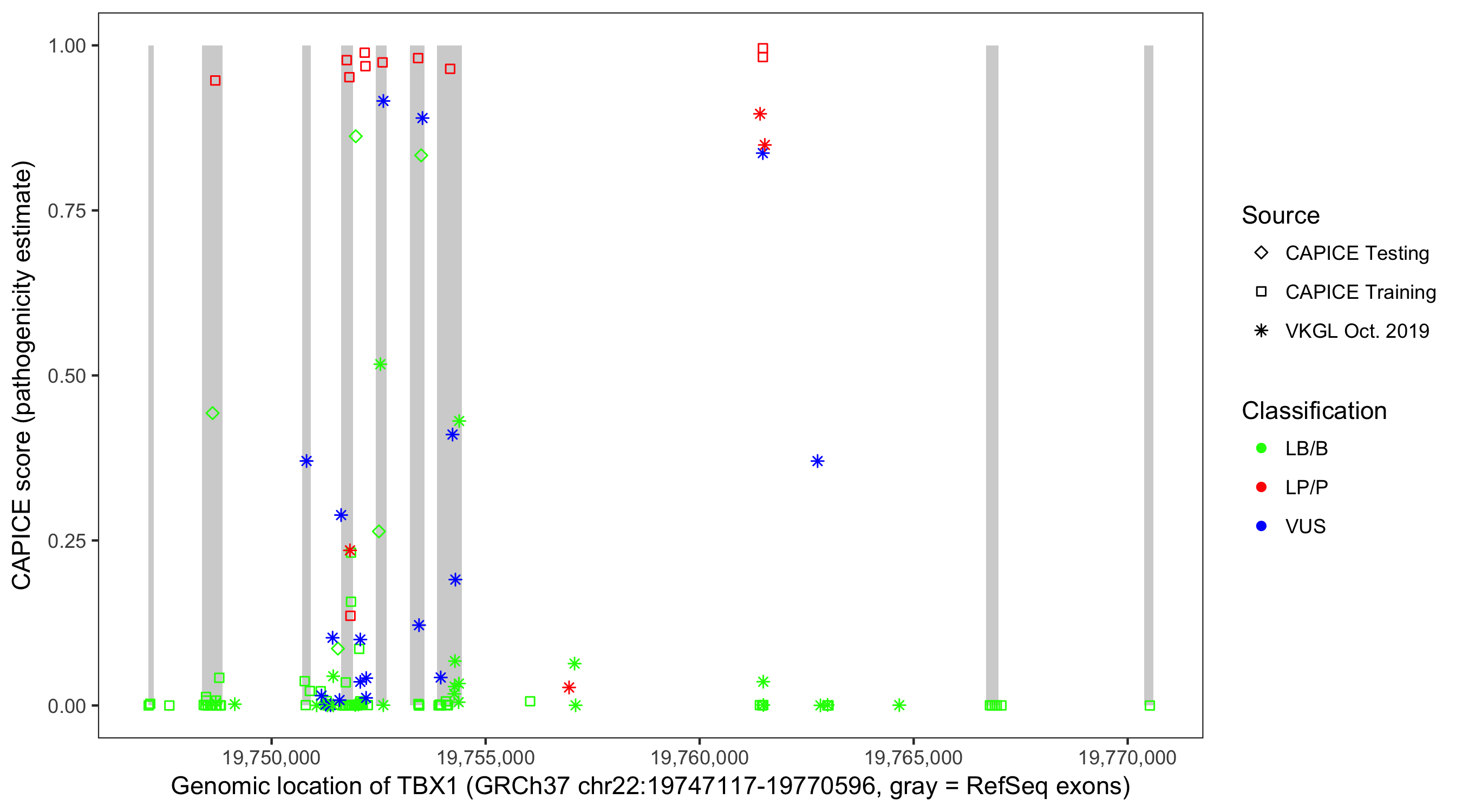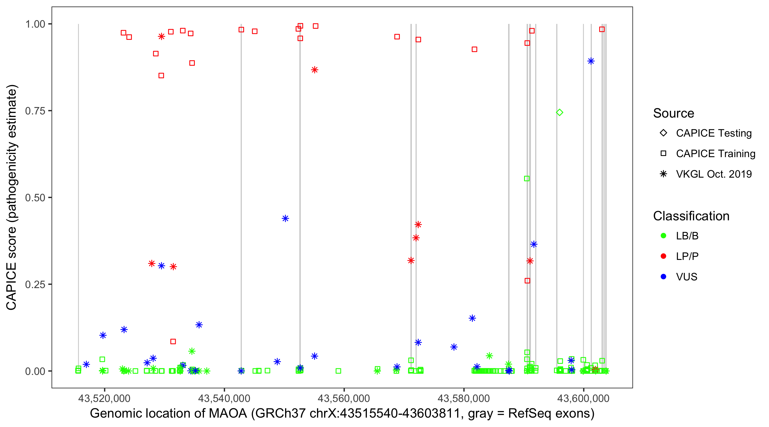 Shown are CAPICE train/test variants plus VKGL Oct 2019.