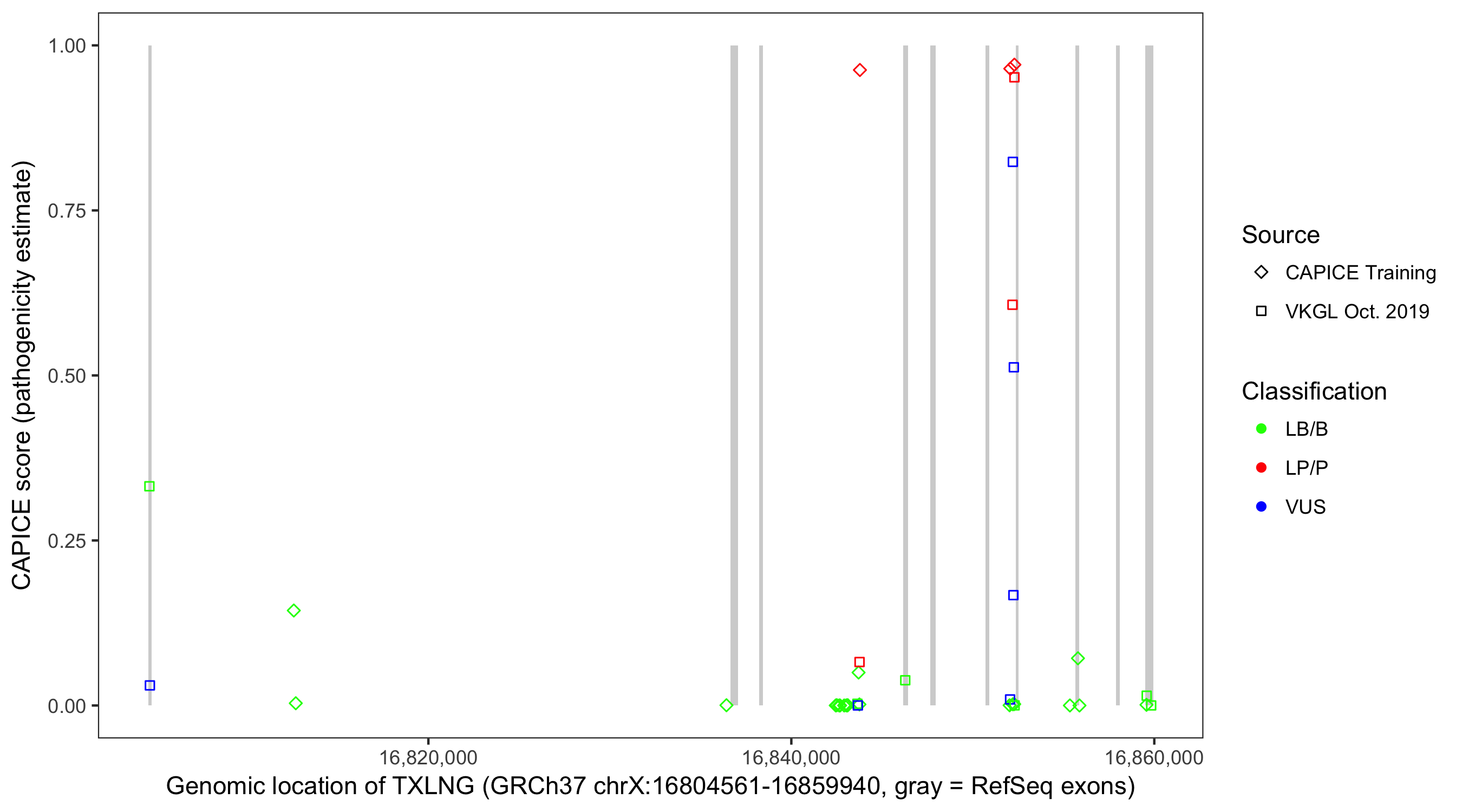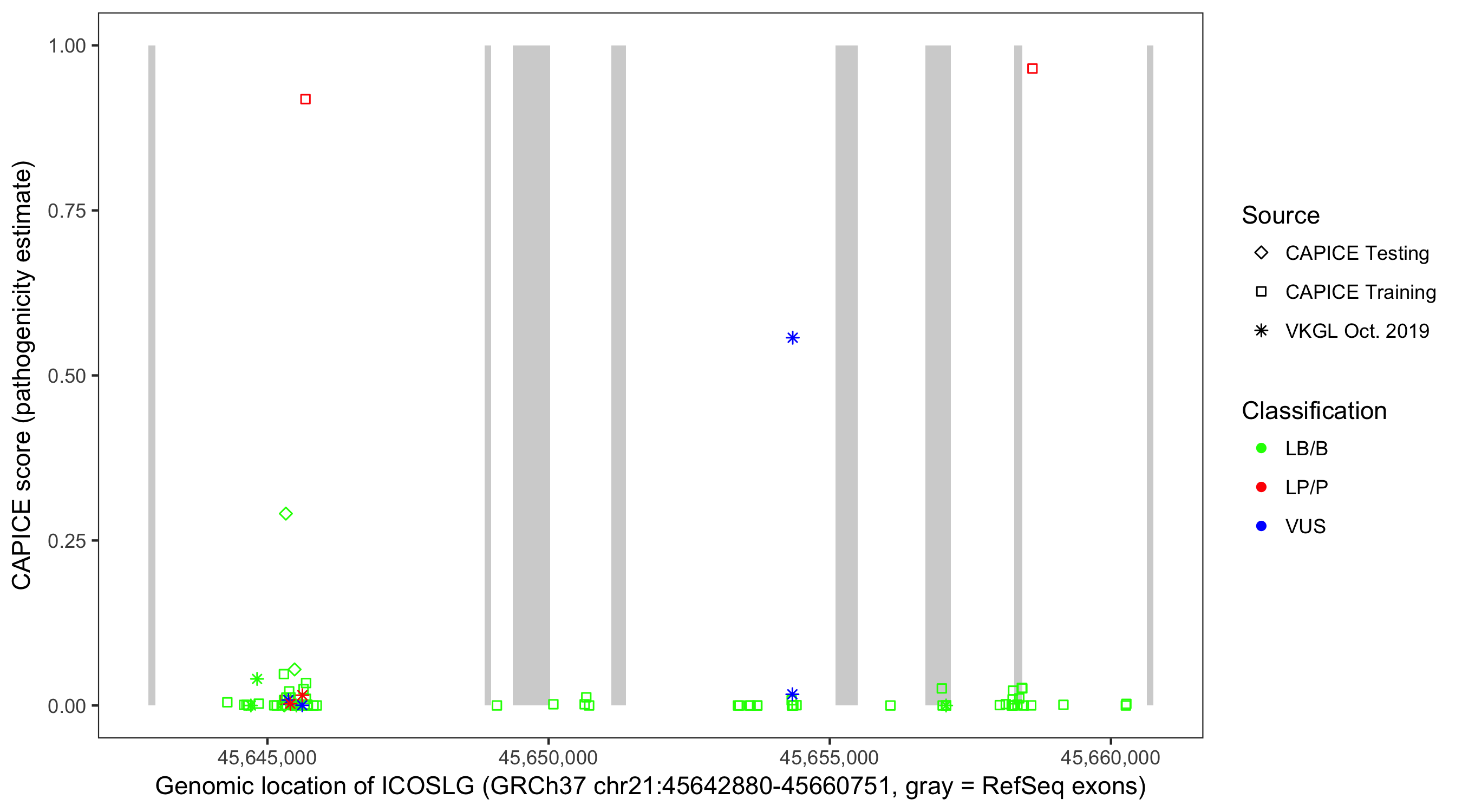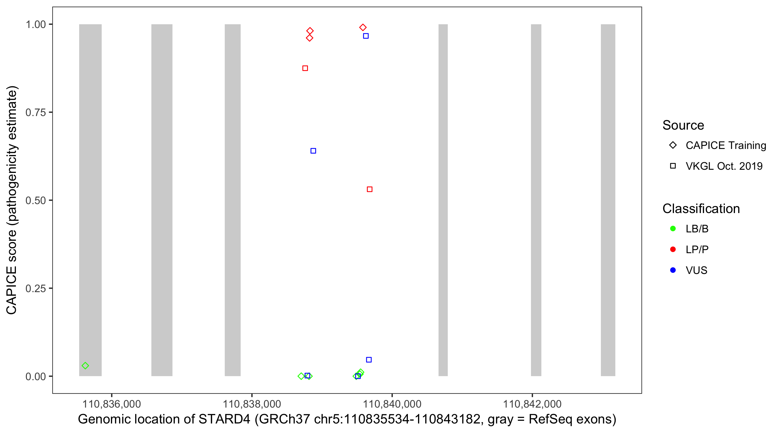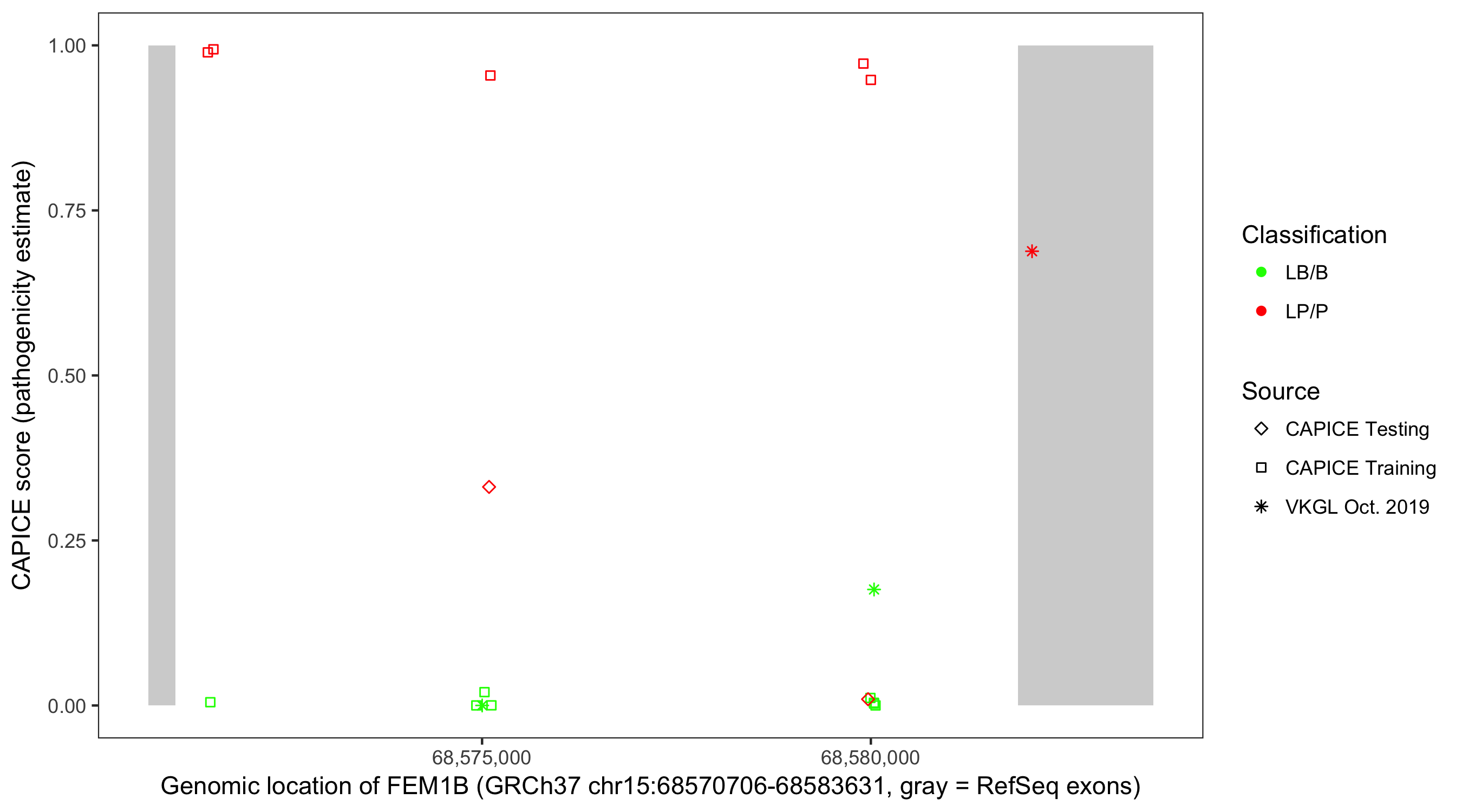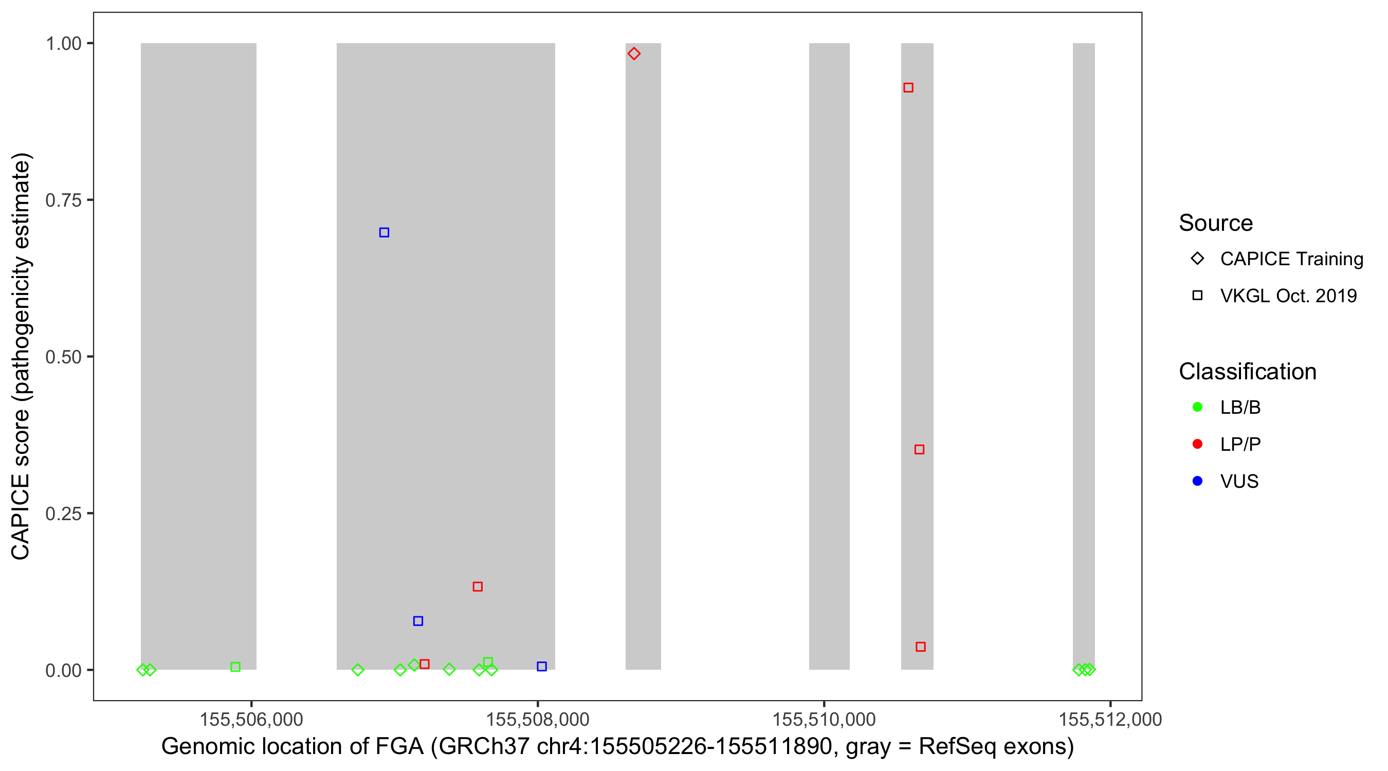 Shown are CAPICE train/test variants plus VKGL Oct 2019.