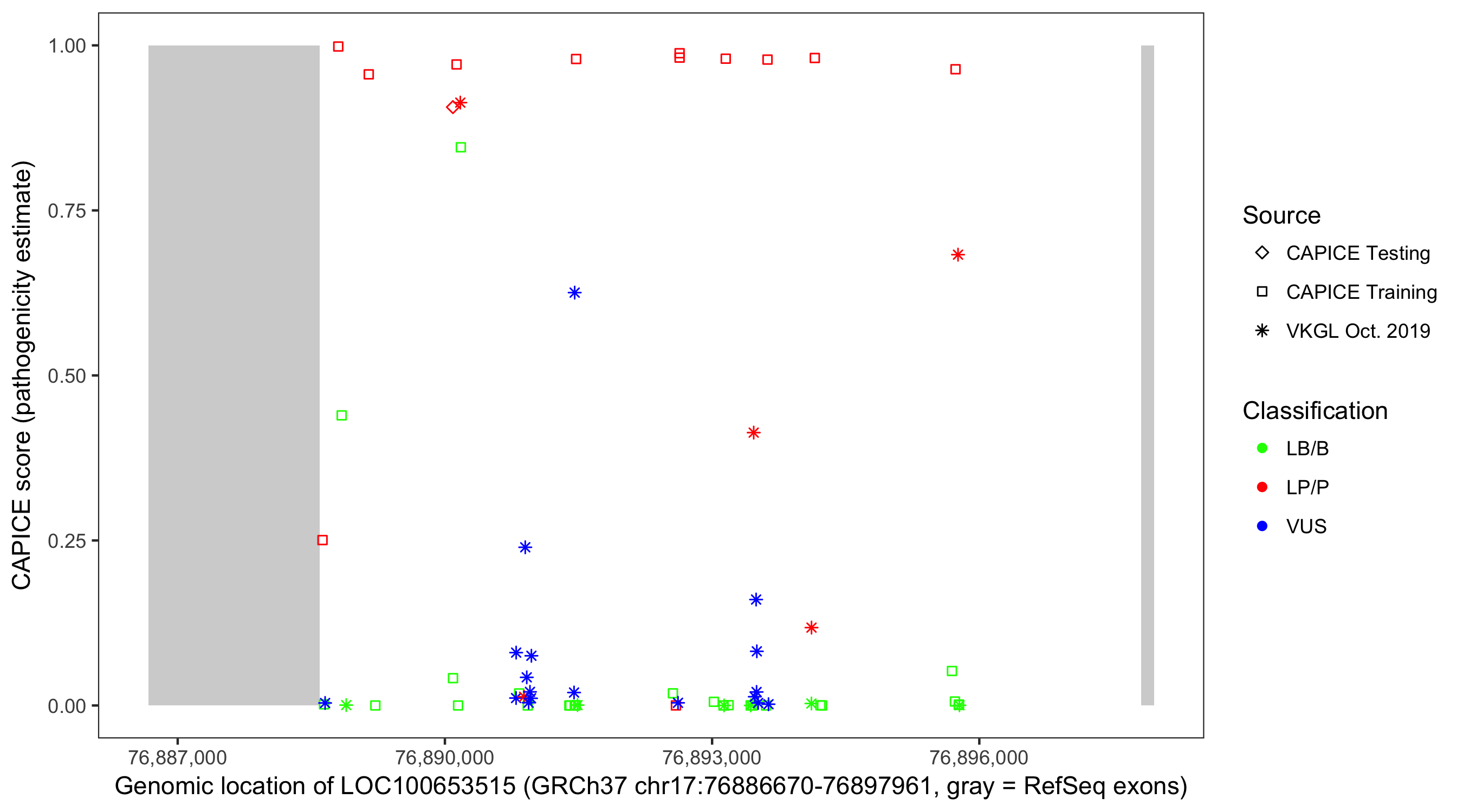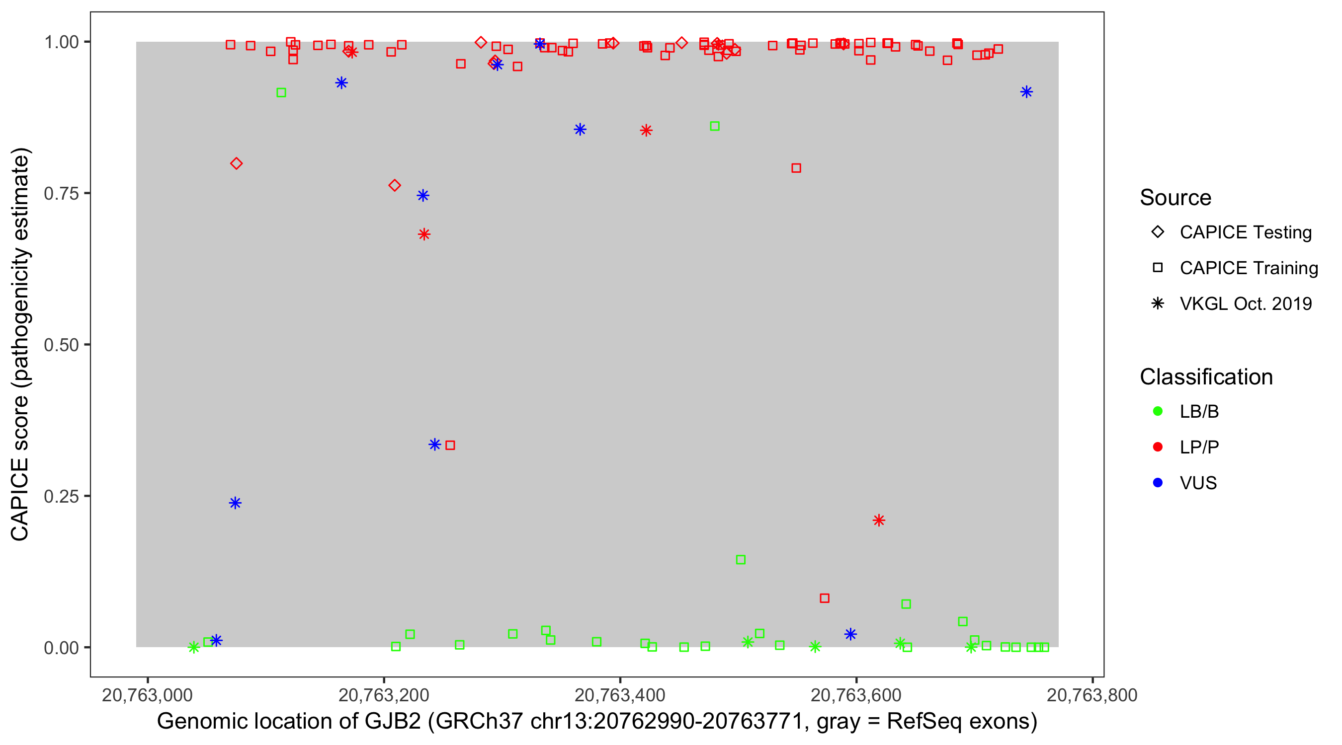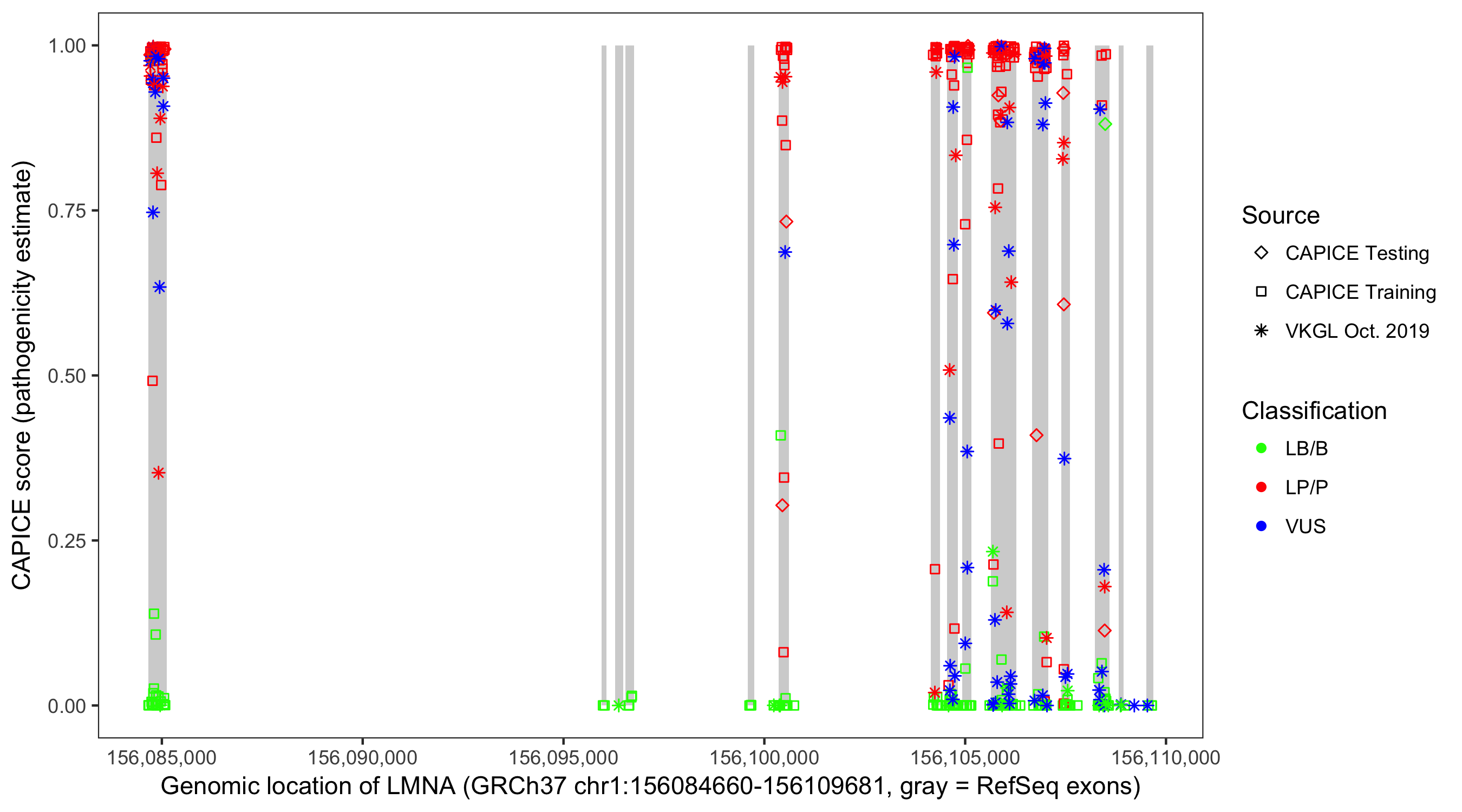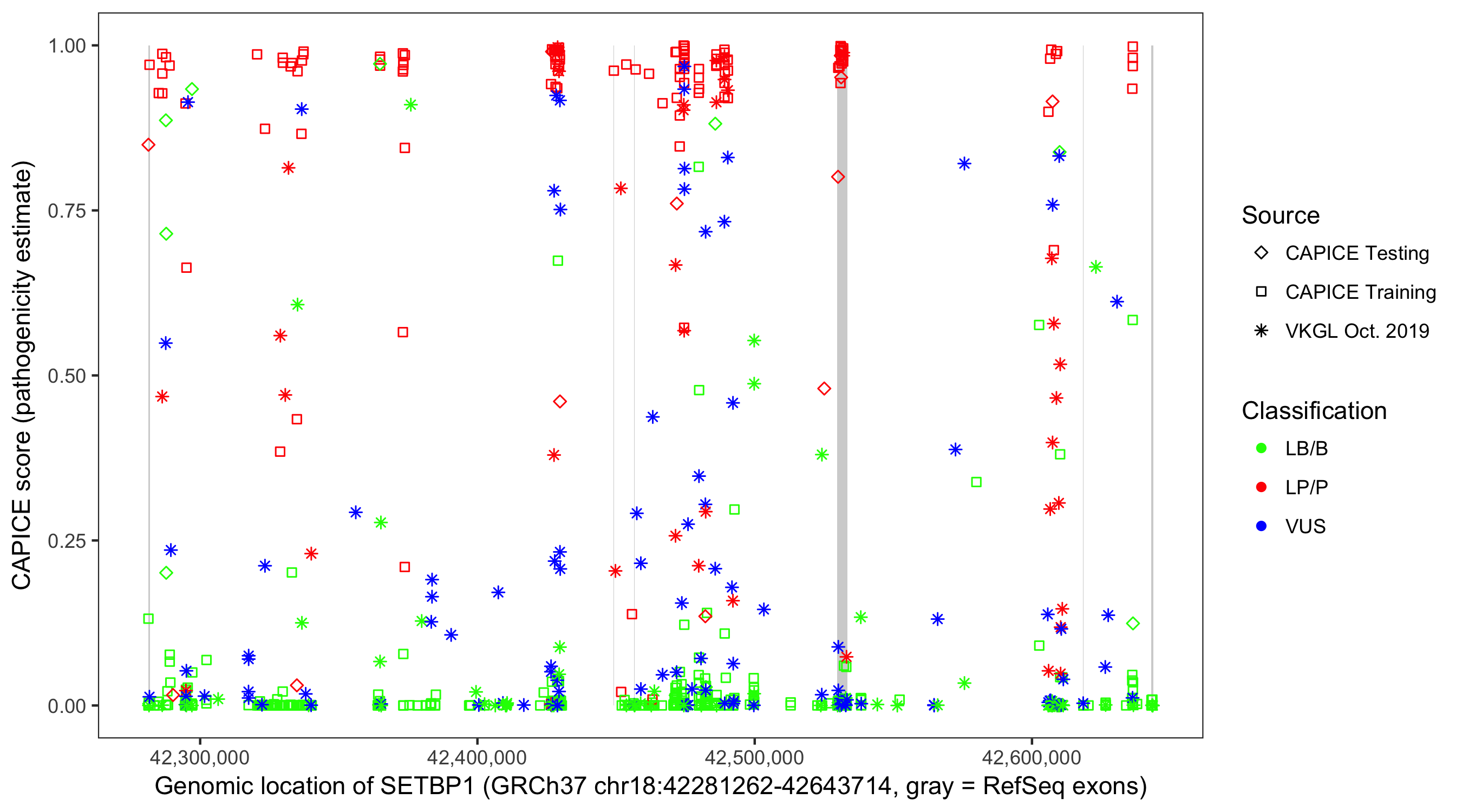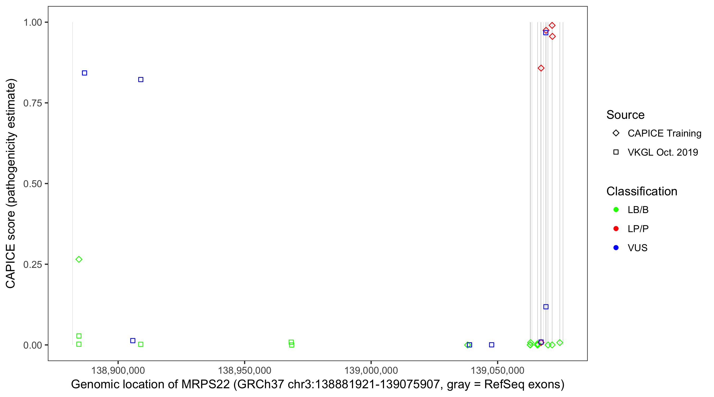 Shown are CAPICE train/test variants plus VKGL Oct 2019.