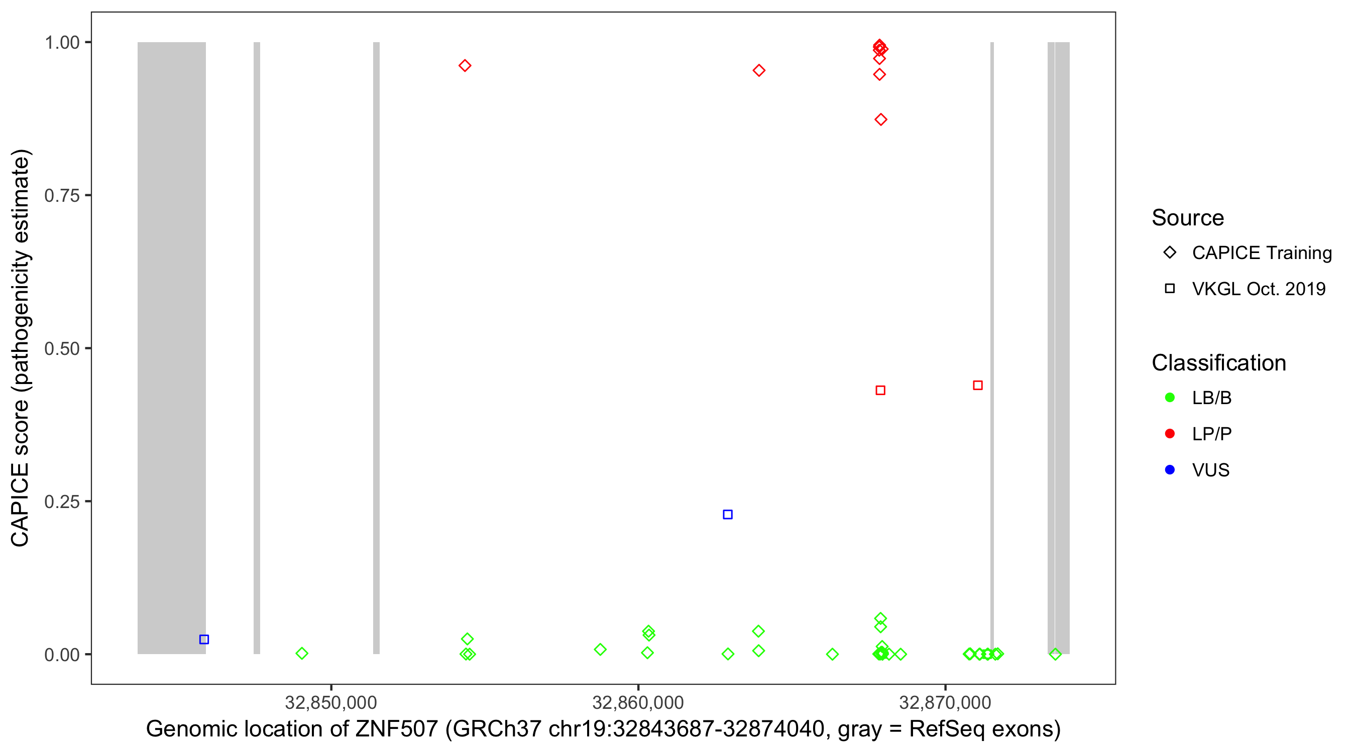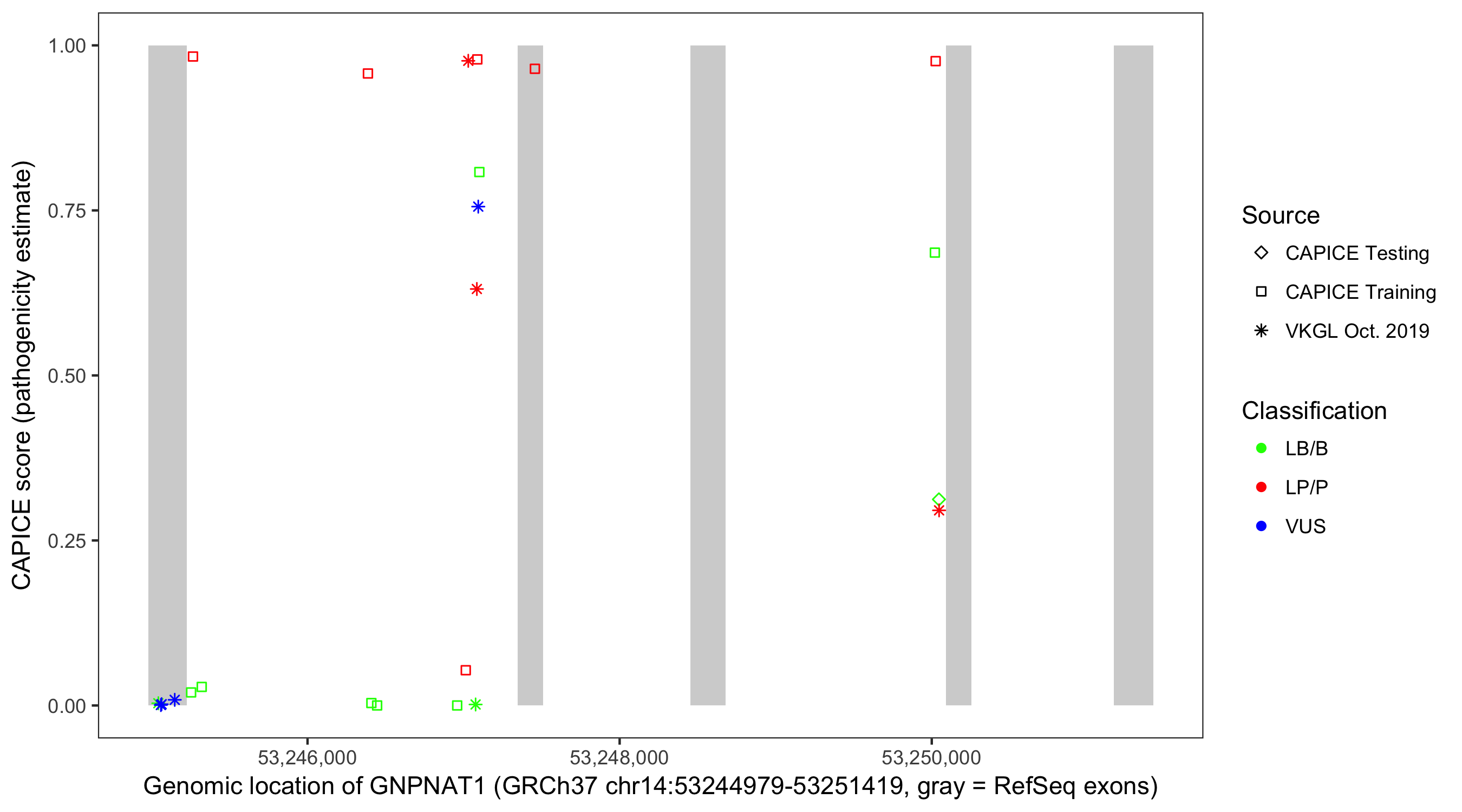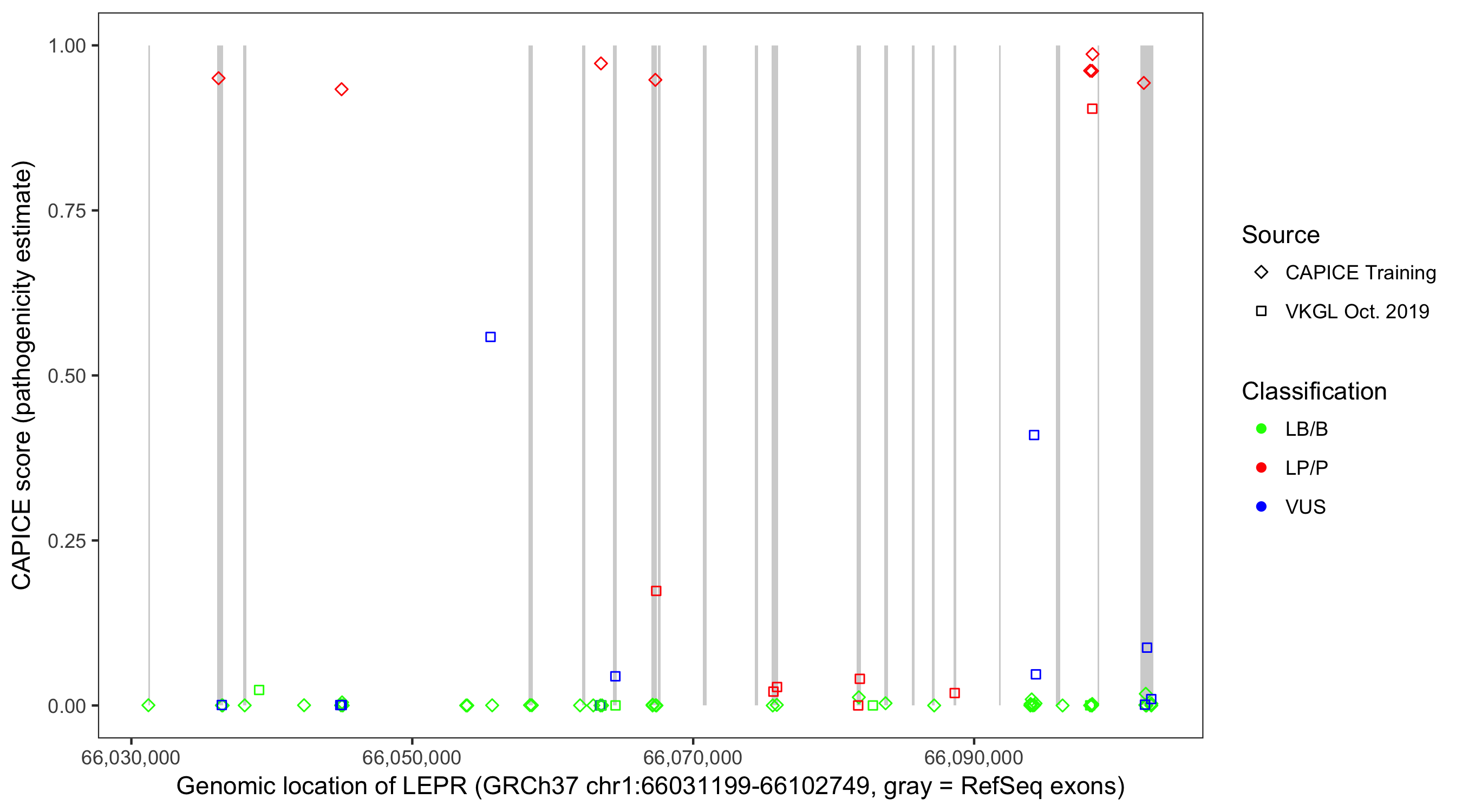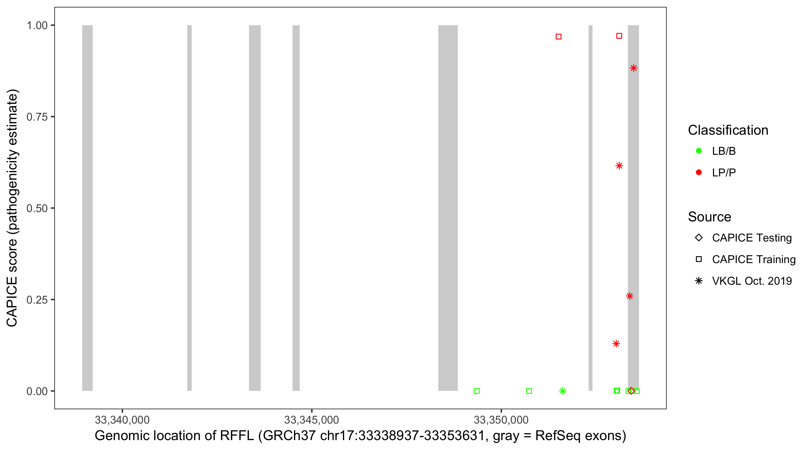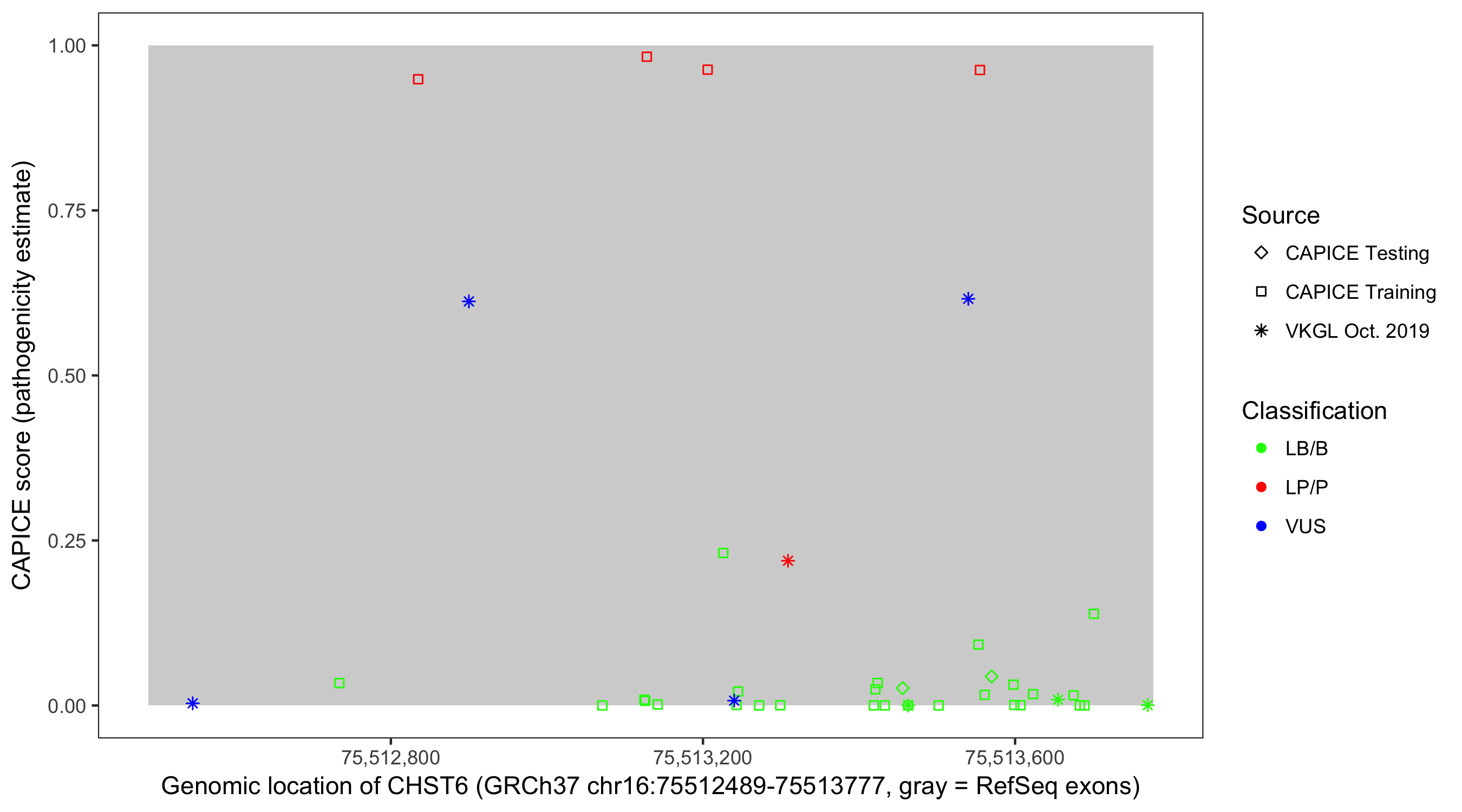 Shown are CAPICE train/test variants plus VKGL Oct 2019.