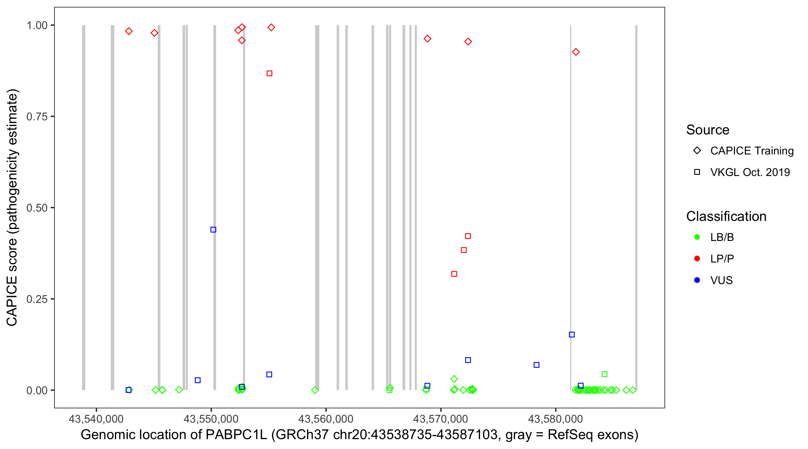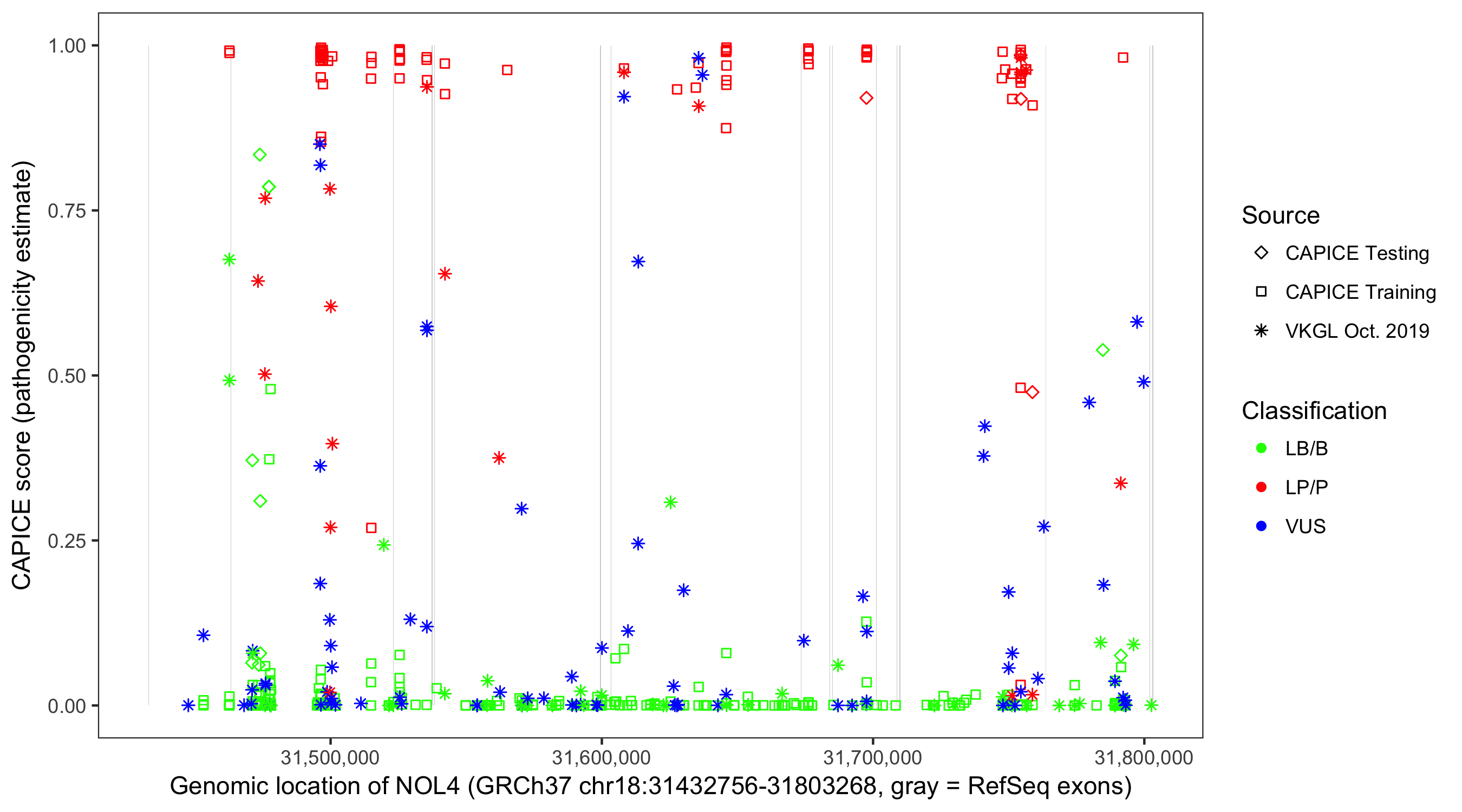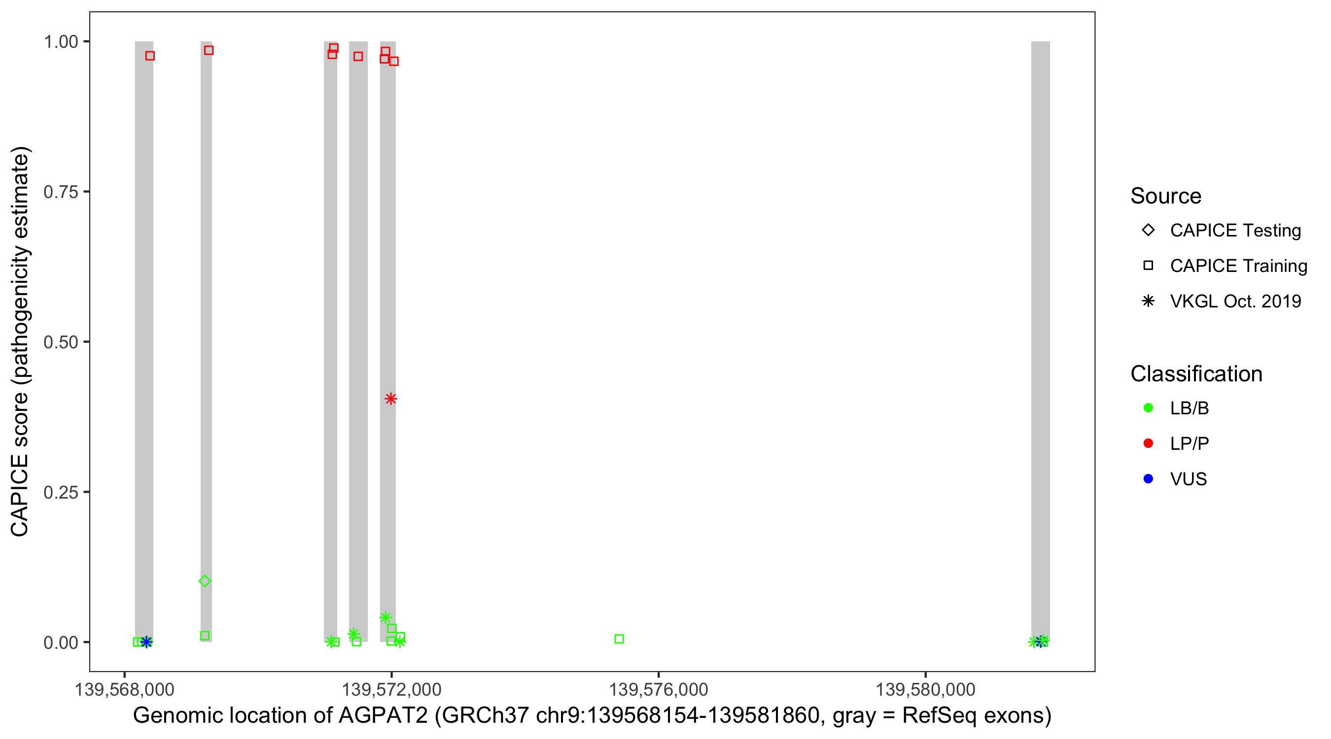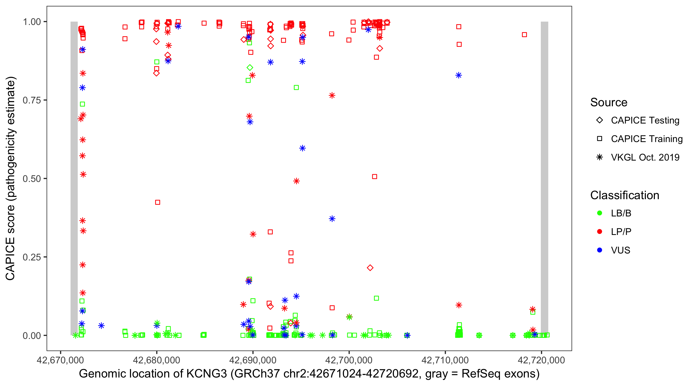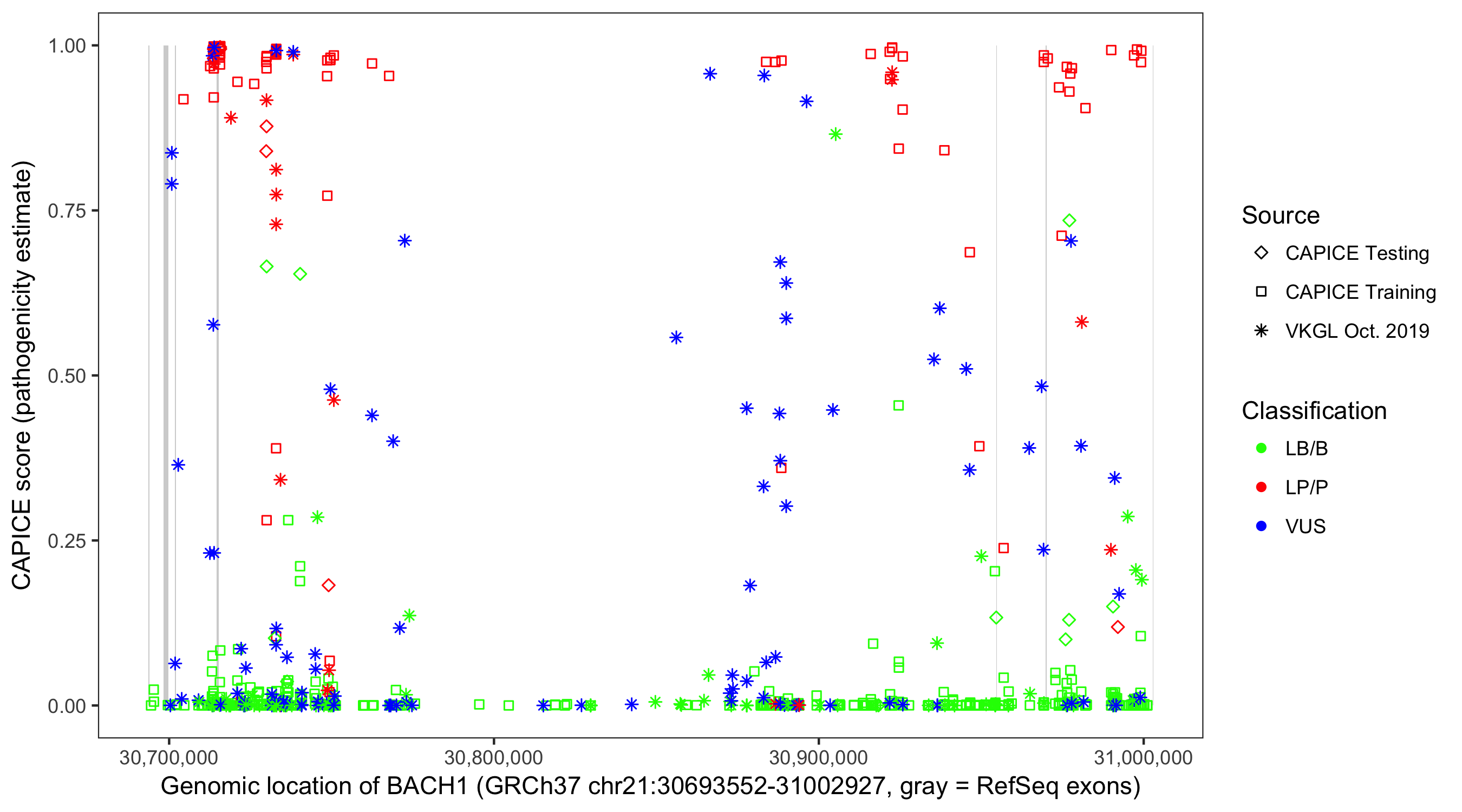 Shown are CAPICE train/test variants plus VKGL Oct 2019.