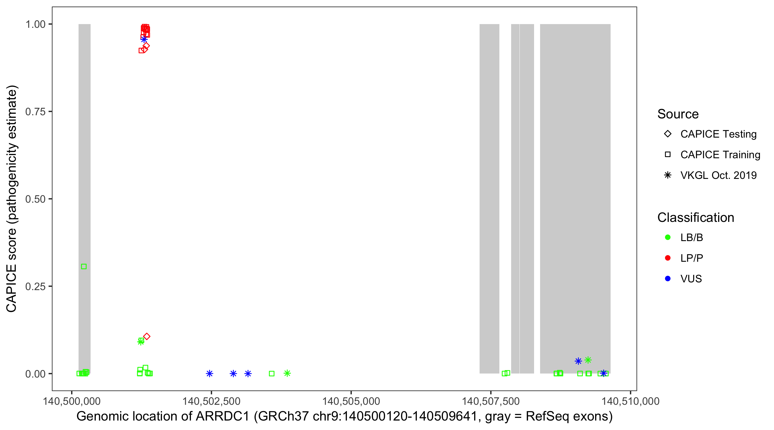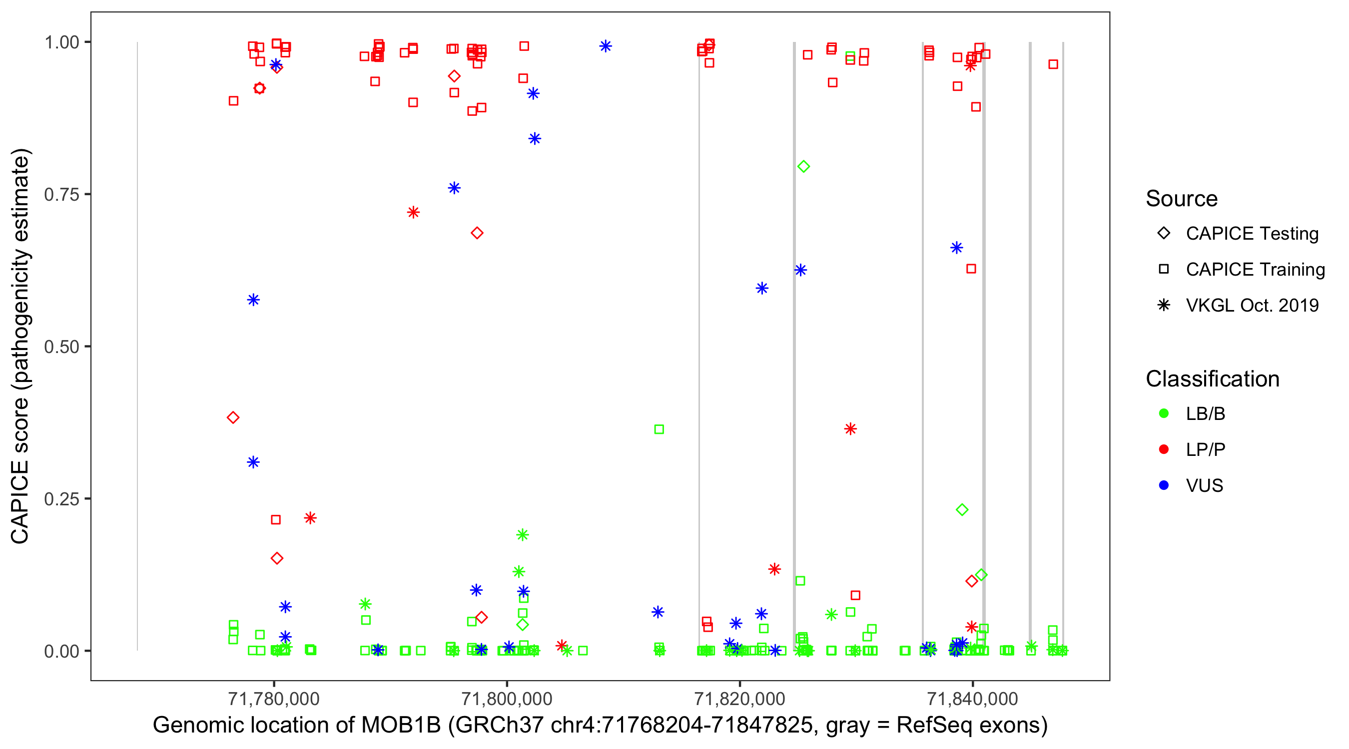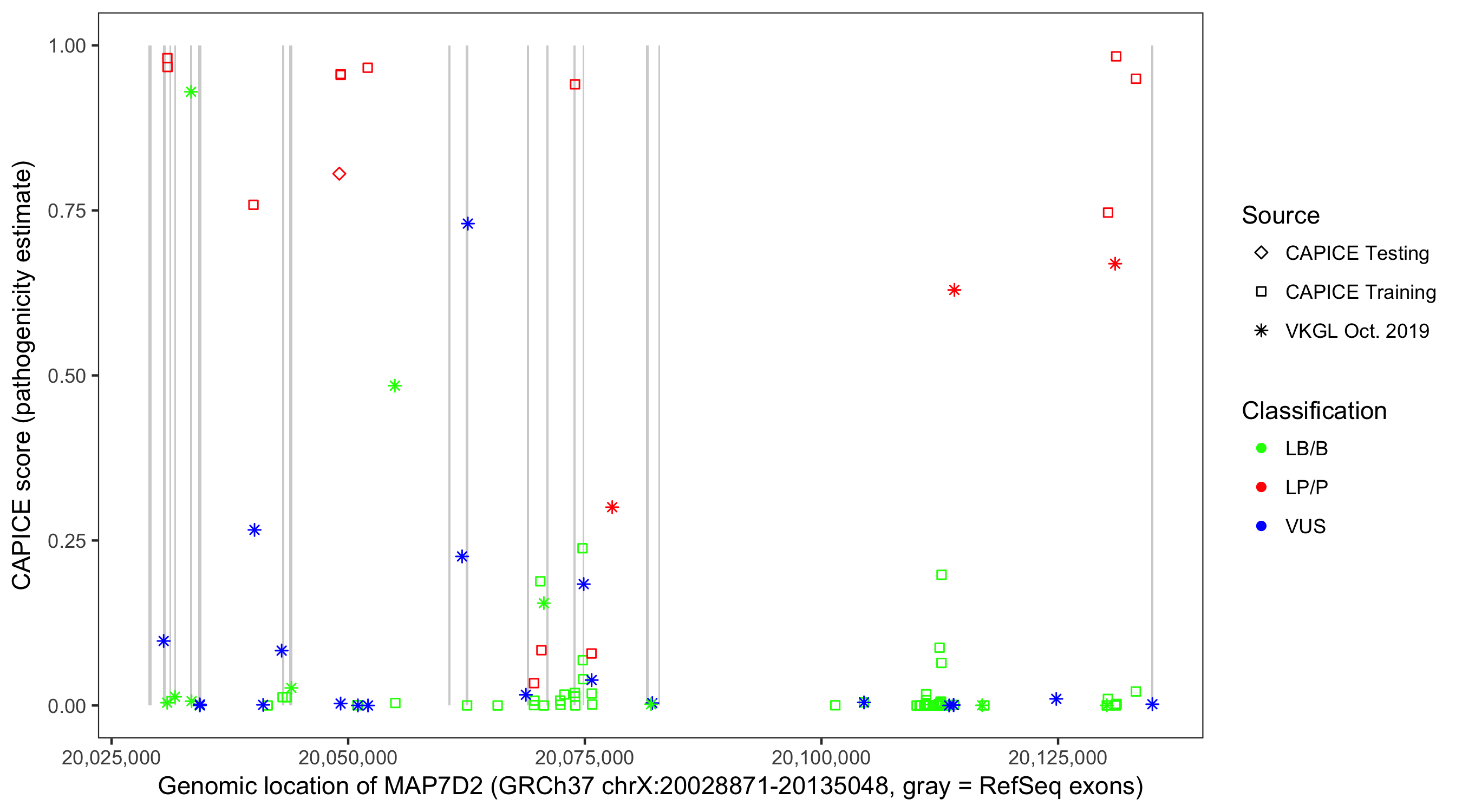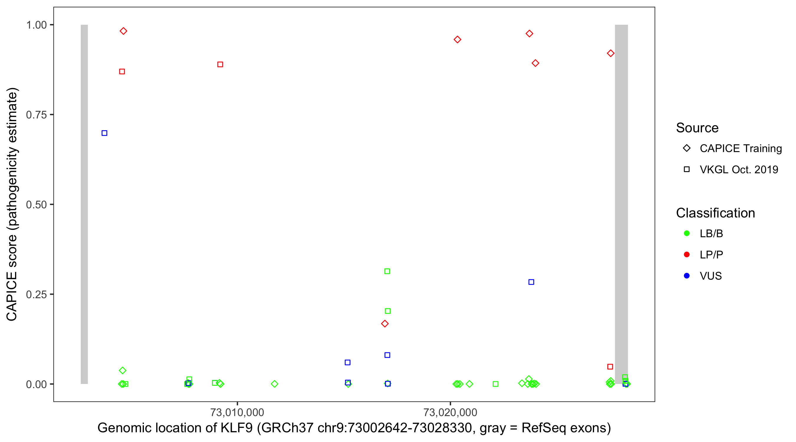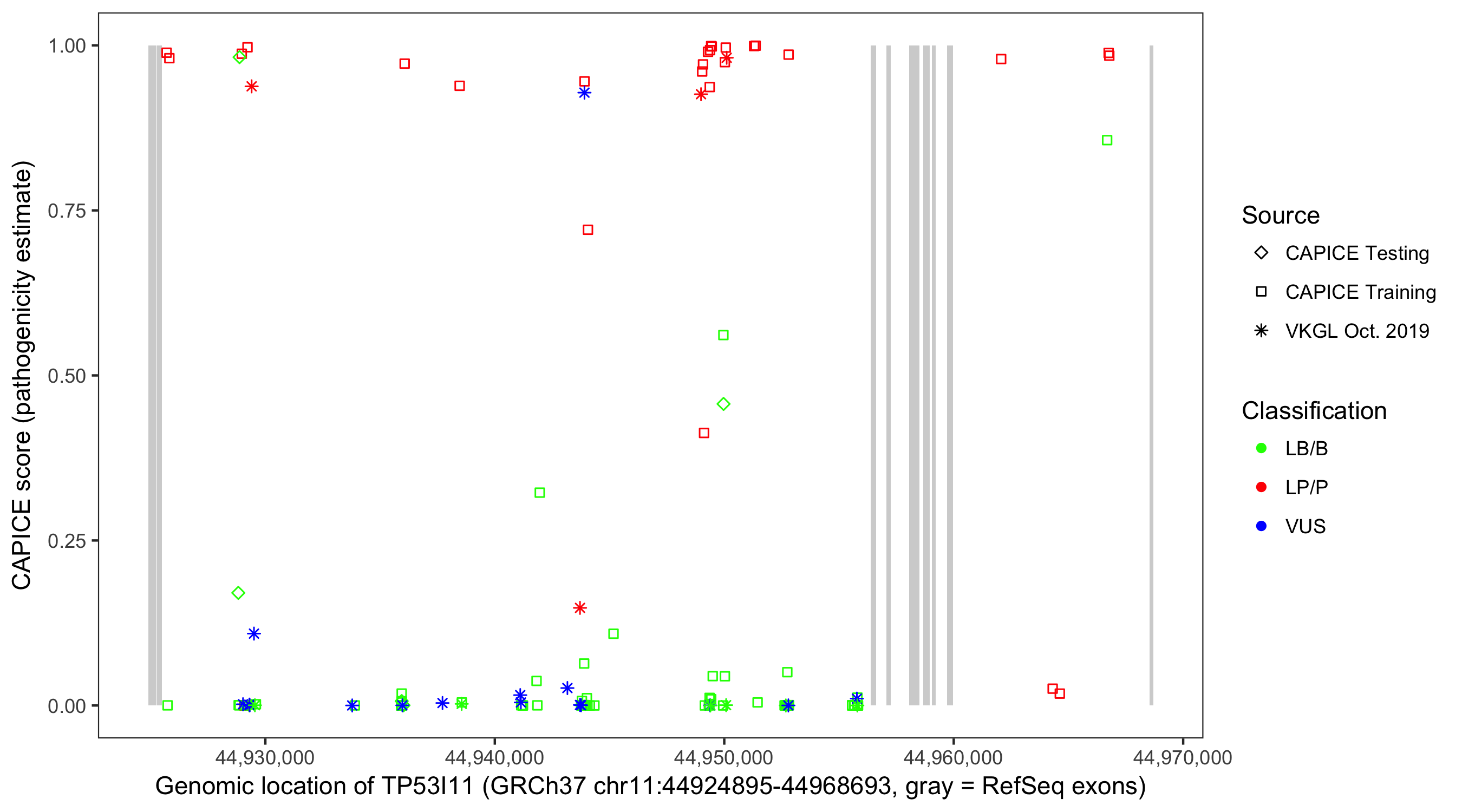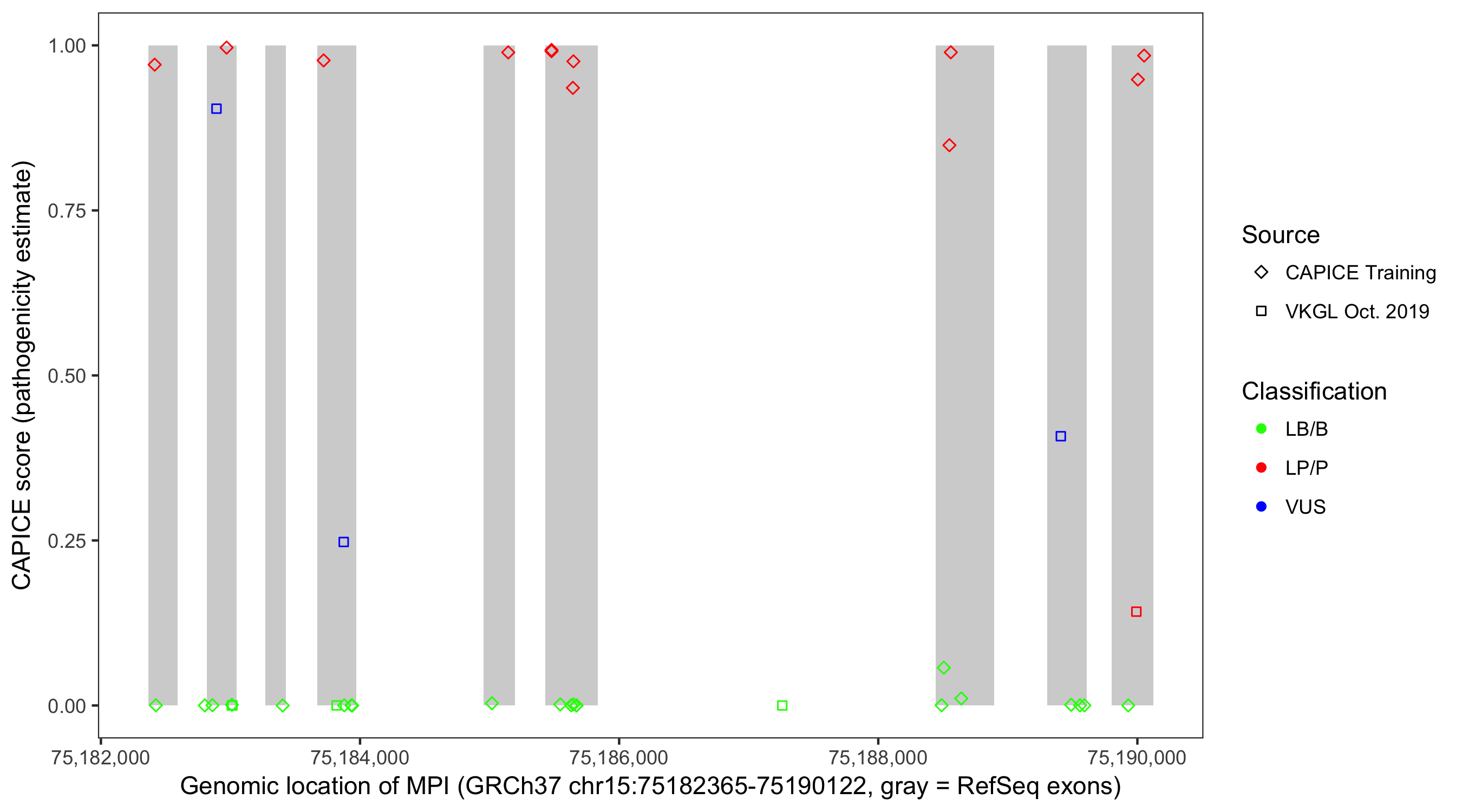 Shown are CAPICE train/test variants plus VKGL Oct 2019.