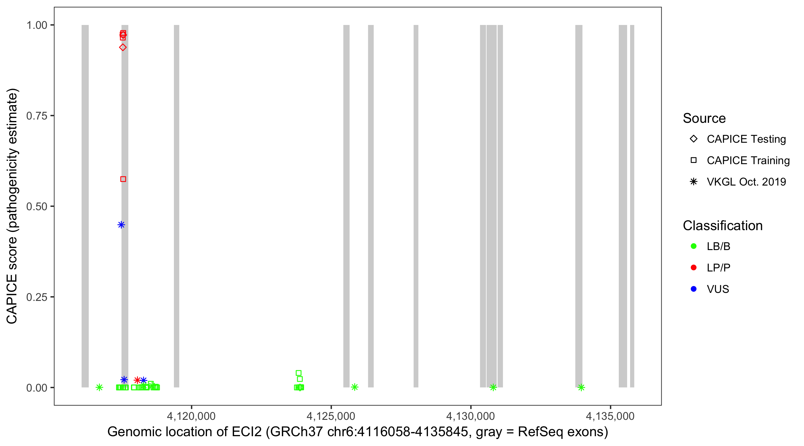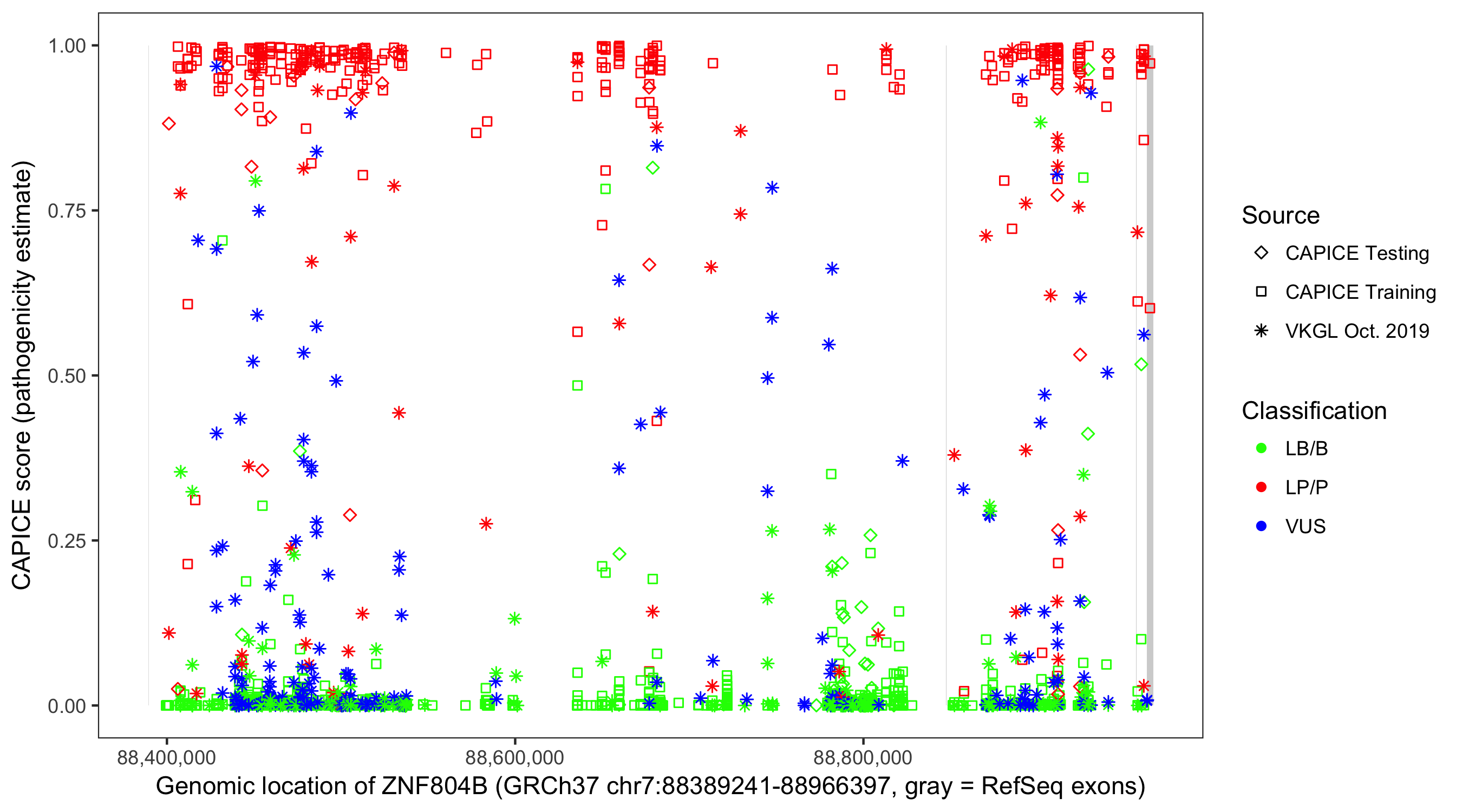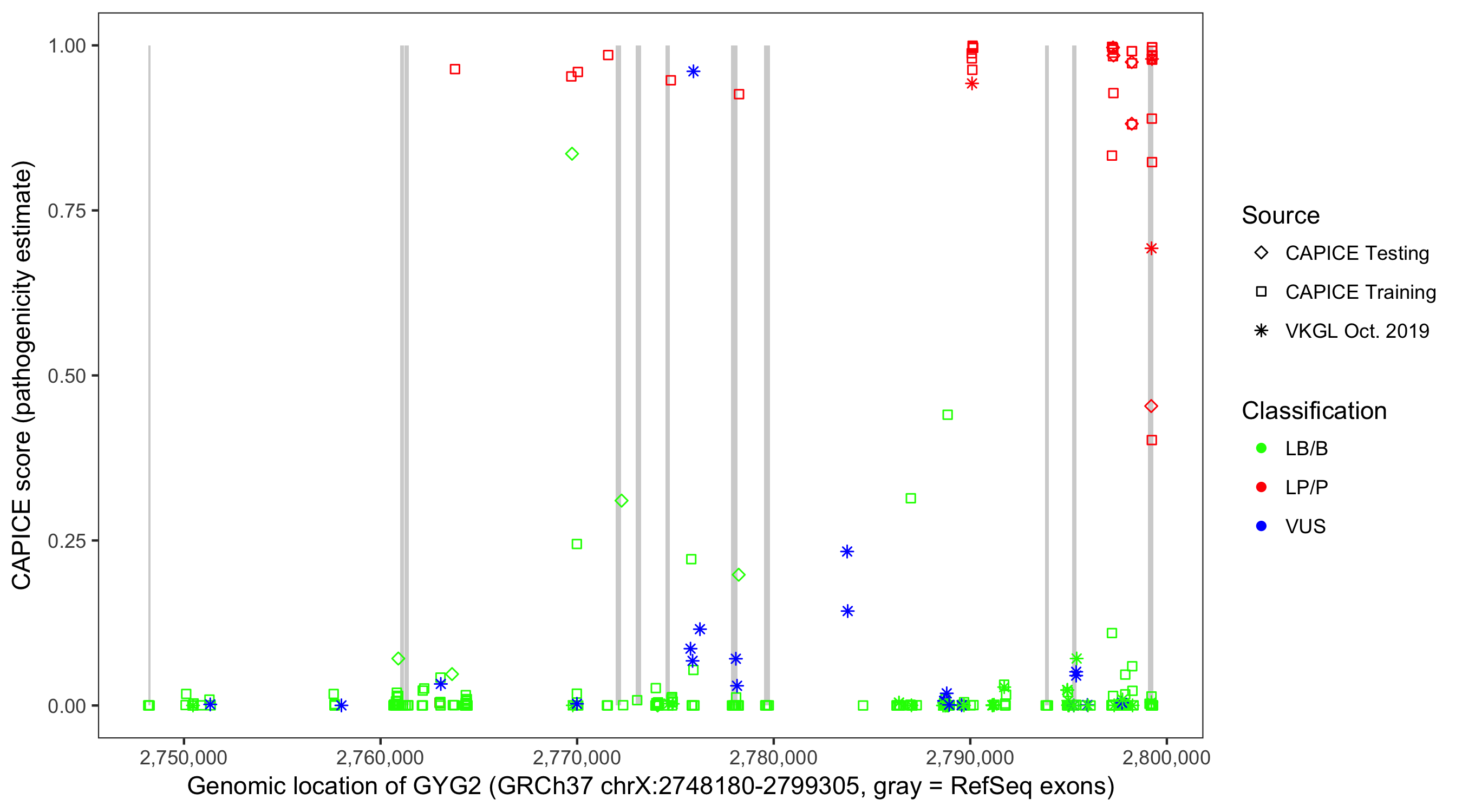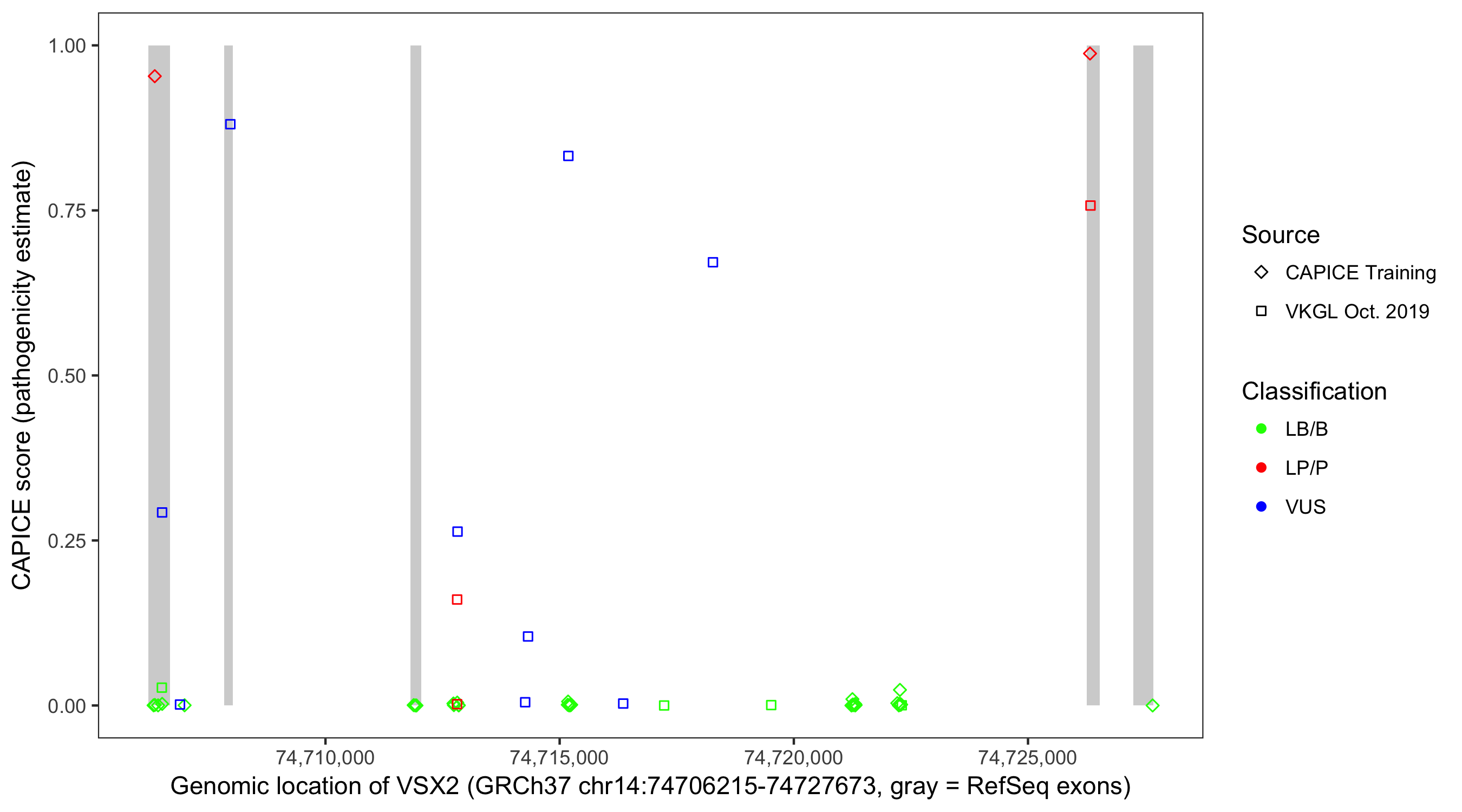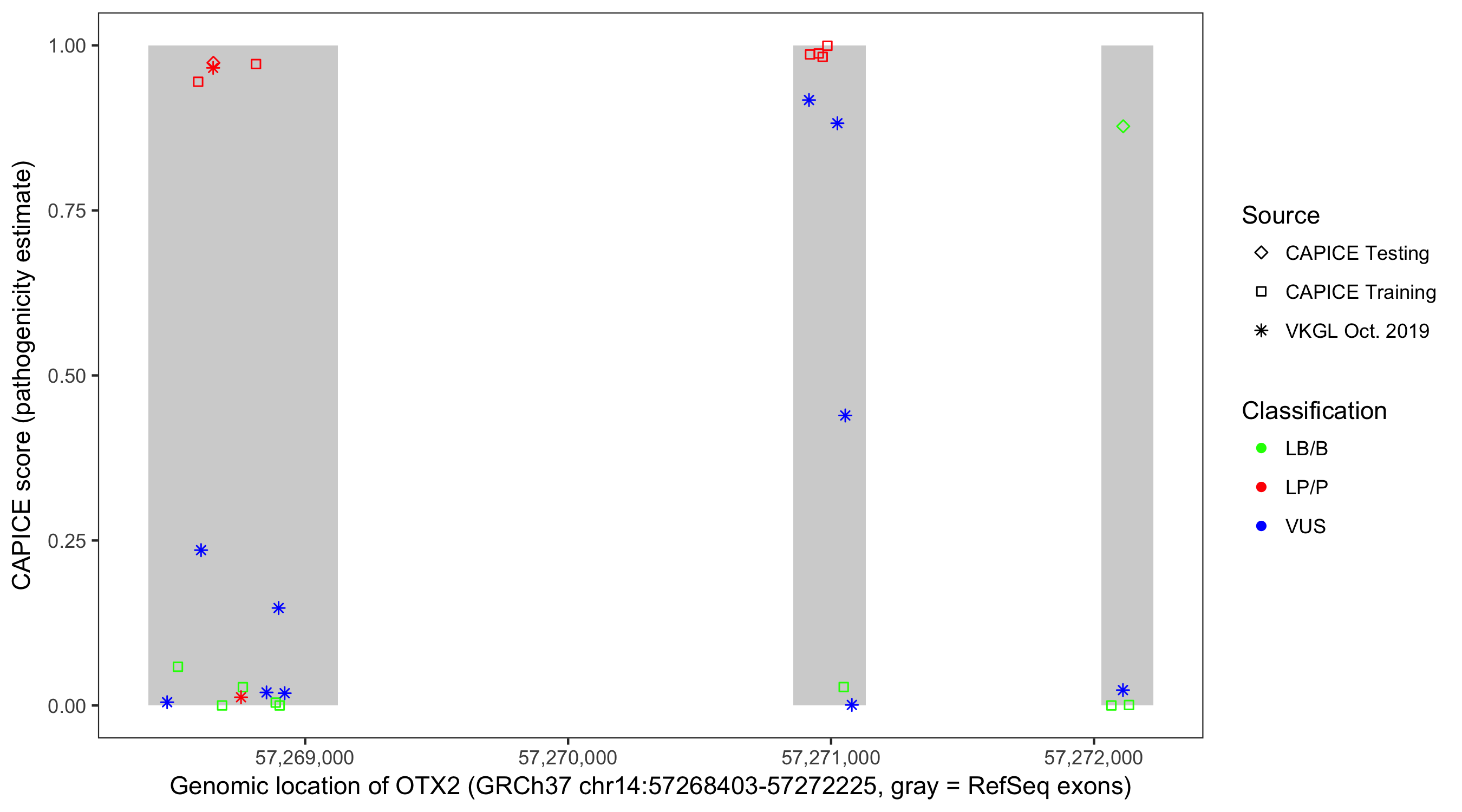 Shown are CAPICE train/test variants plus VKGL Oct 2019.