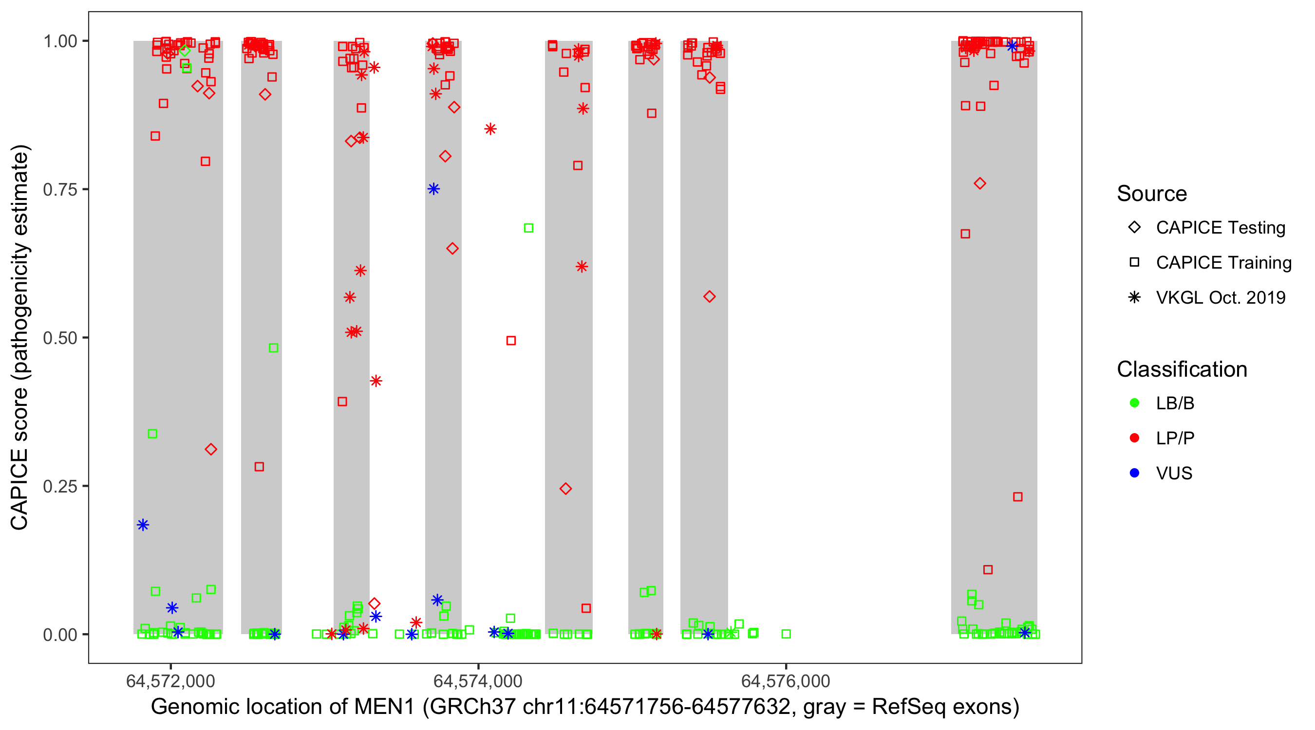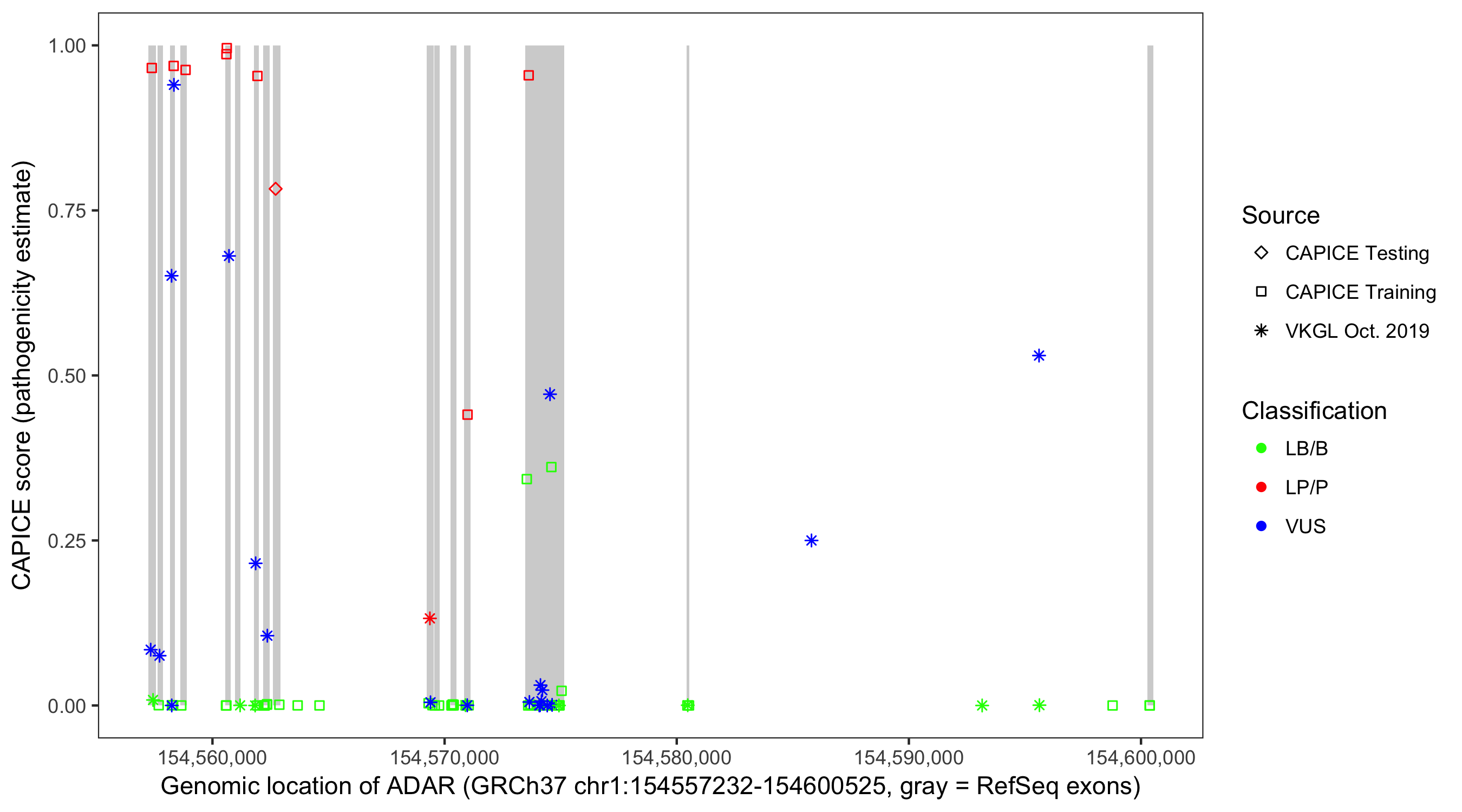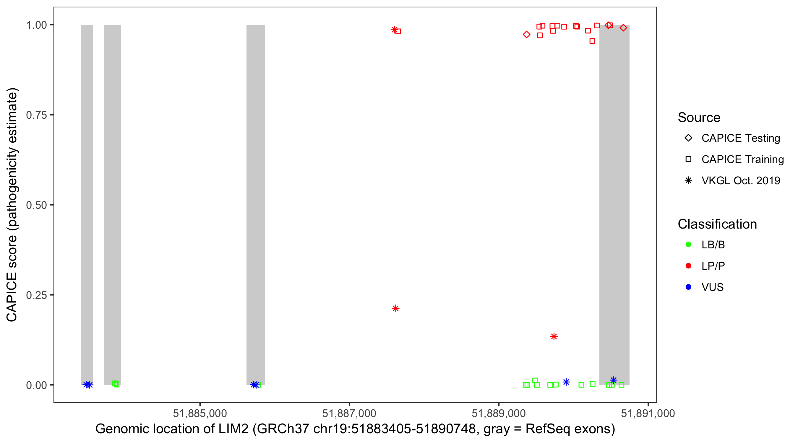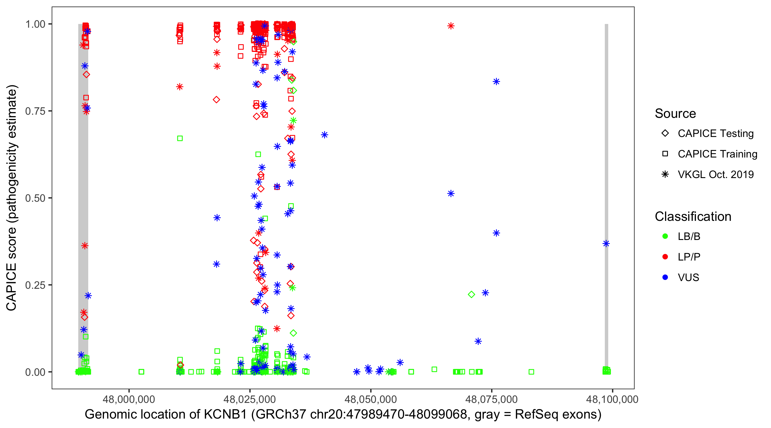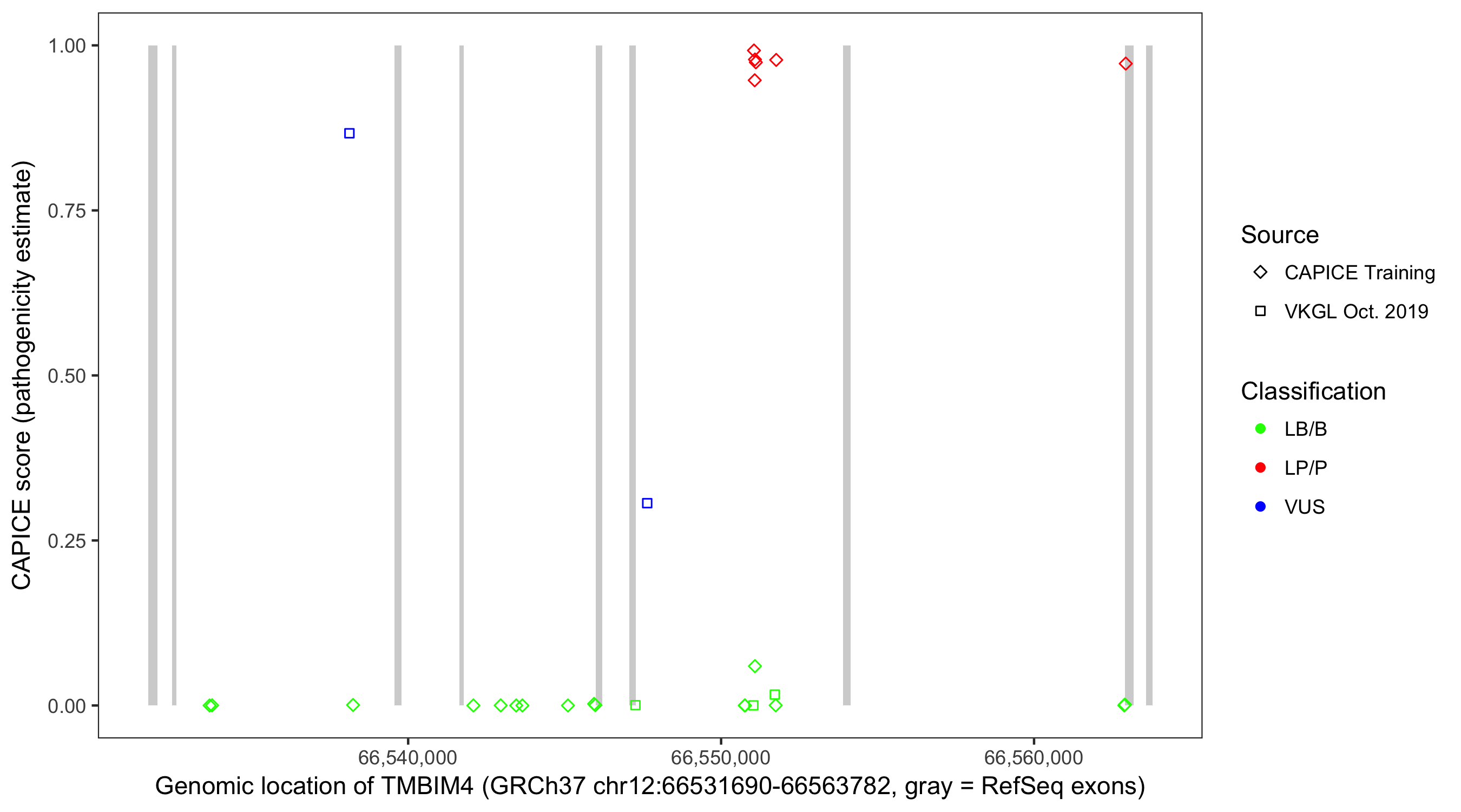 Shown are CAPICE train/test variants plus VKGL Oct 2019.