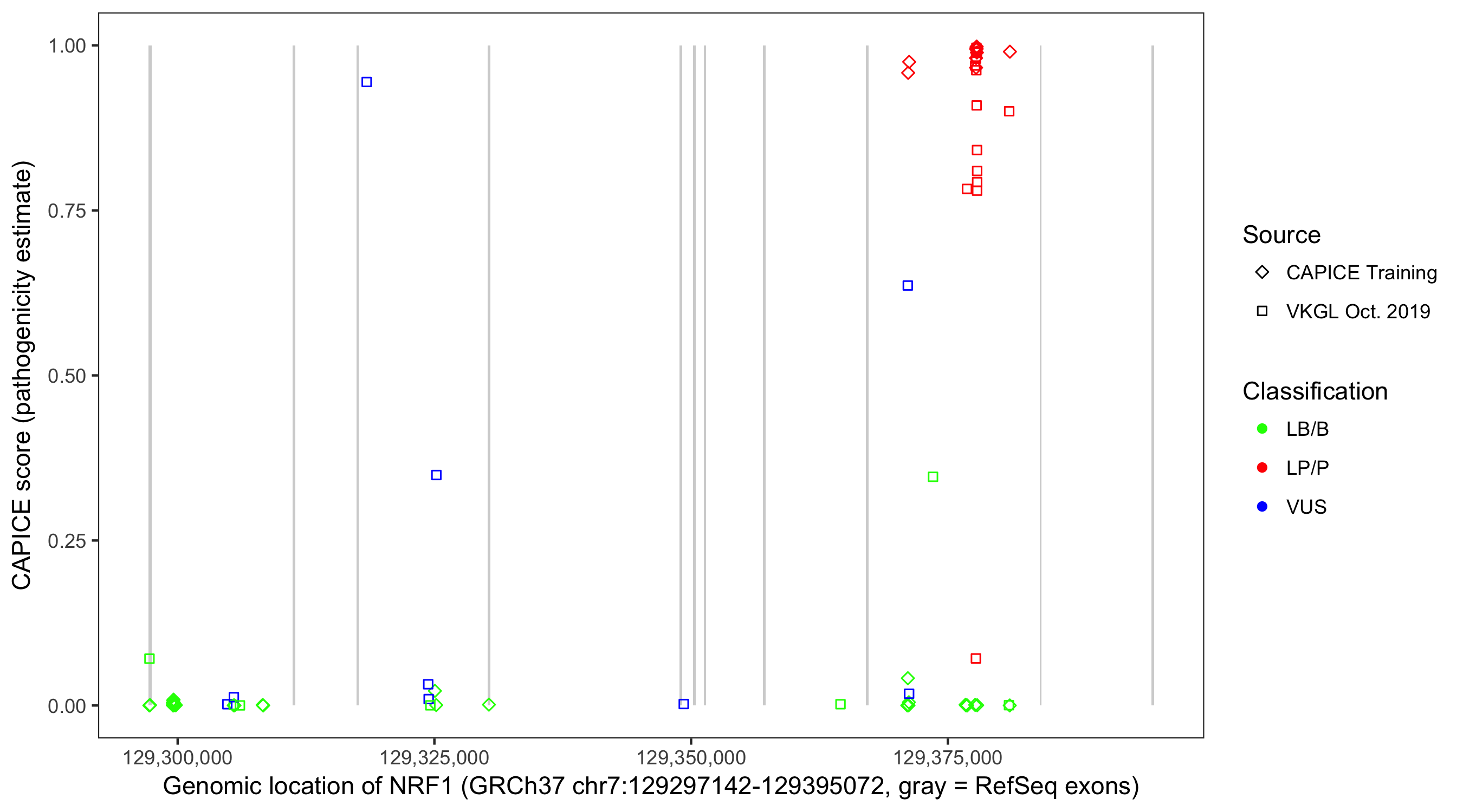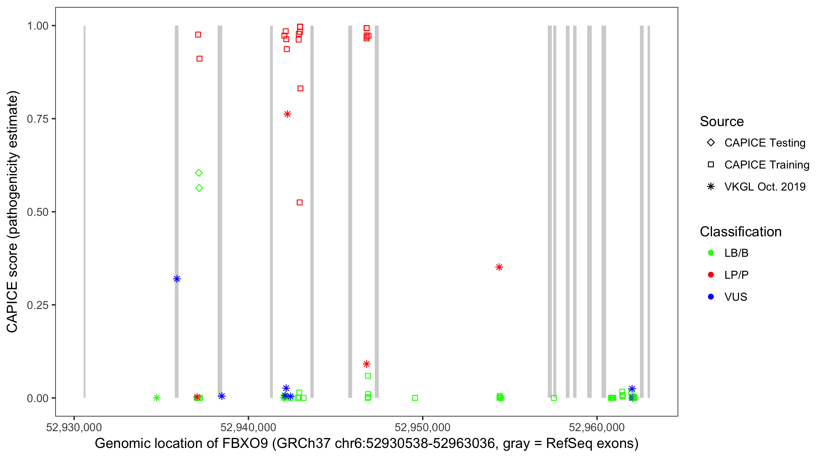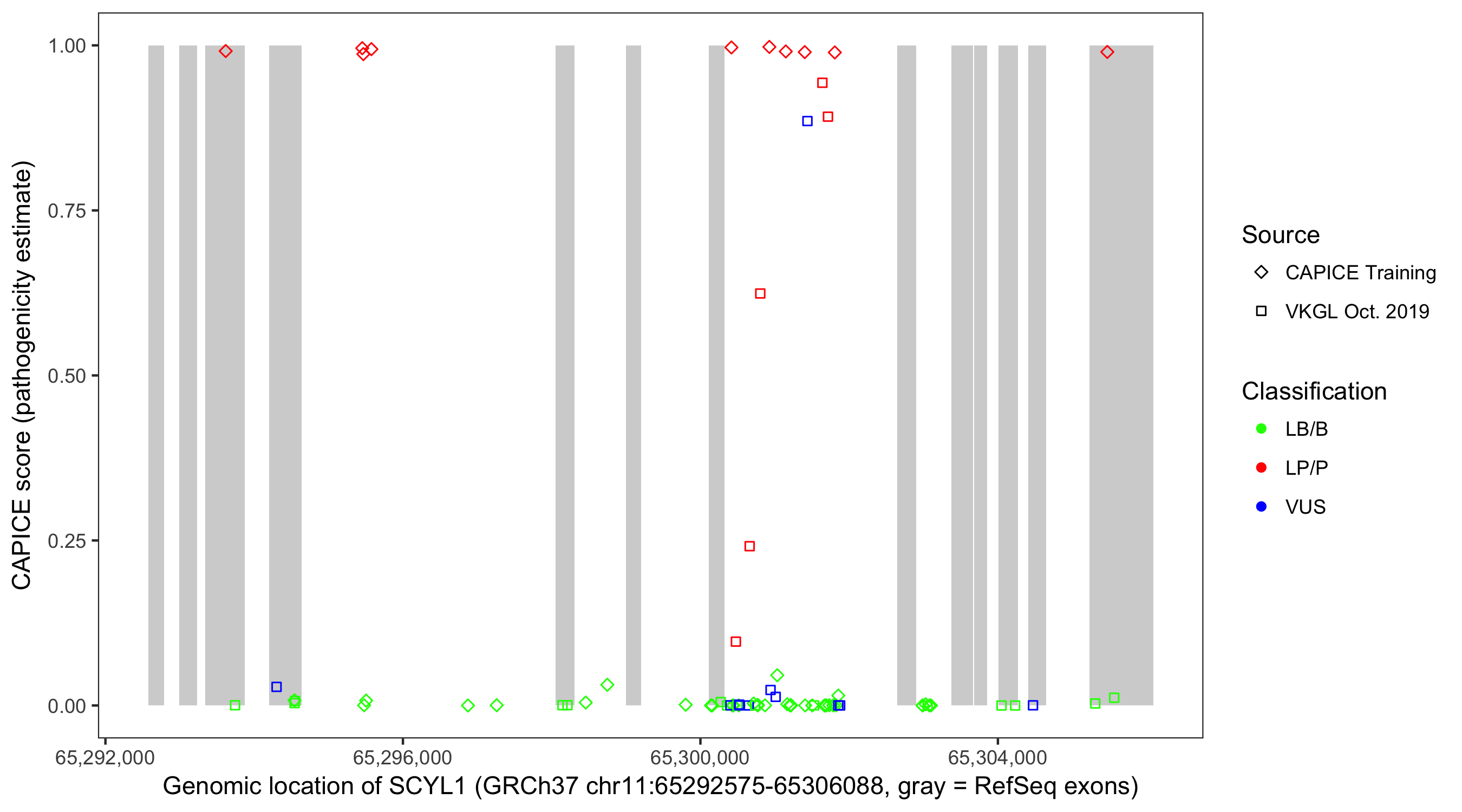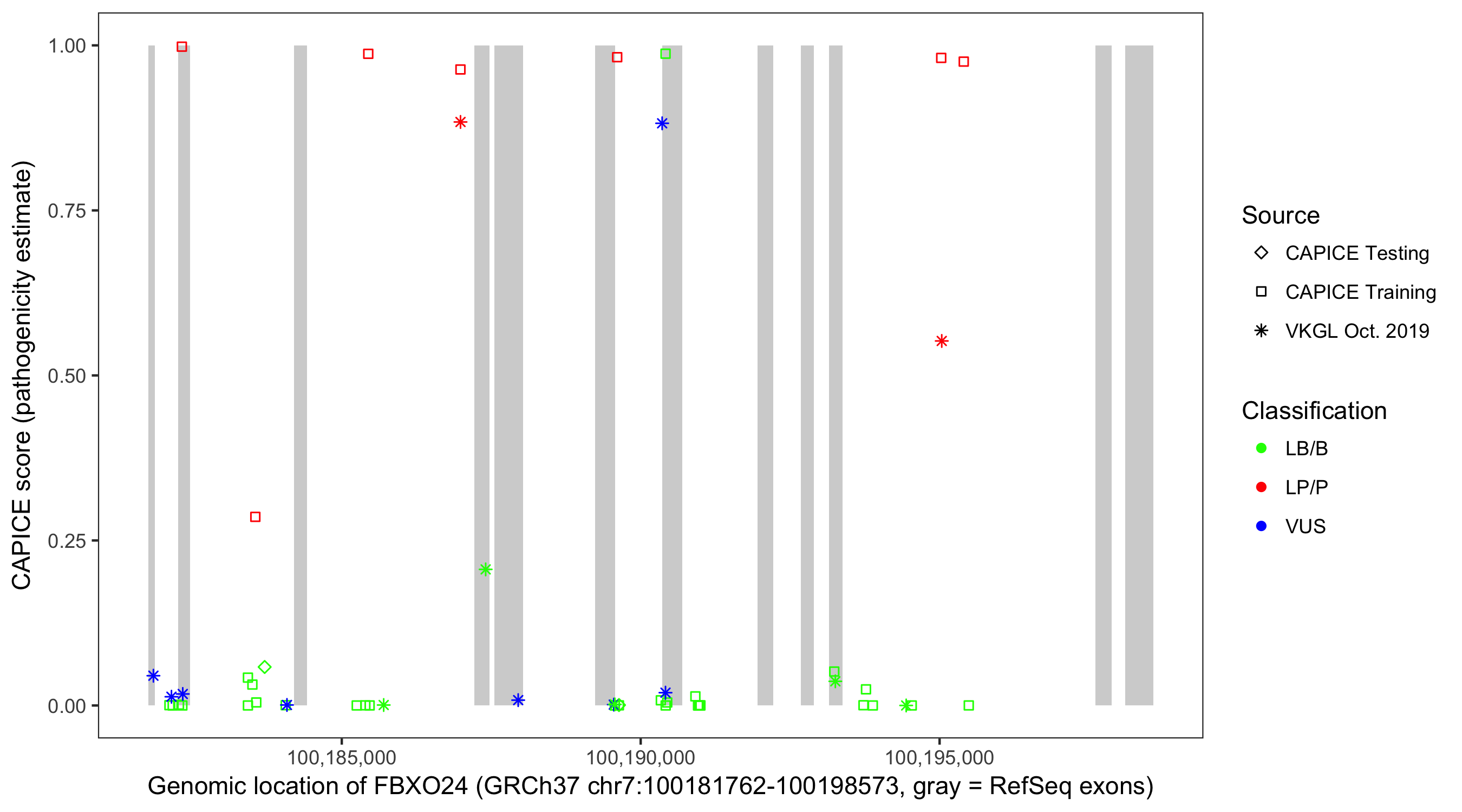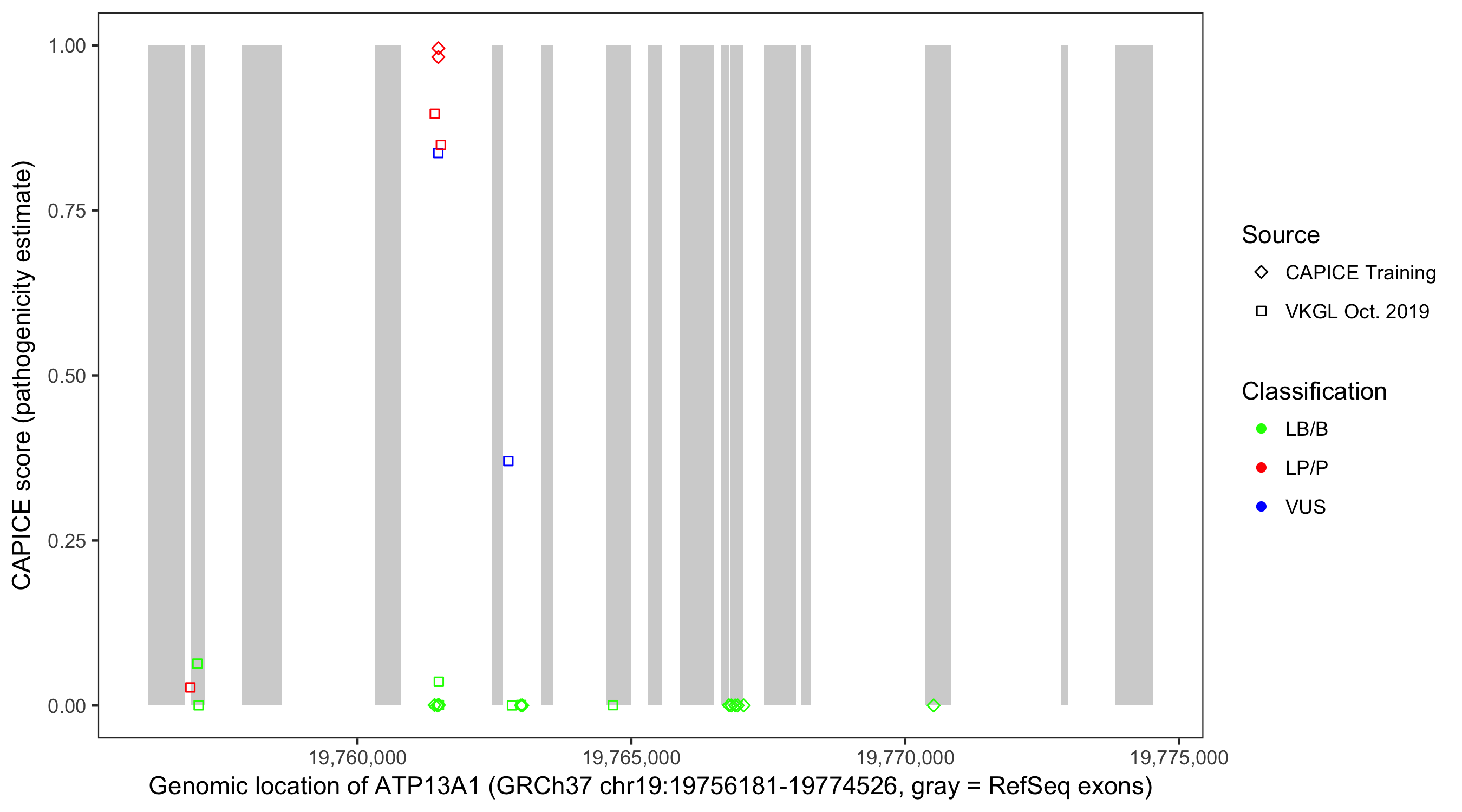 Shown are CAPICE train/test variants plus VKGL Oct 2019.