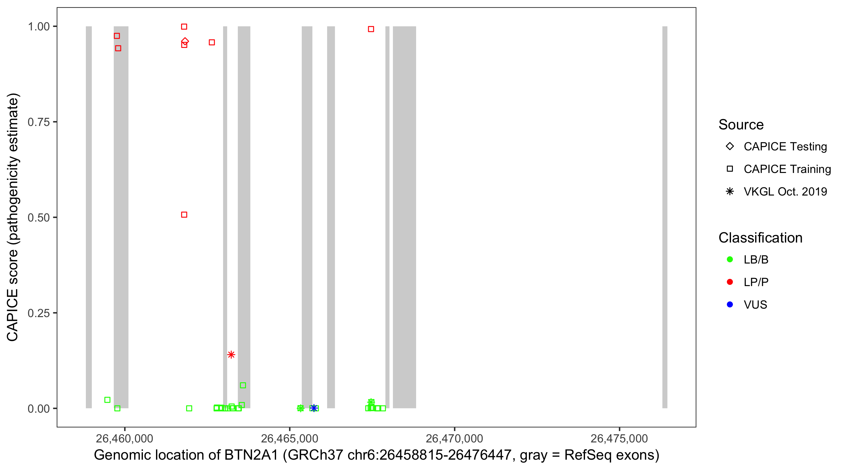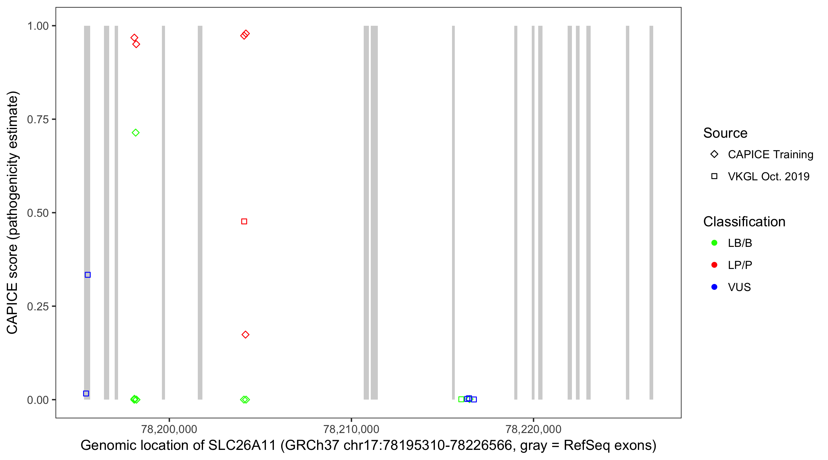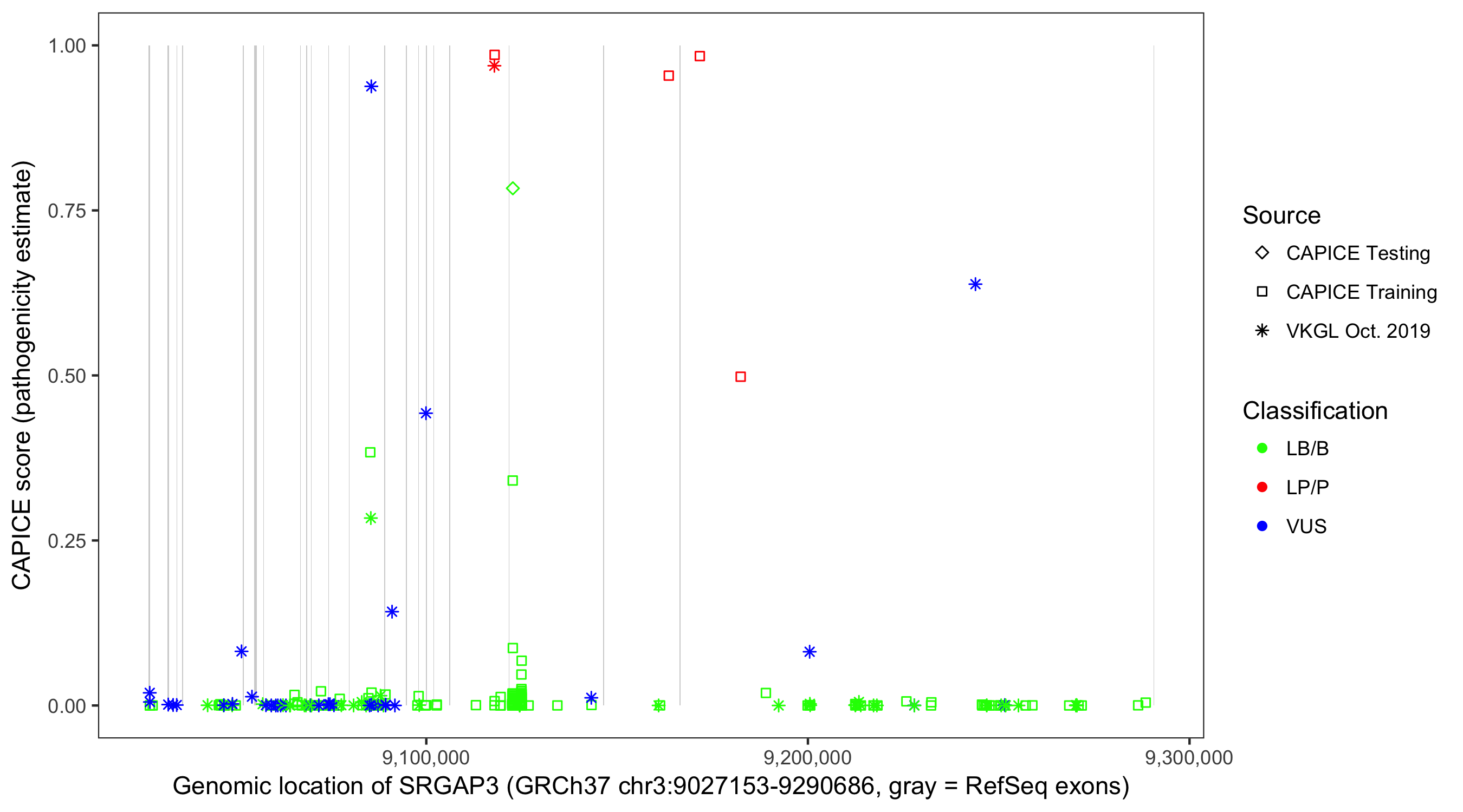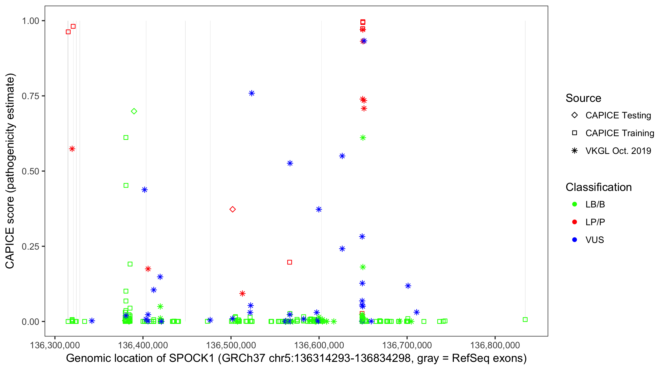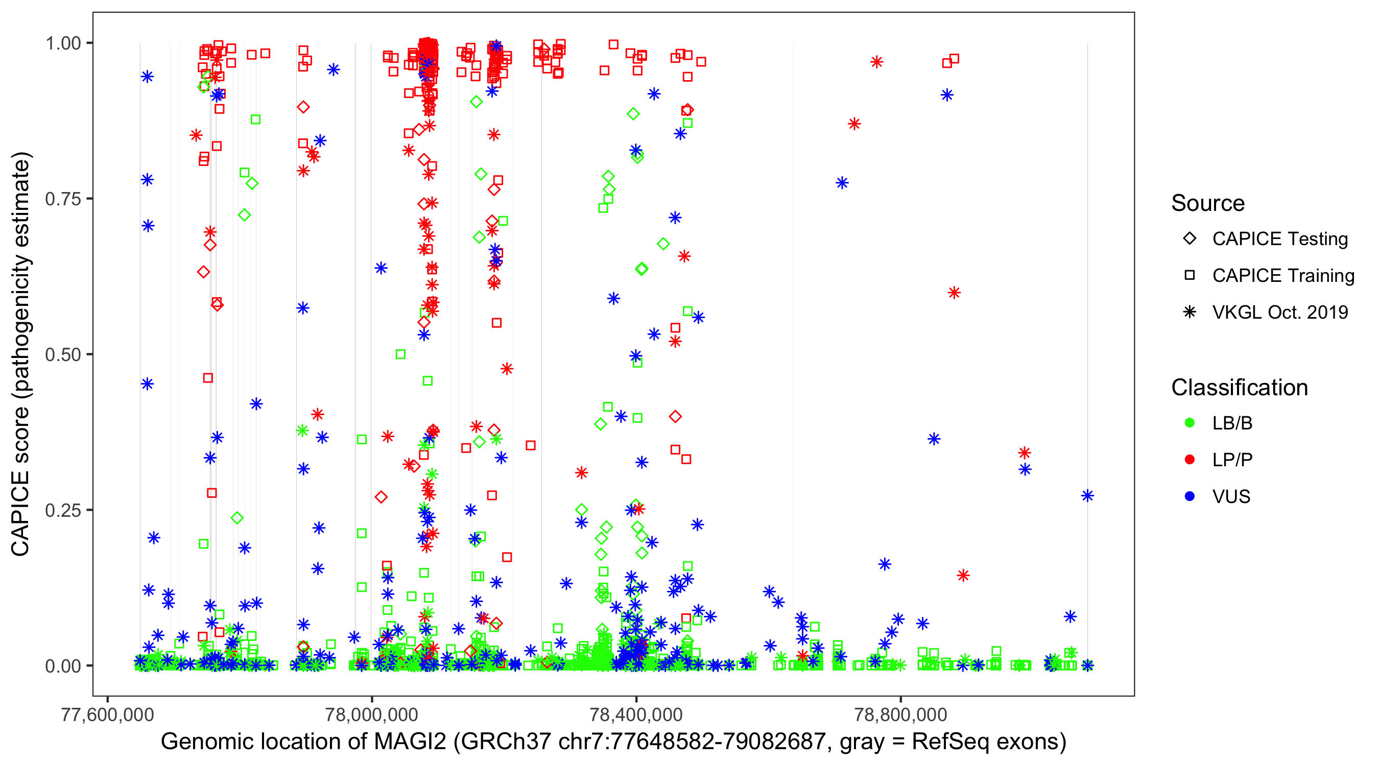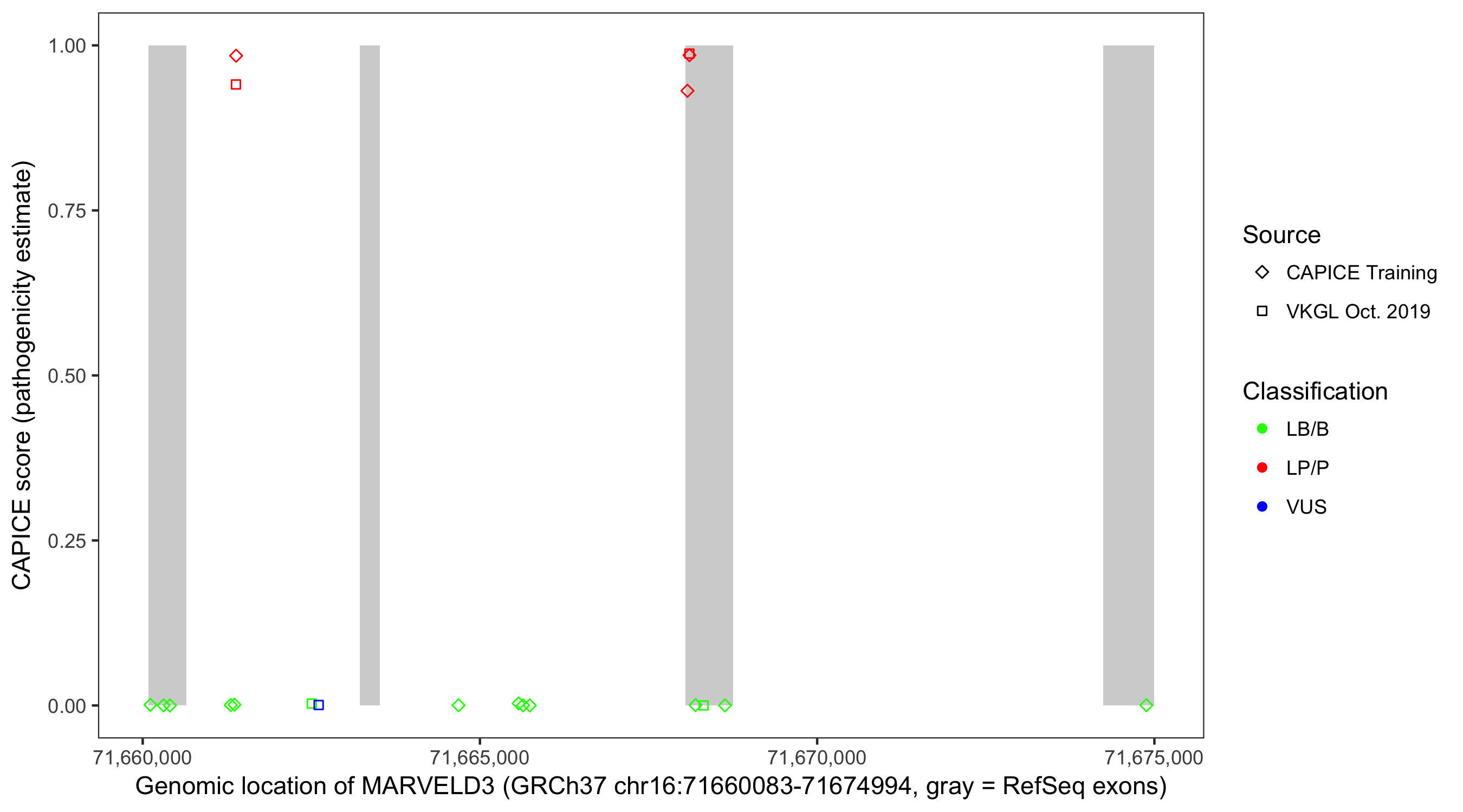 Shown are CAPICE train/test variants plus VKGL Oct 2019.