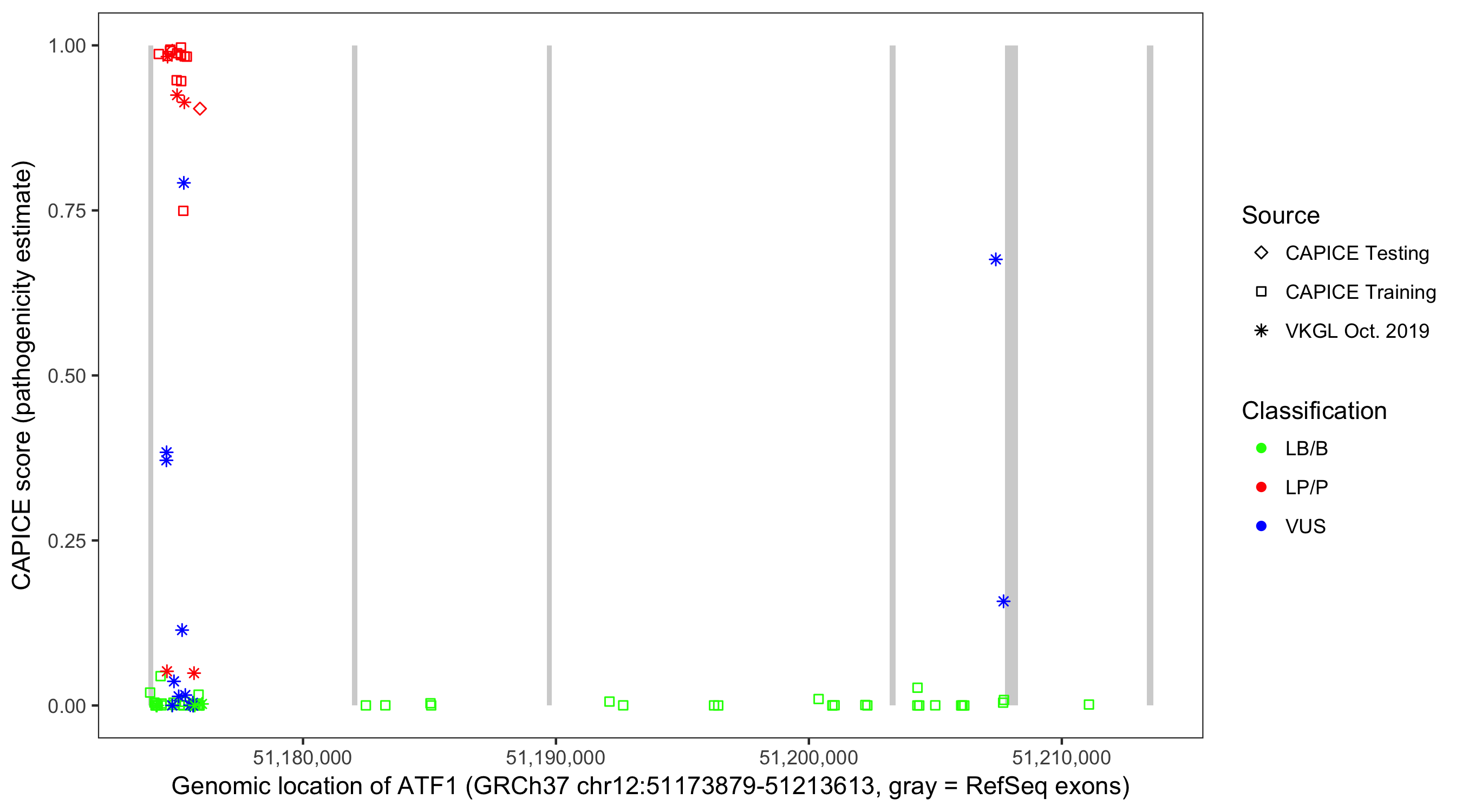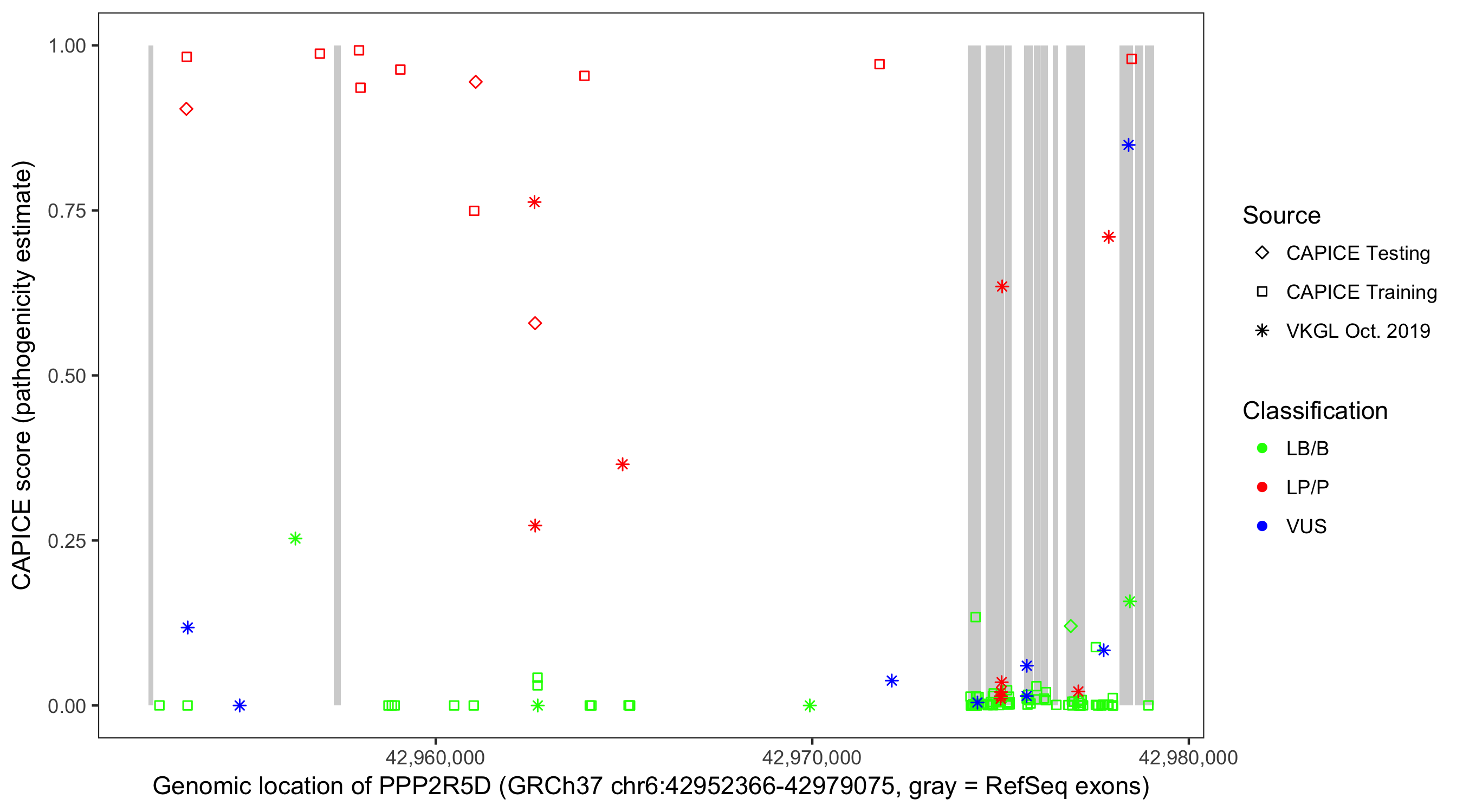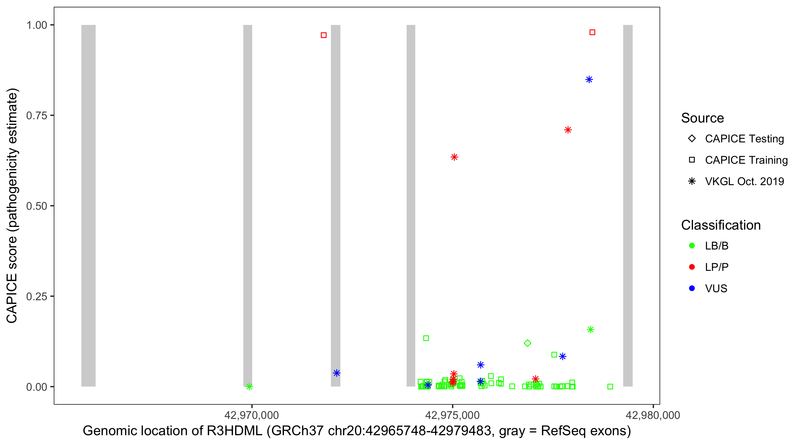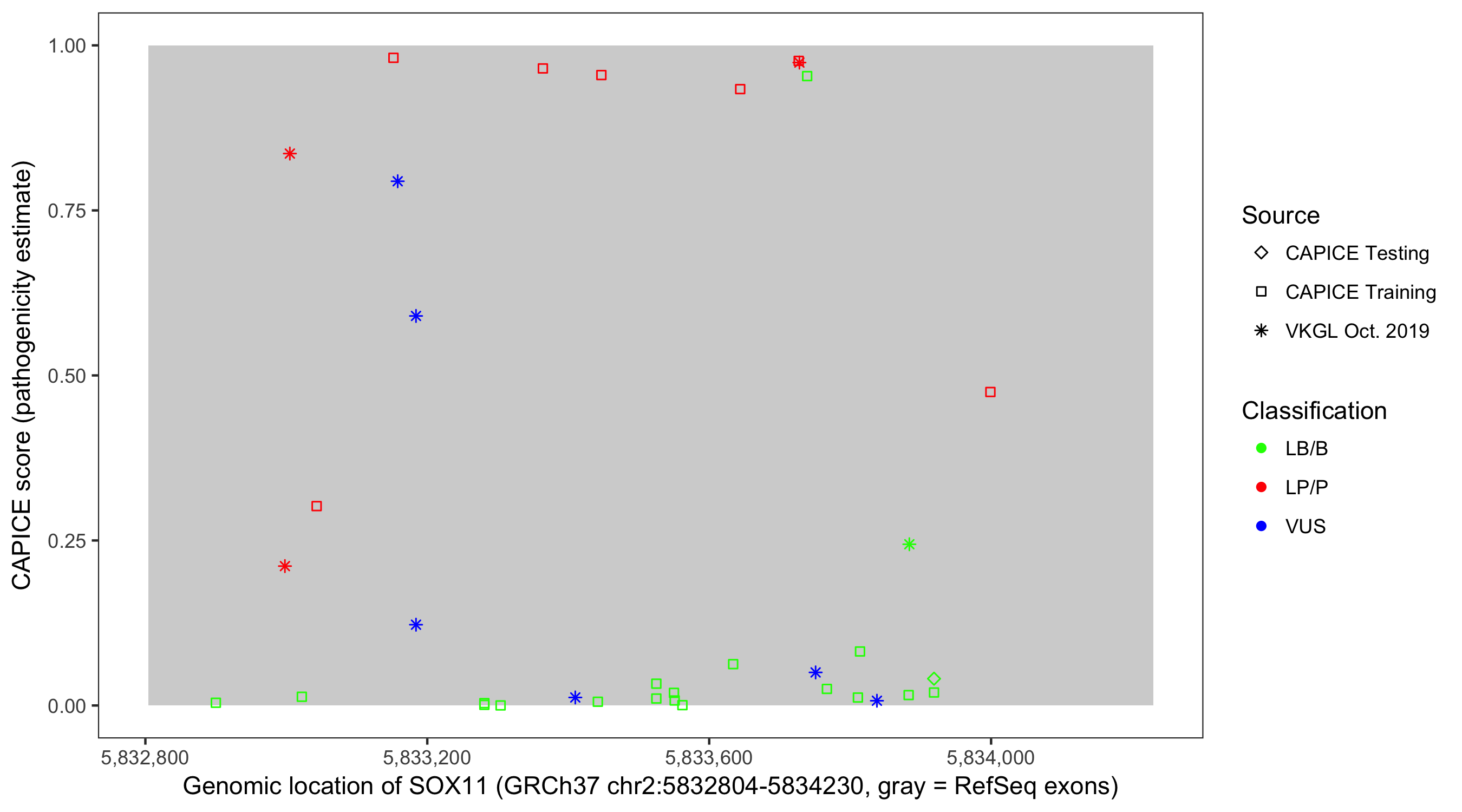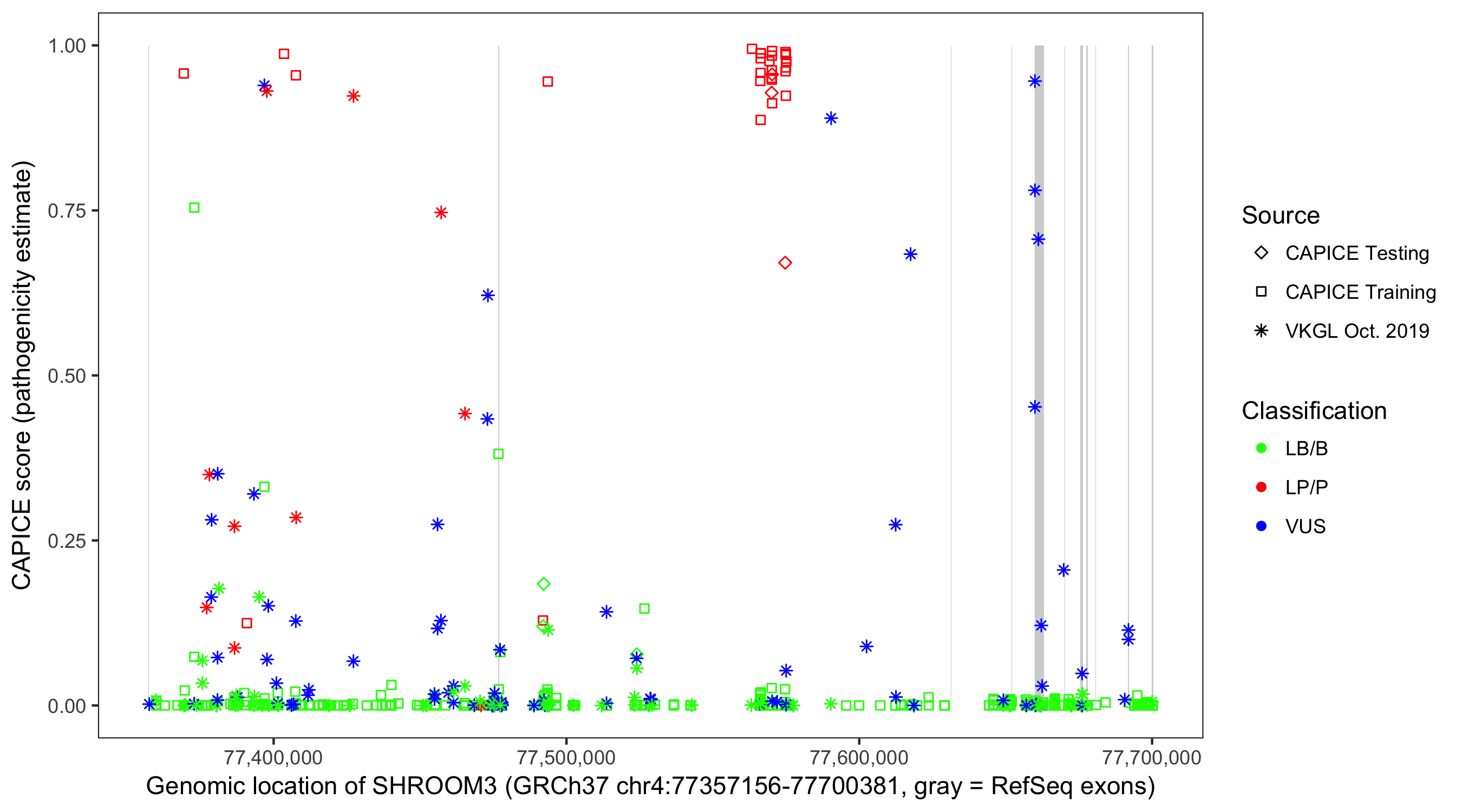Shown are CAPICE train/test variants plus VKGL Oct 2019.