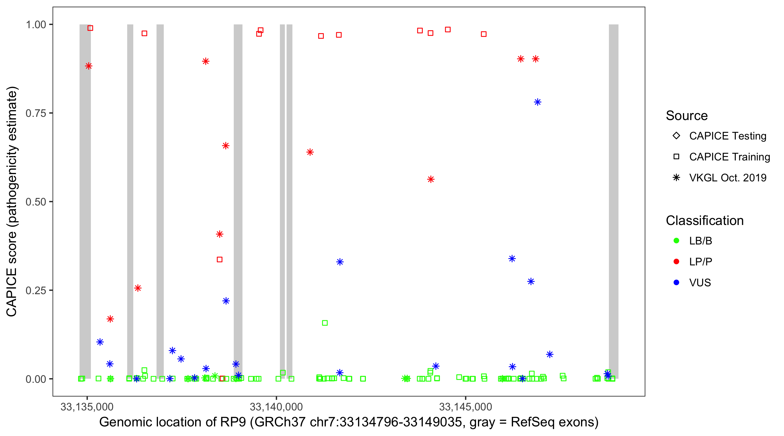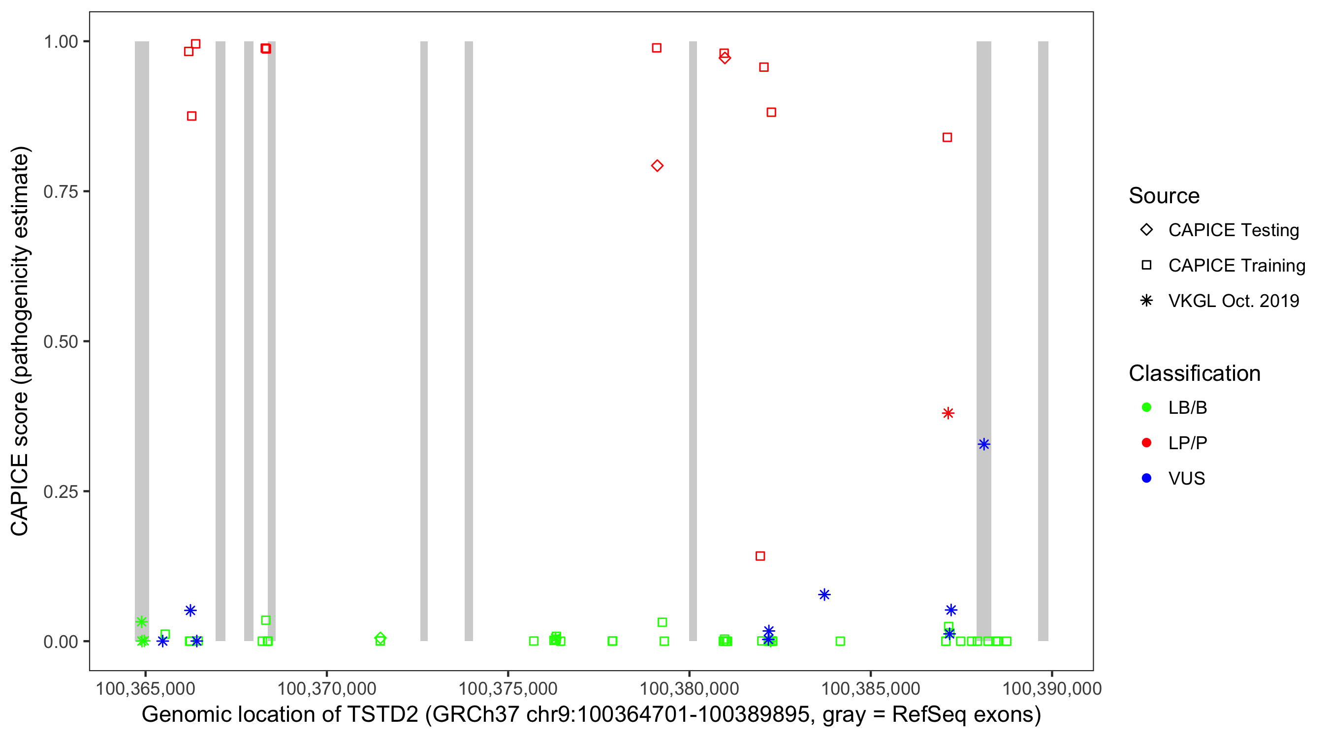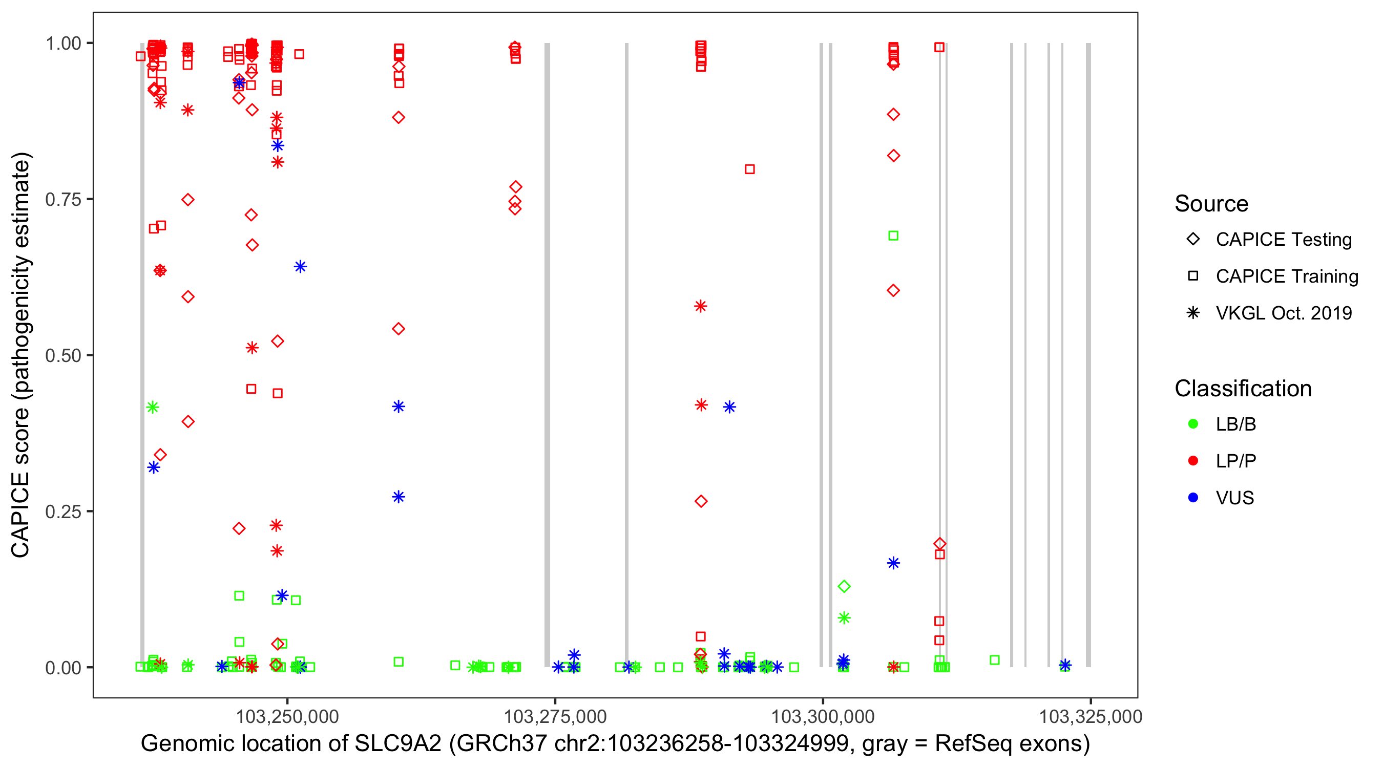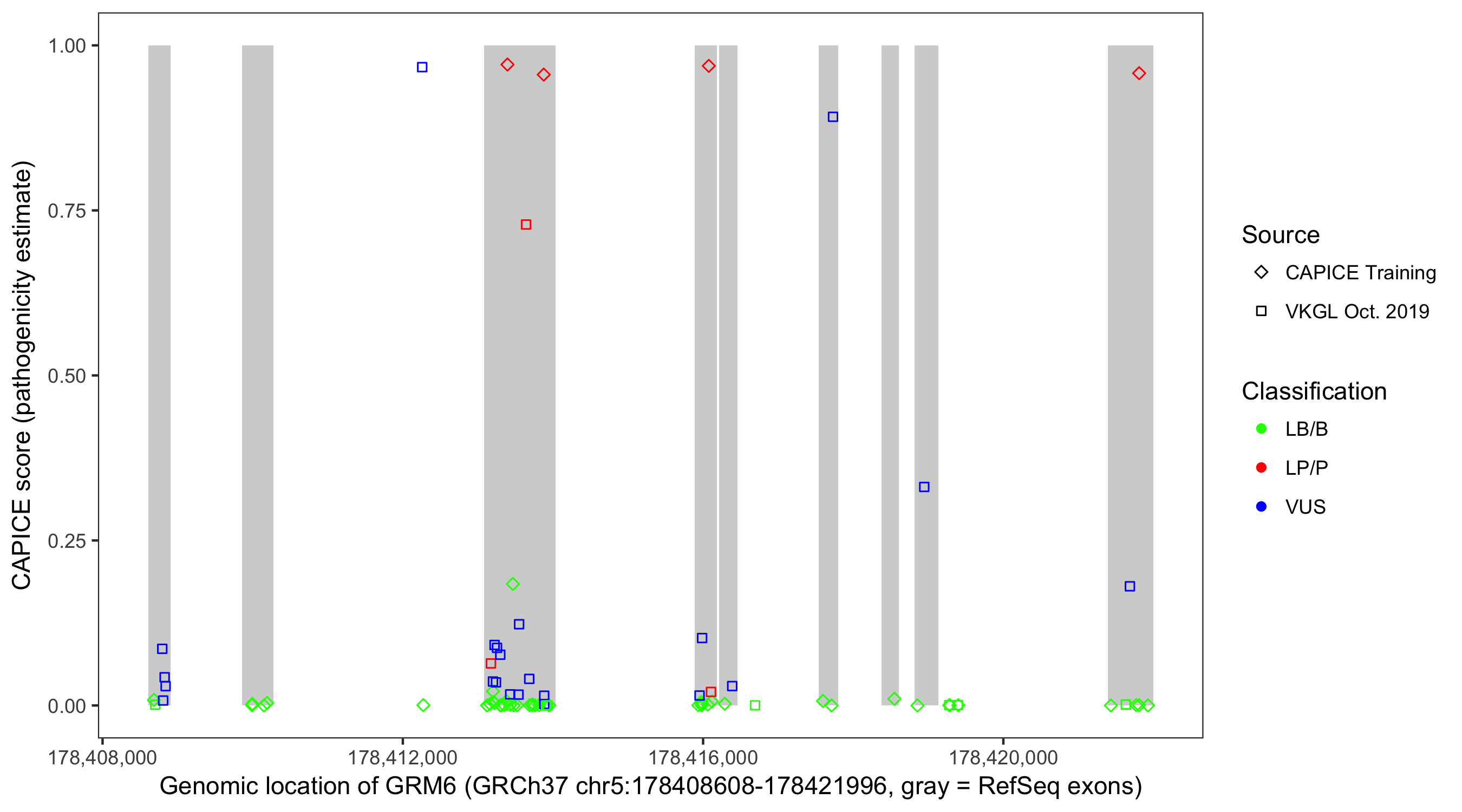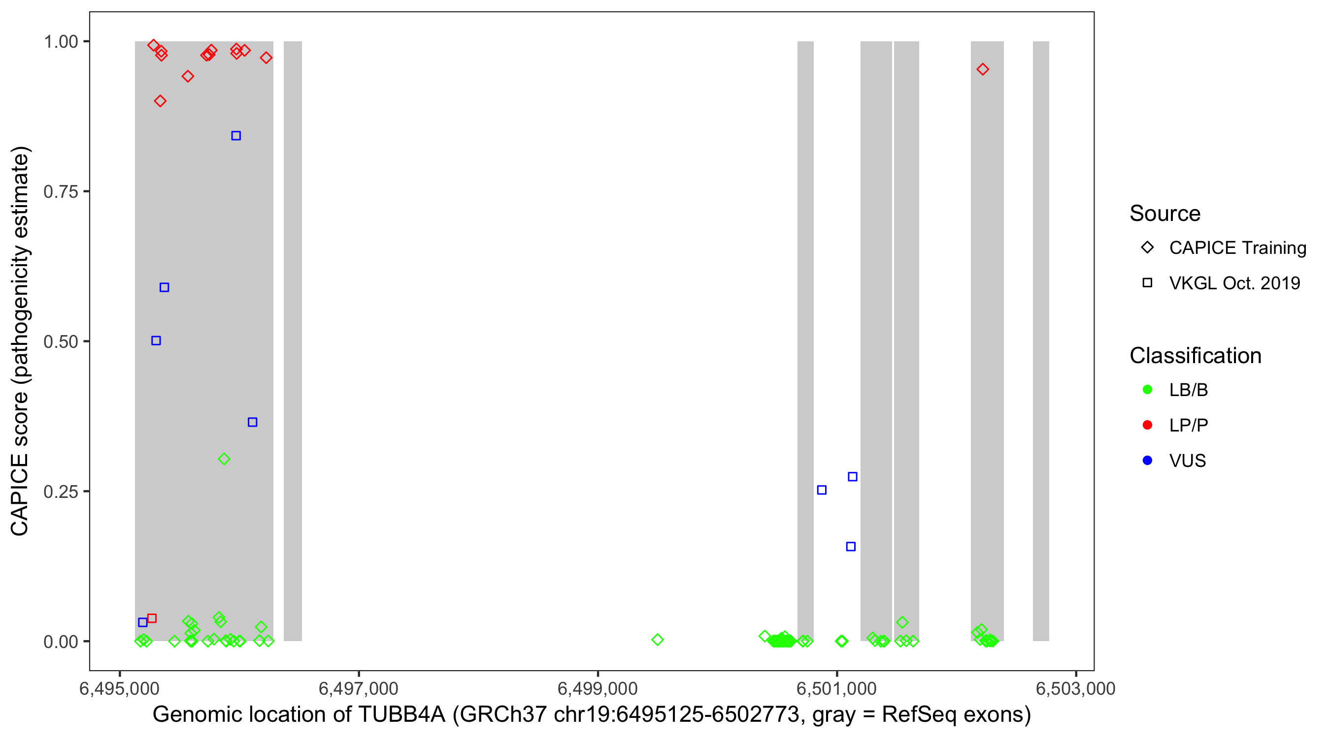 Shown are CAPICE train/test variants plus VKGL Oct 2019.