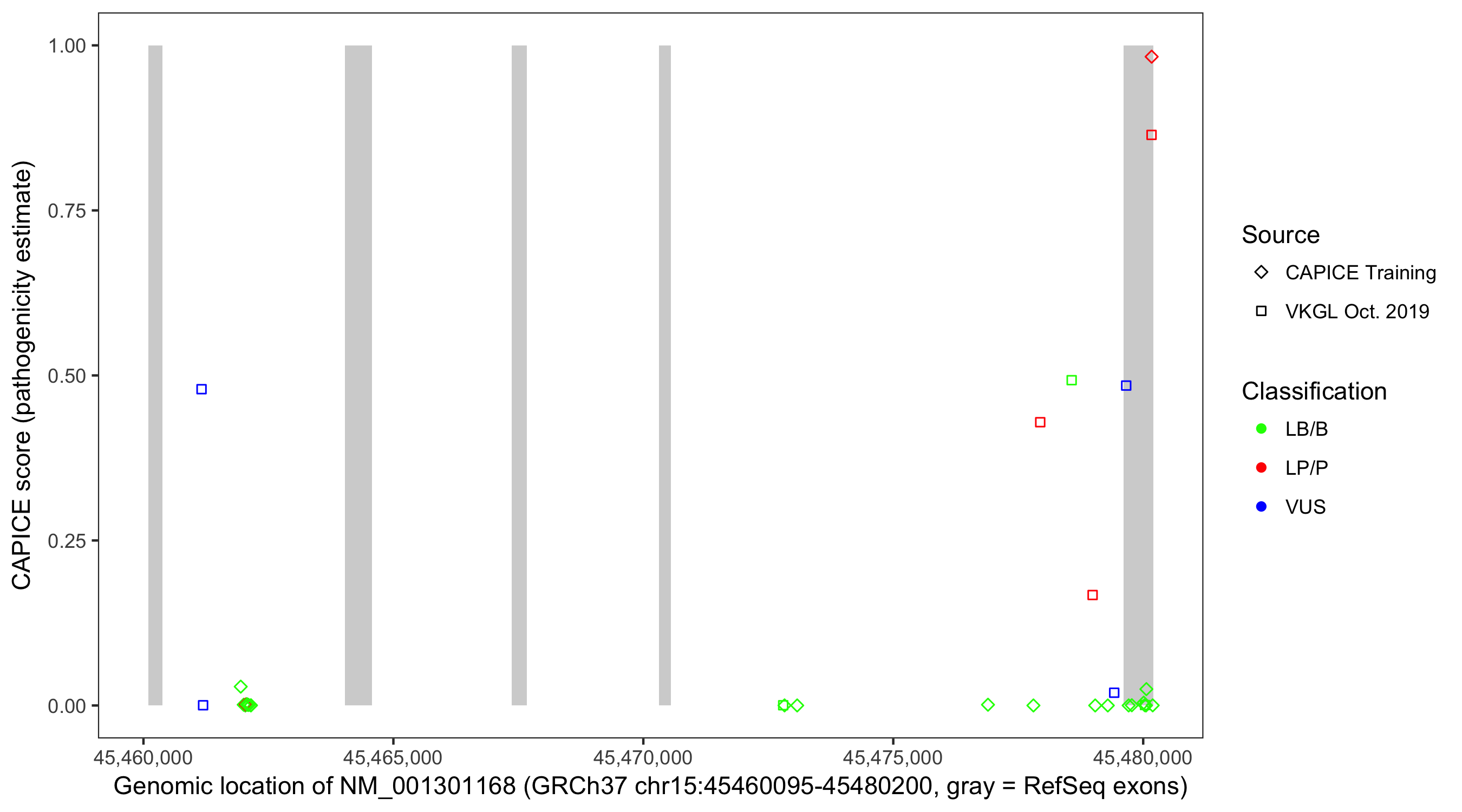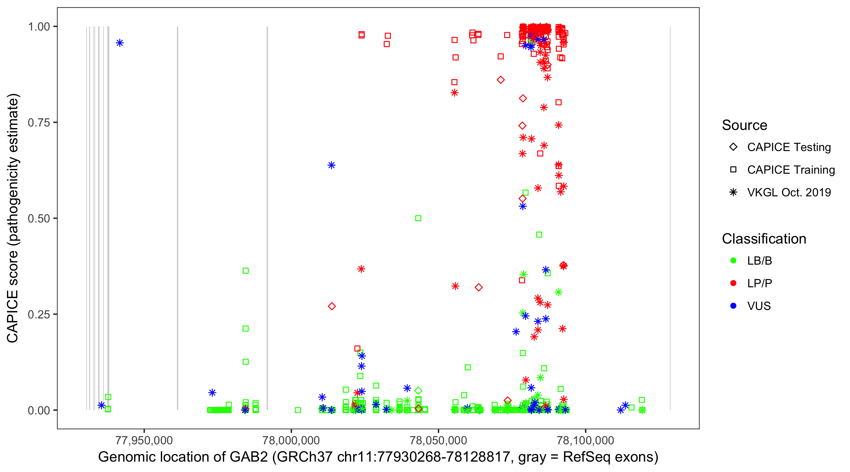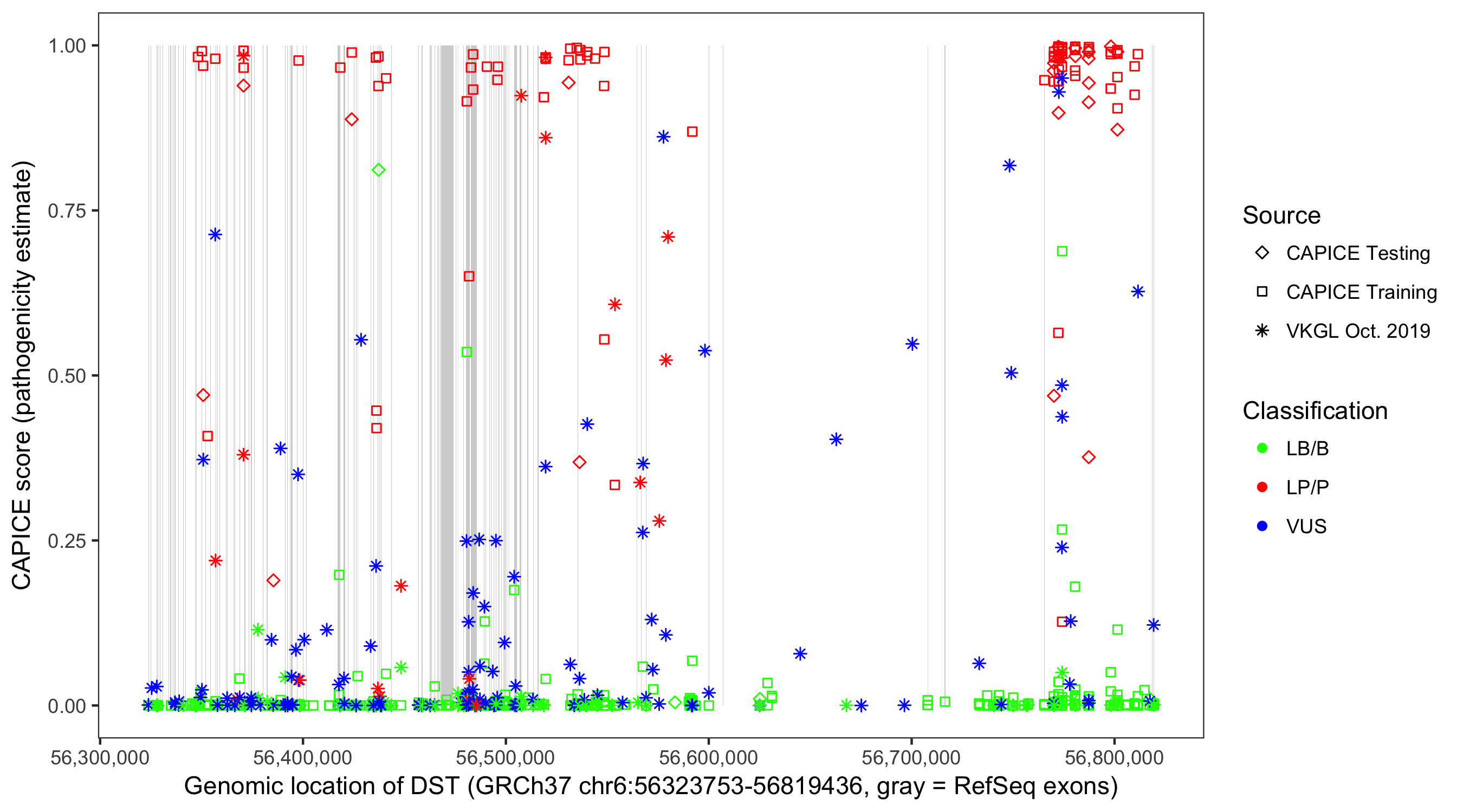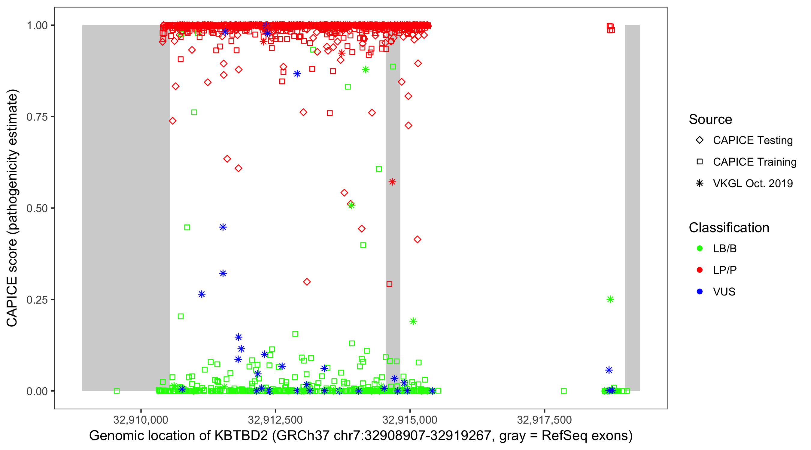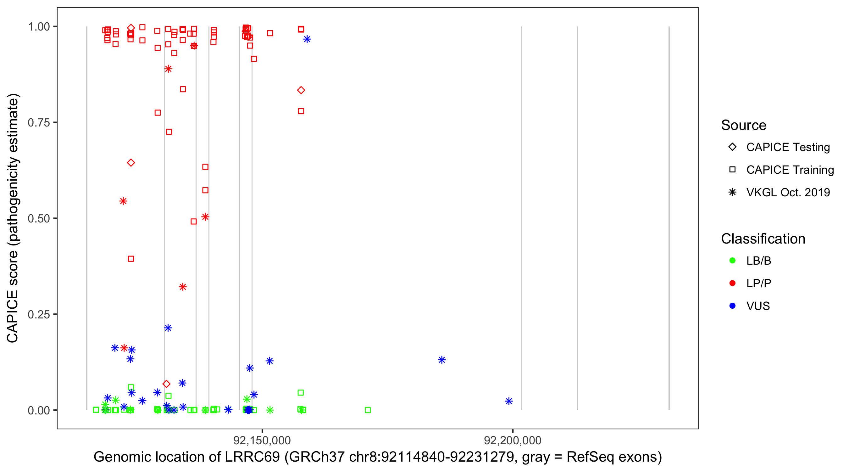 Shown are CAPICE train/test variants plus VKGL Oct 2019.