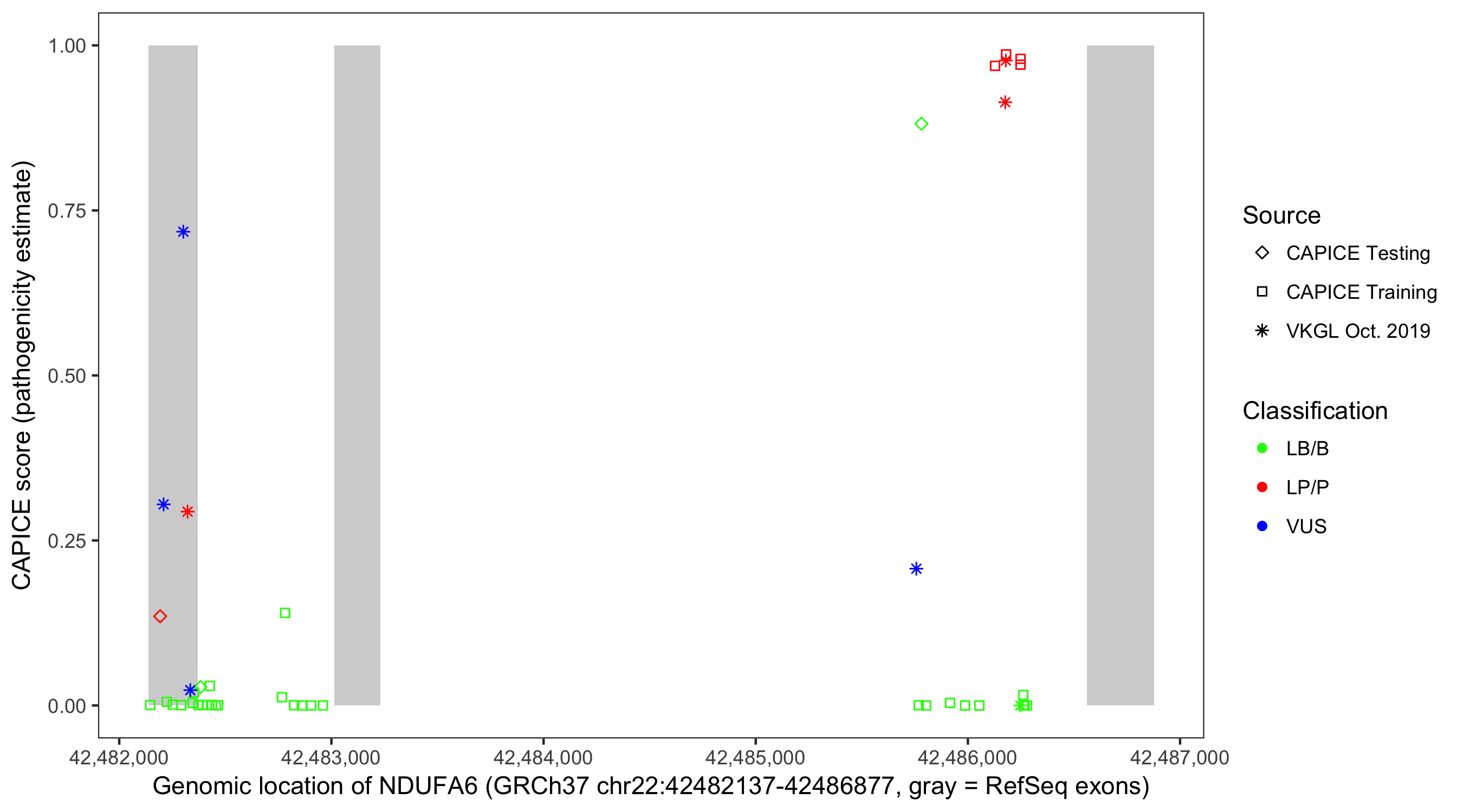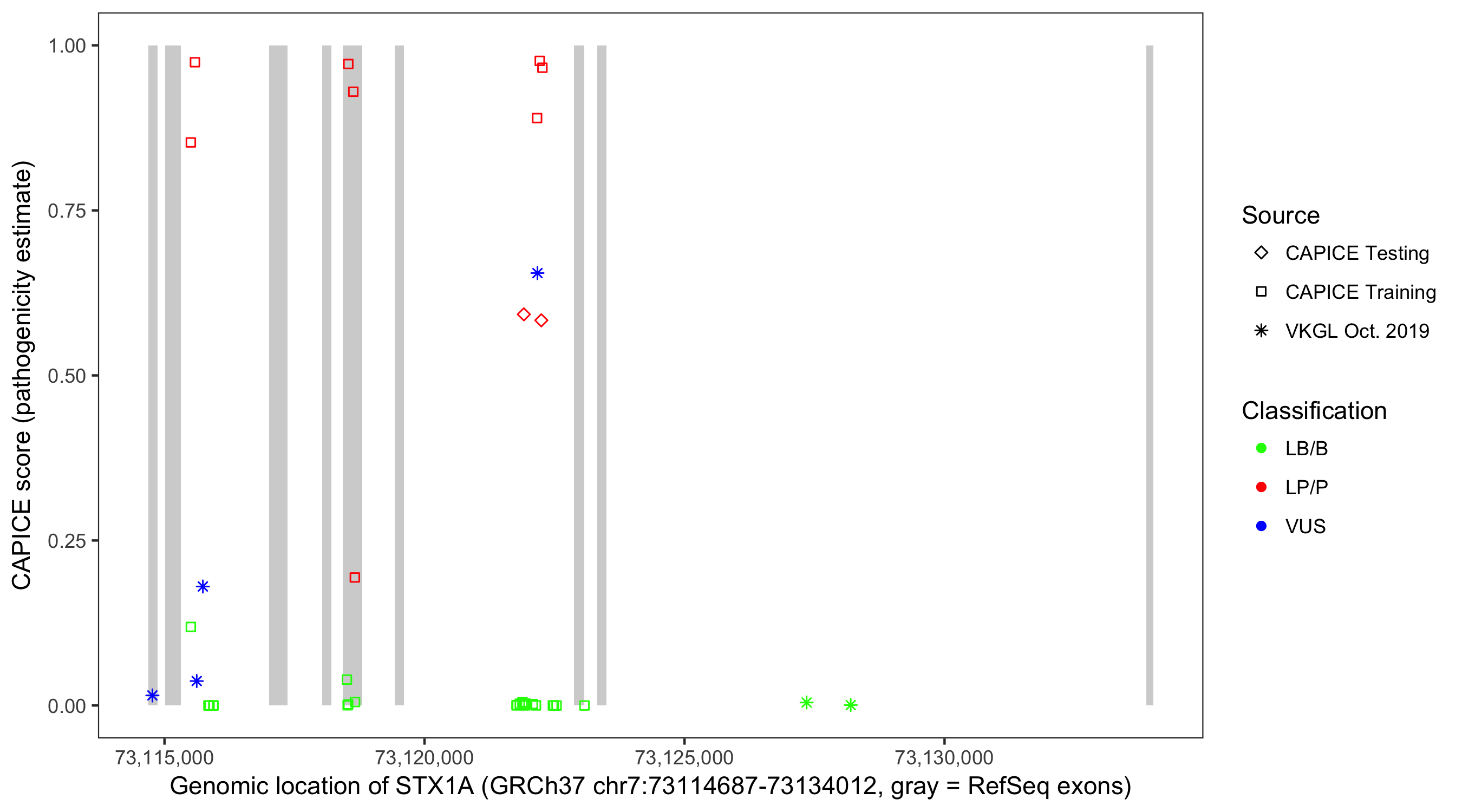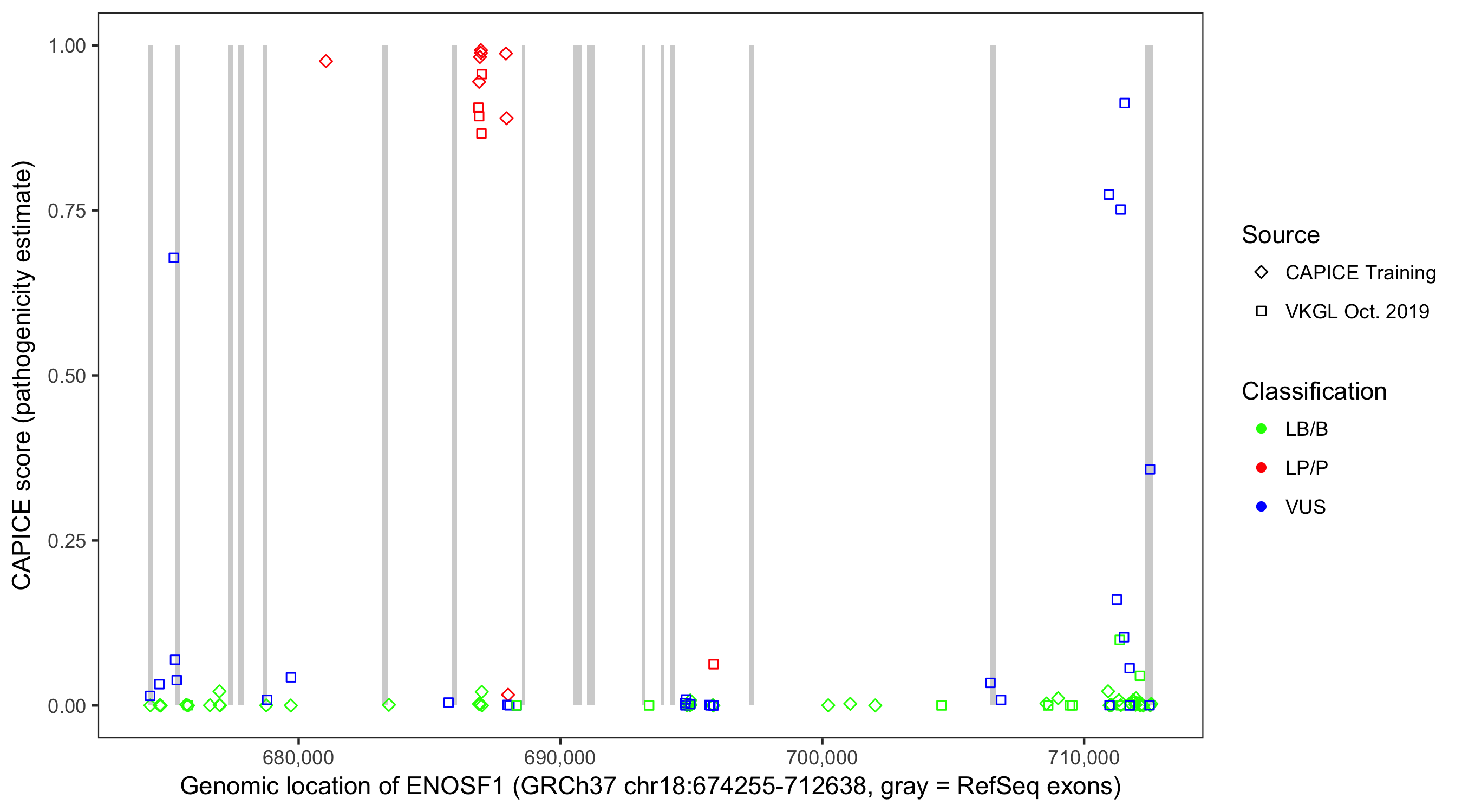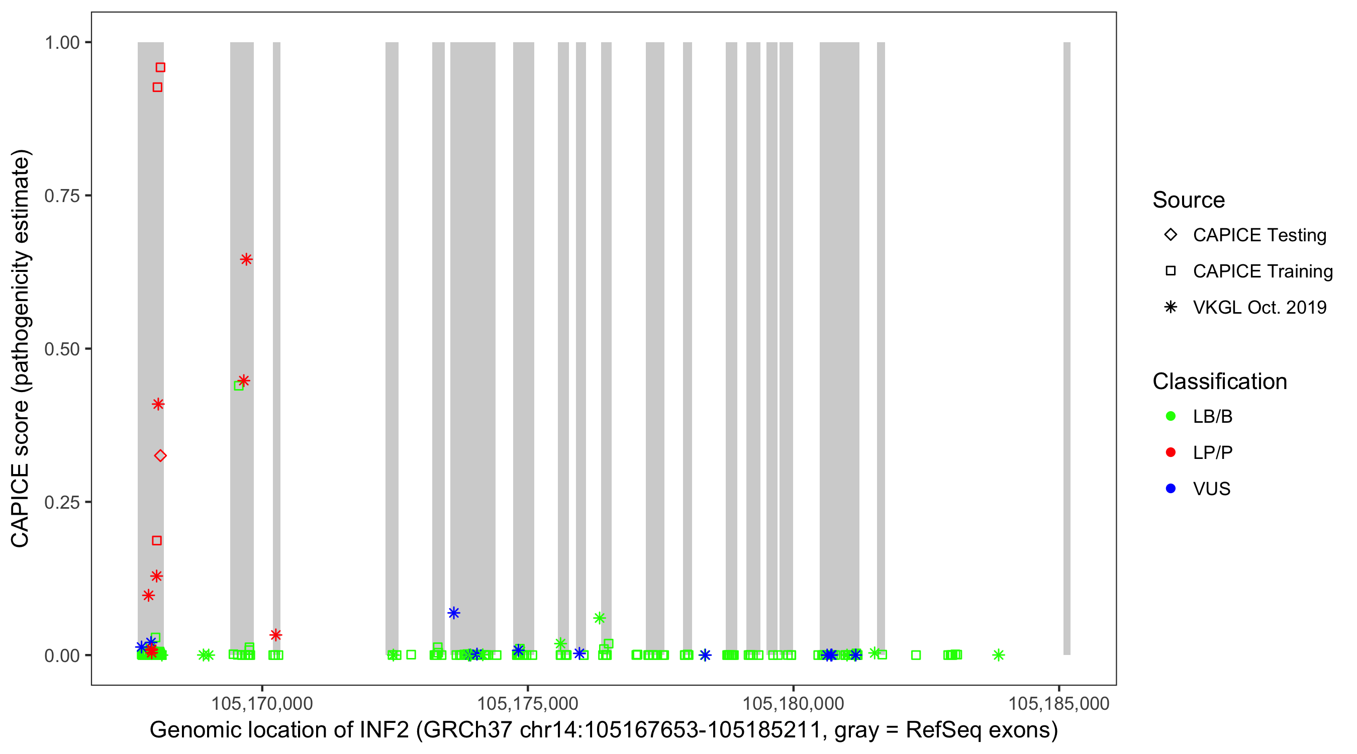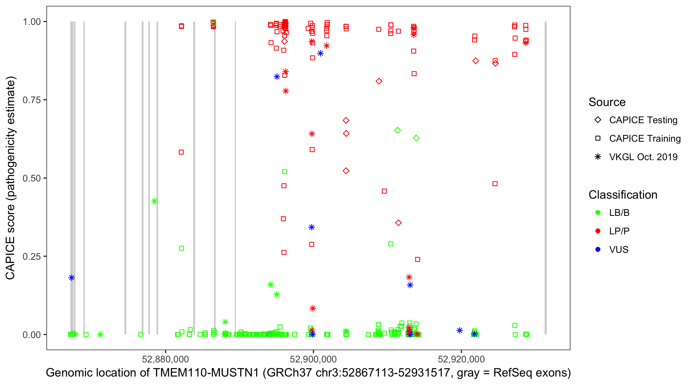 Shown are CAPICE train/test variants plus VKGL Oct 2019.