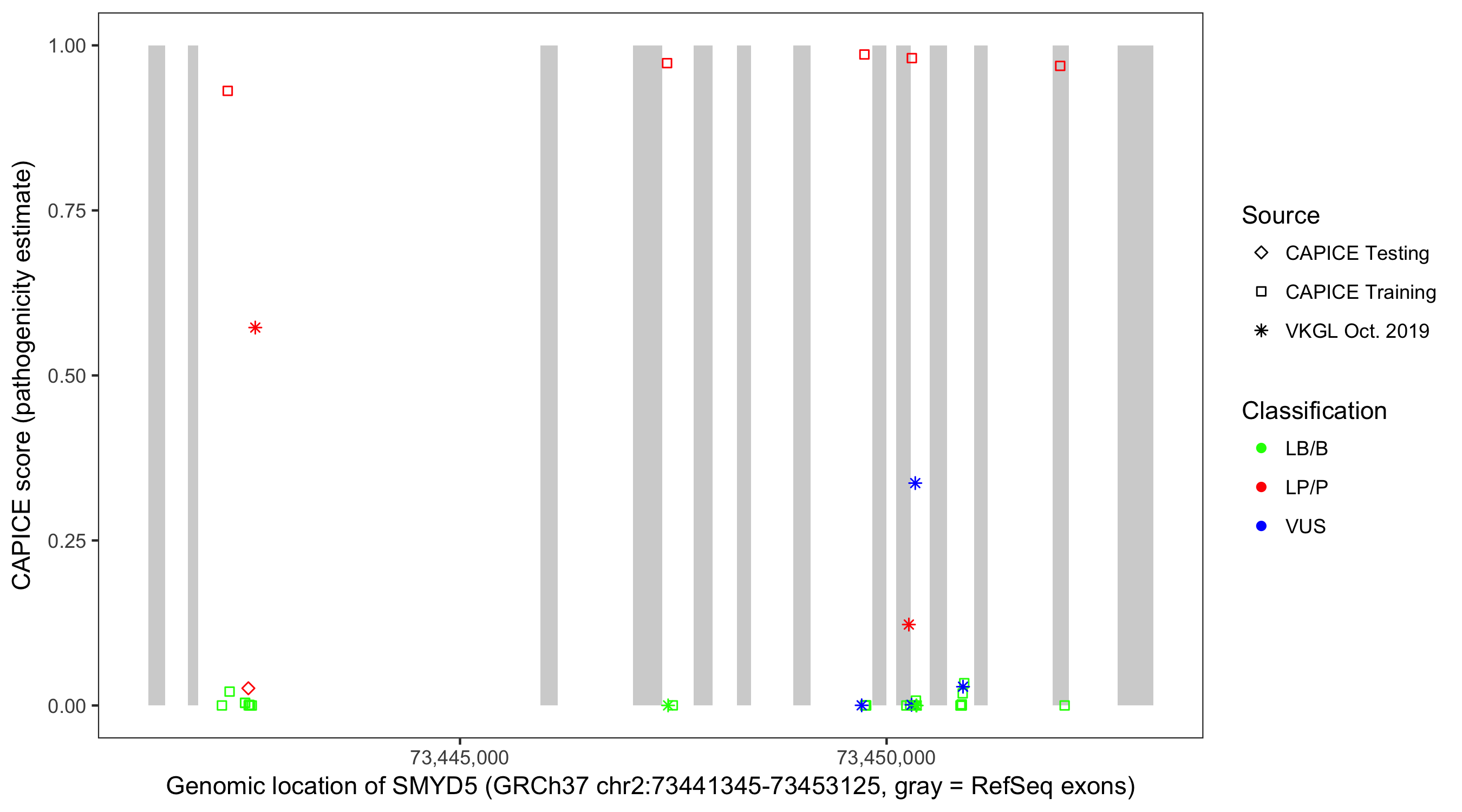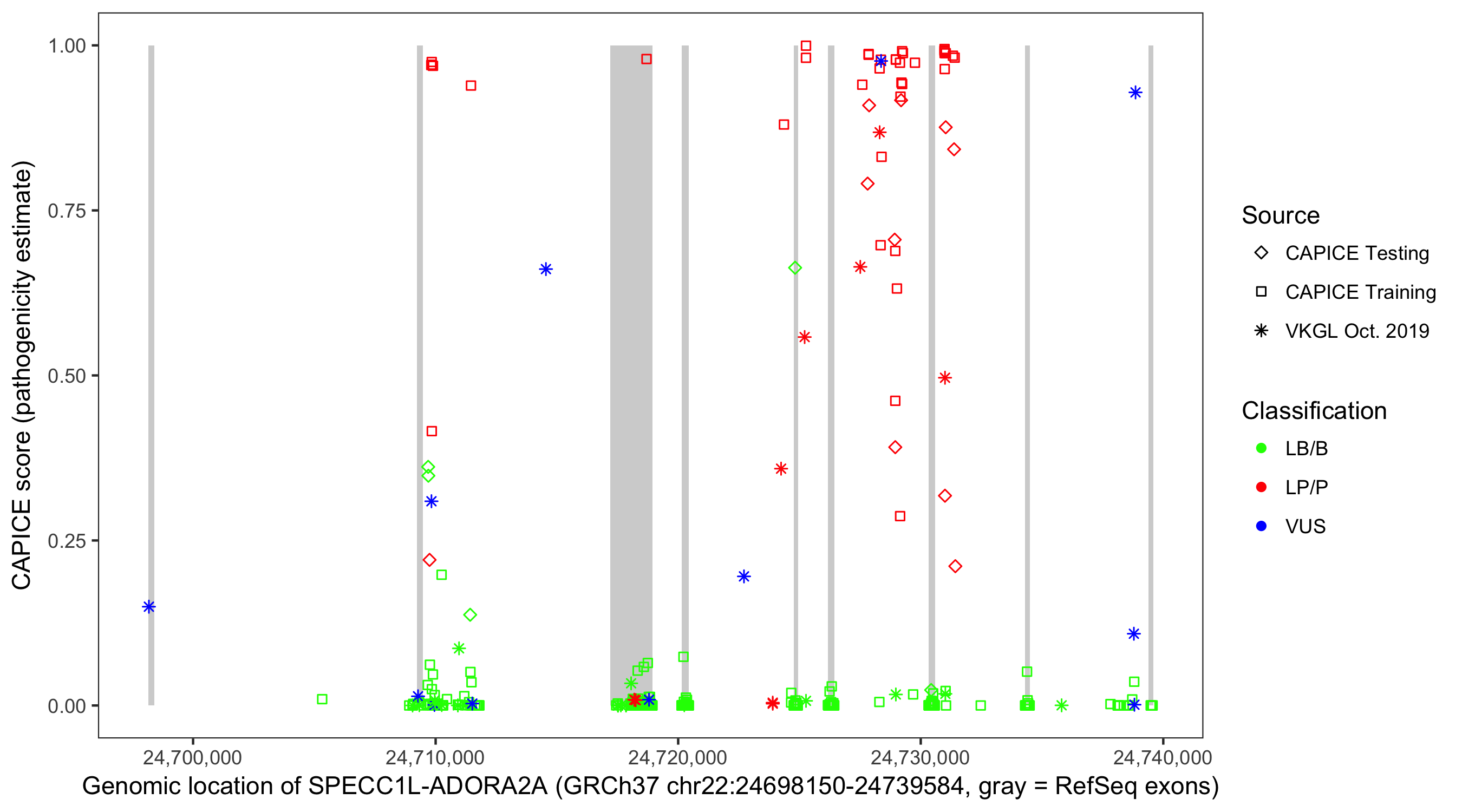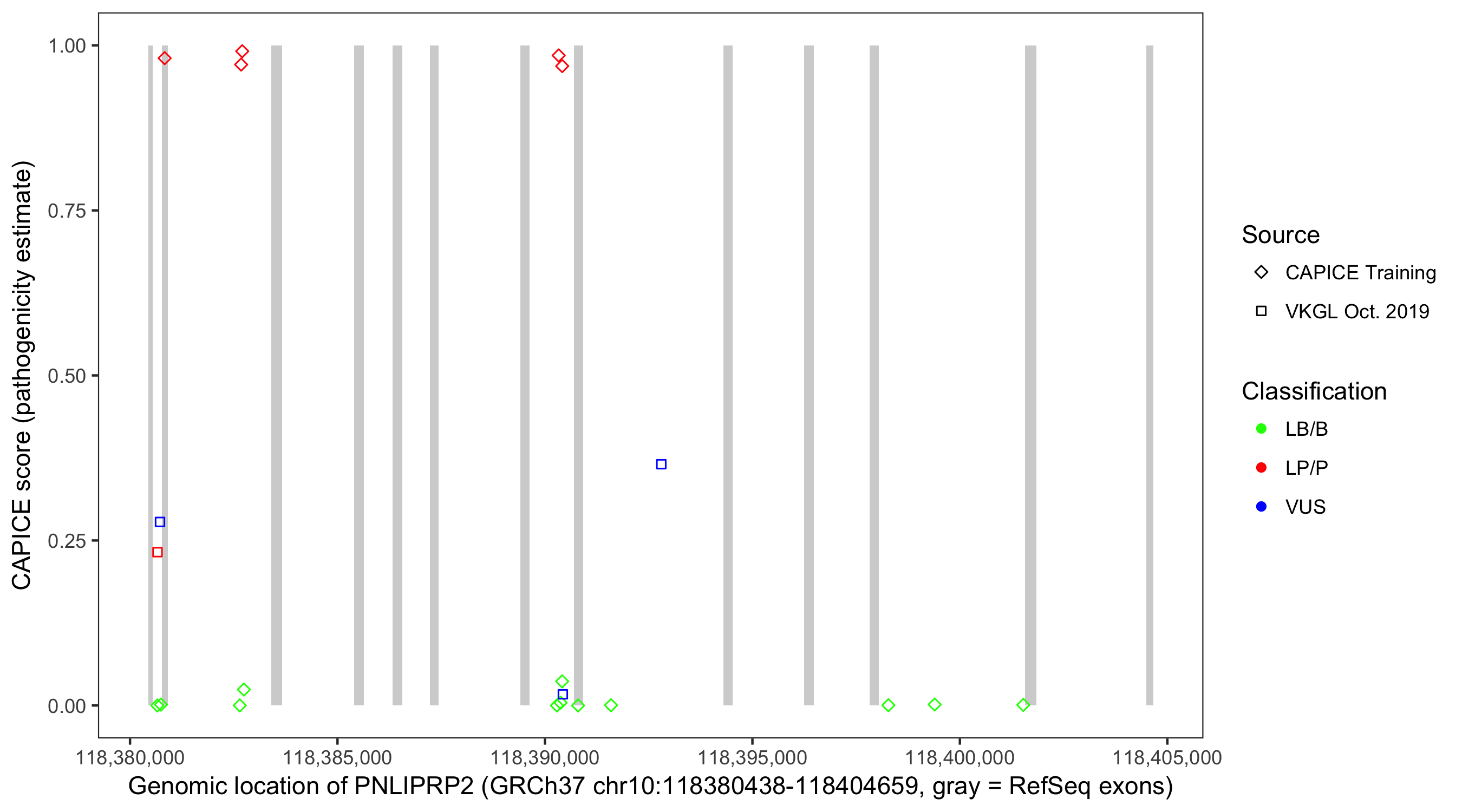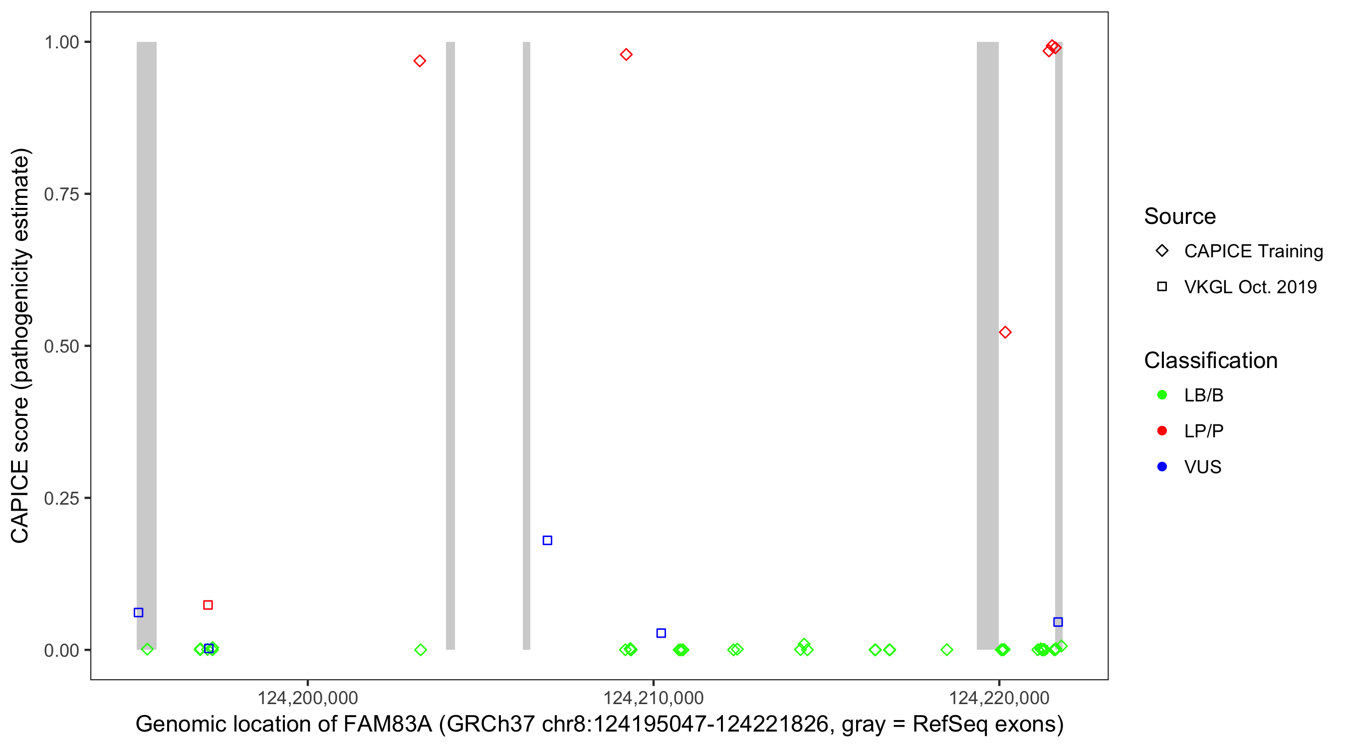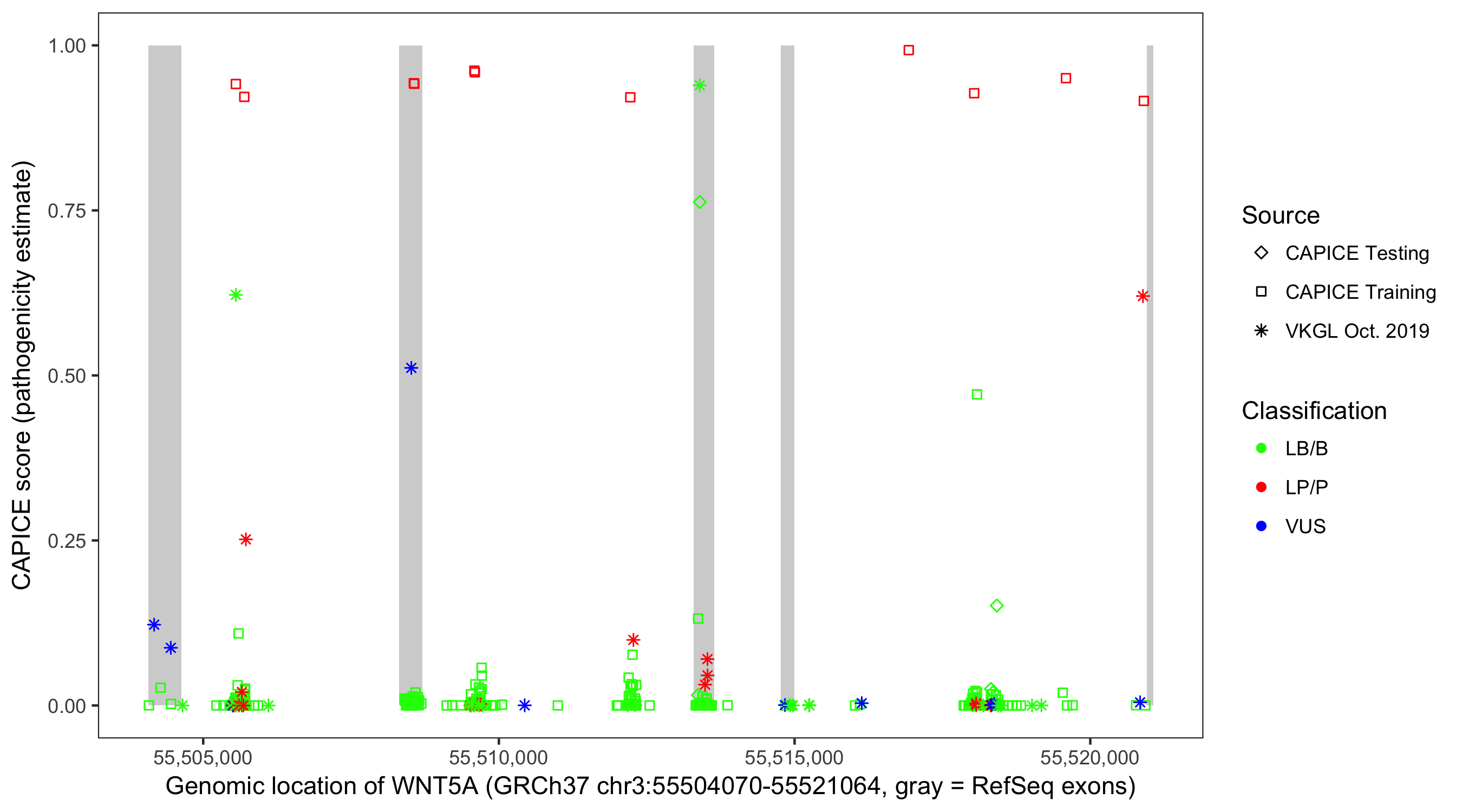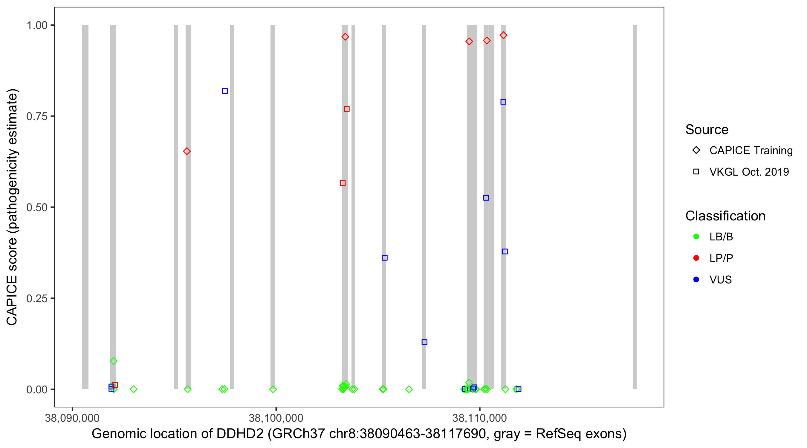 Shown are CAPICE train/test variants plus VKGL Oct 2019.
