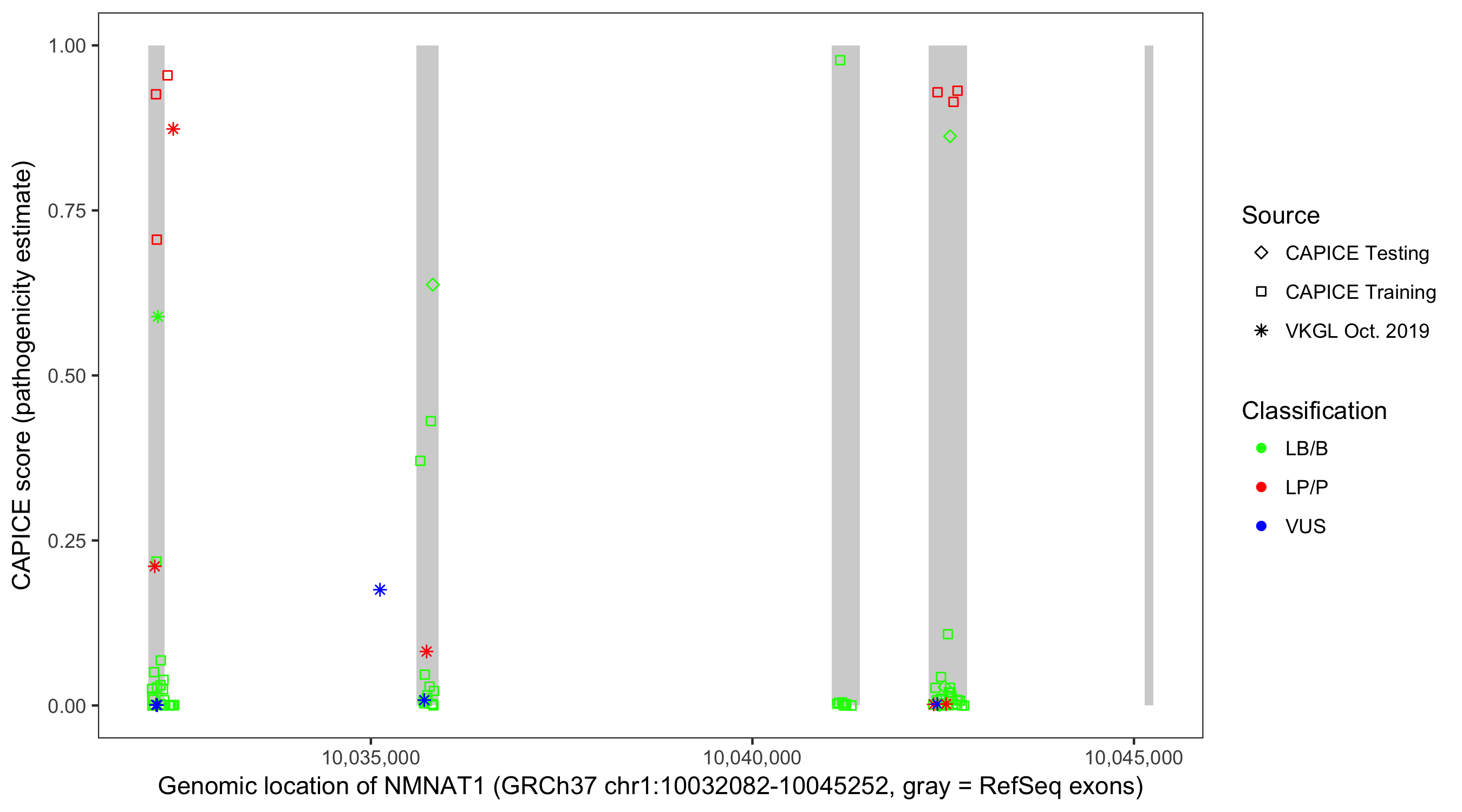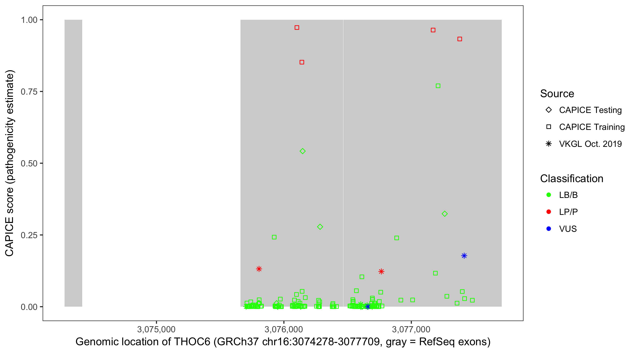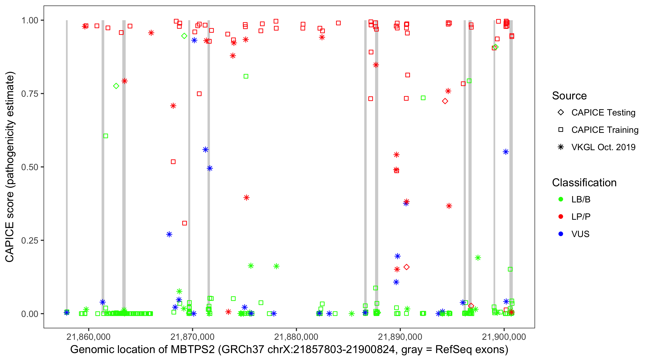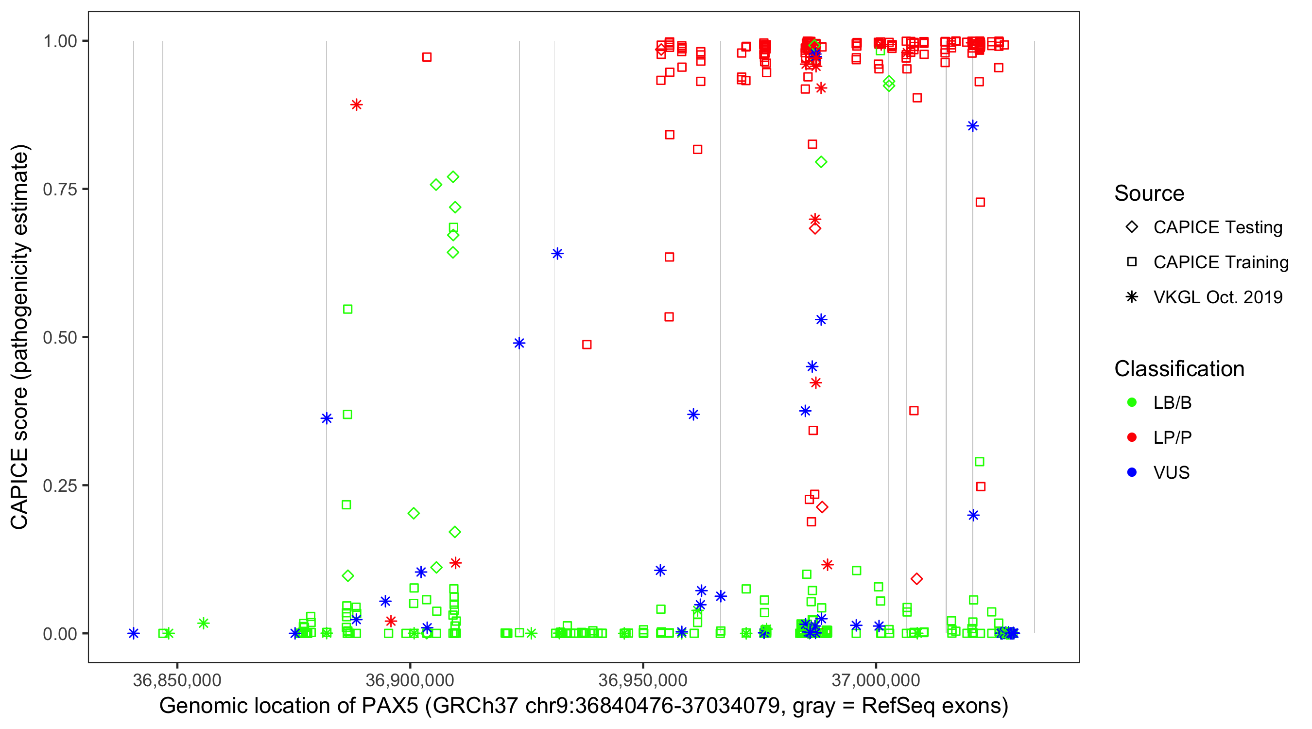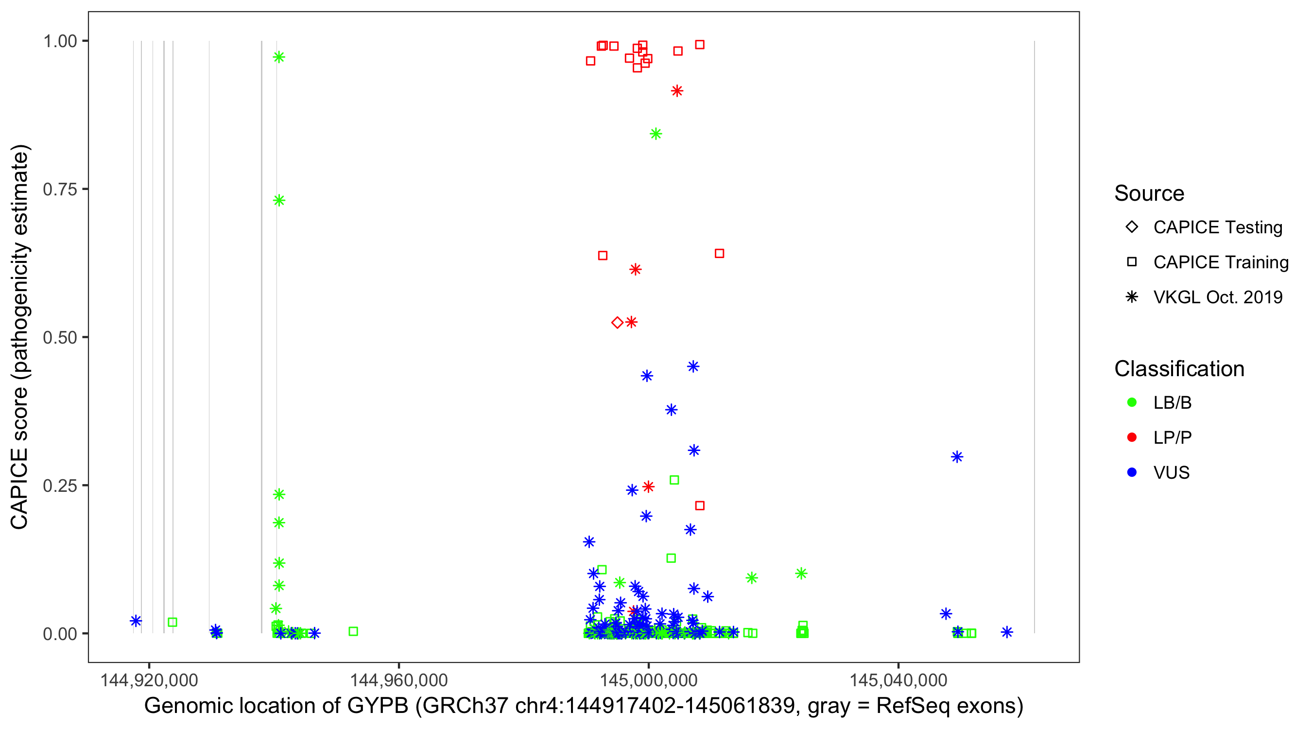 Shown are CAPICE train/test variants plus VKGL Oct 2019.