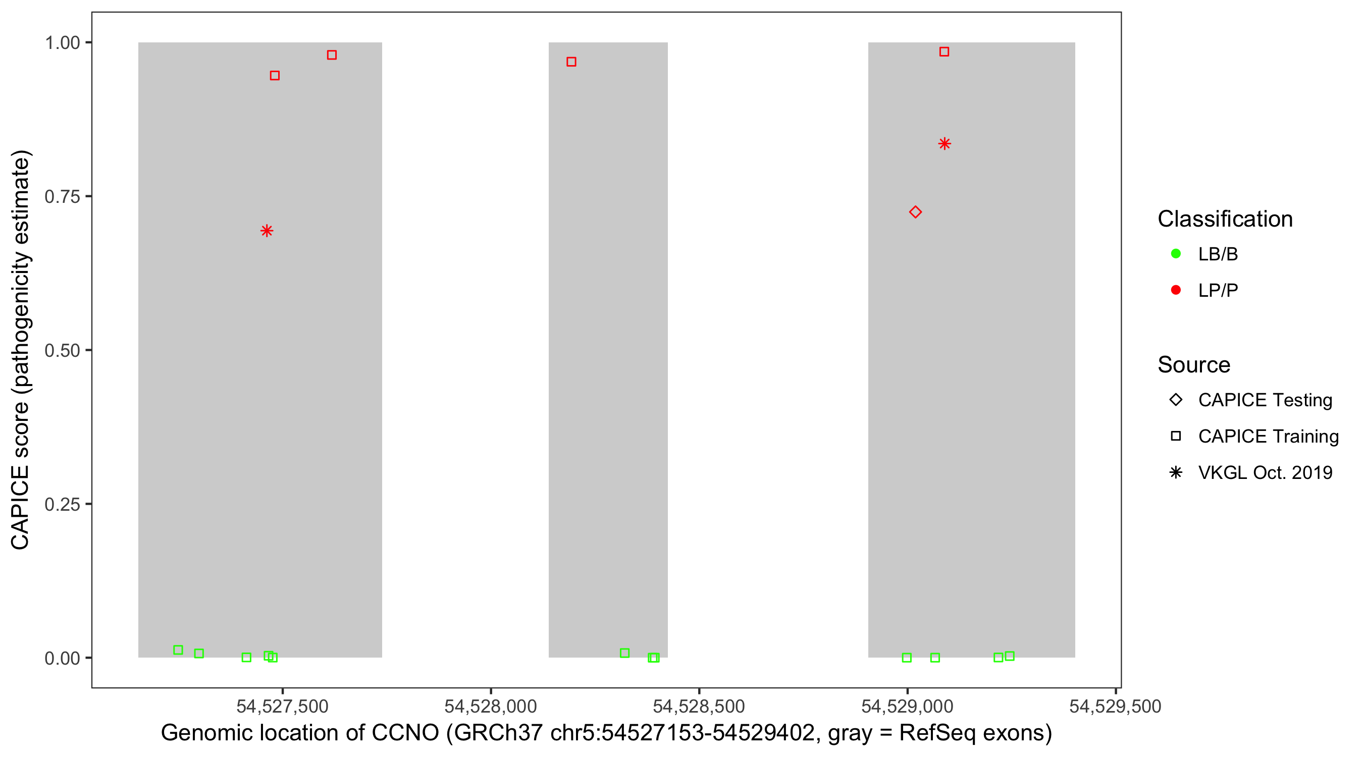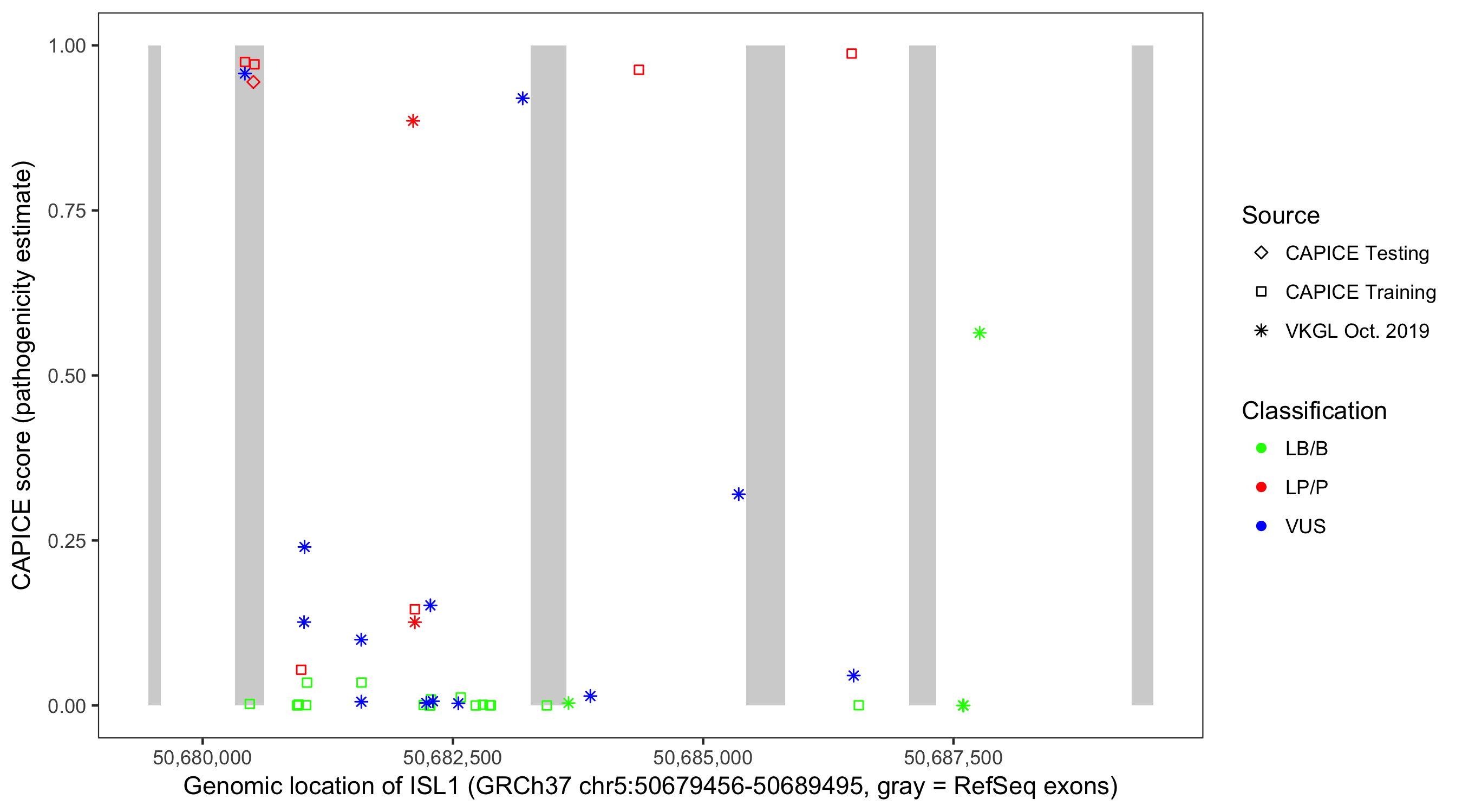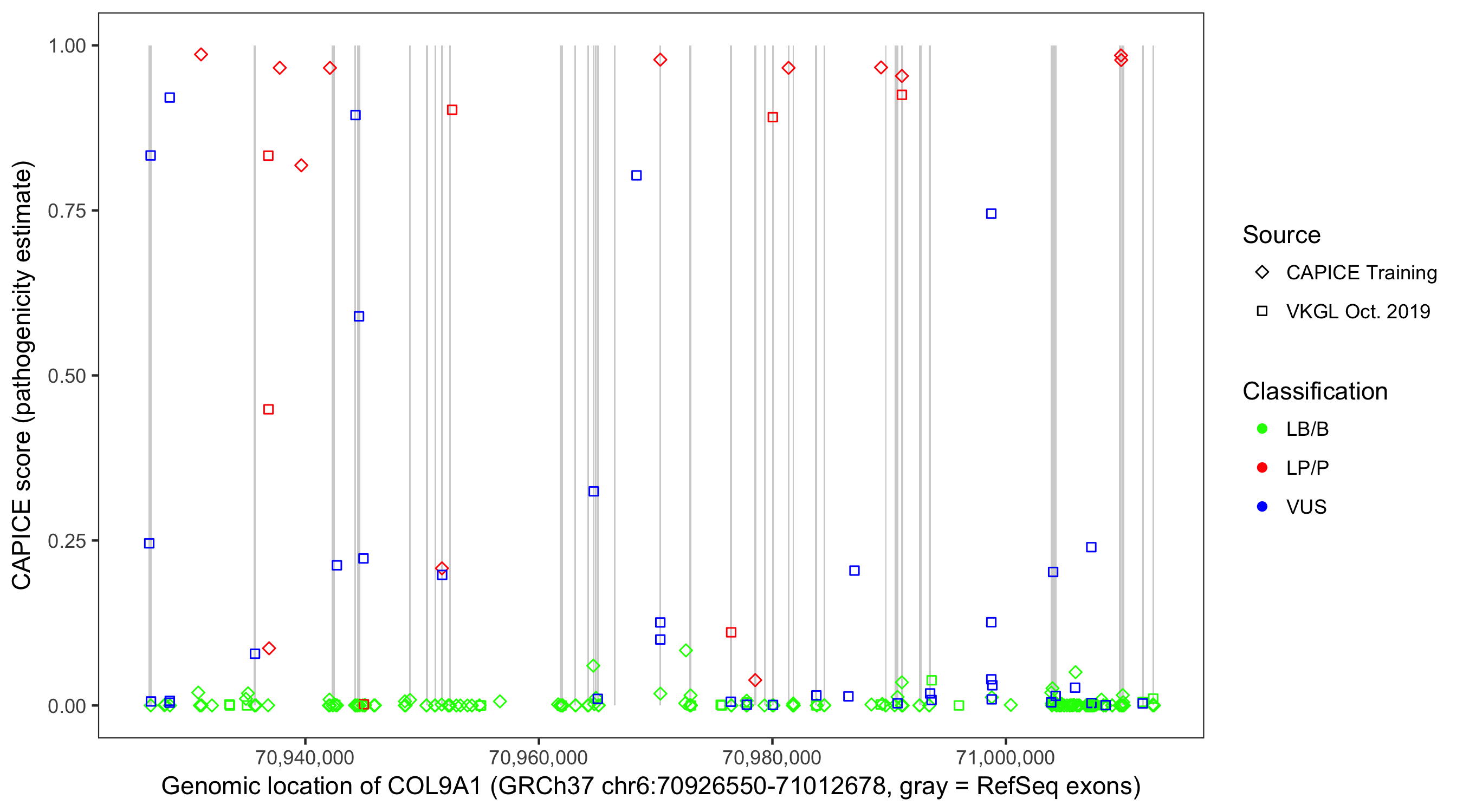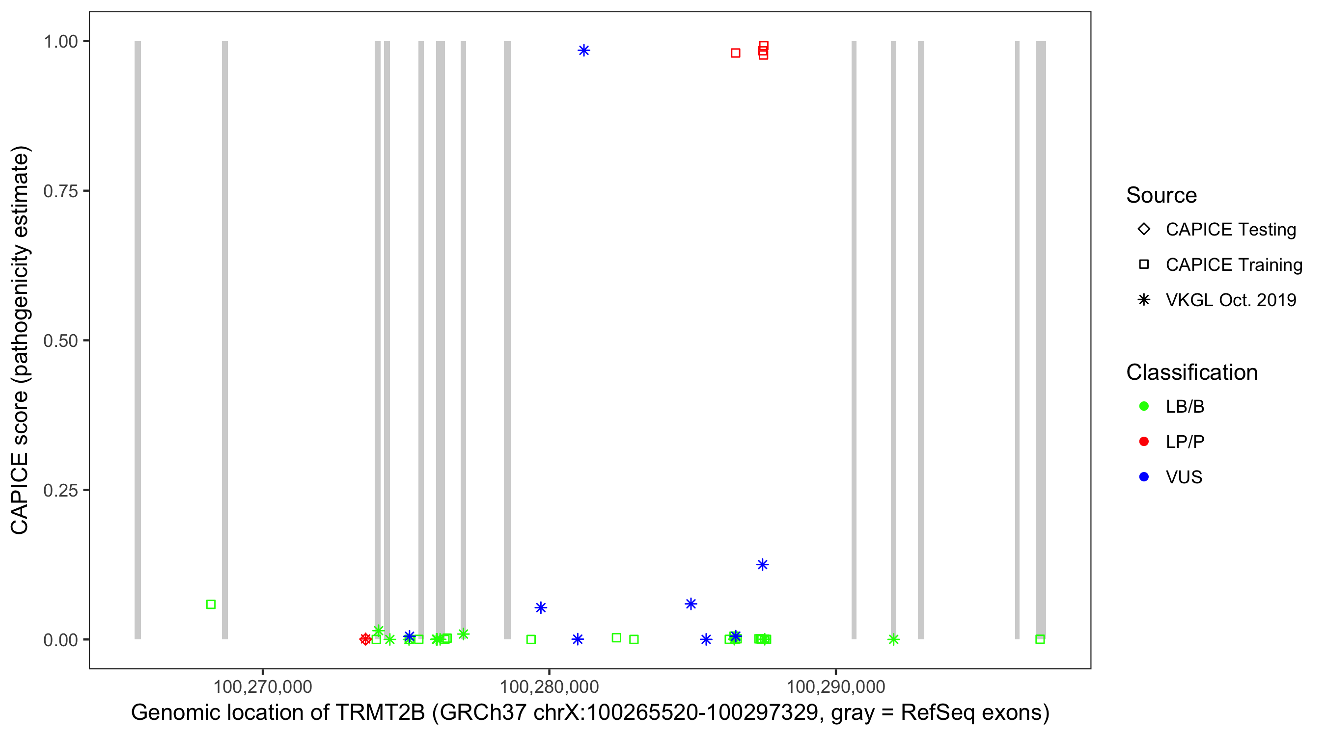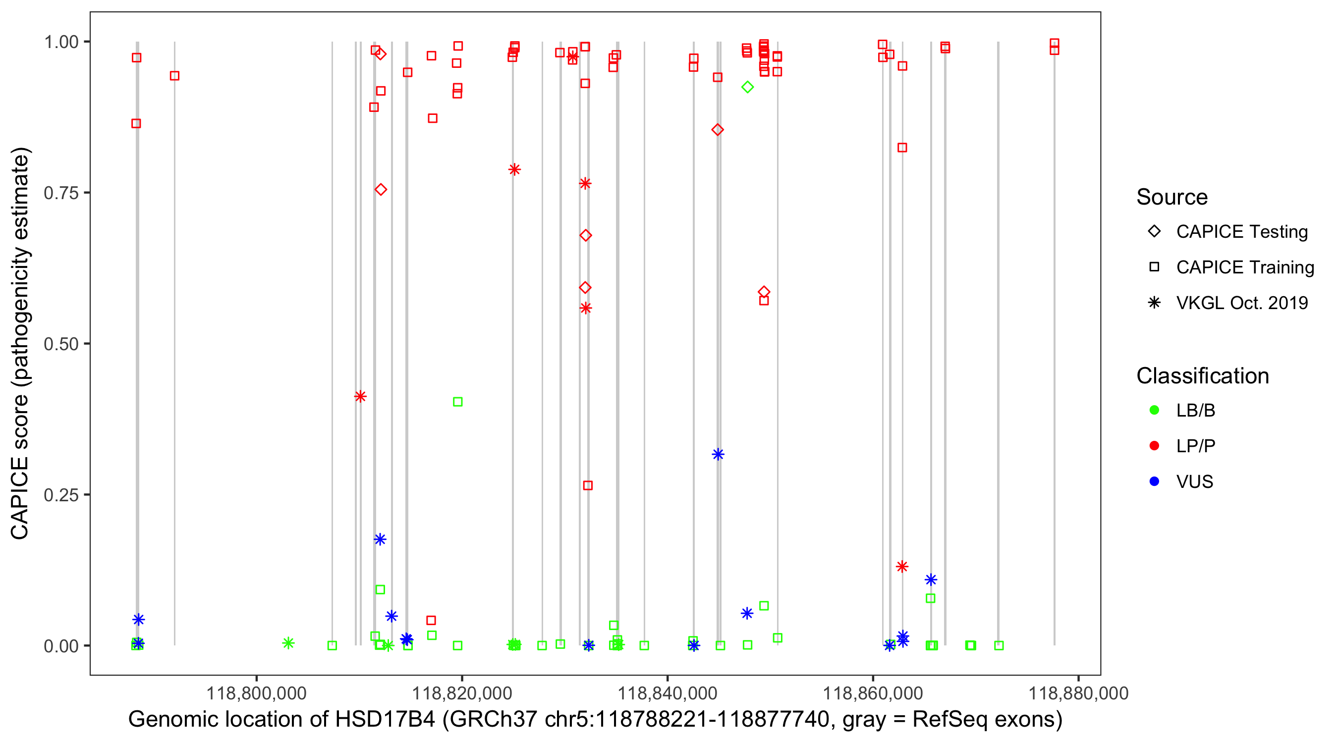 Shown are CAPICE train/test variants plus VKGL Oct 2019.