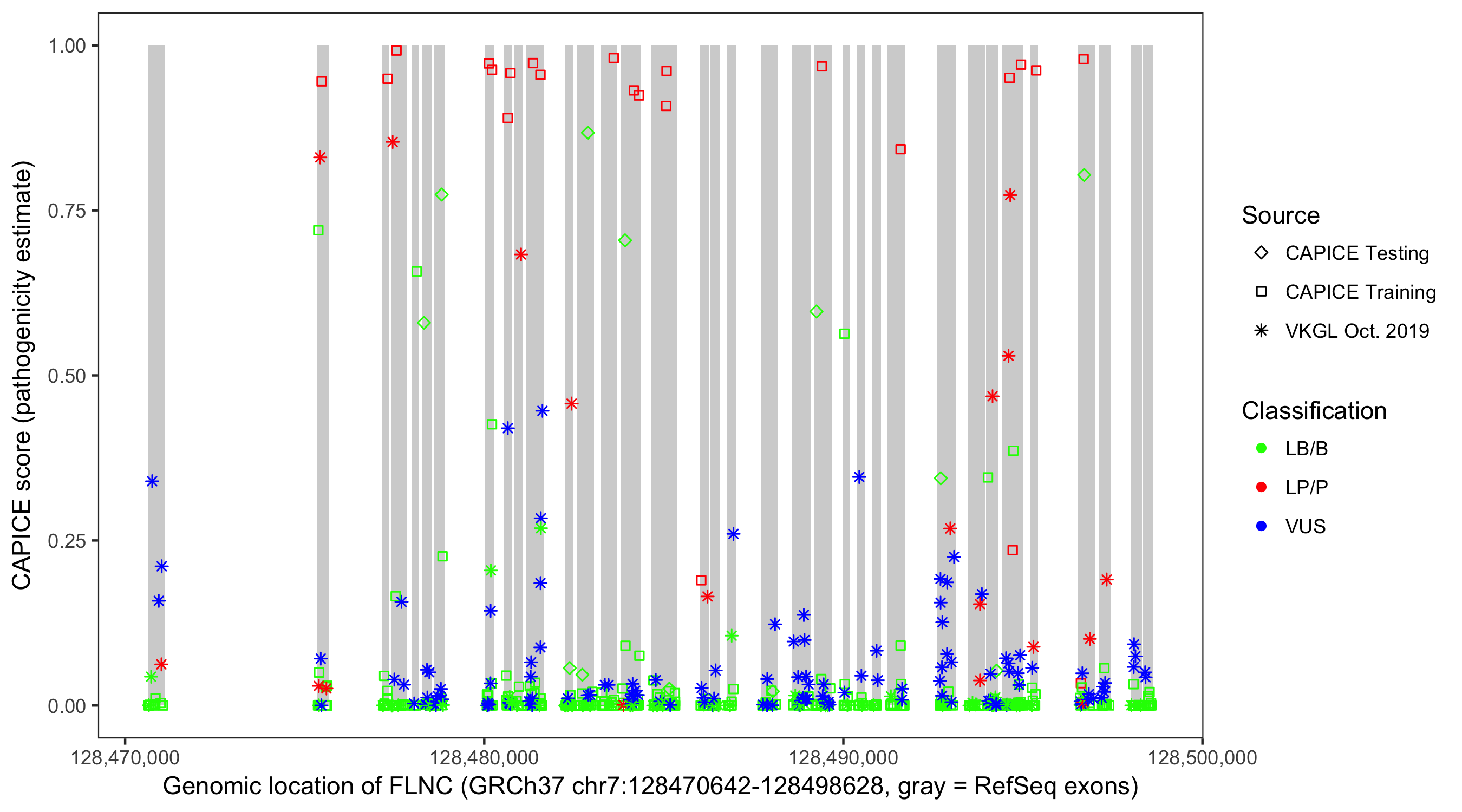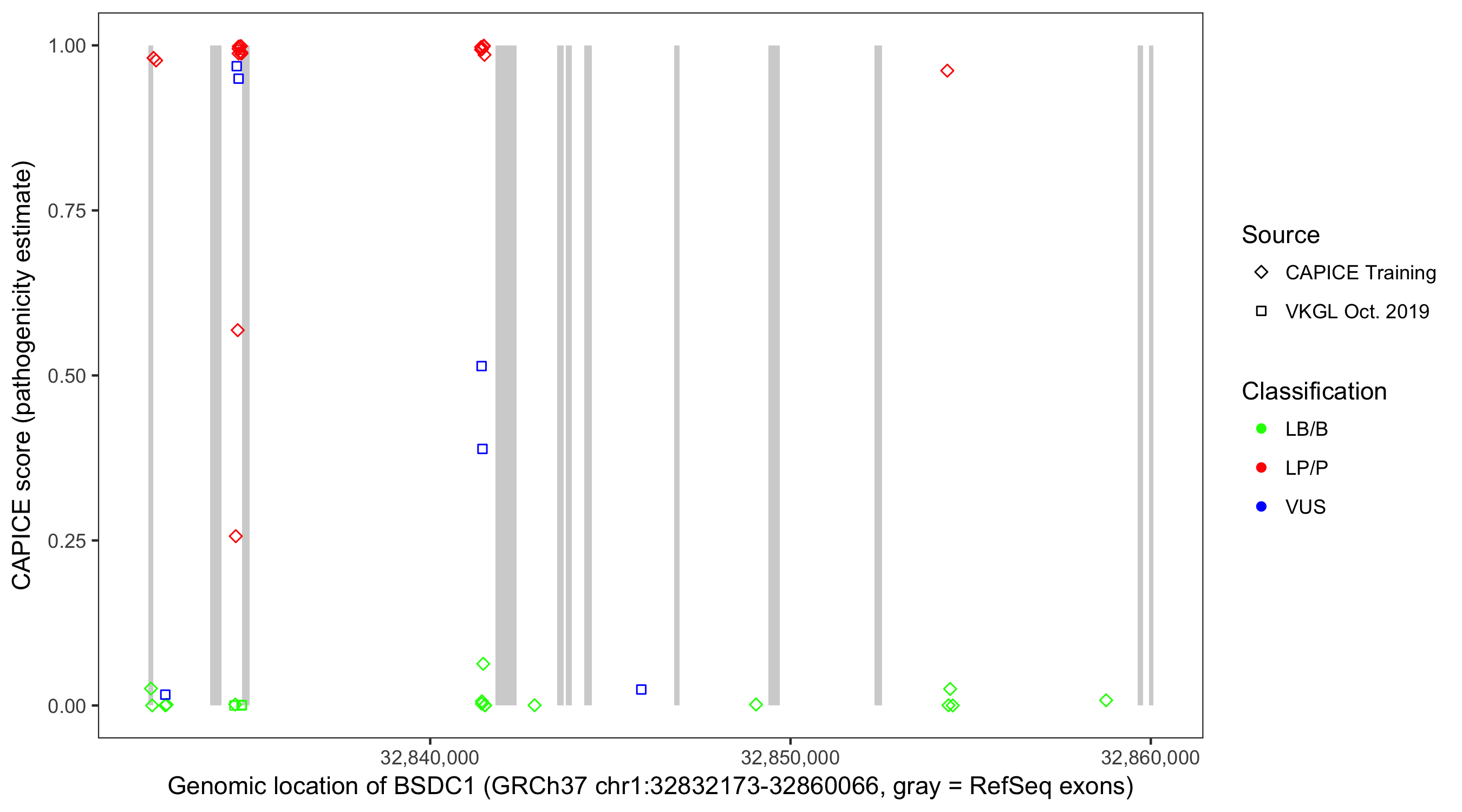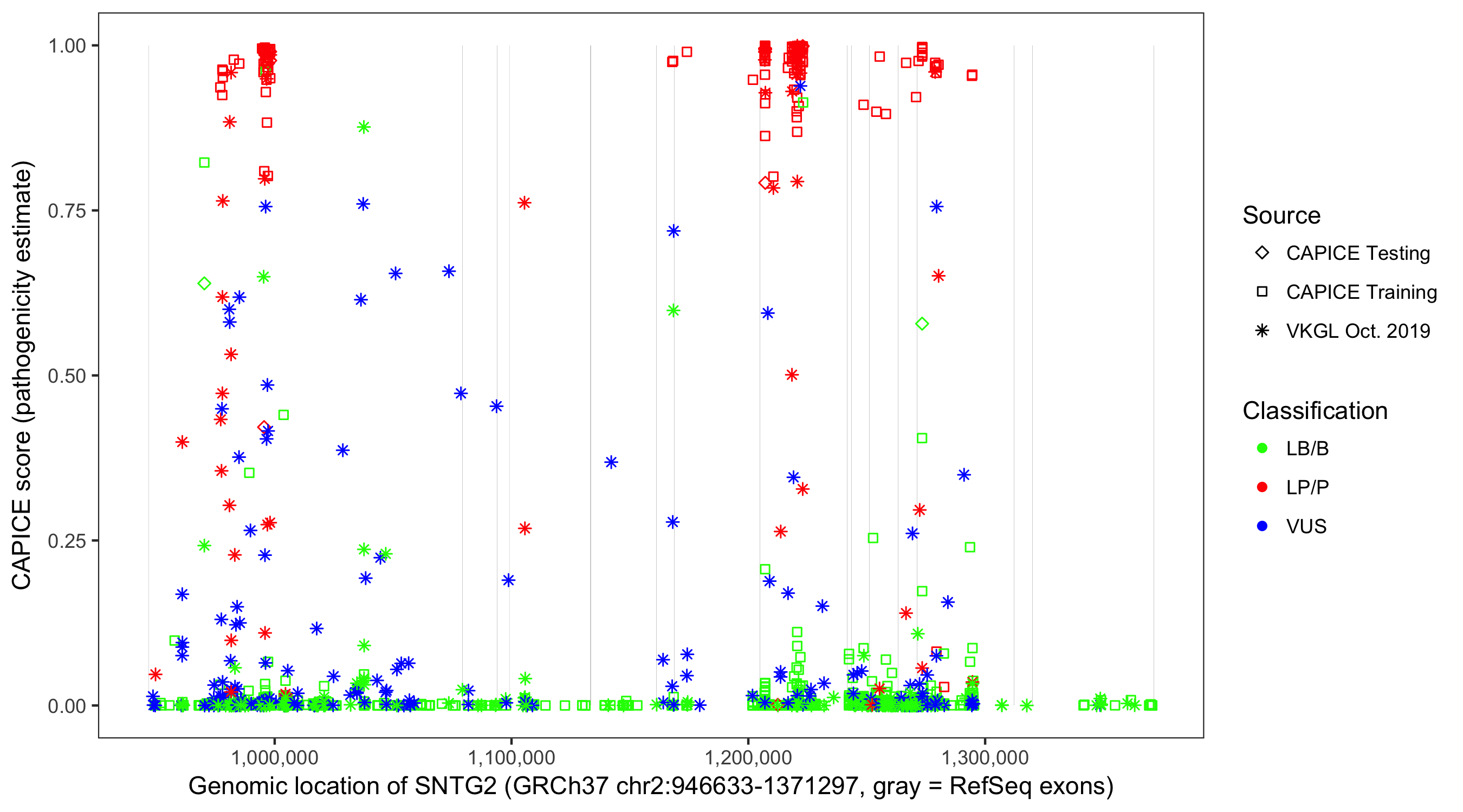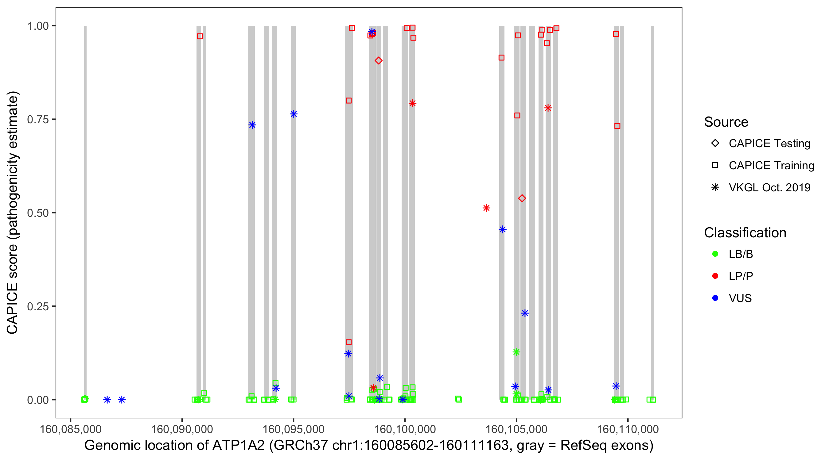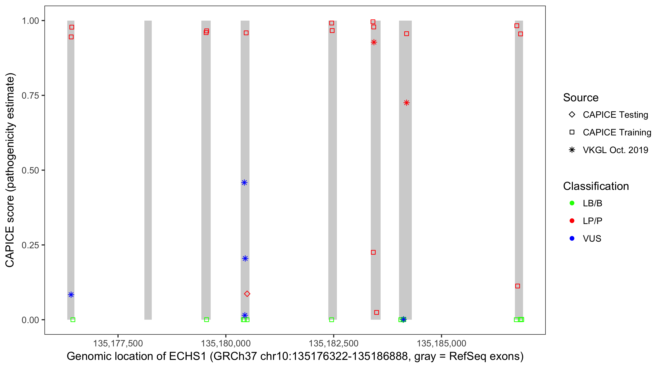 Shown are CAPICE train/test variants plus VKGL Oct 2019.