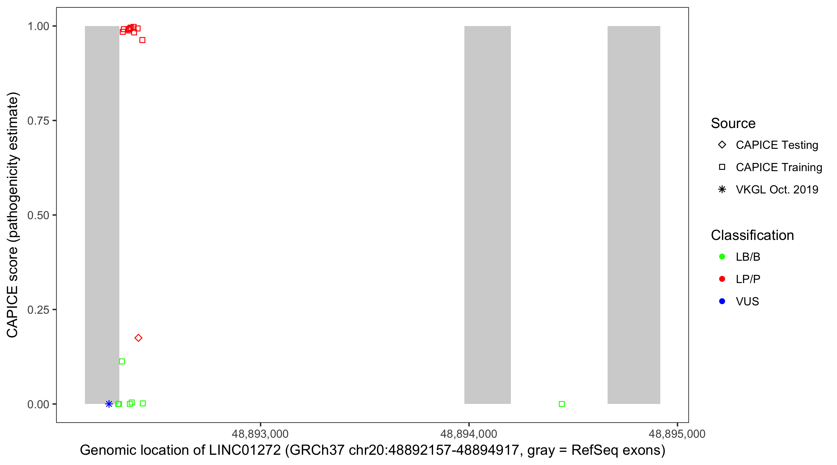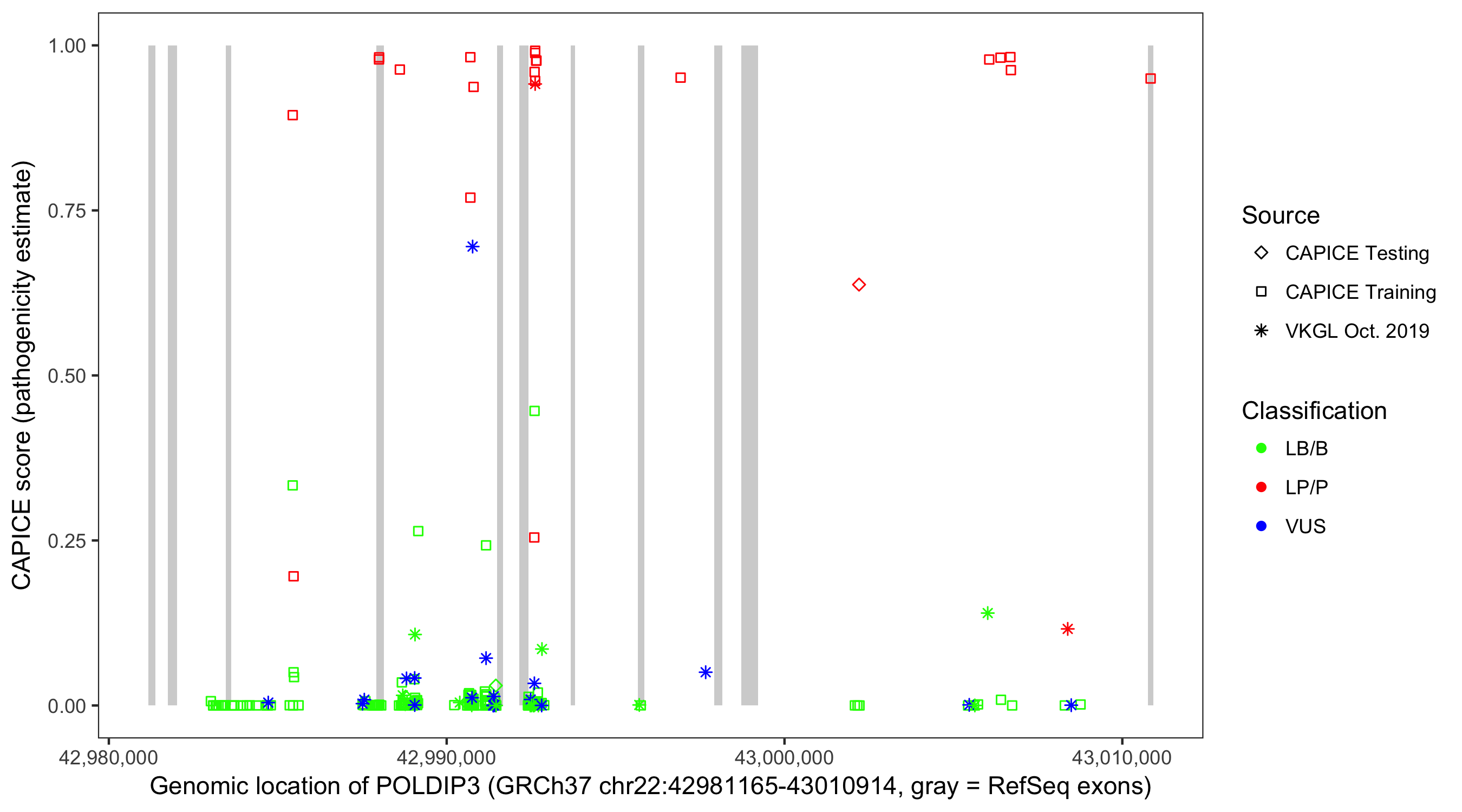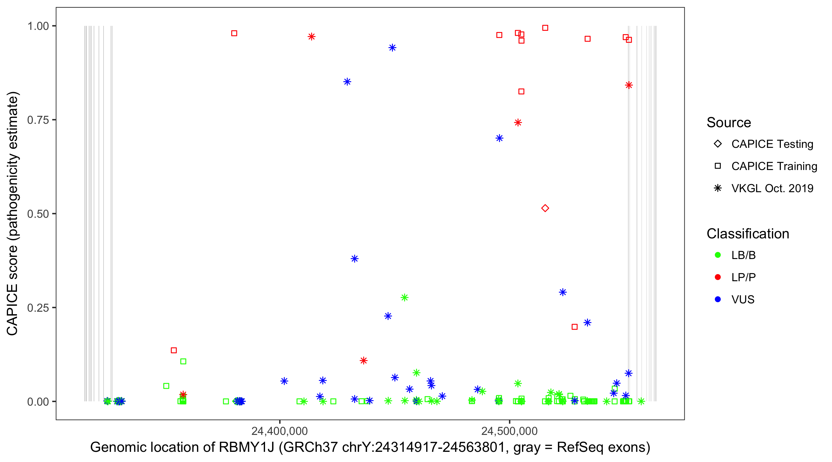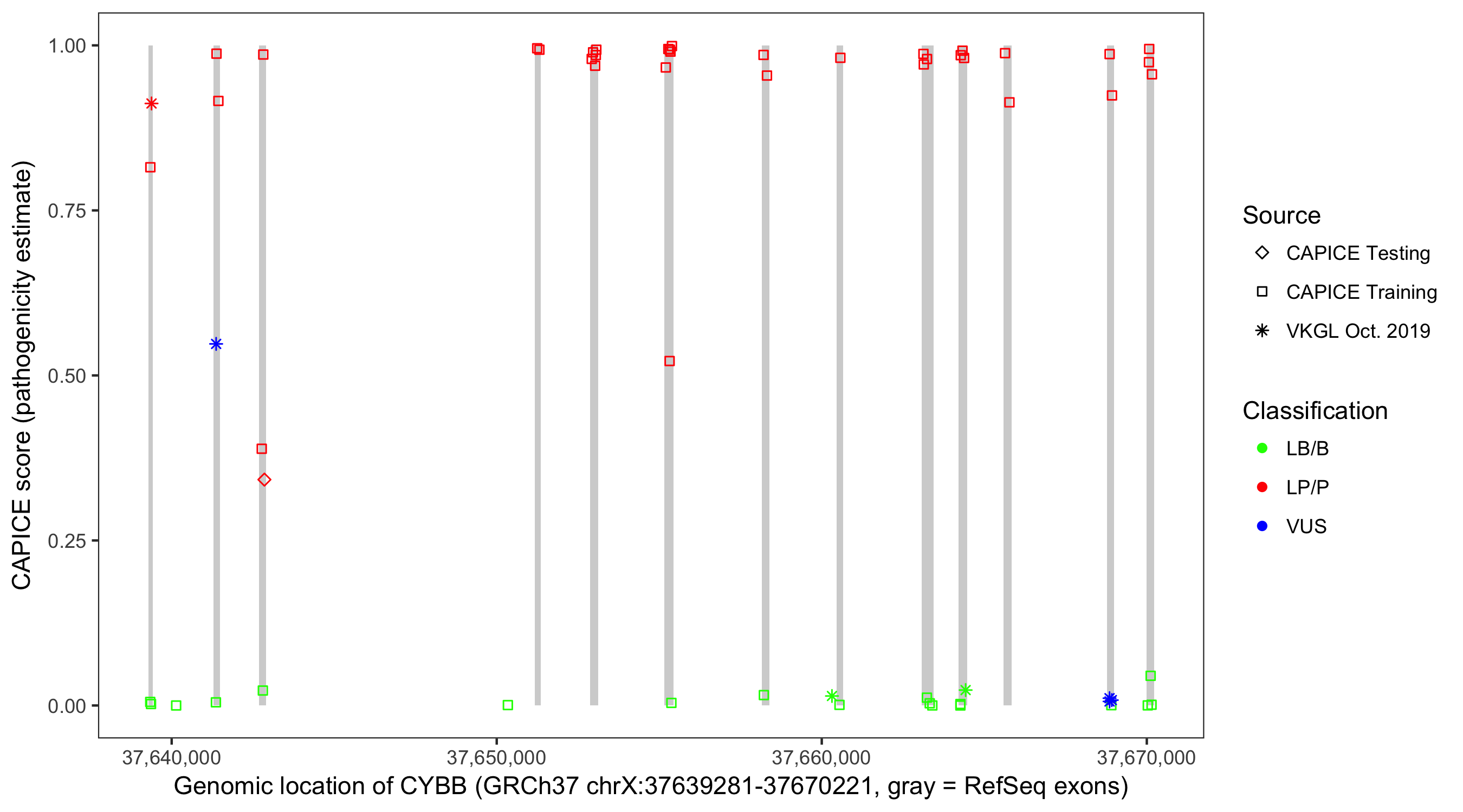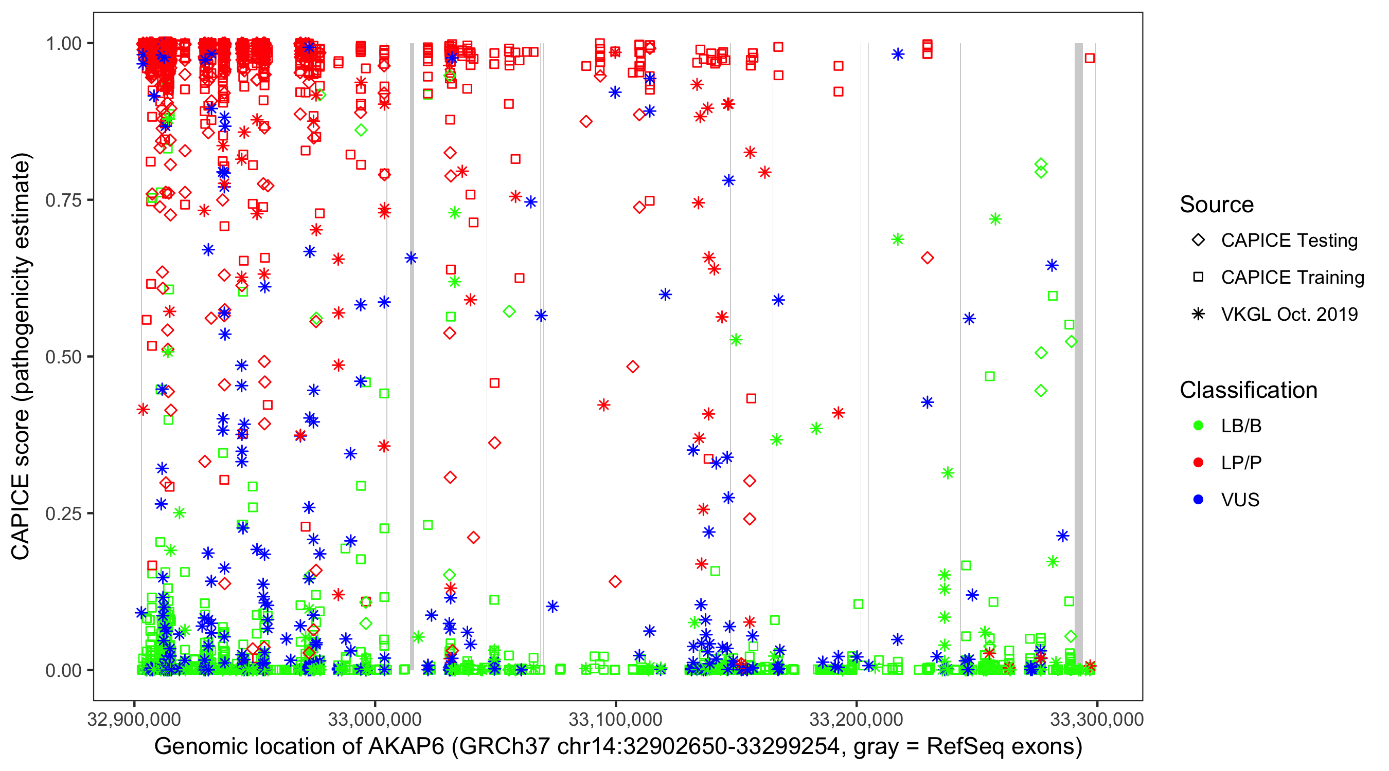 Shown are CAPICE train/test variants plus VKGL Oct 2019.