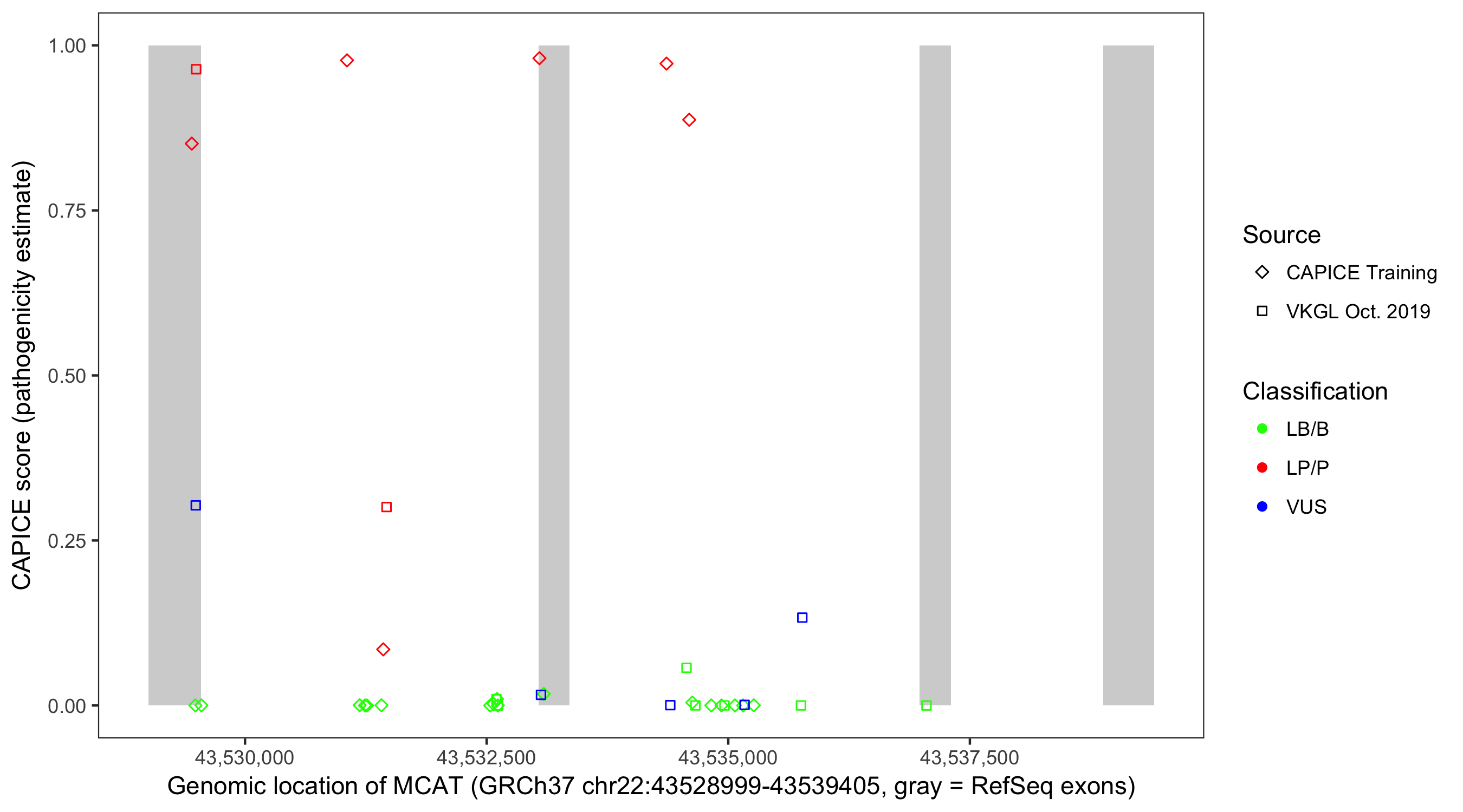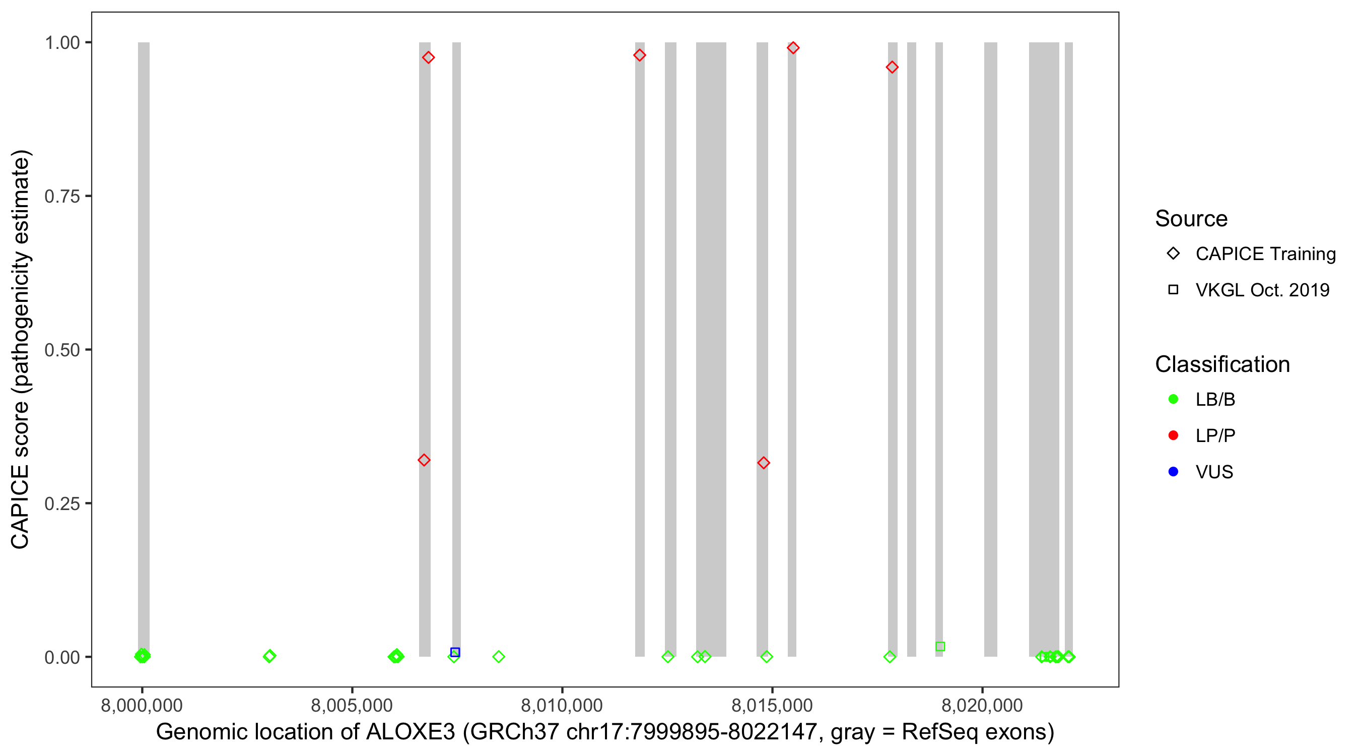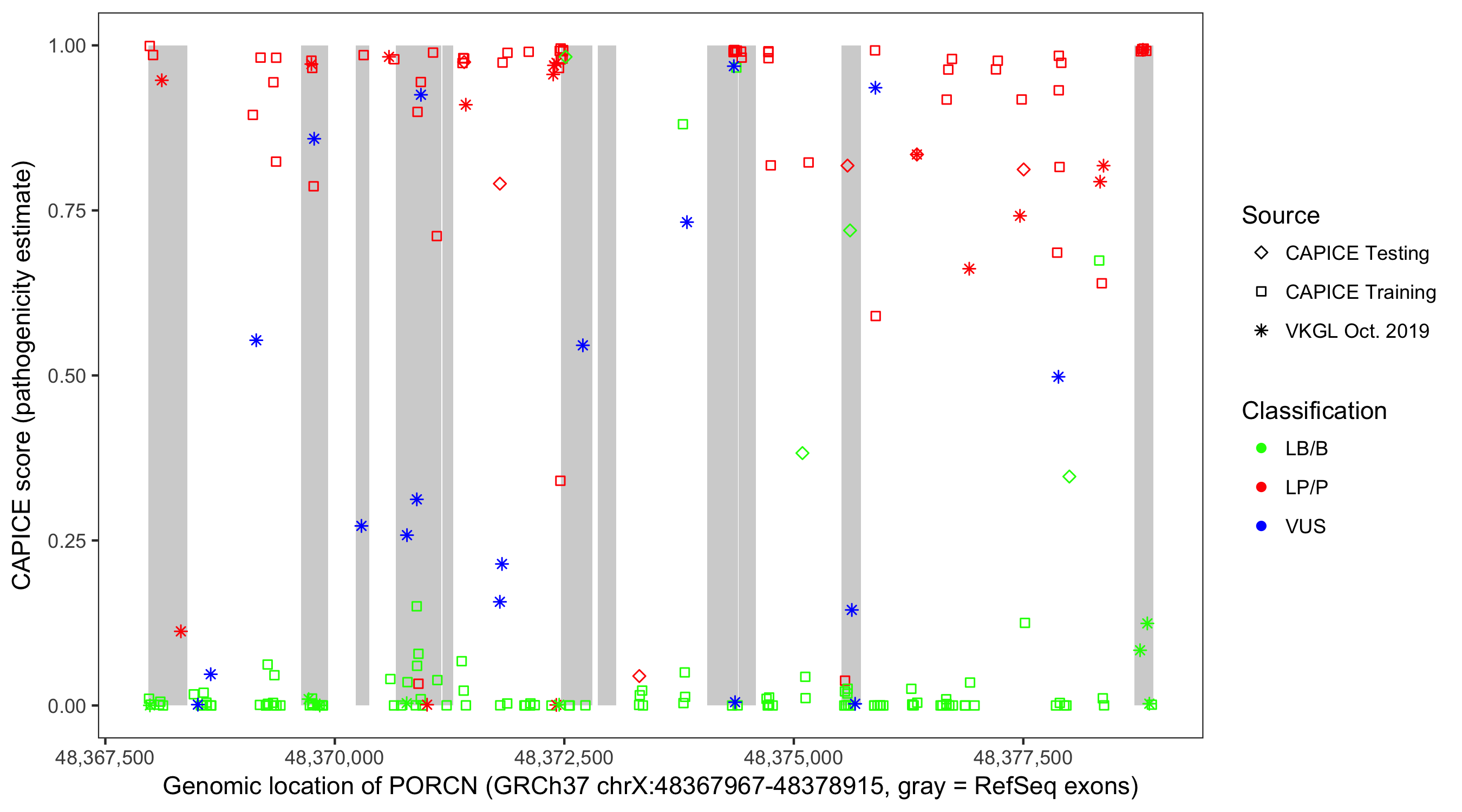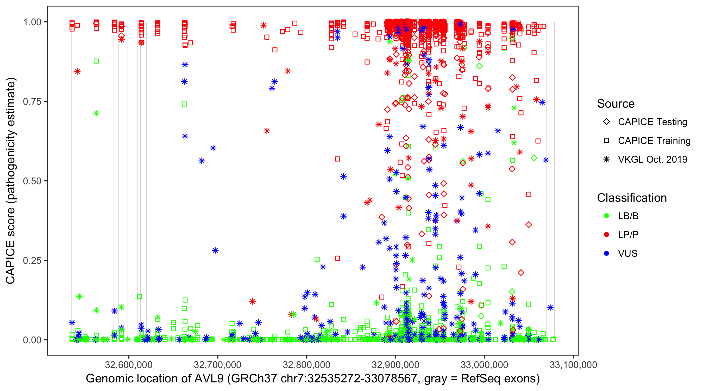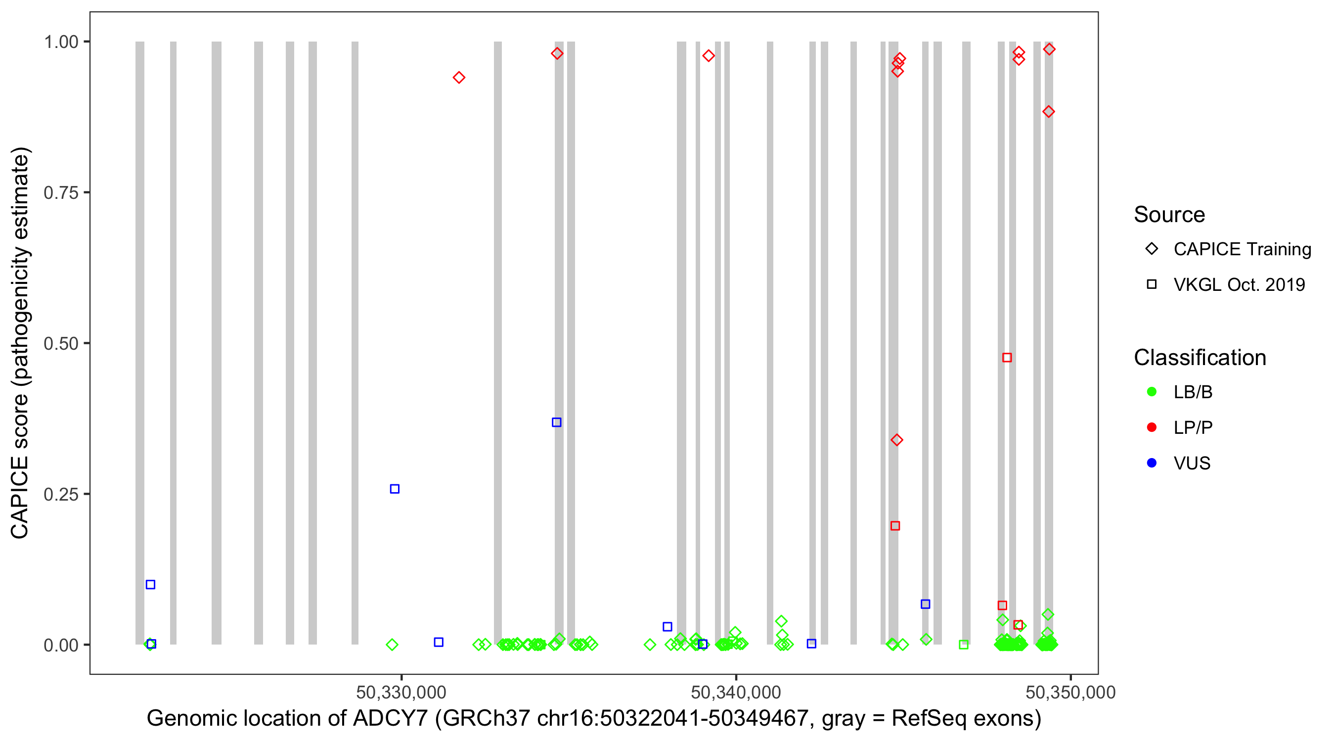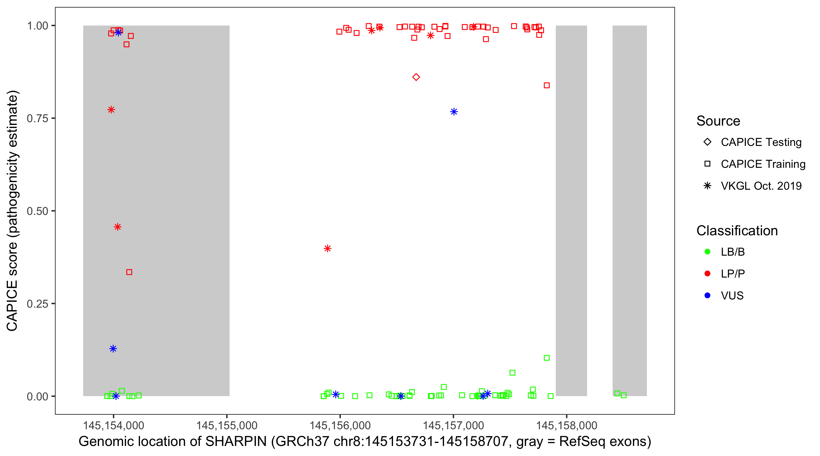 Shown are CAPICE train/test variants plus VKGL Oct 2019.