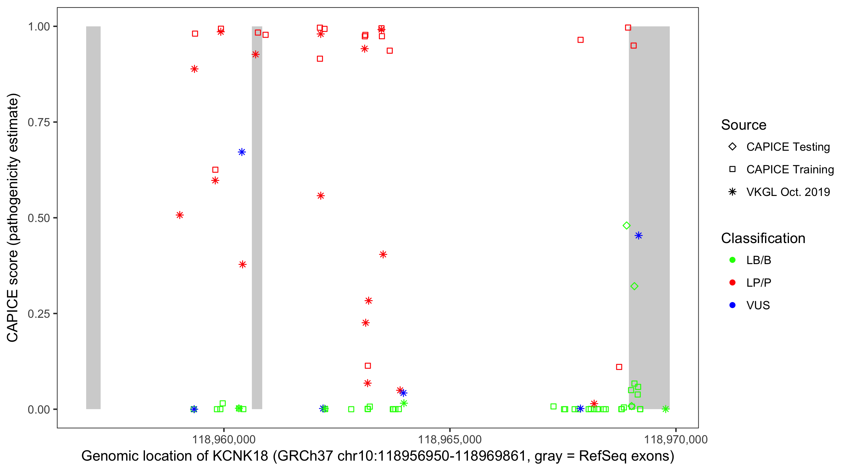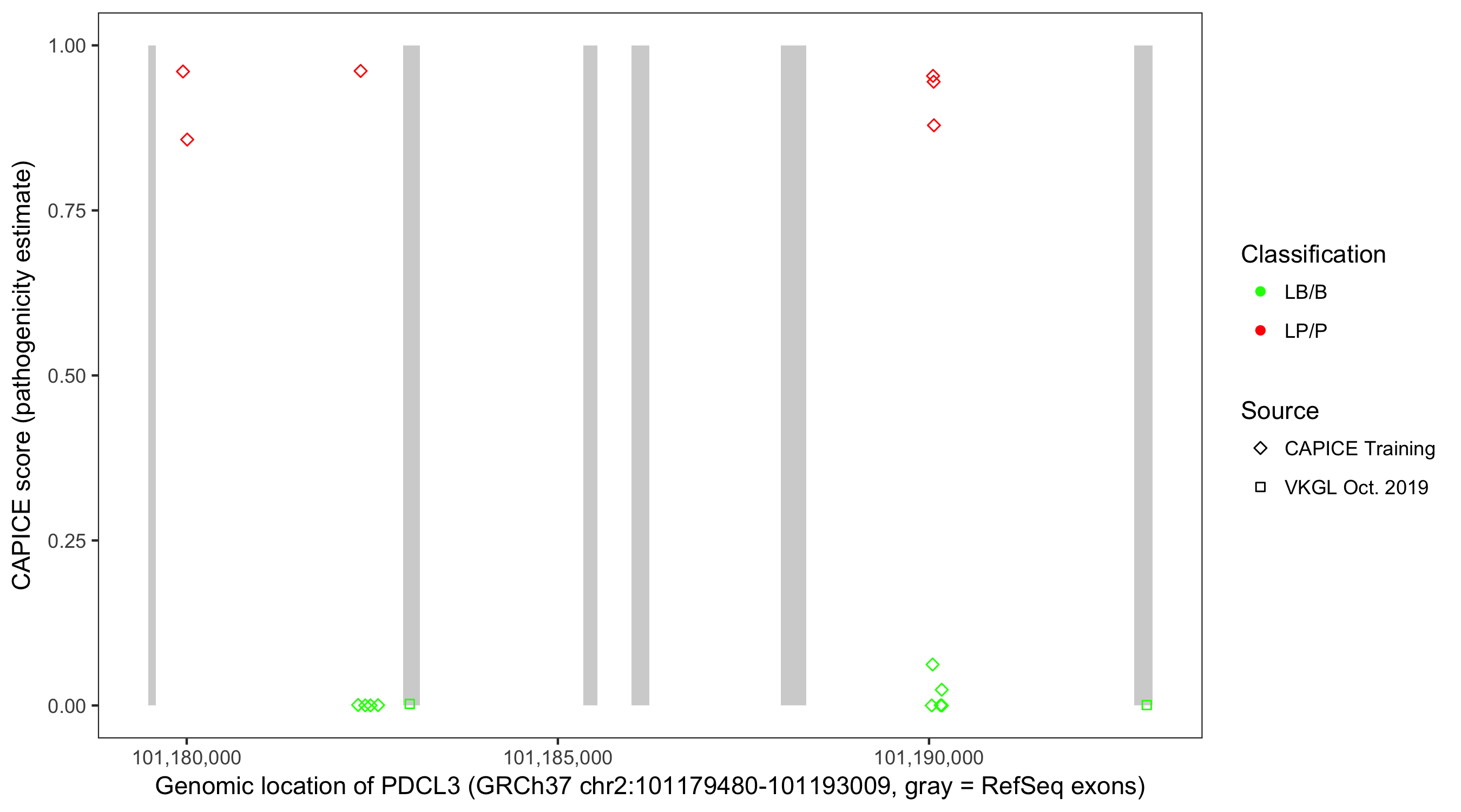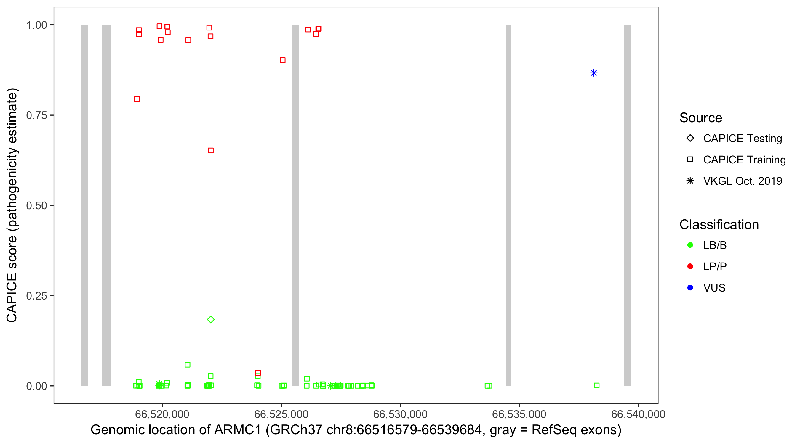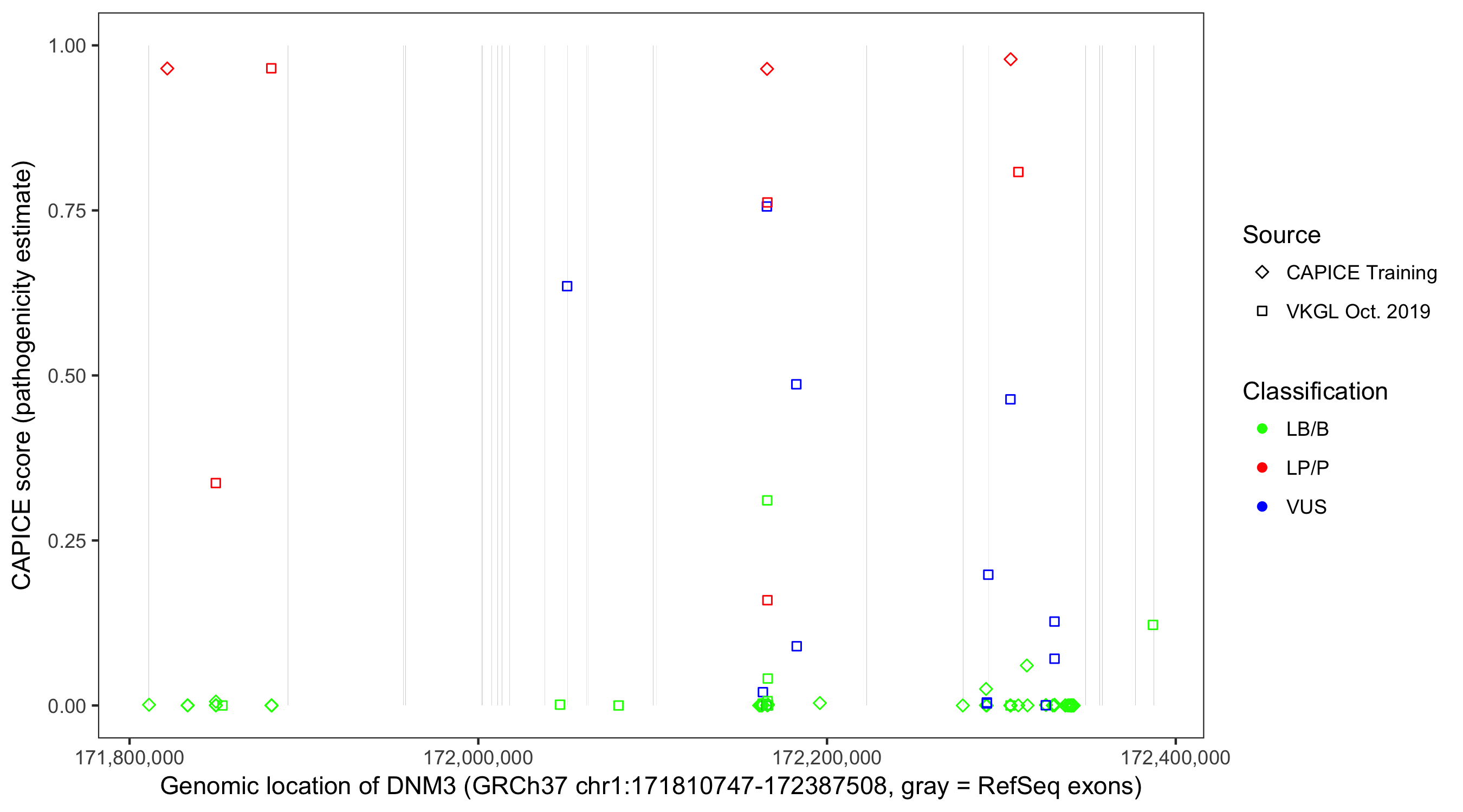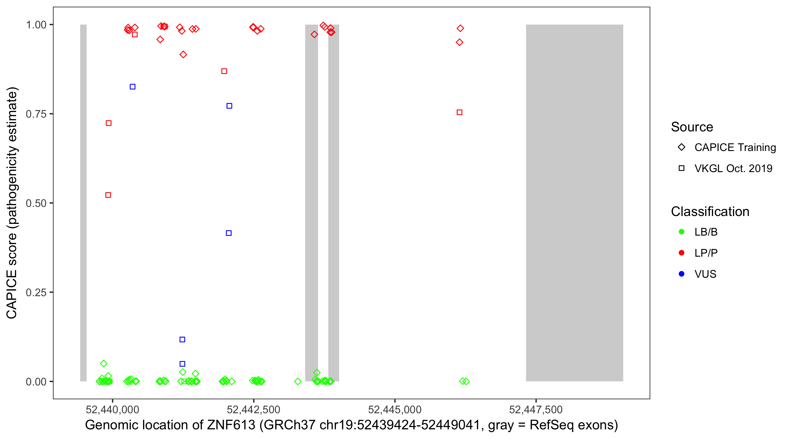 Shown are CAPICE train/test variants plus VKGL Oct 2019.