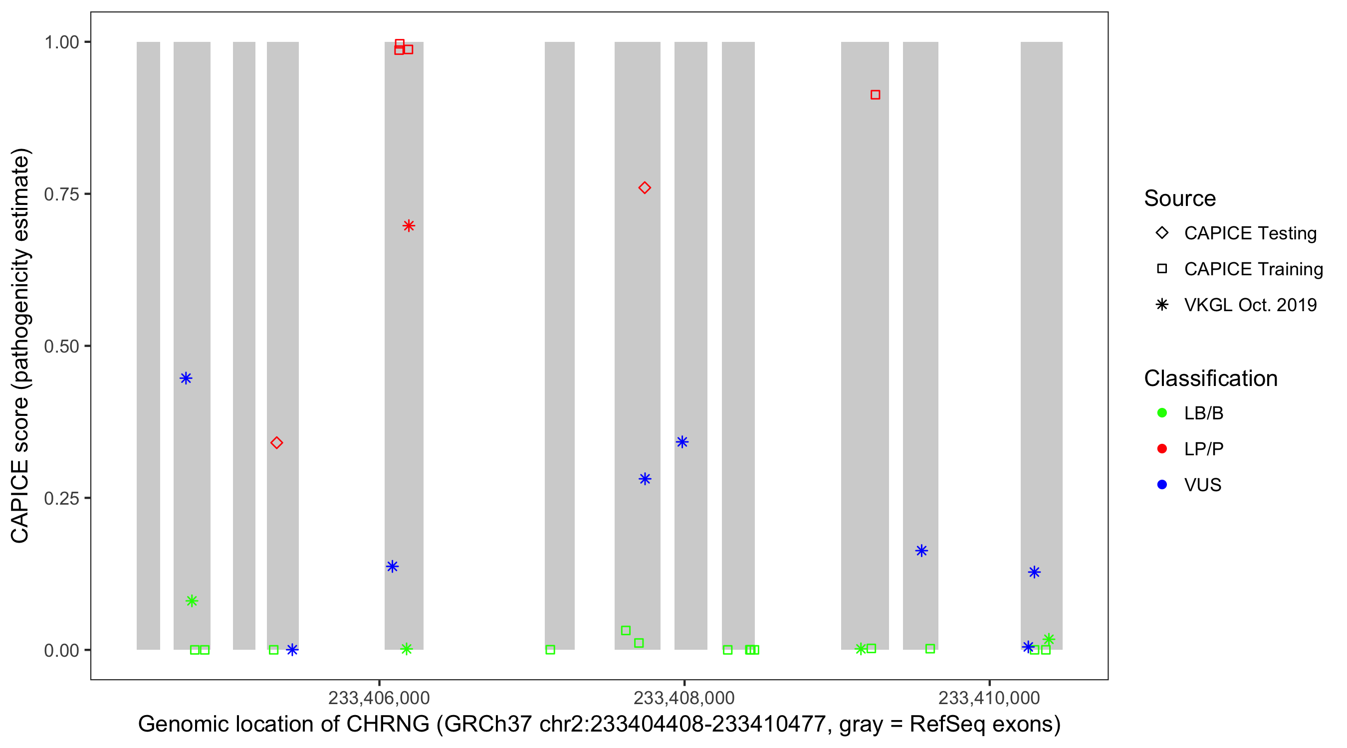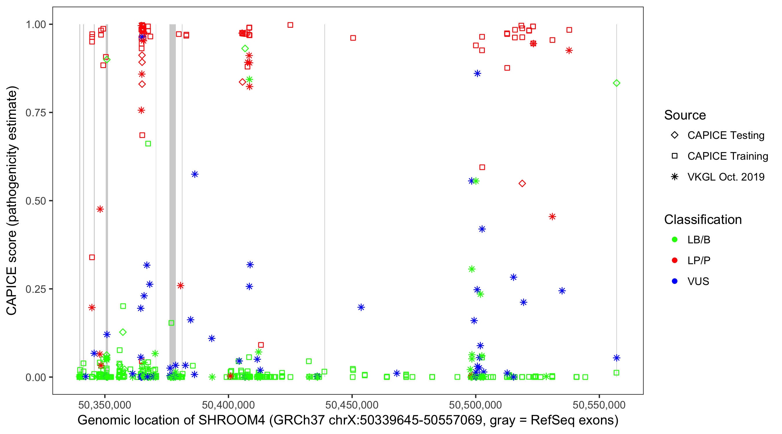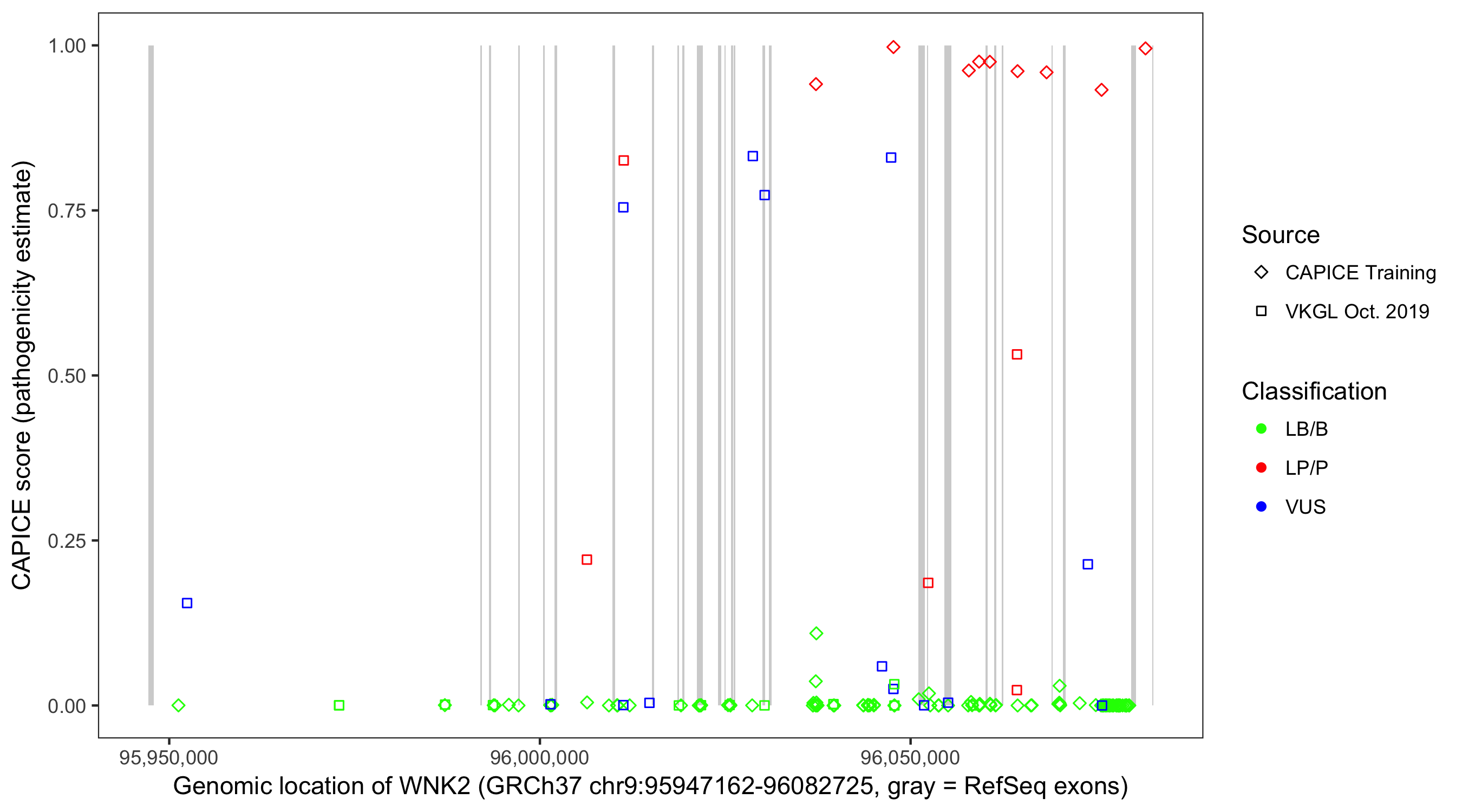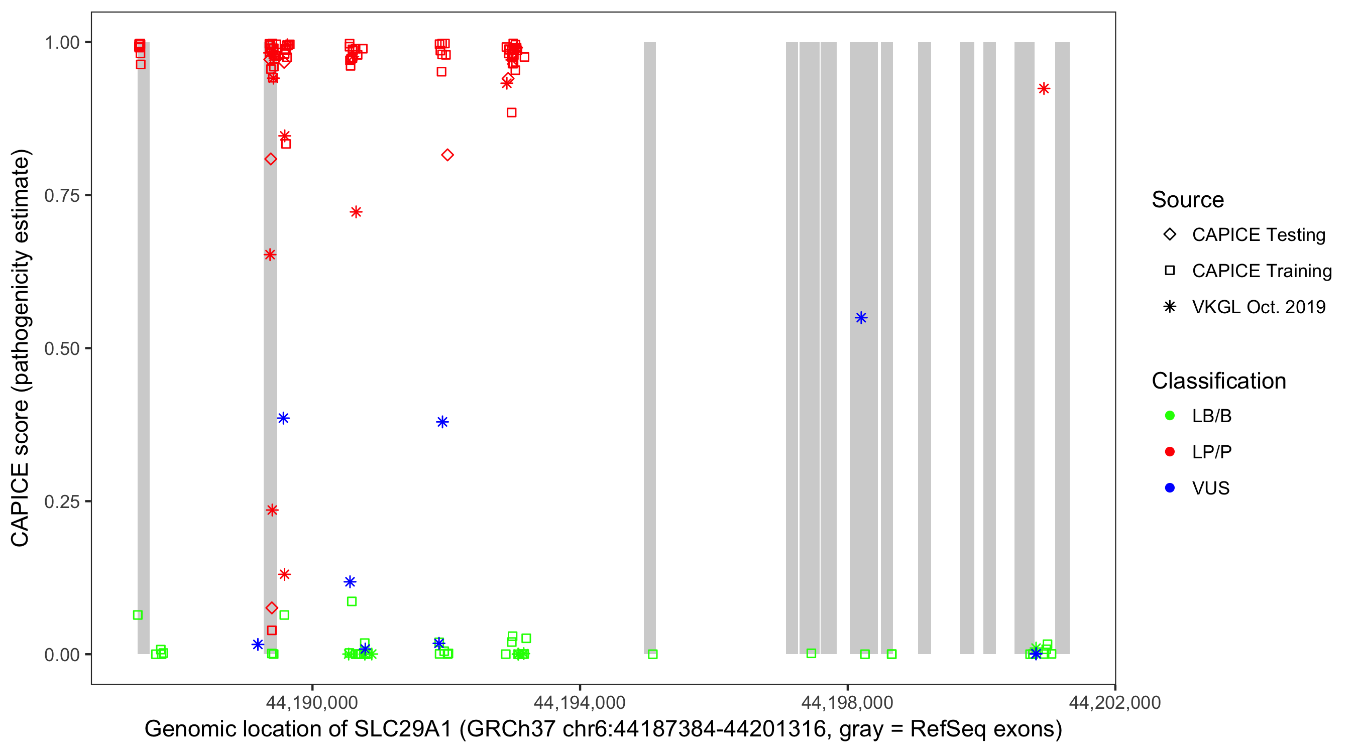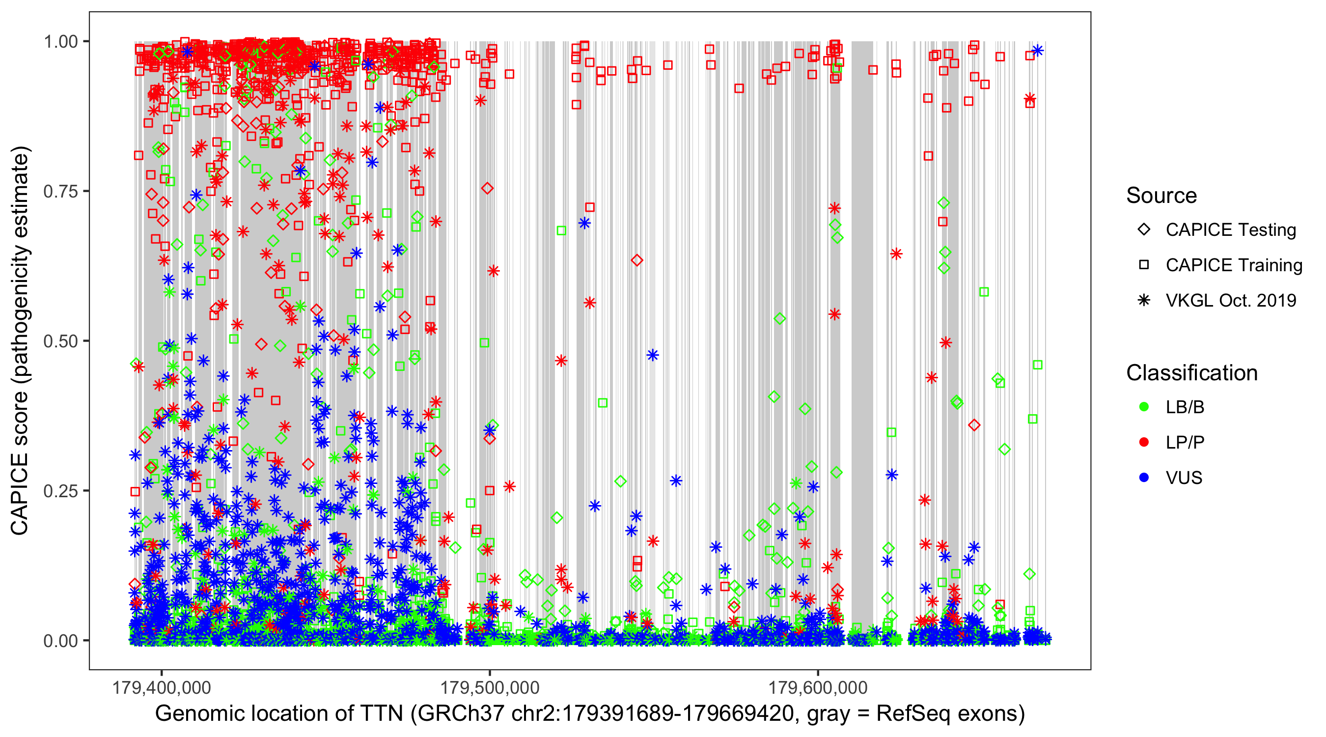 Shown are CAPICE train/test variants plus VKGL Oct 2019.