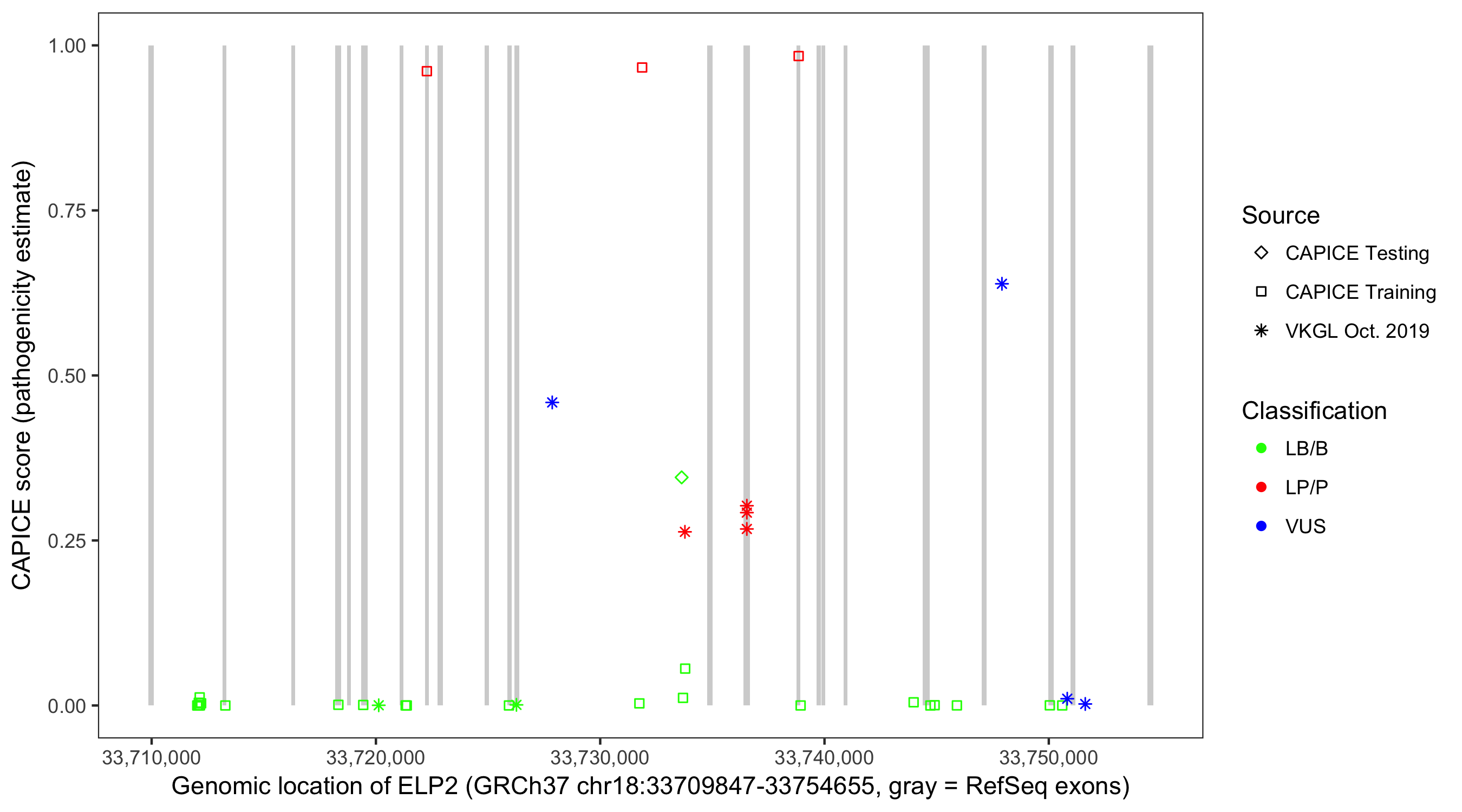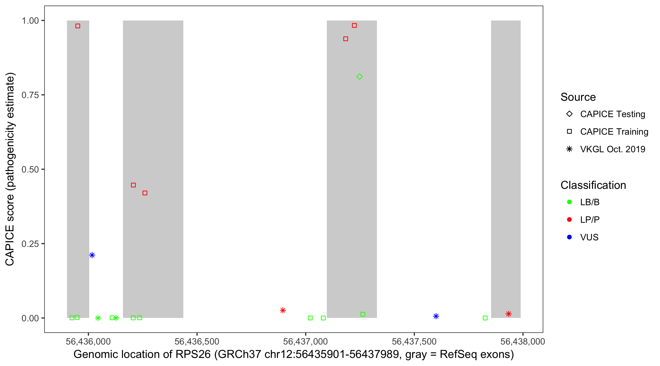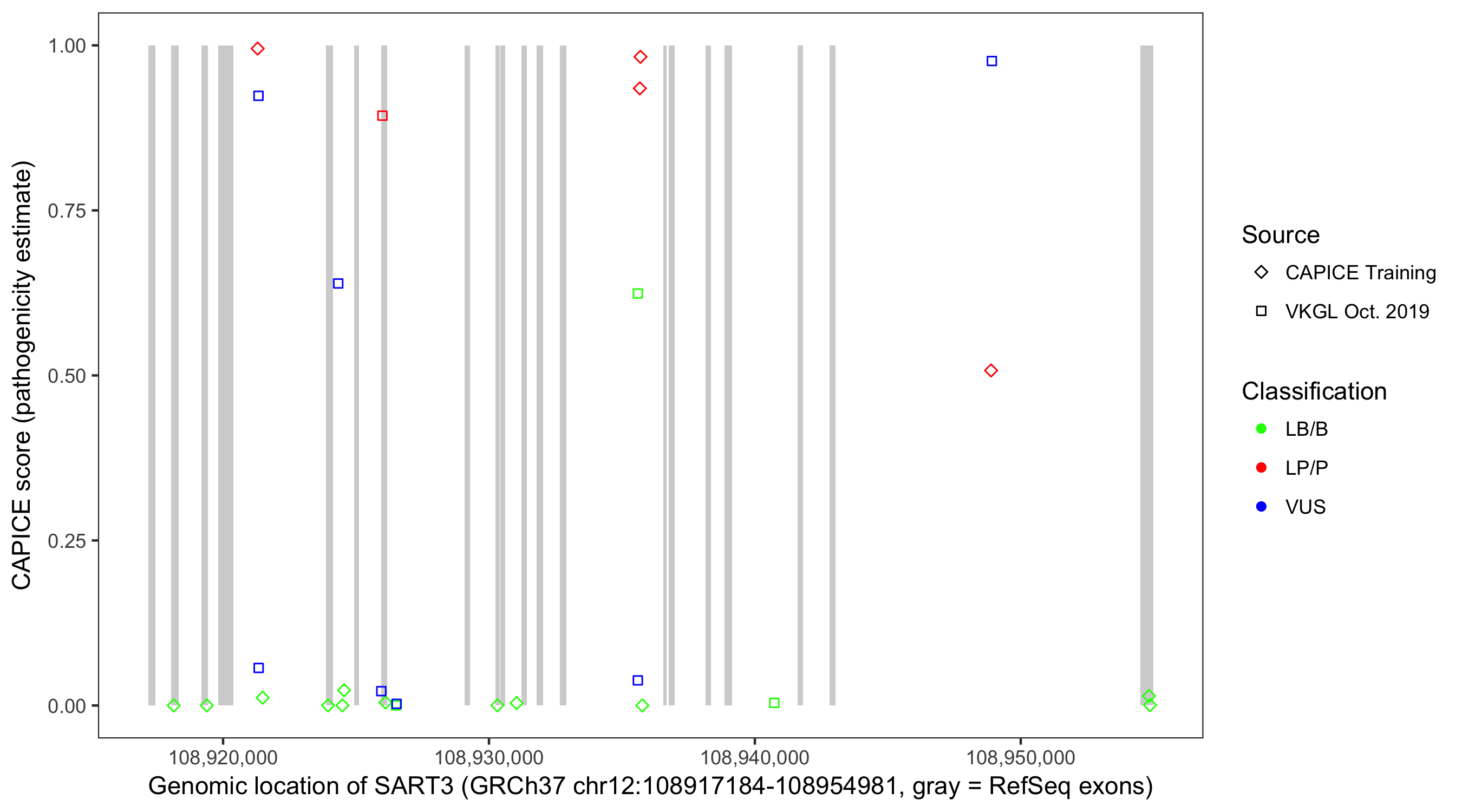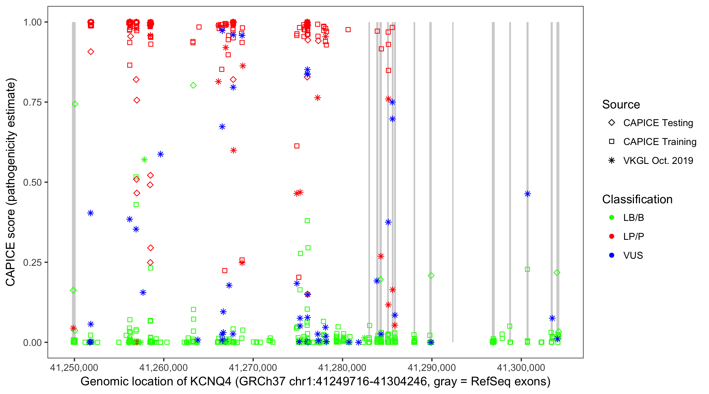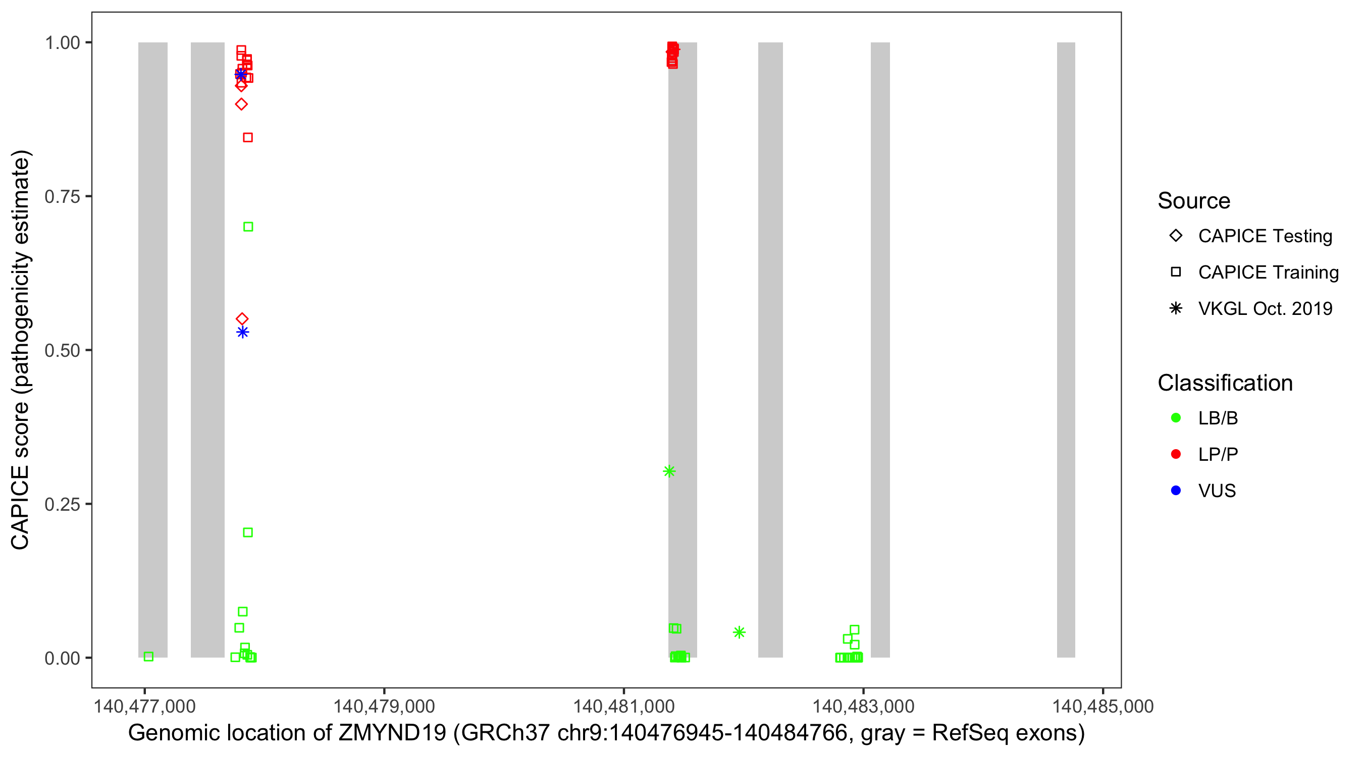 Shown are CAPICE train/test variants plus VKGL Oct 2019.
