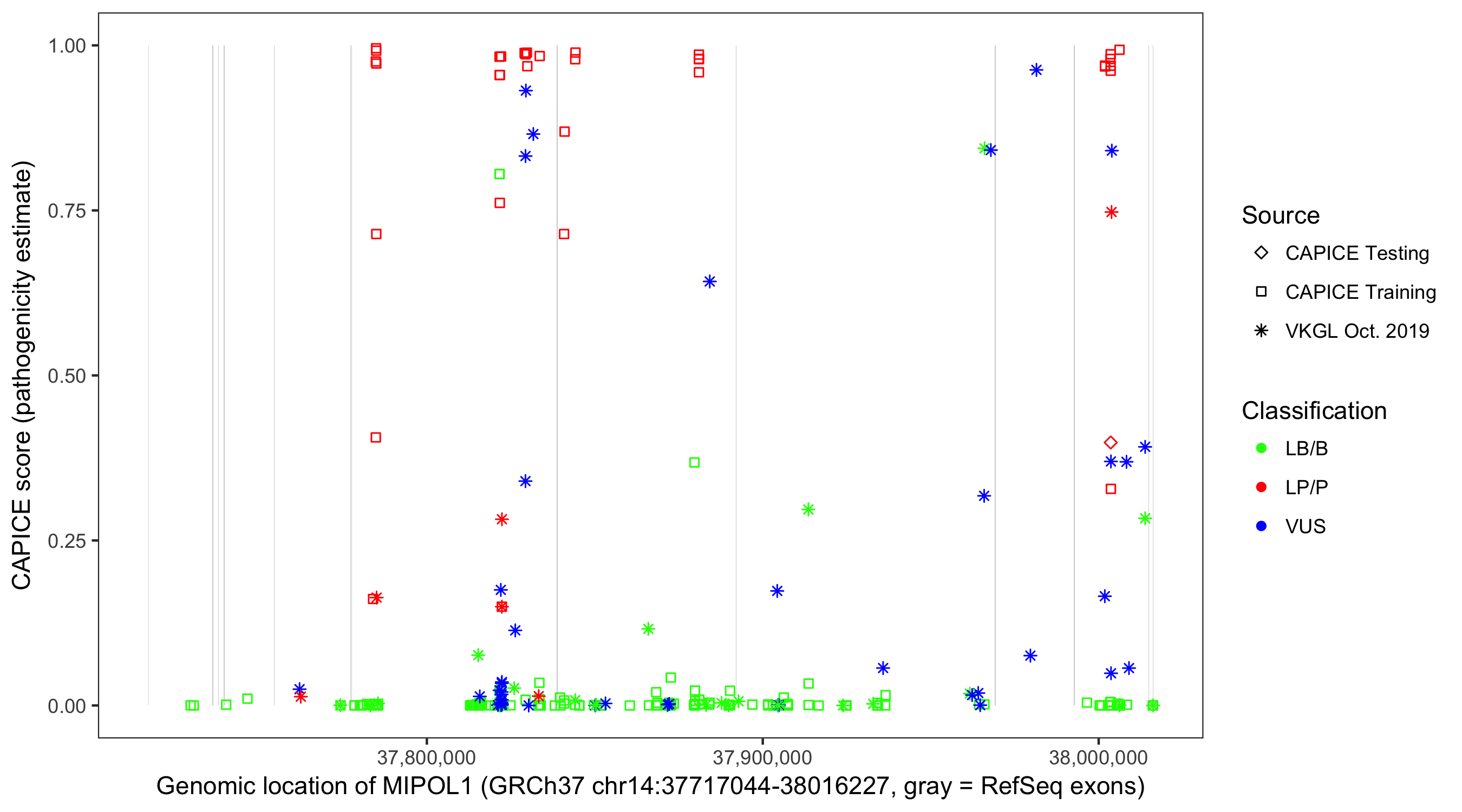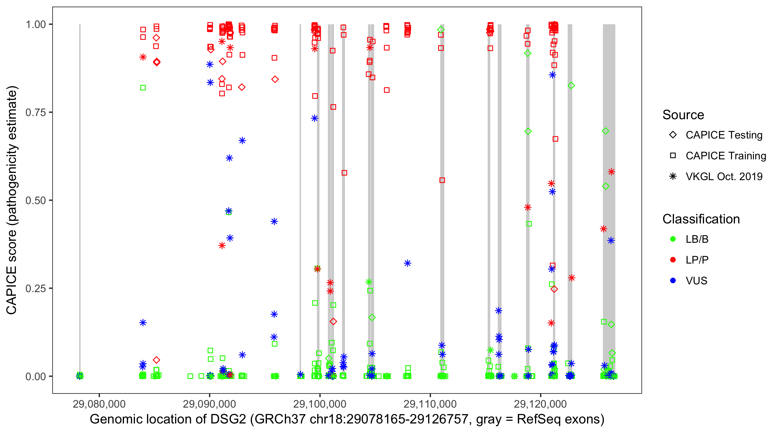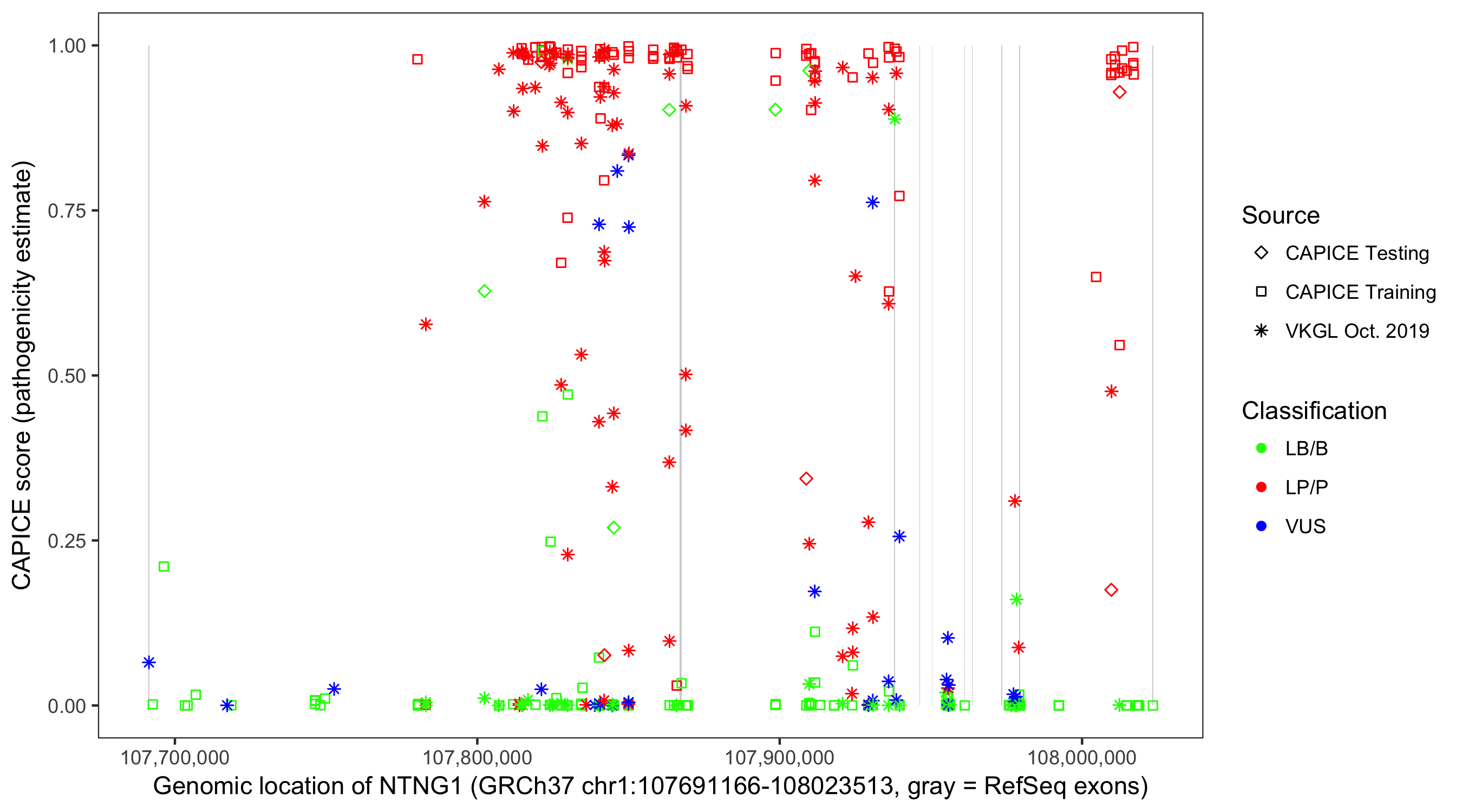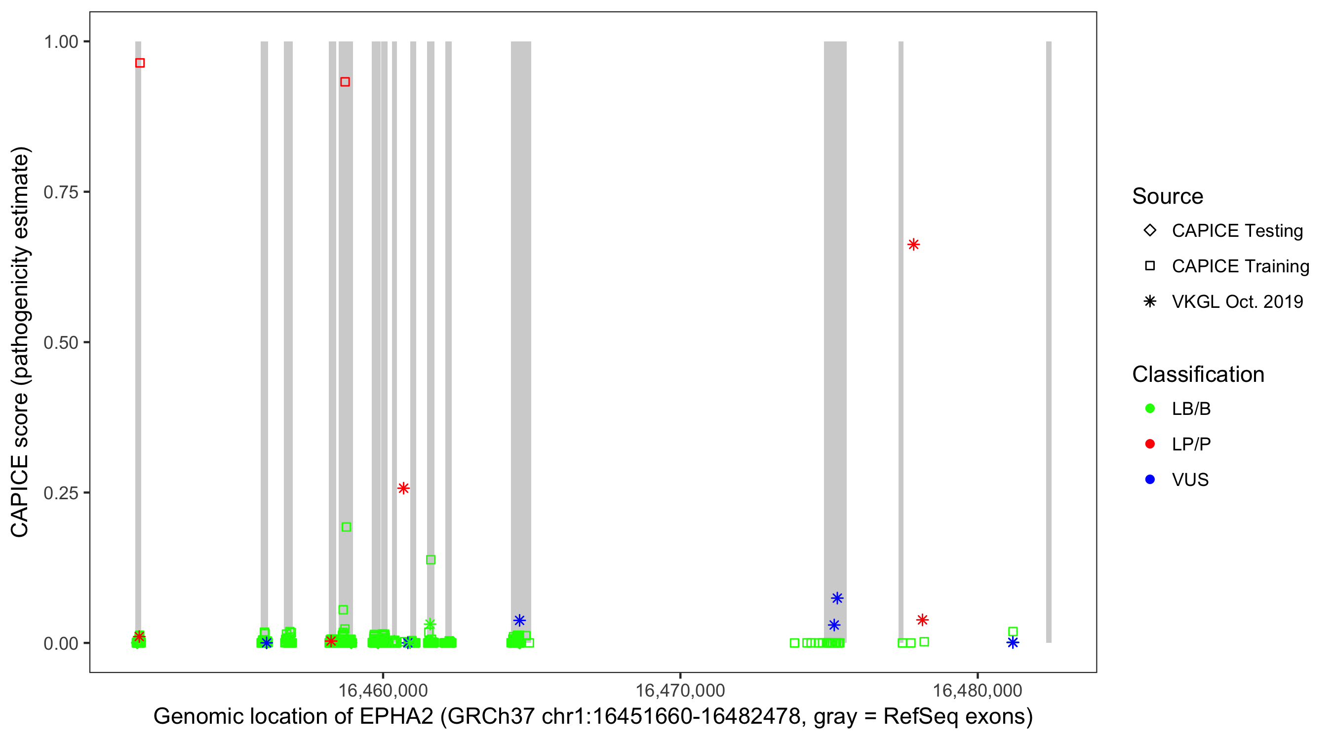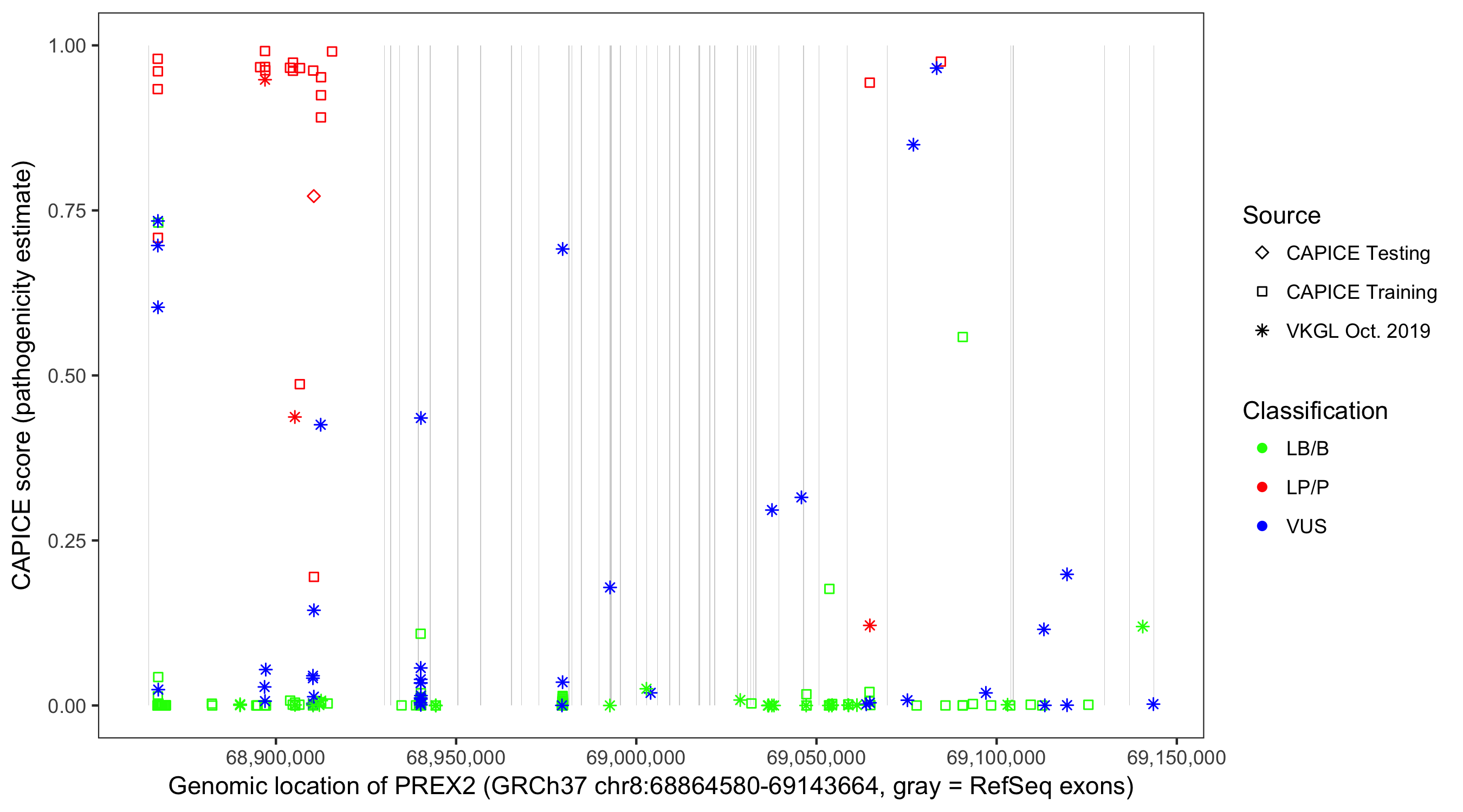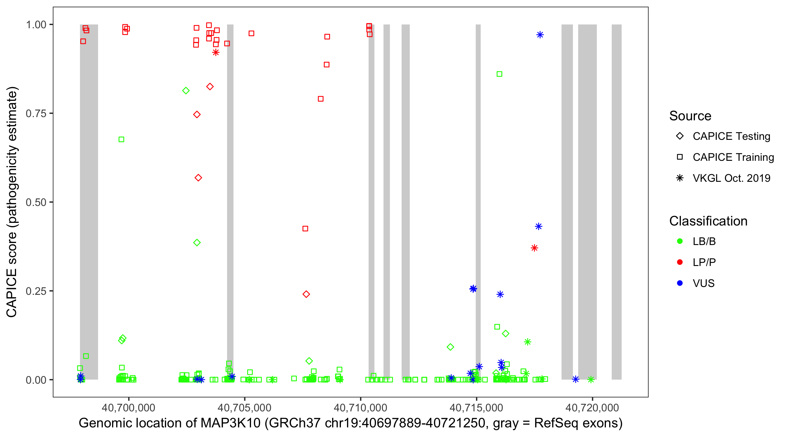 Shown are CAPICE train/test variants plus VKGL Oct 2019.