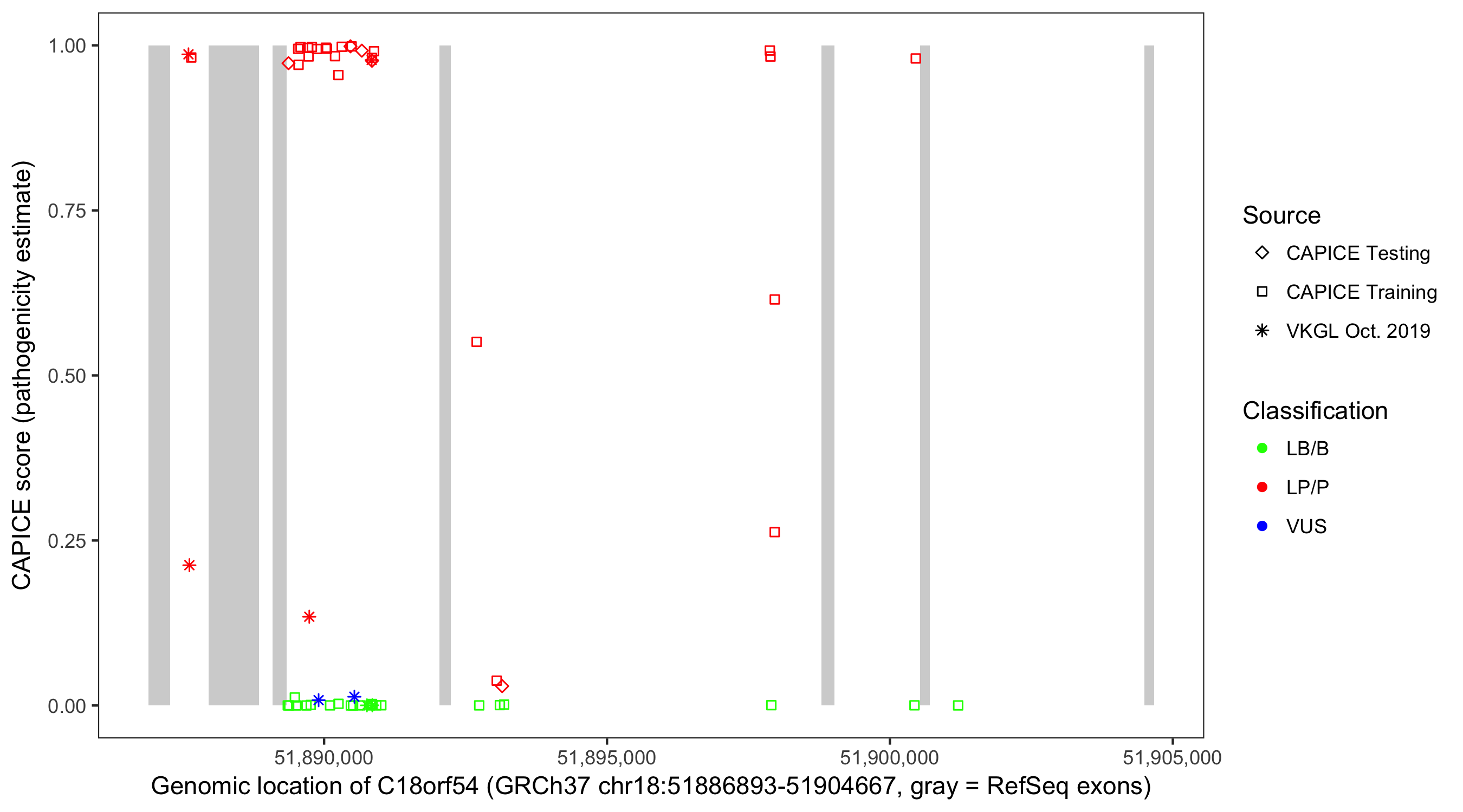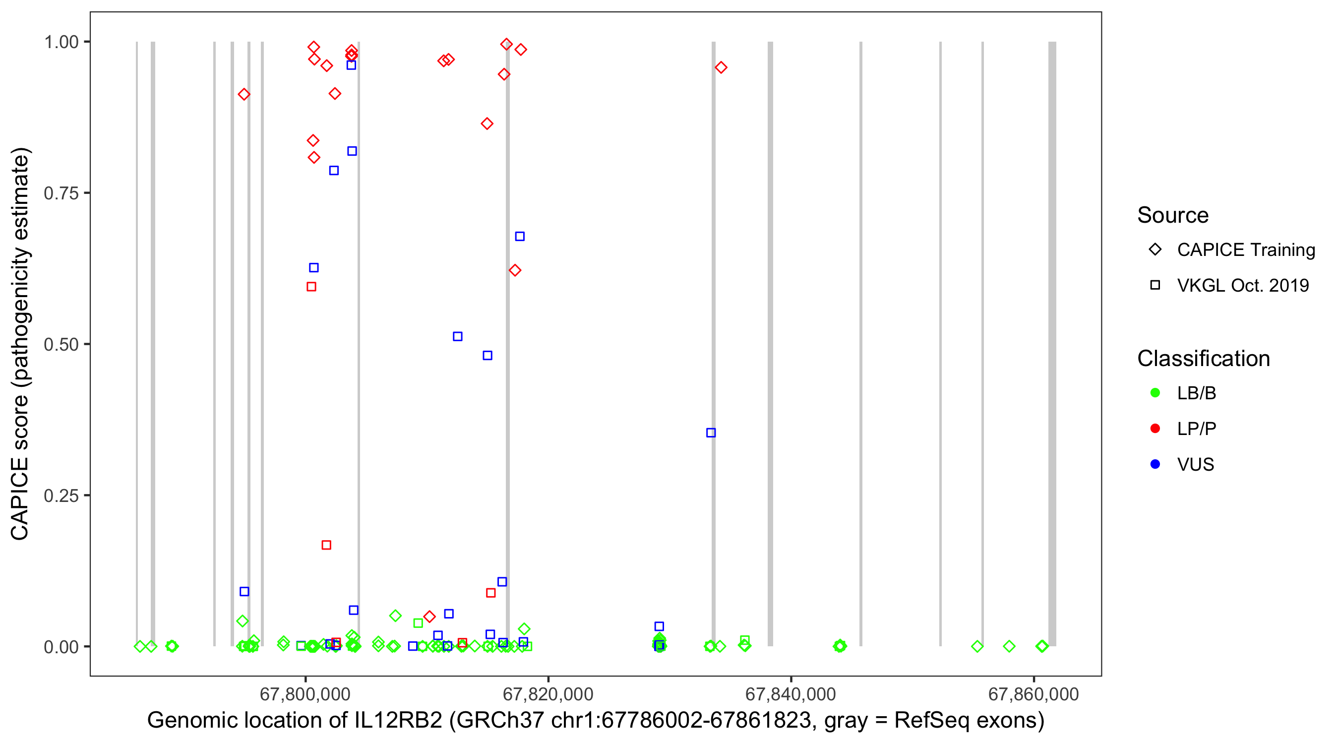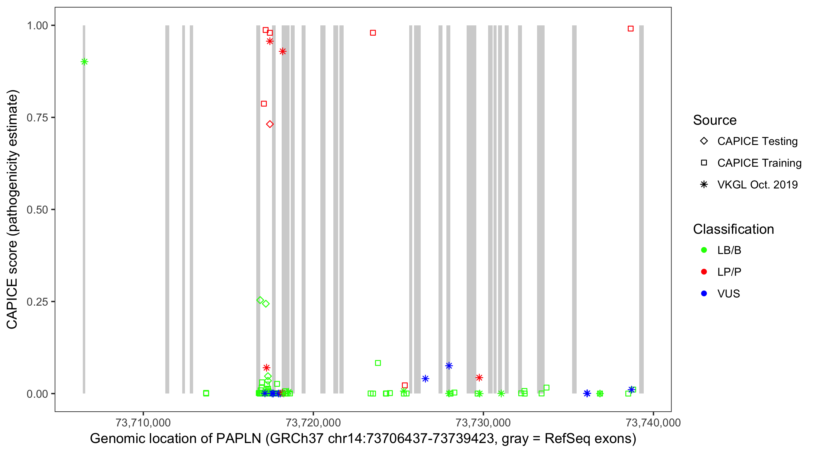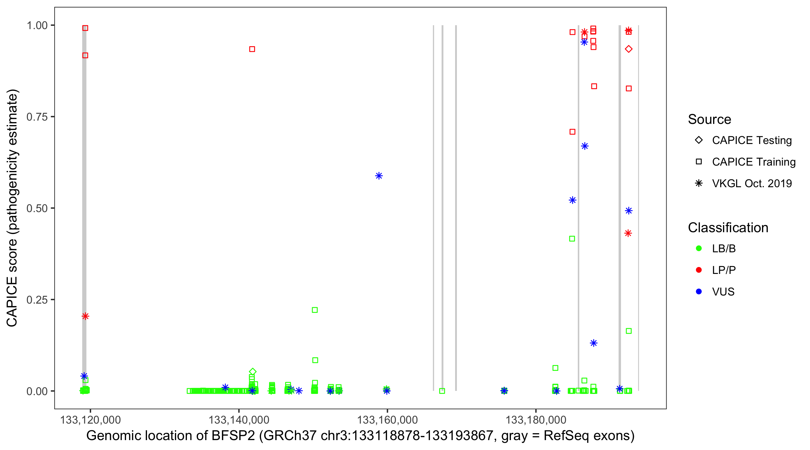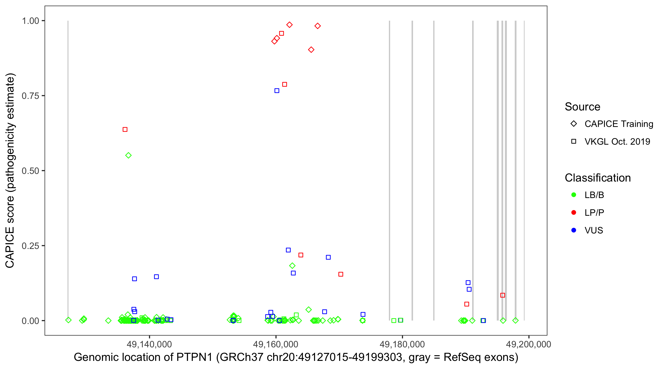 Shown are CAPICE train/test variants plus VKGL Oct 2019.