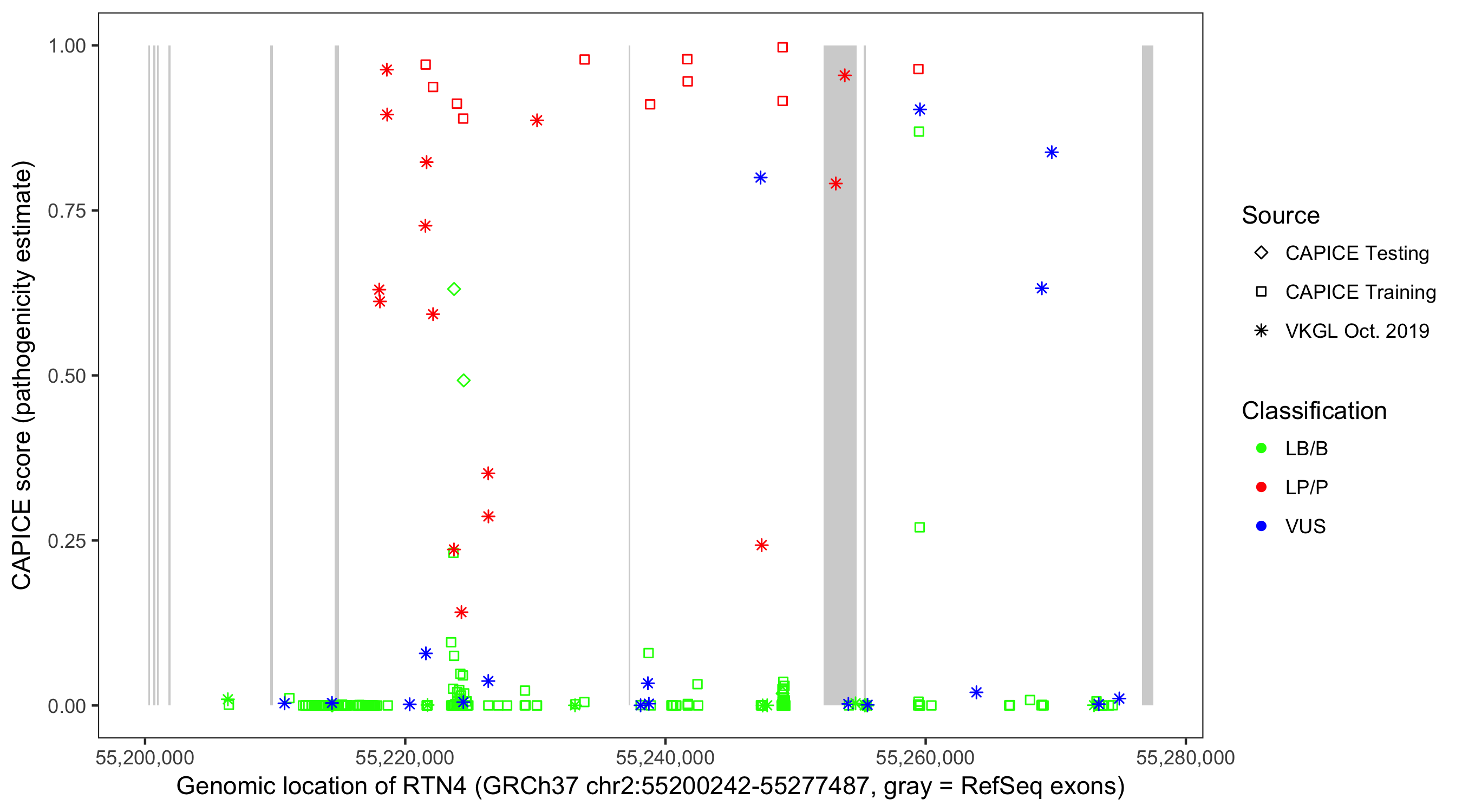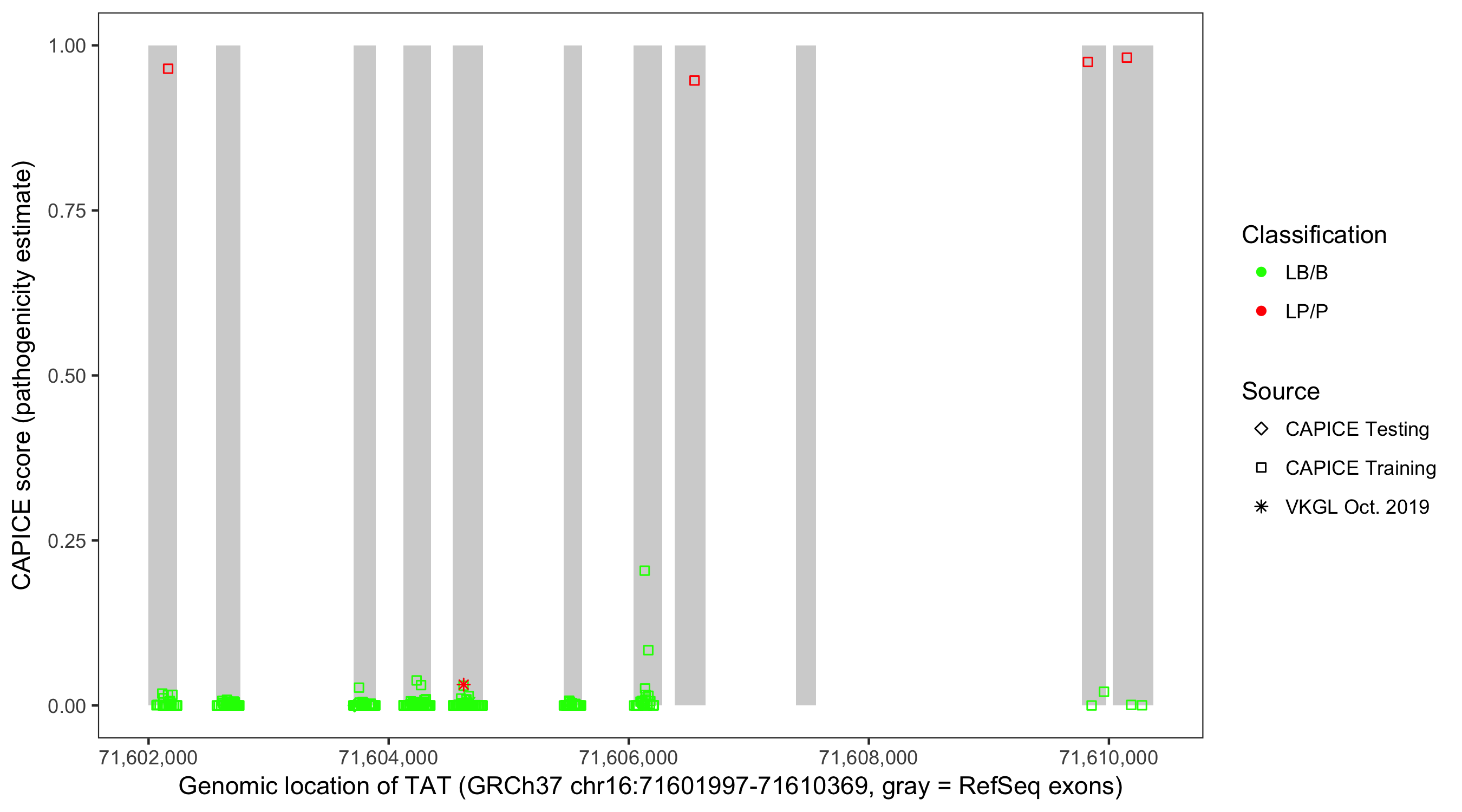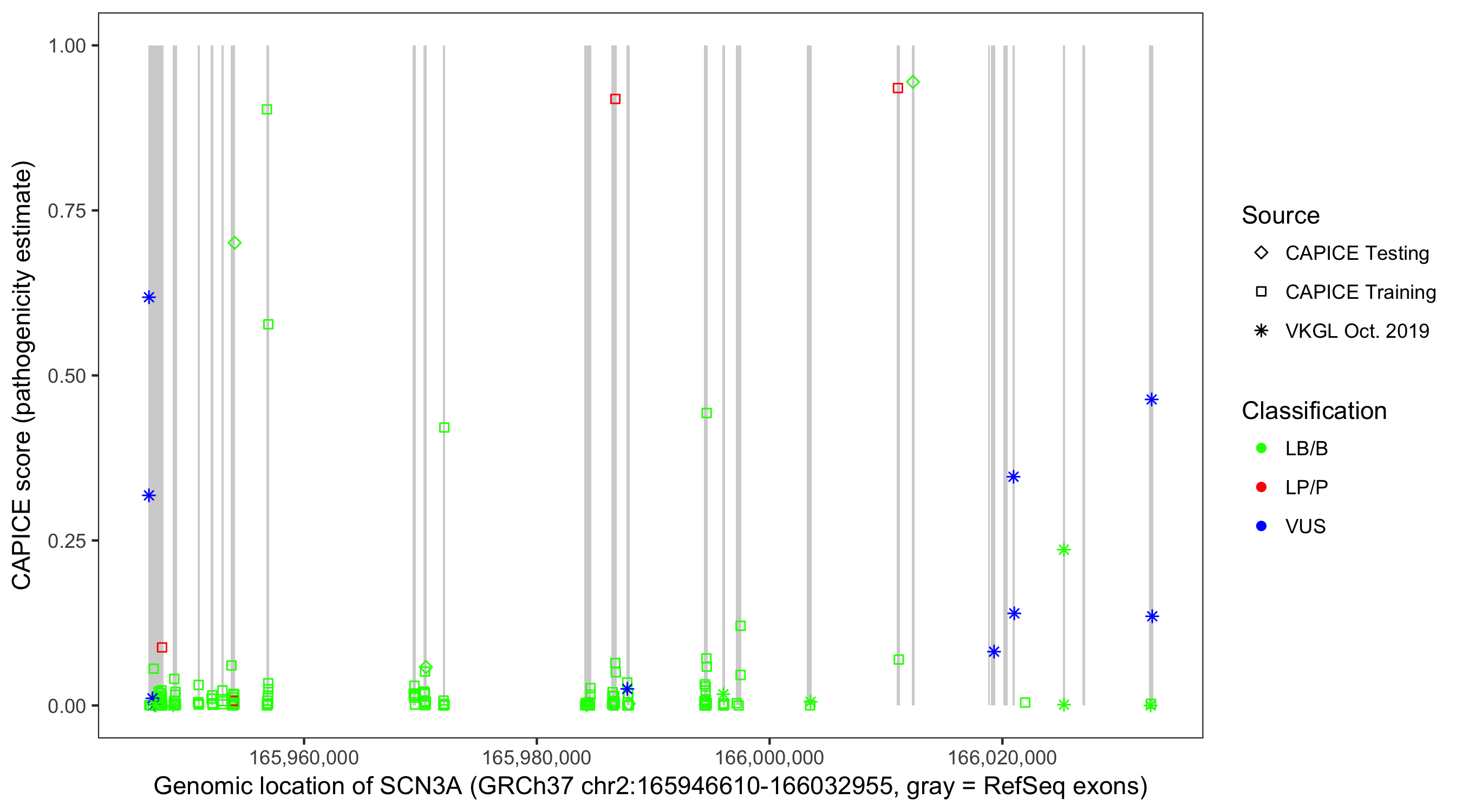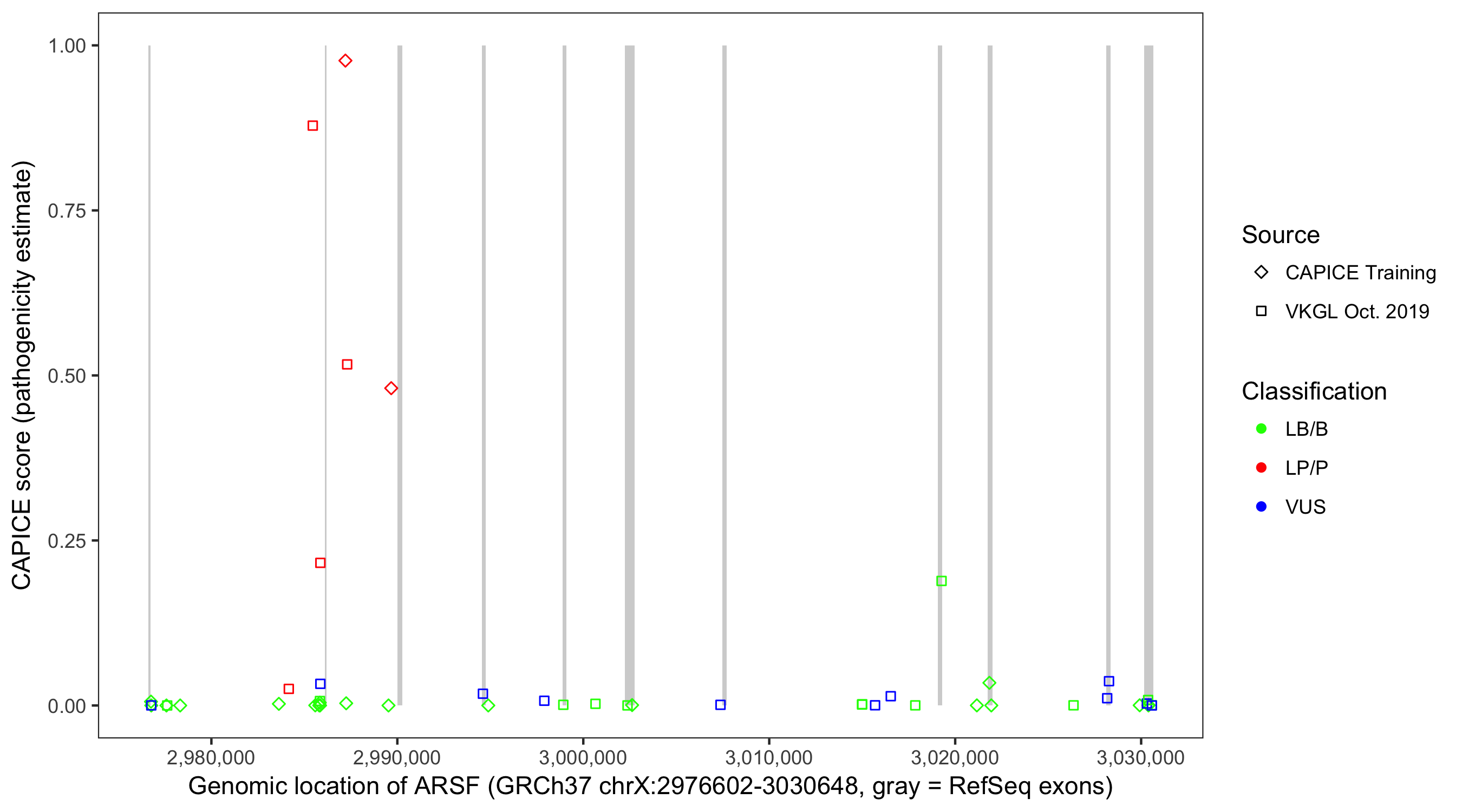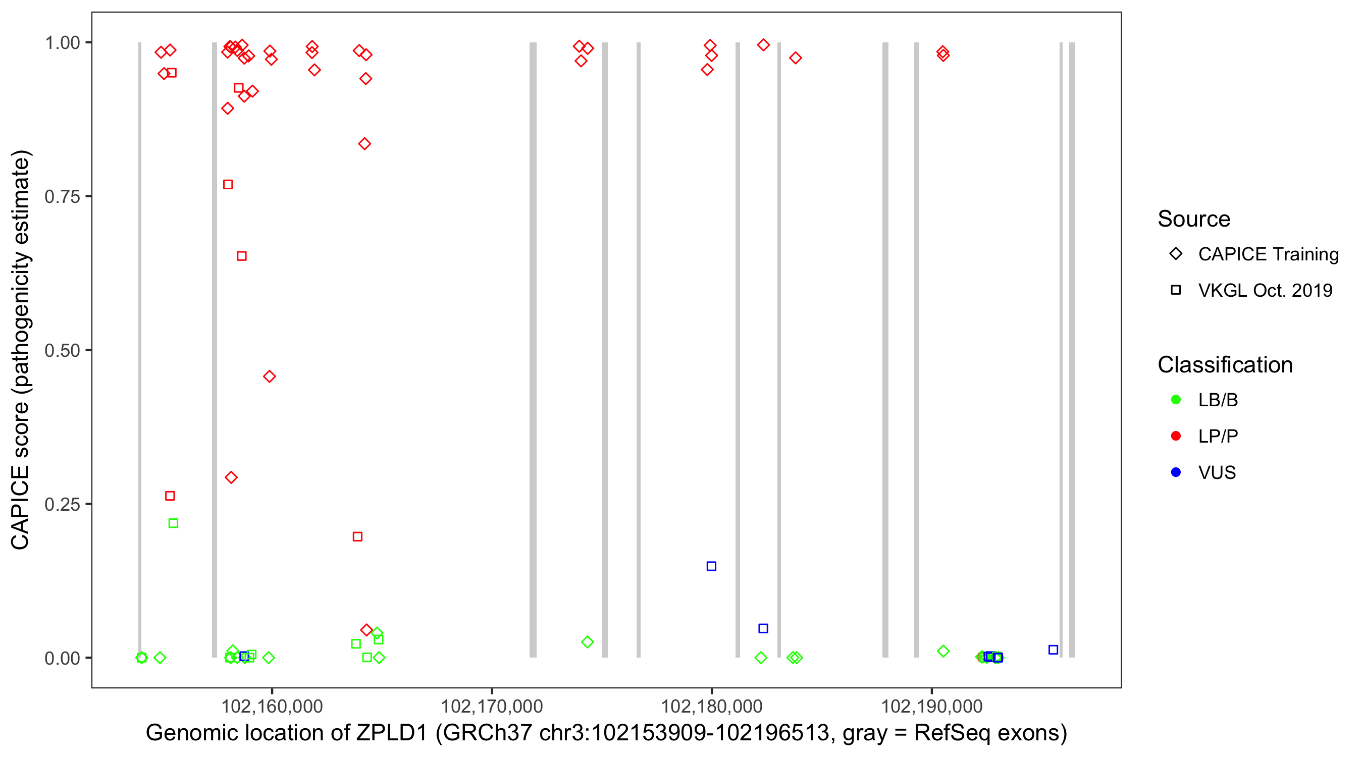 Shown are CAPICE train/test variants plus VKGL Oct 2019.