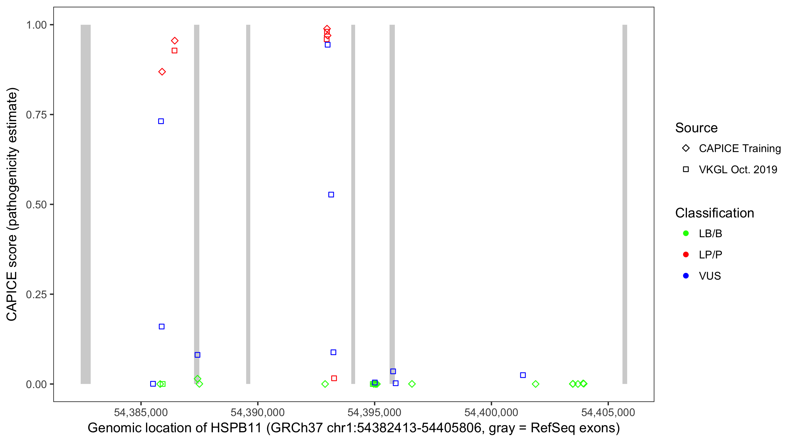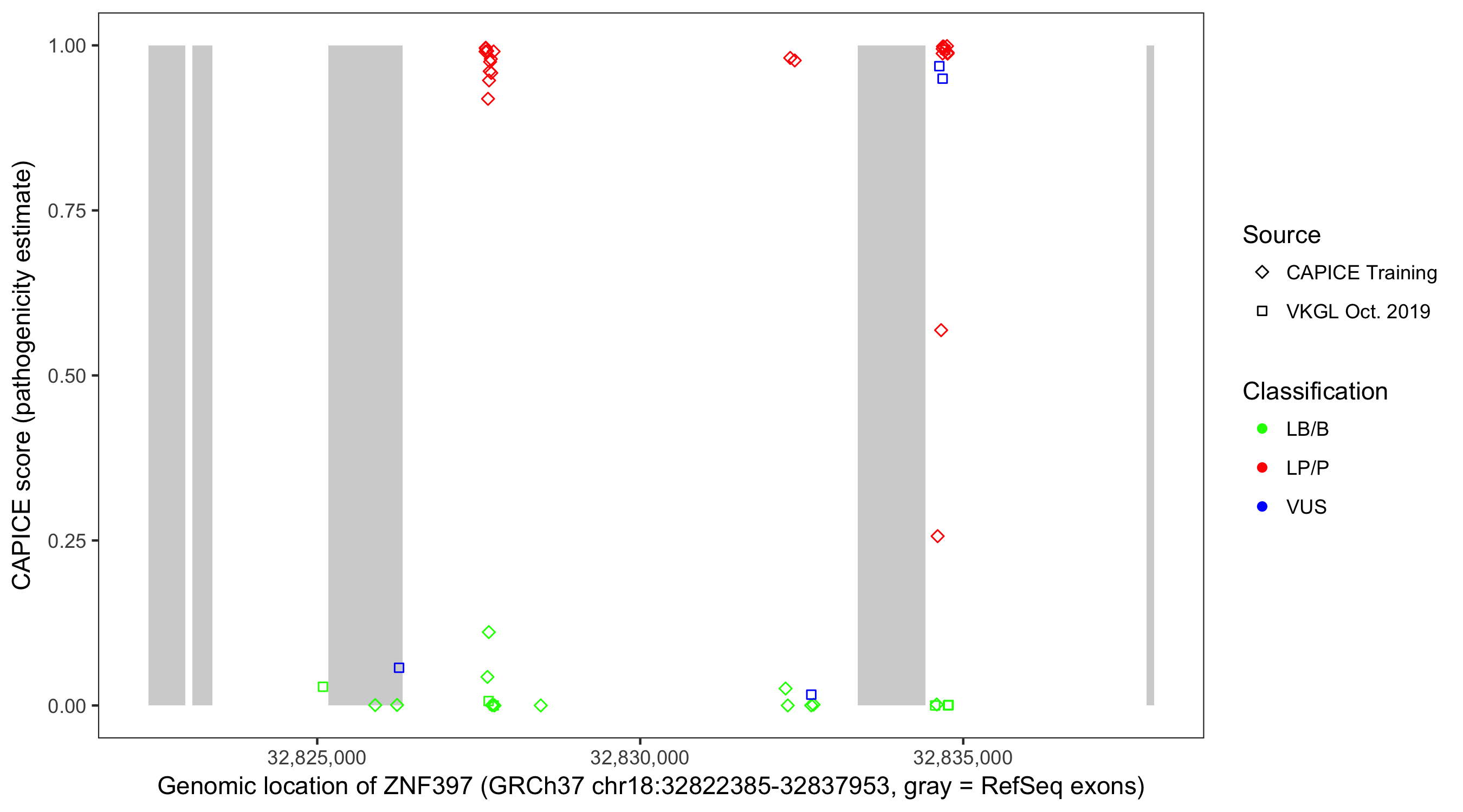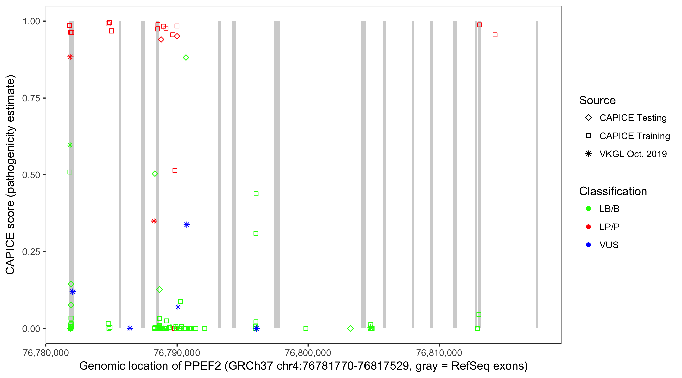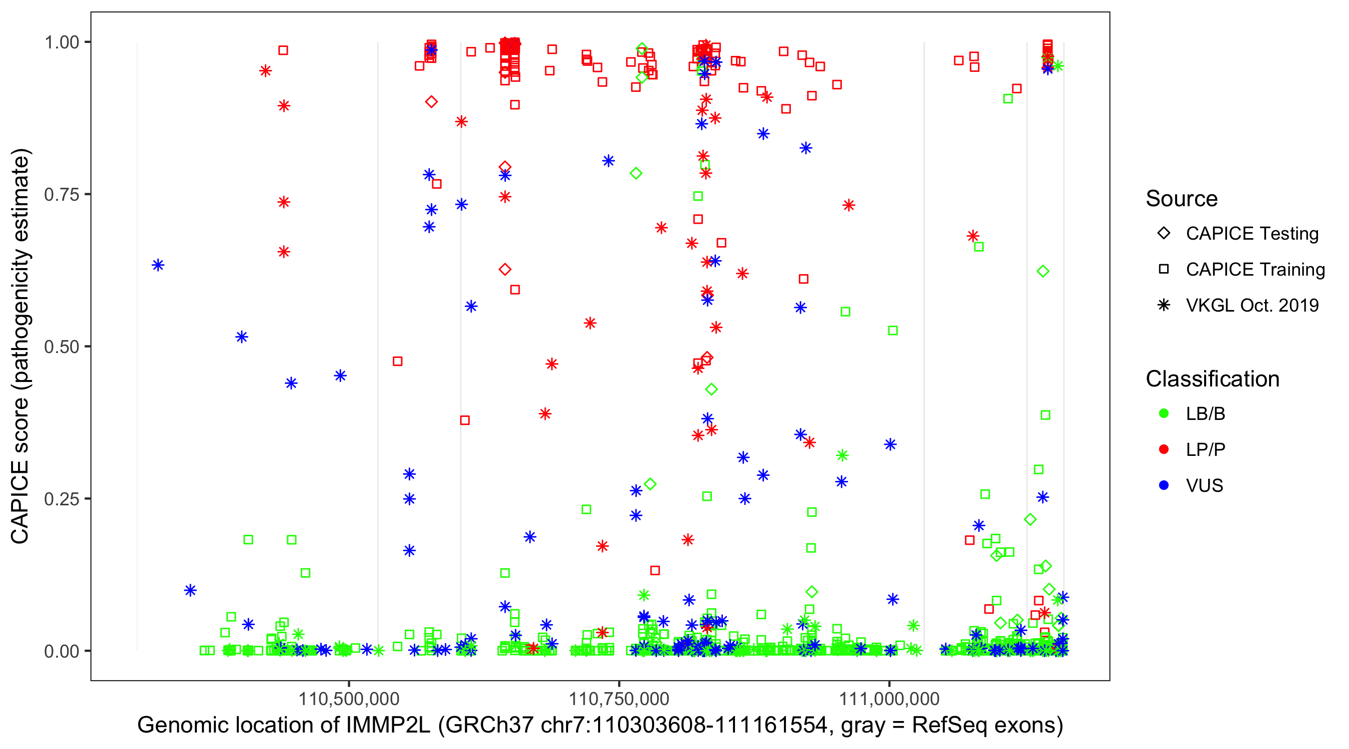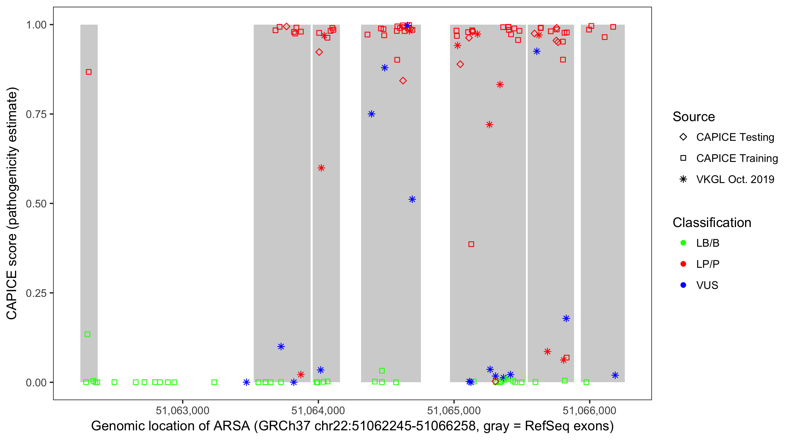 Shown are CAPICE train/test variants plus VKGL Oct 2019.