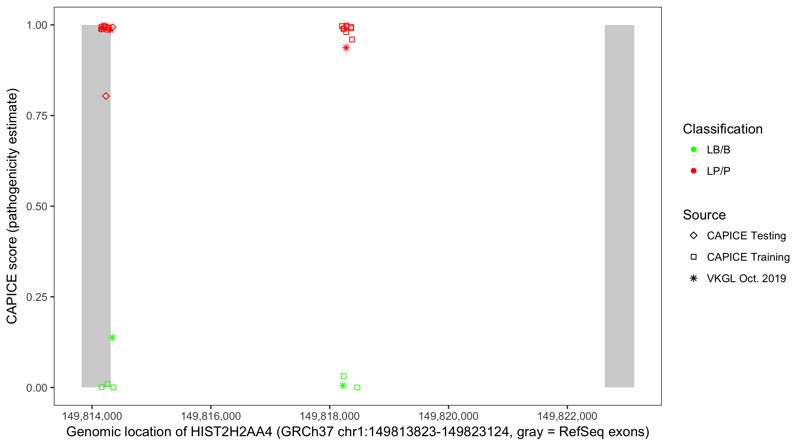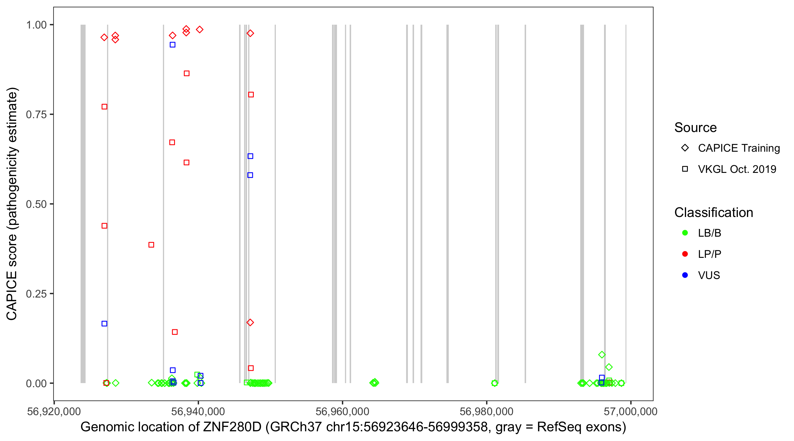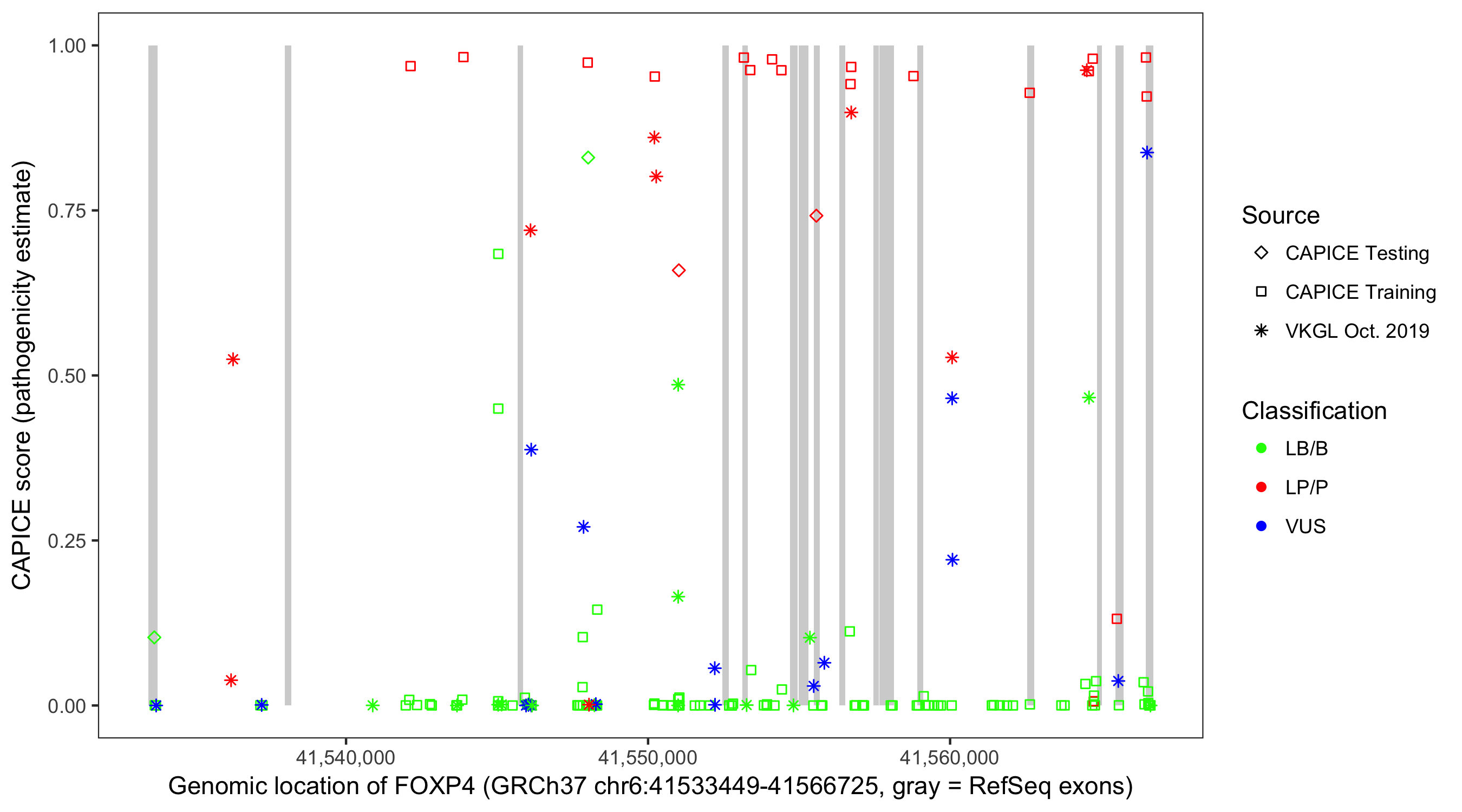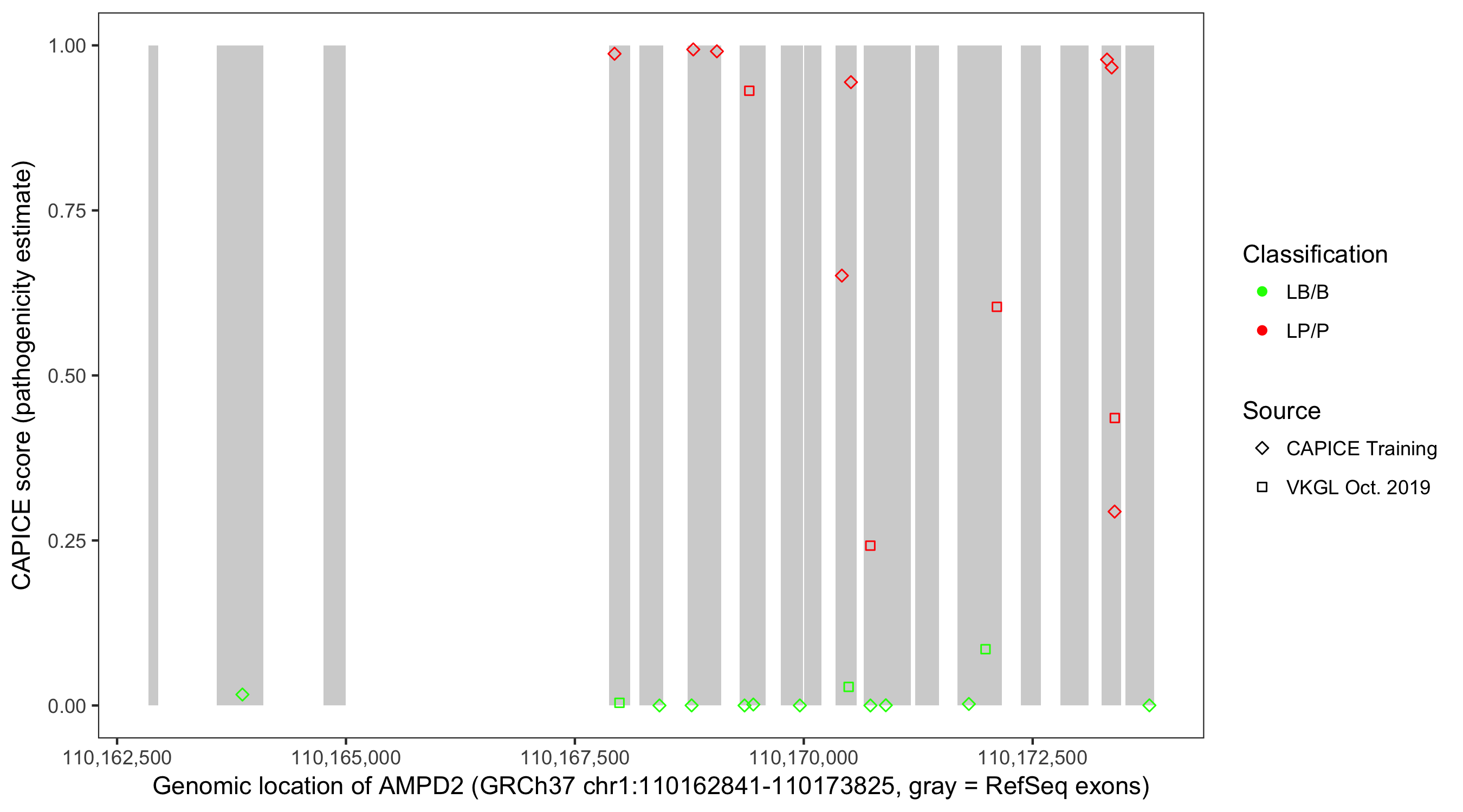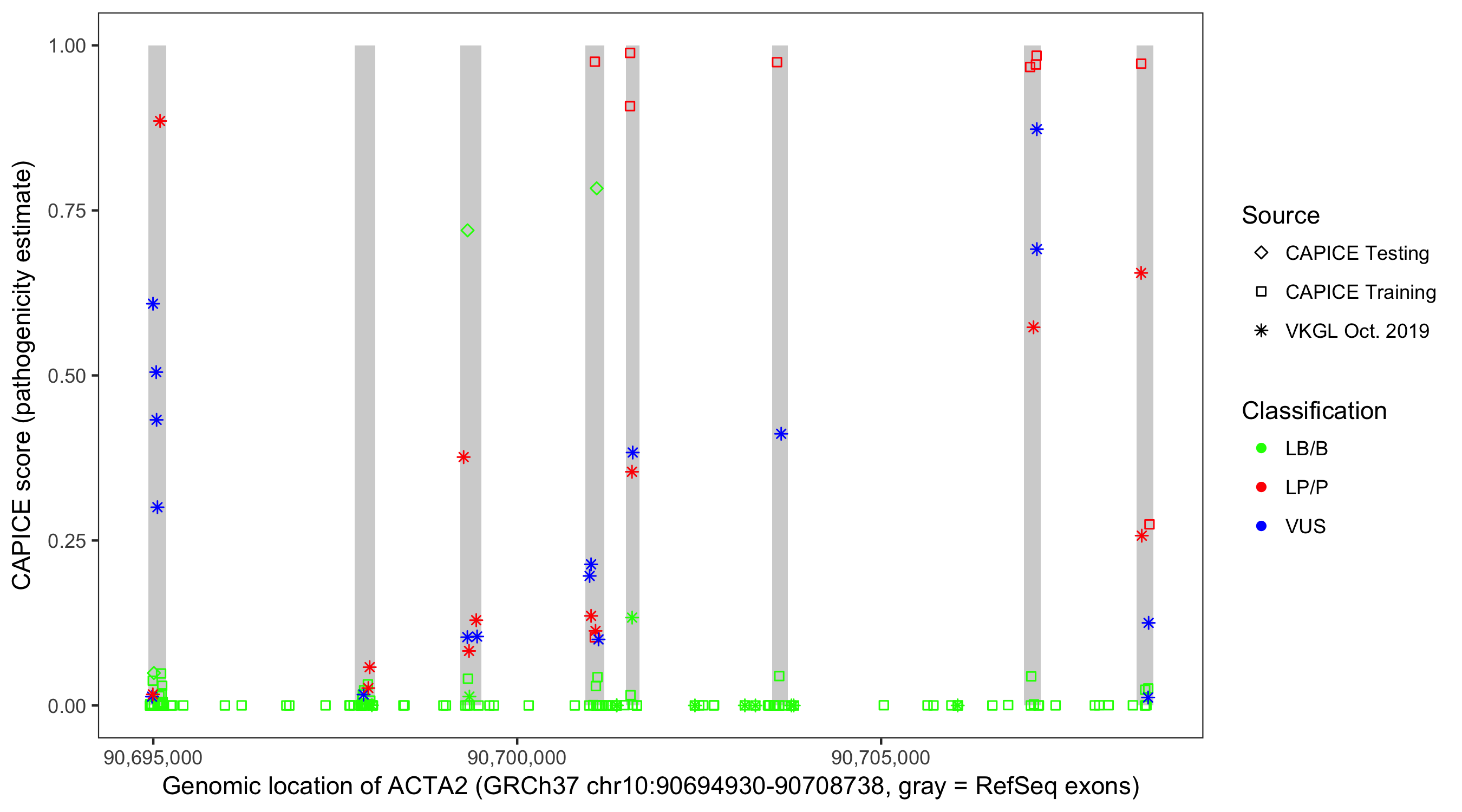 Shown are CAPICE train/test variants plus VKGL Oct 2019.