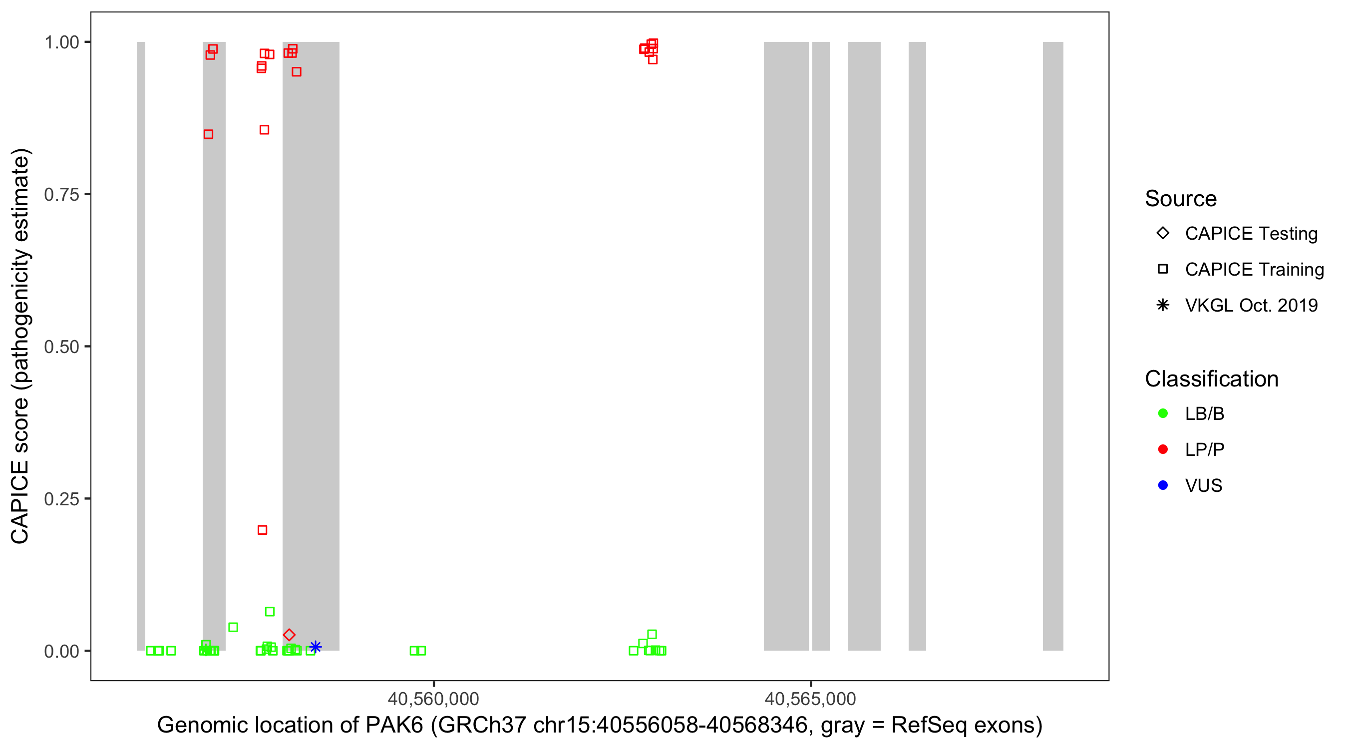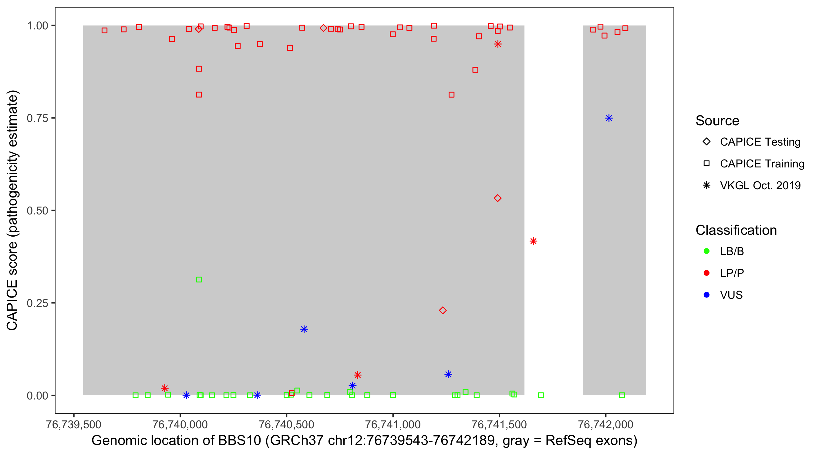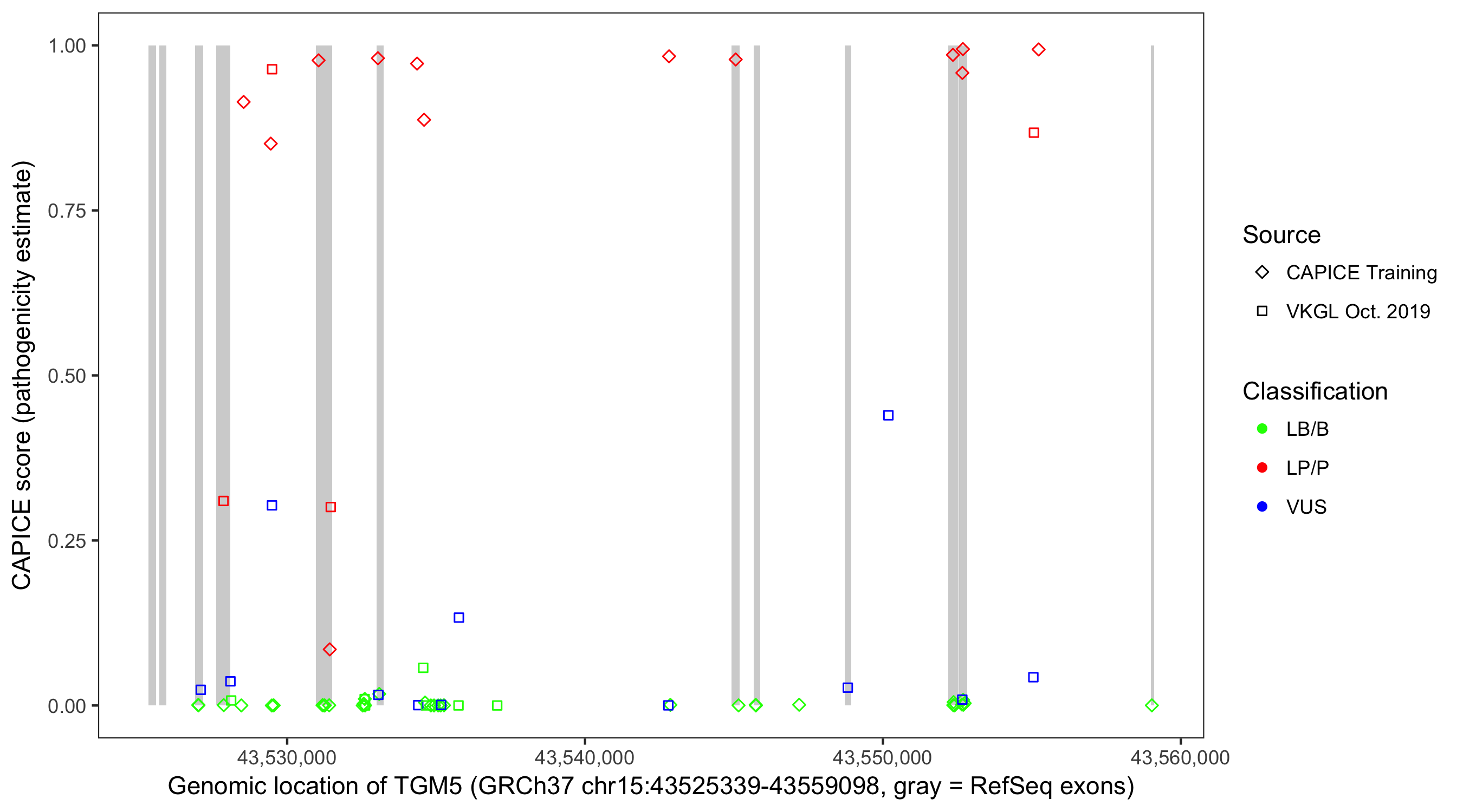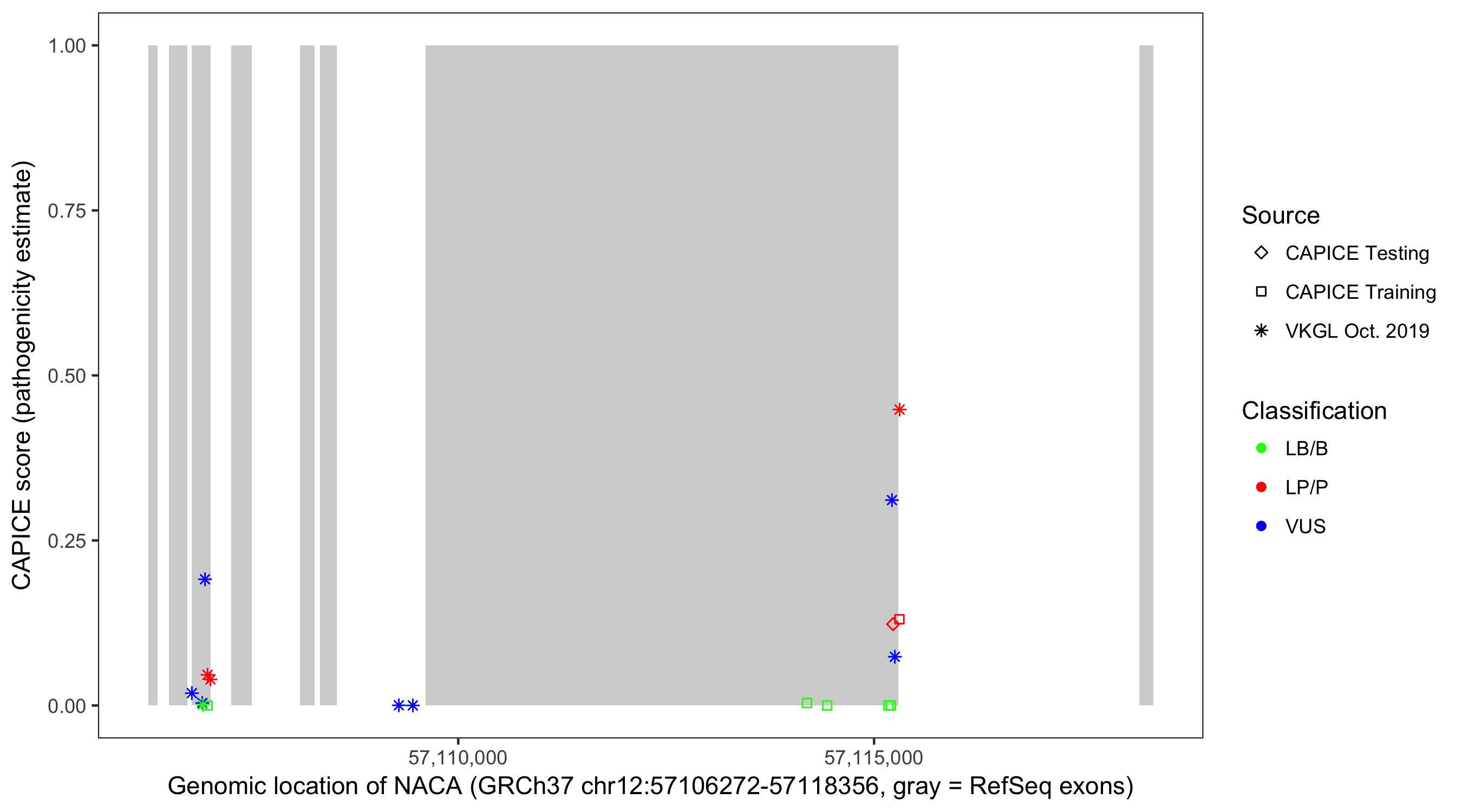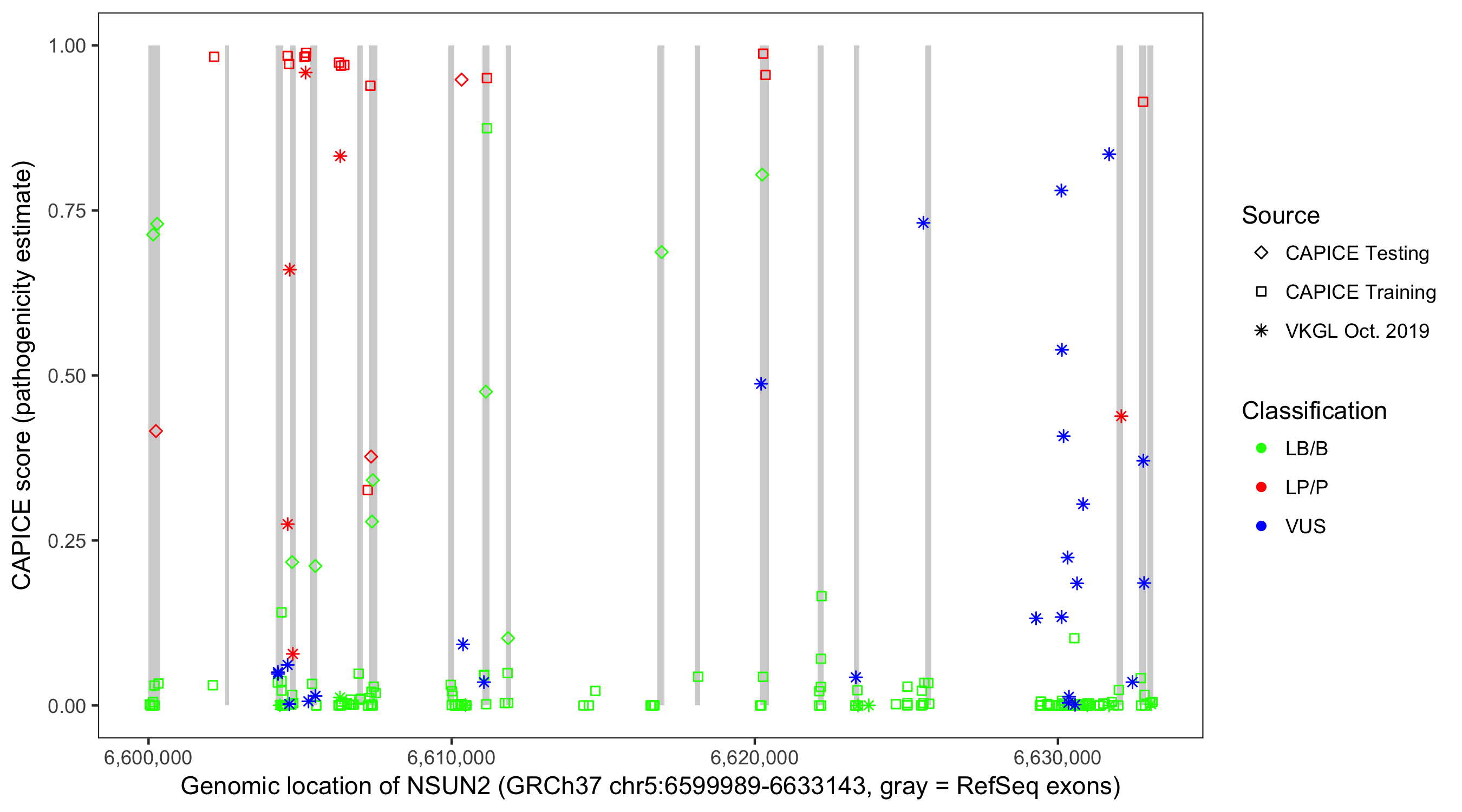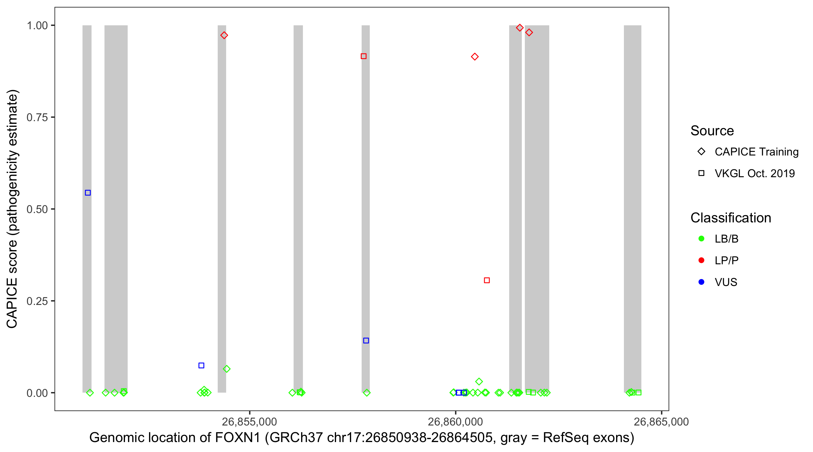 Shown are CAPICE train/test variants plus VKGL Oct 2019.