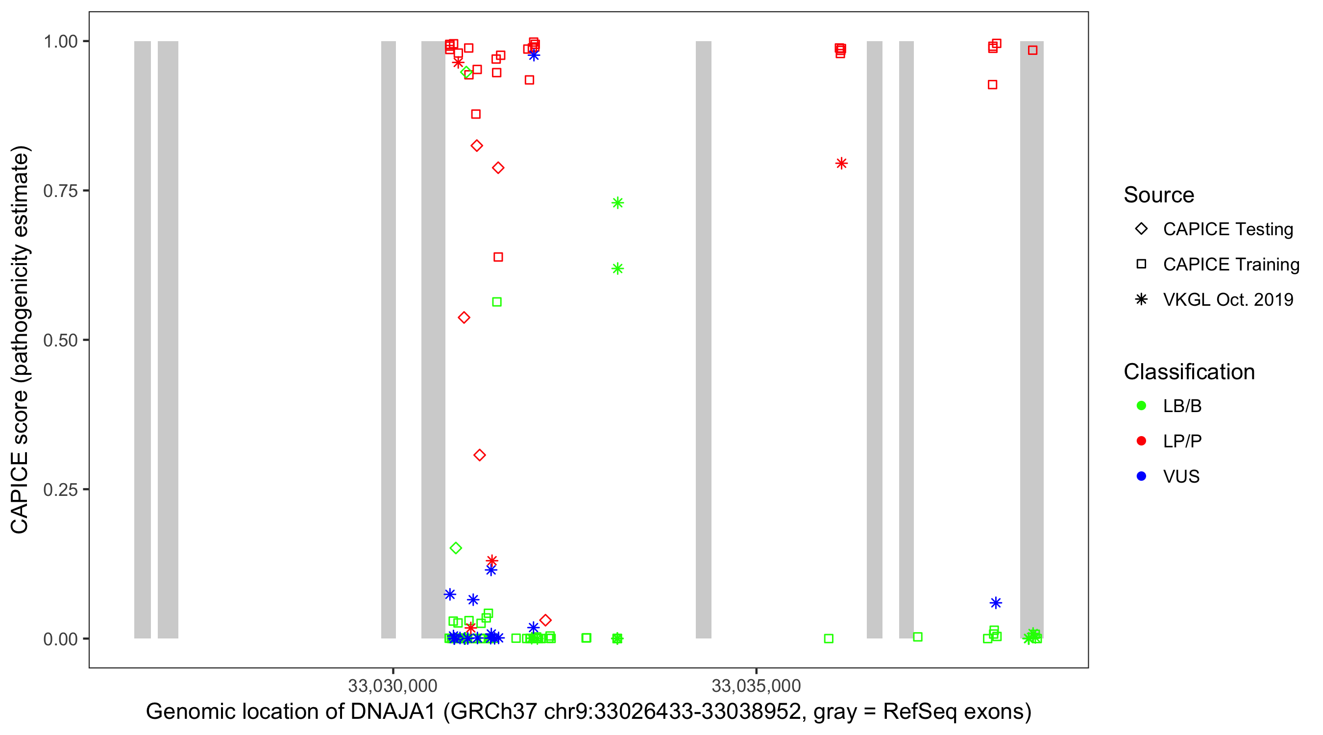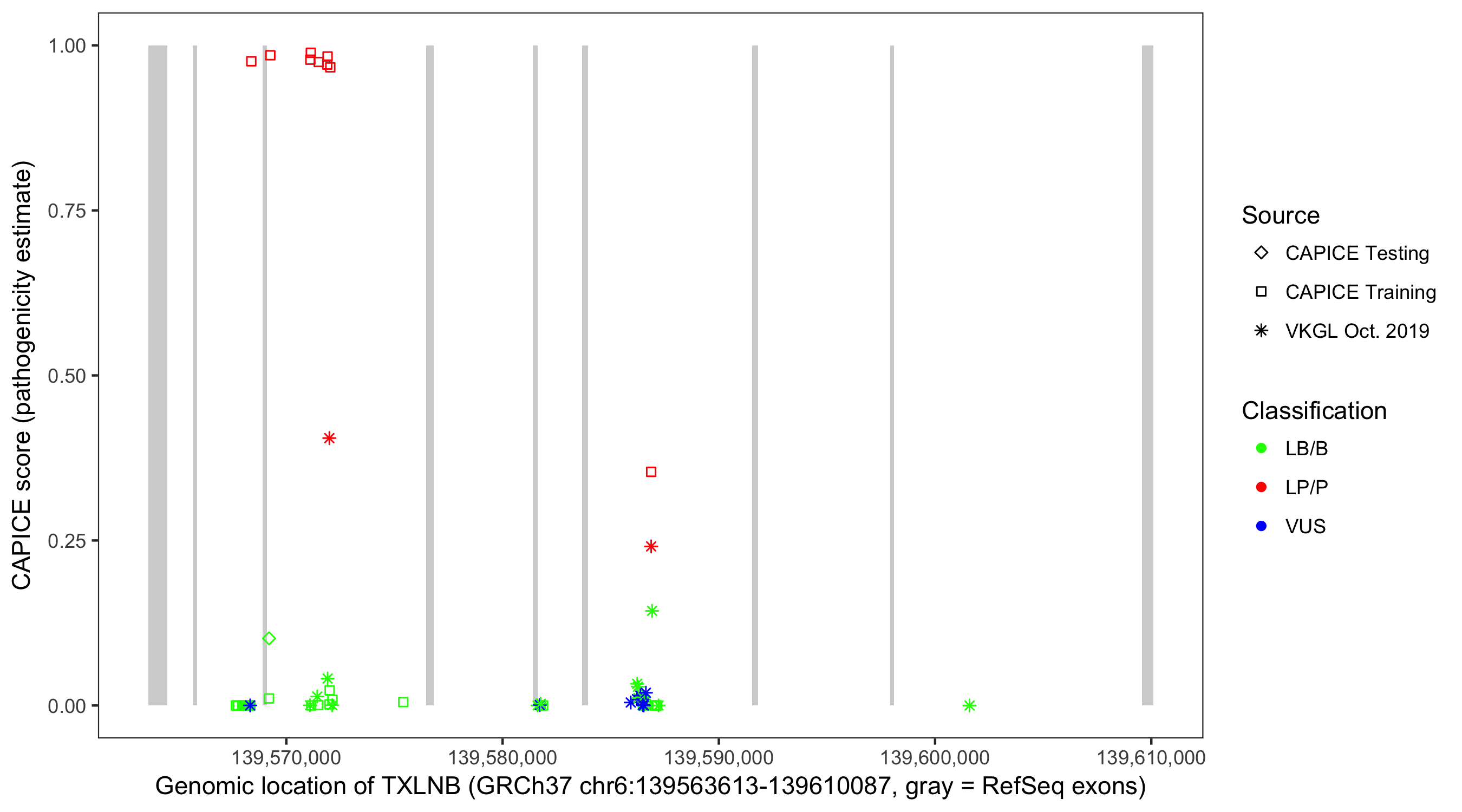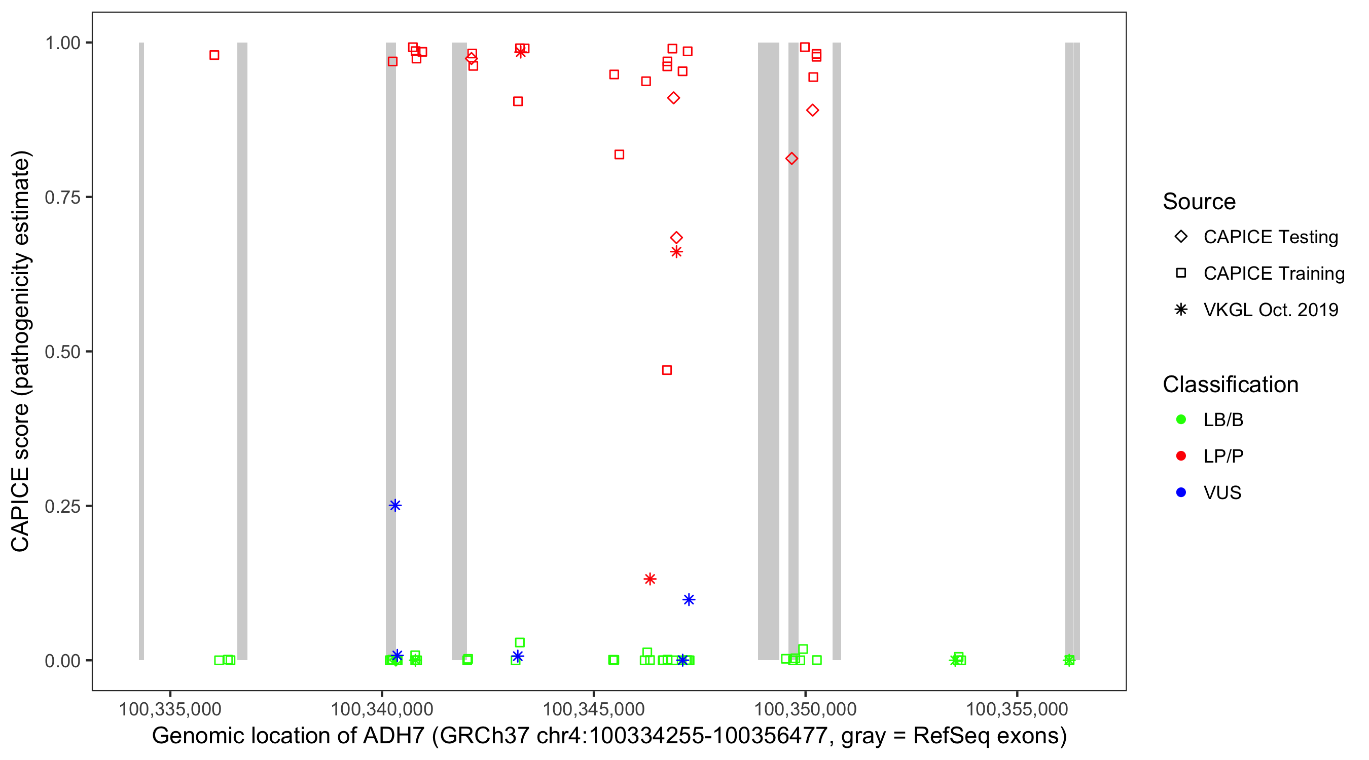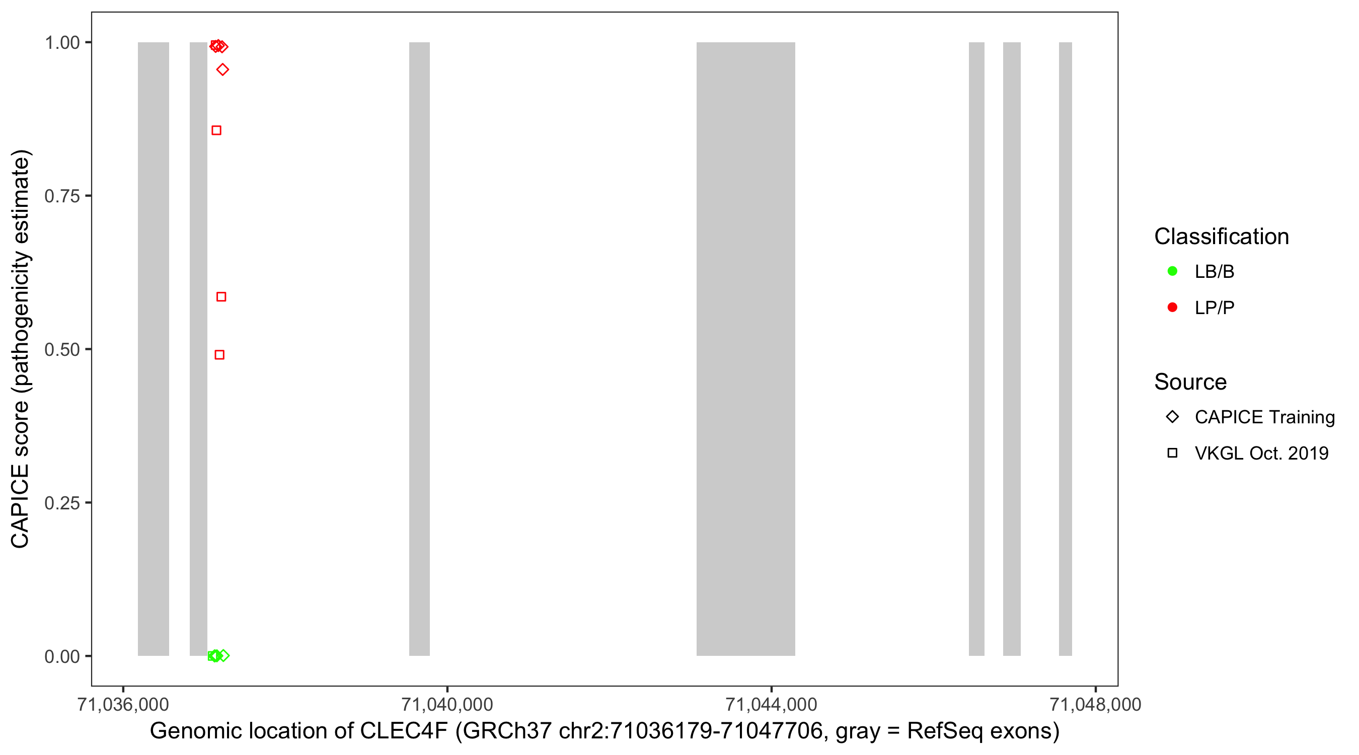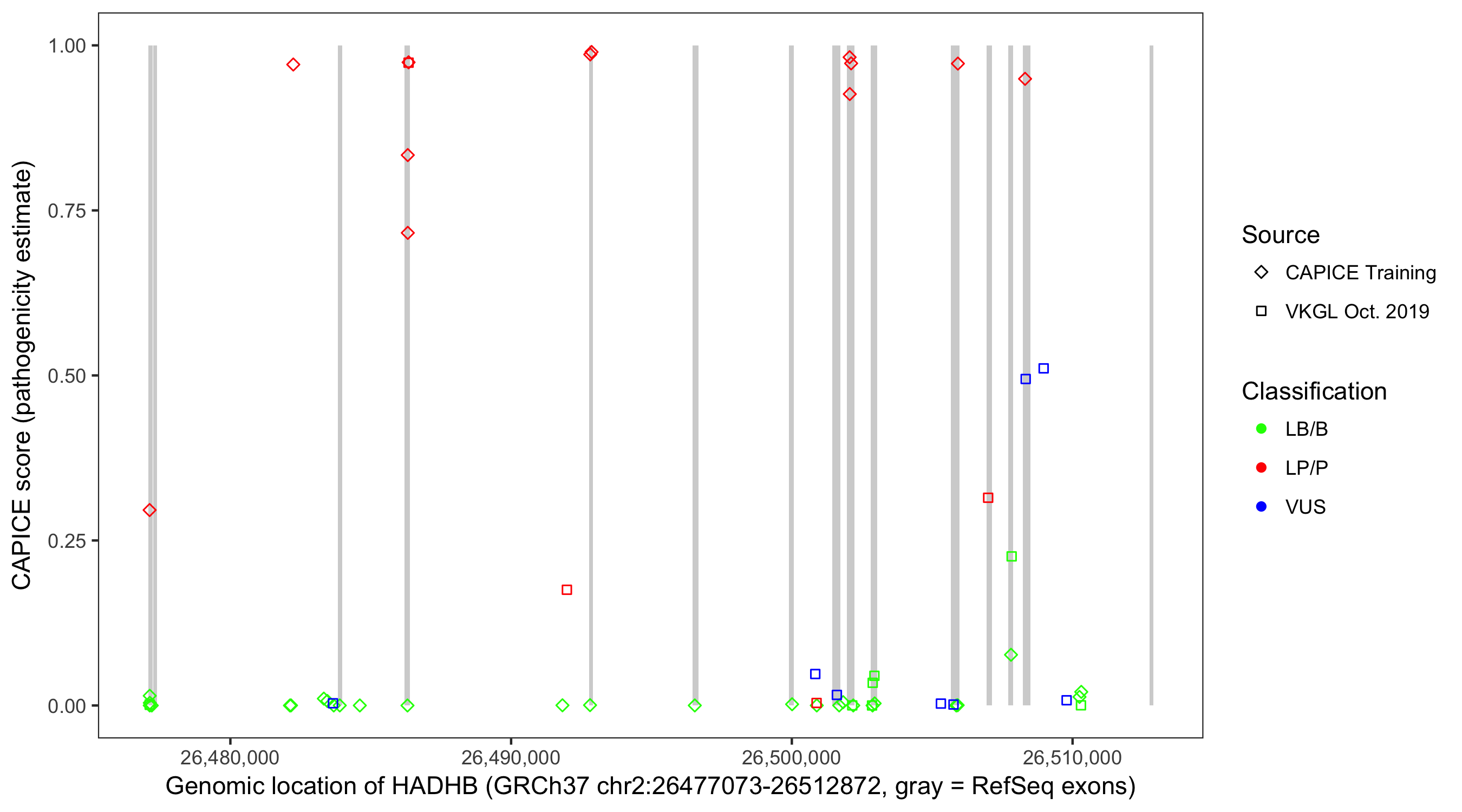 Shown are CAPICE train/test variants plus VKGL Oct 2019.