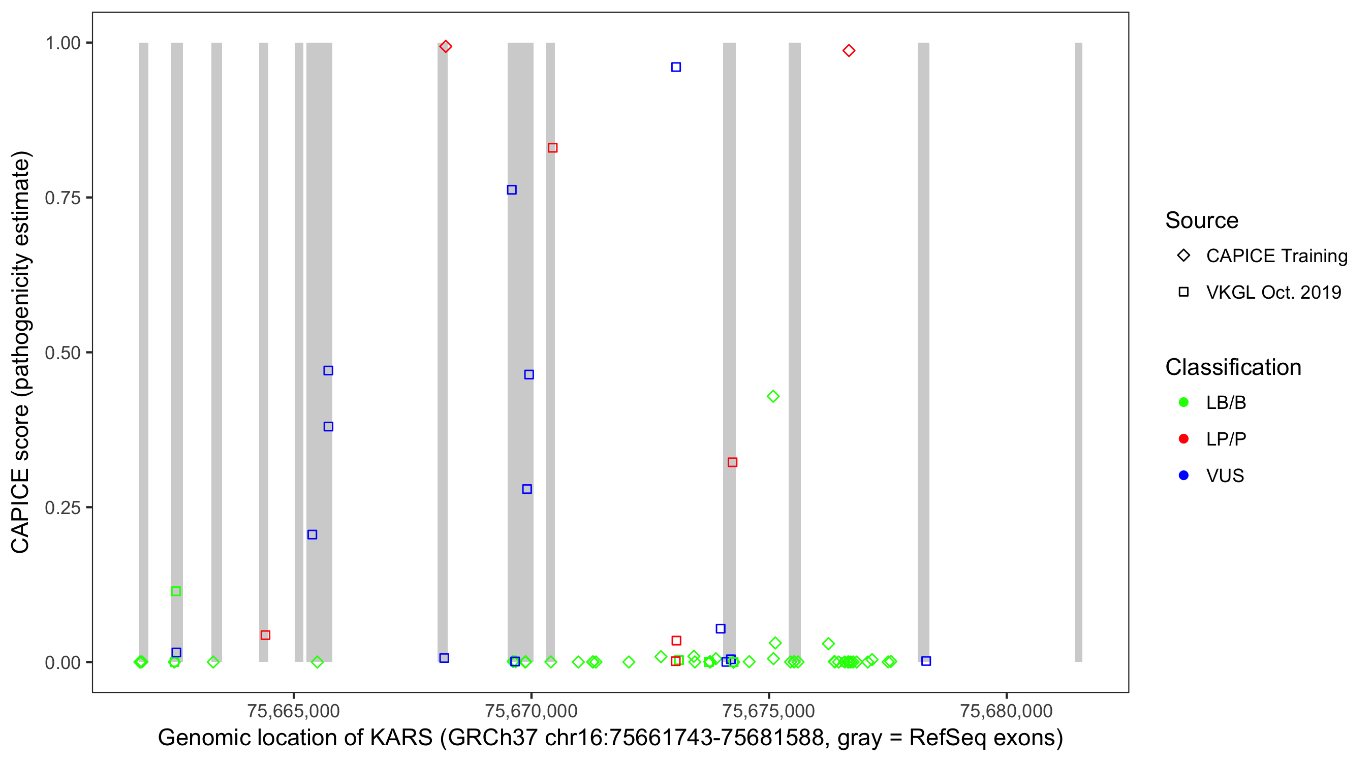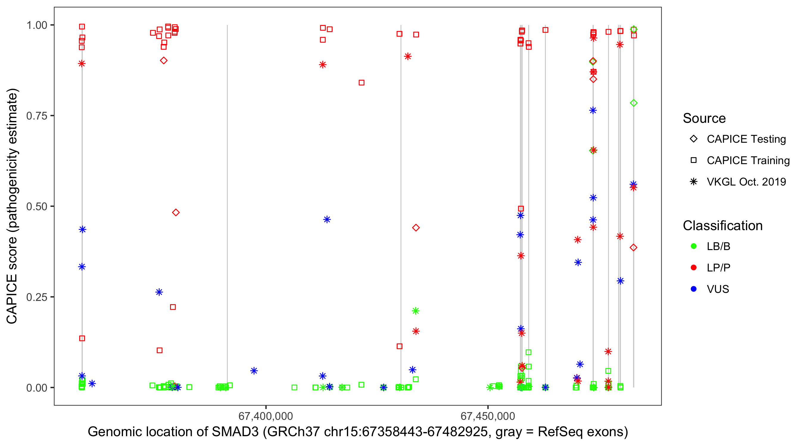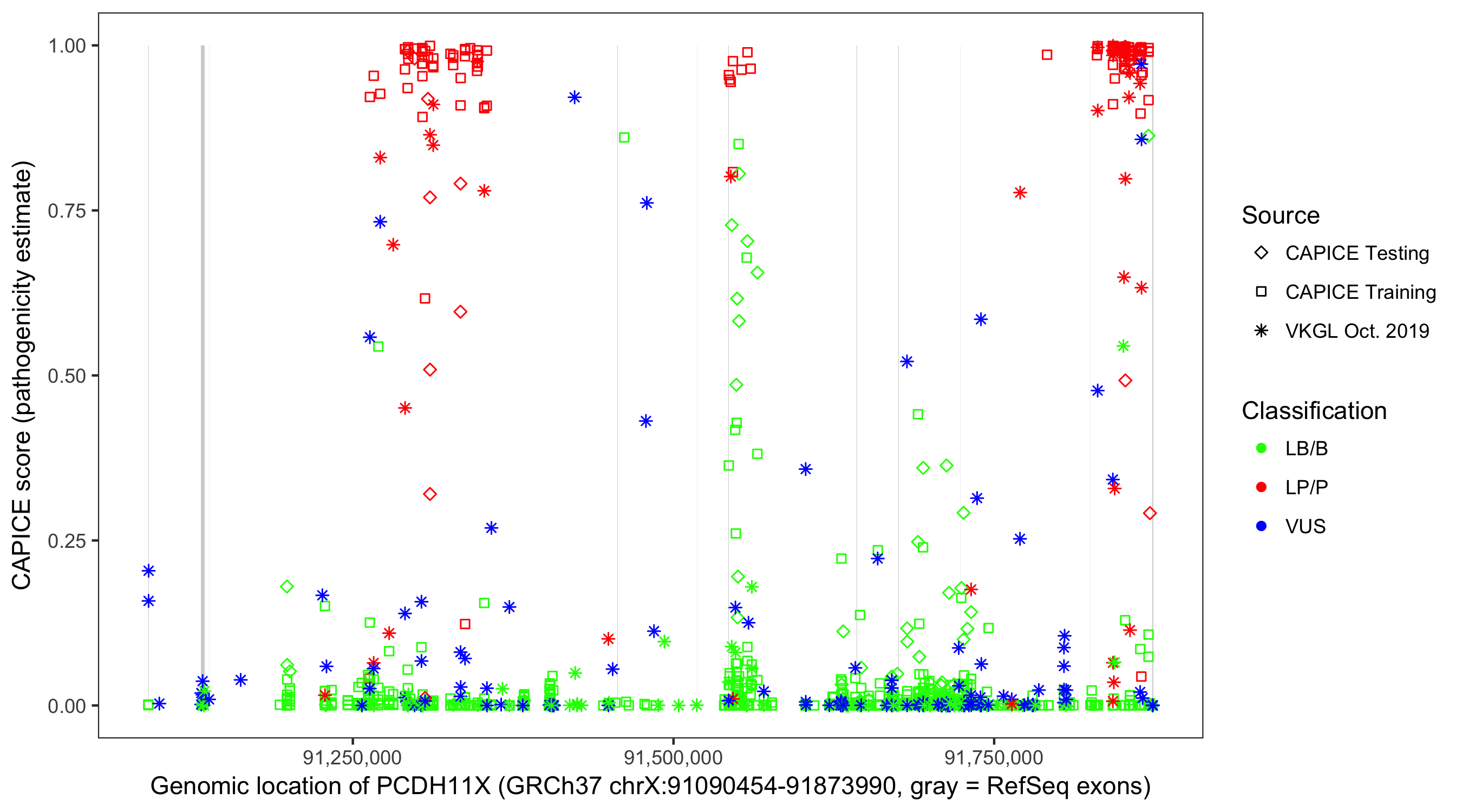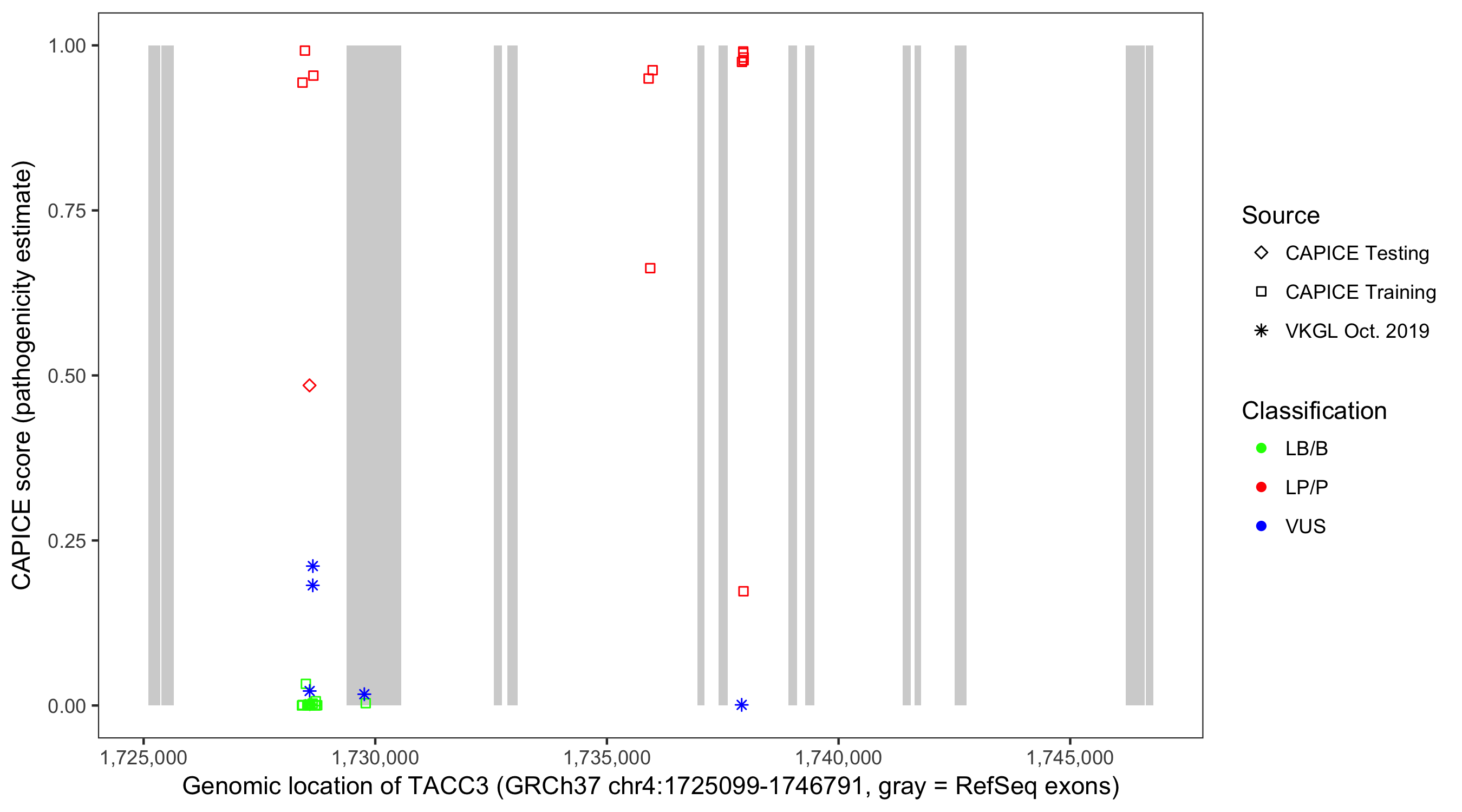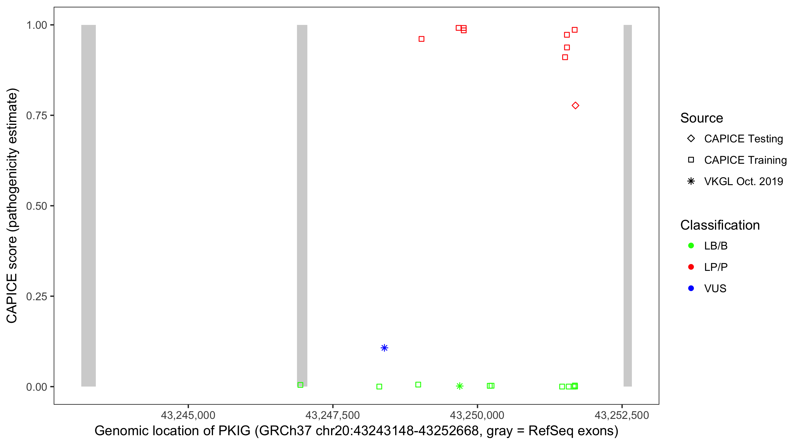 Shown are CAPICE train/test variants plus VKGL Oct 2019.