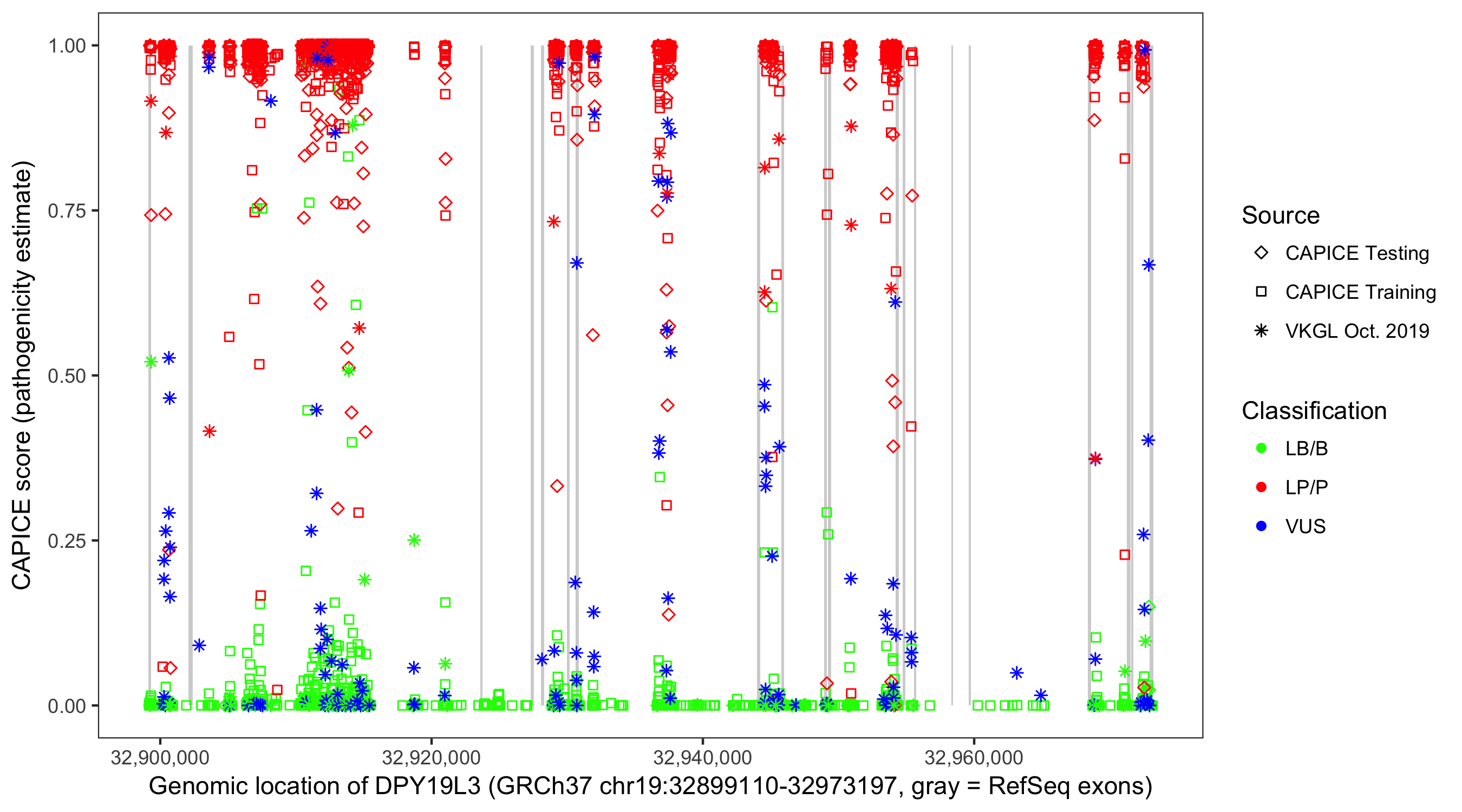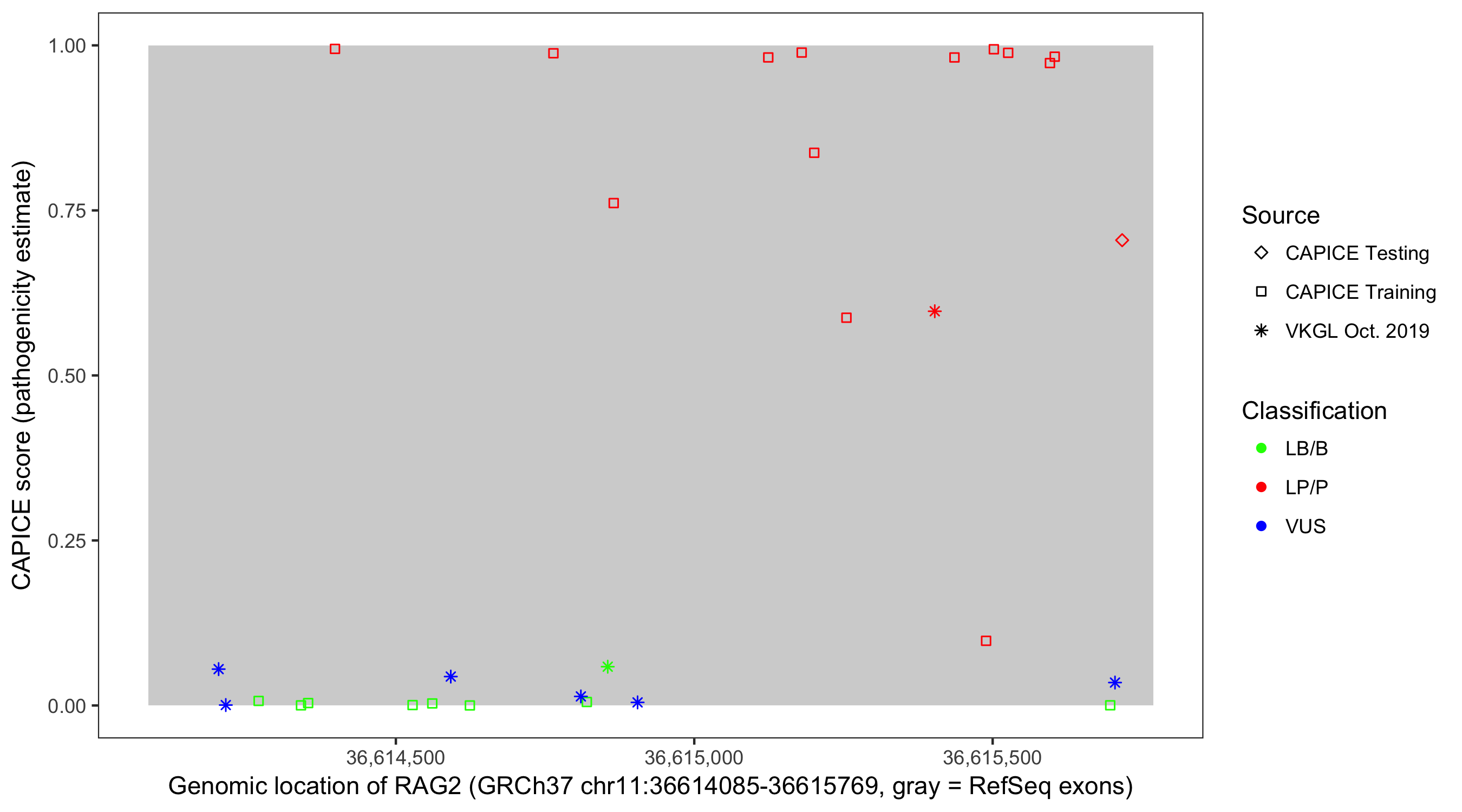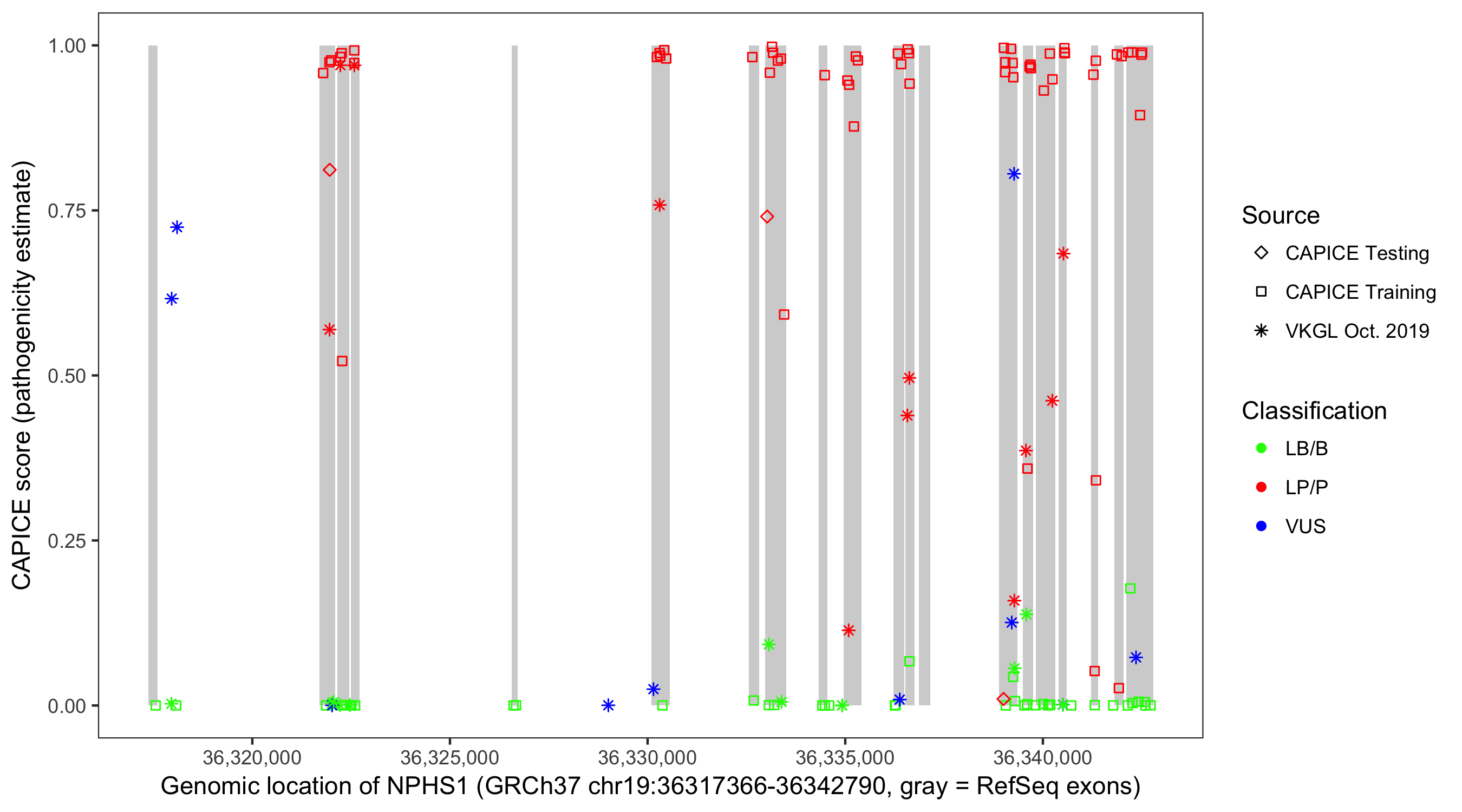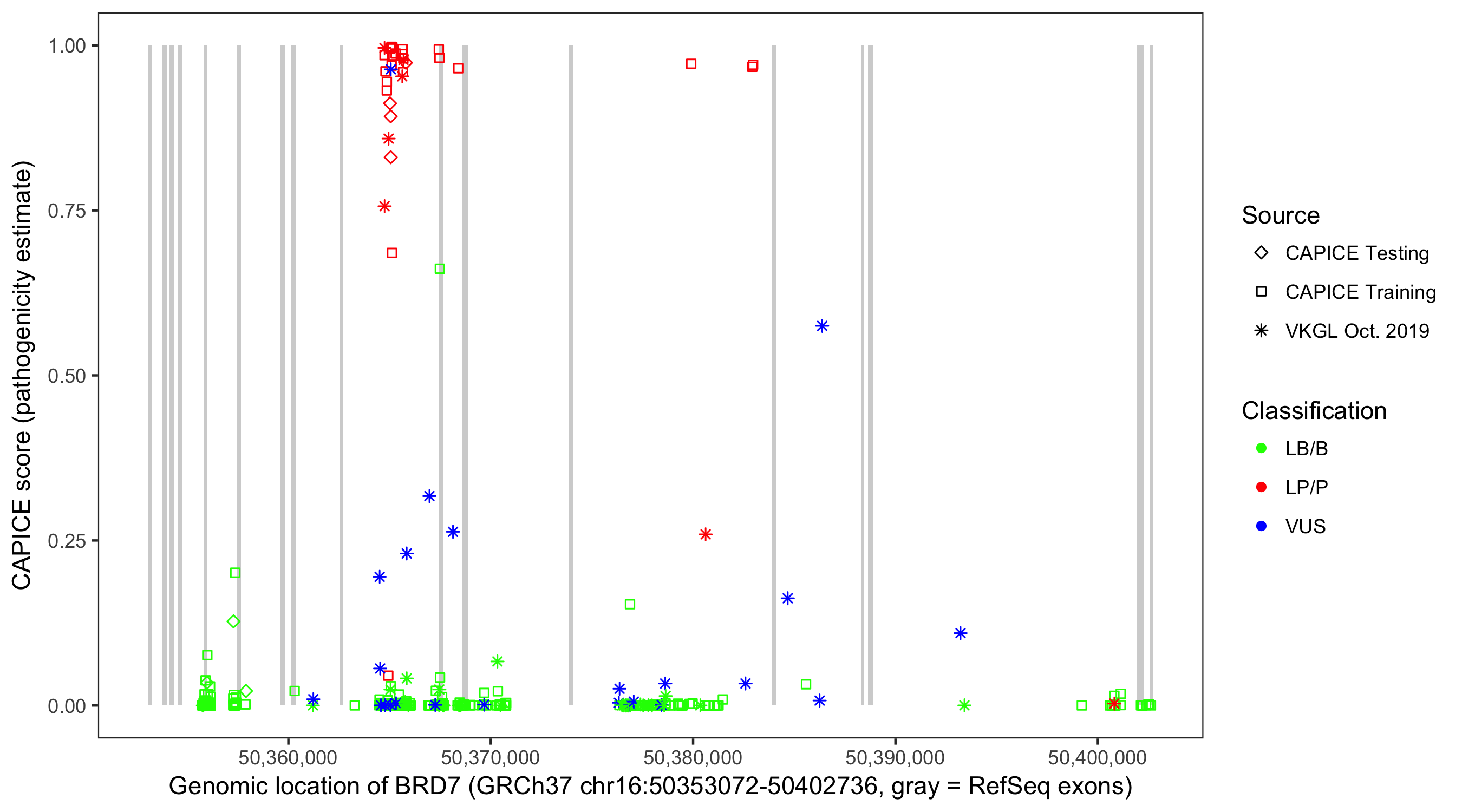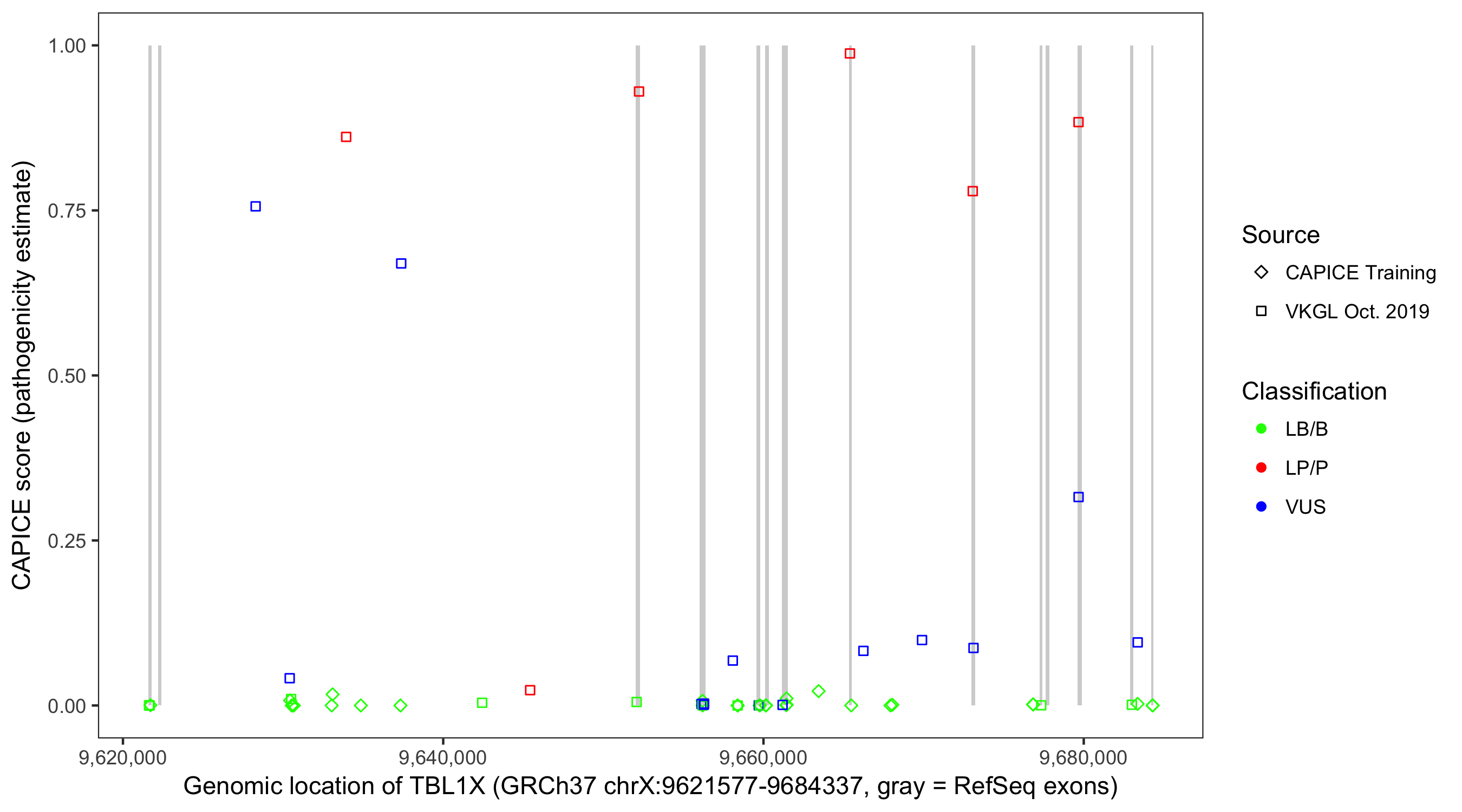 Shown are CAPICE train/test variants plus VKGL Oct 2019.