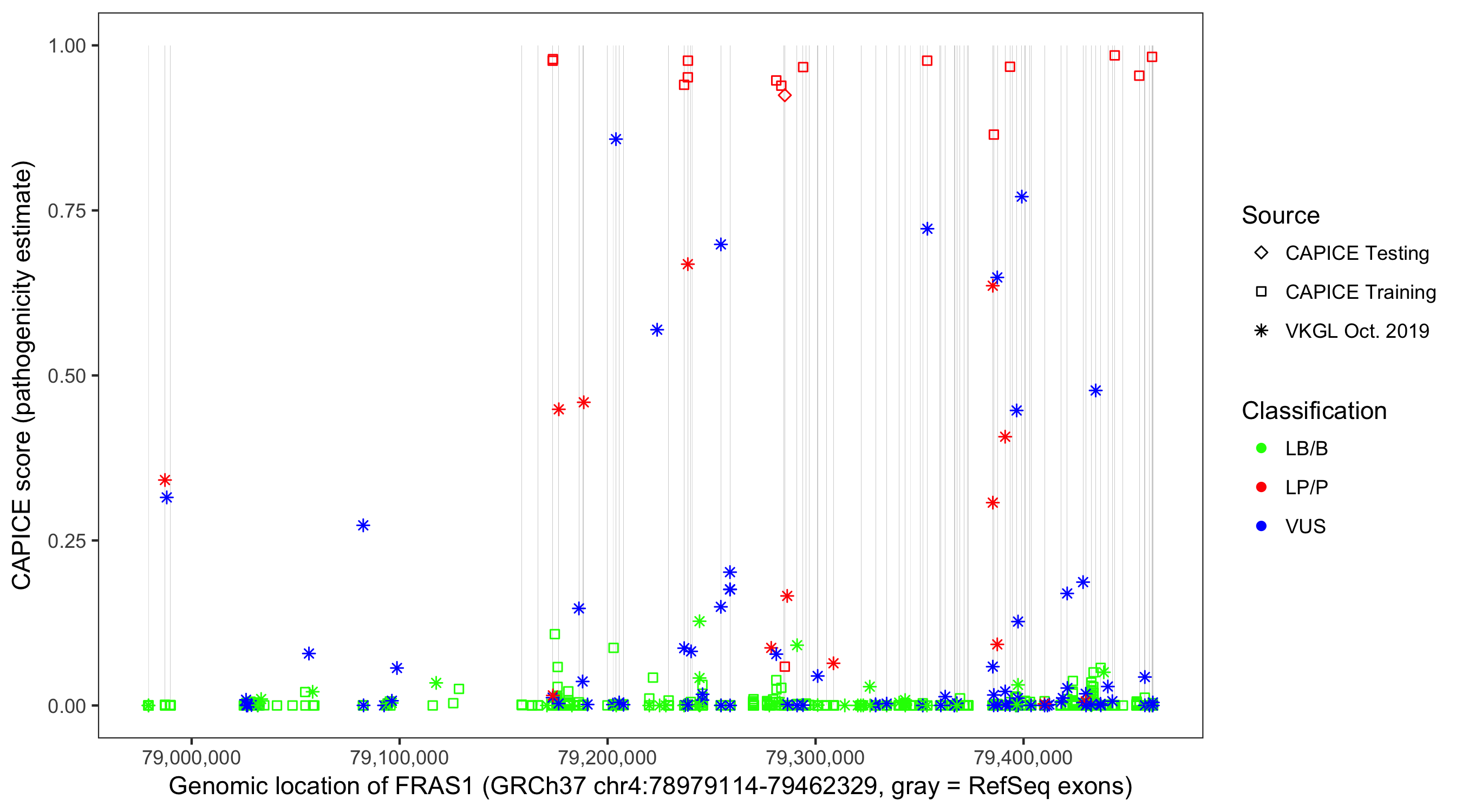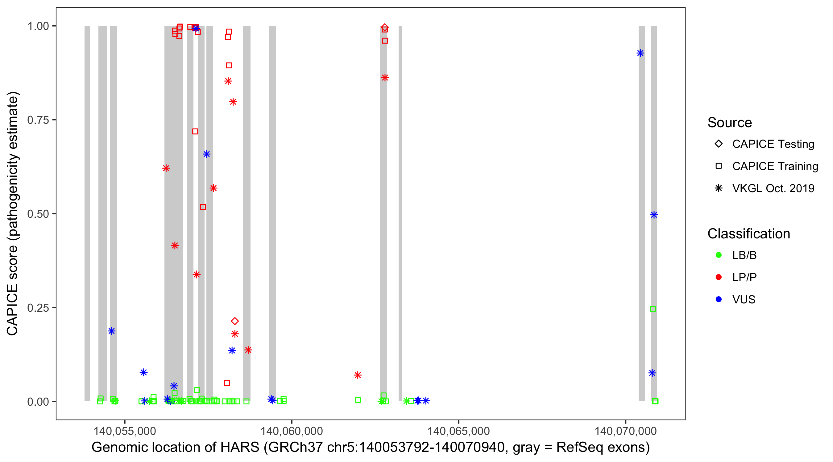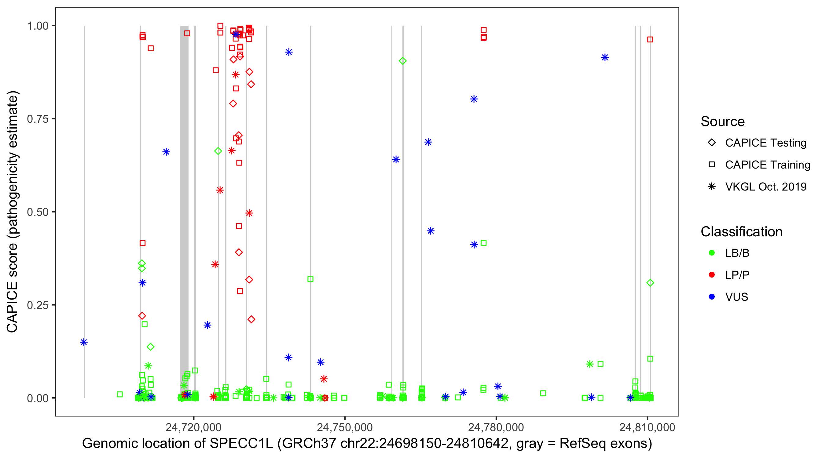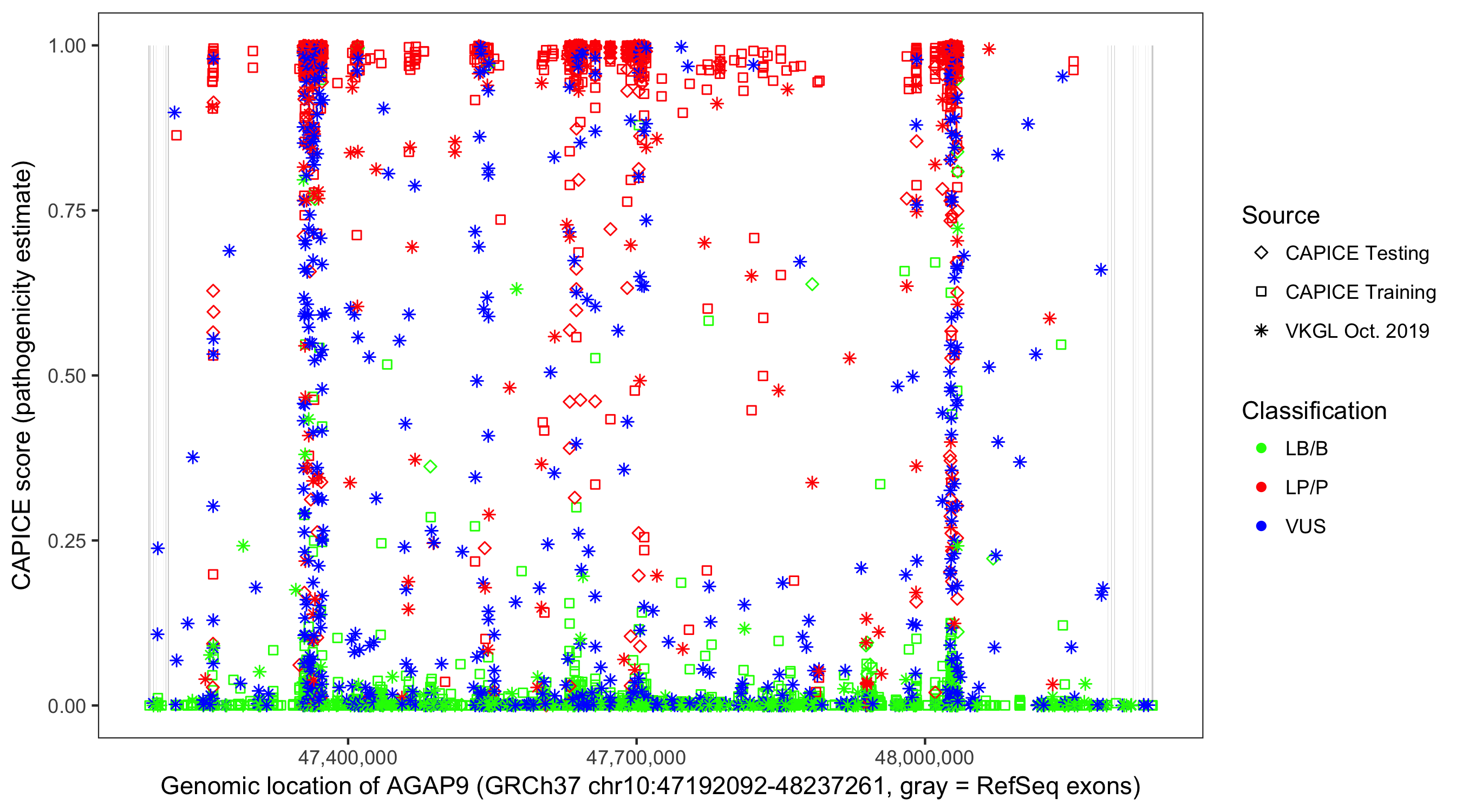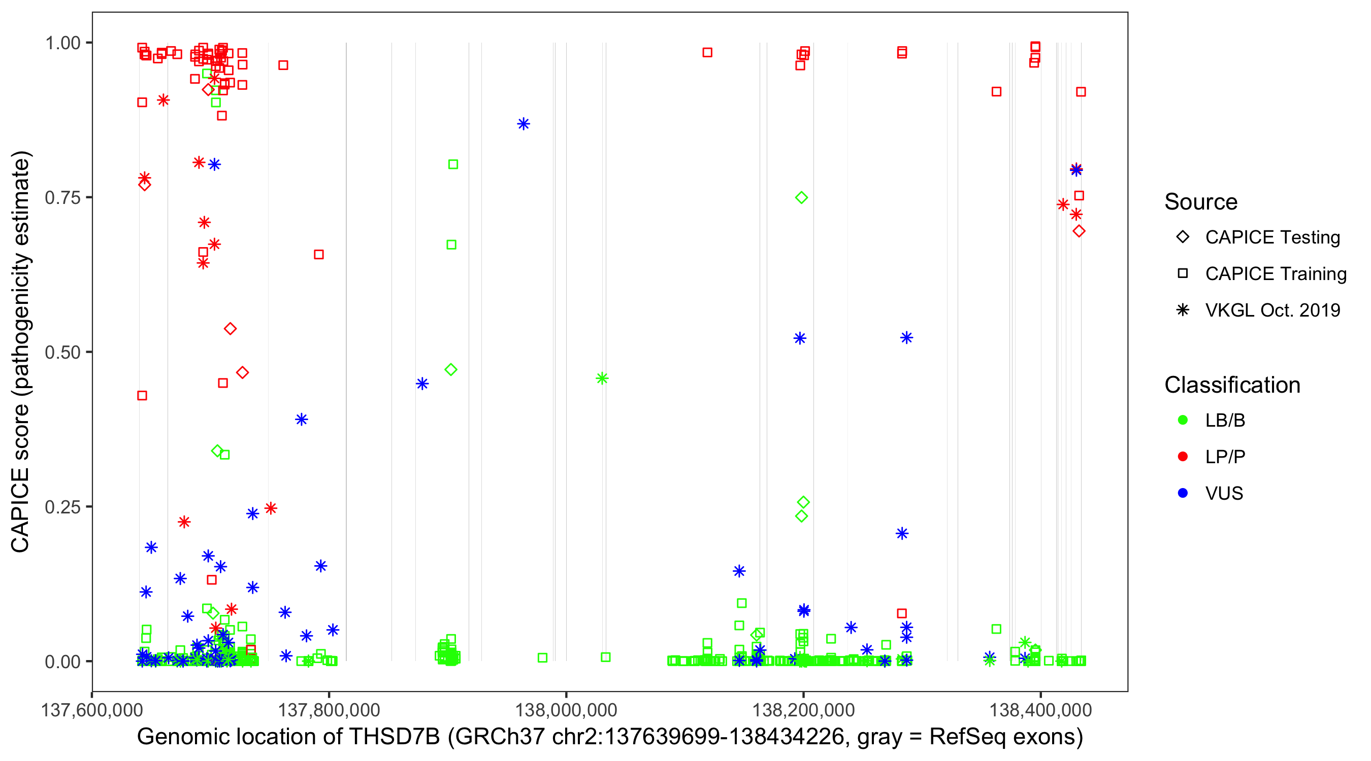Shown are CAPICE train/test variants plus VKGL Oct 2019.