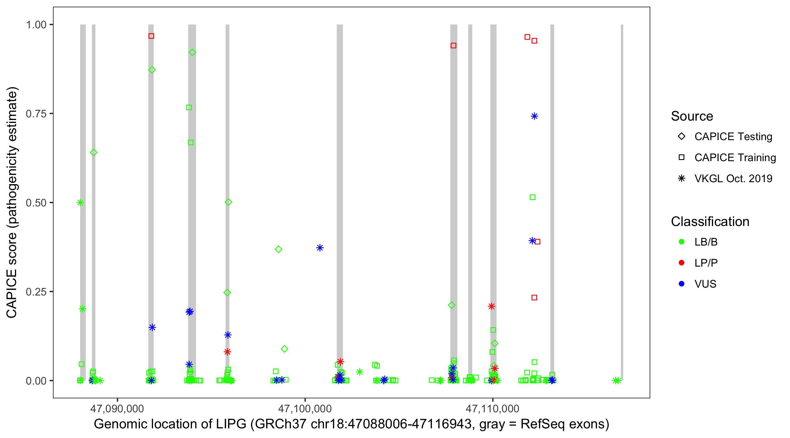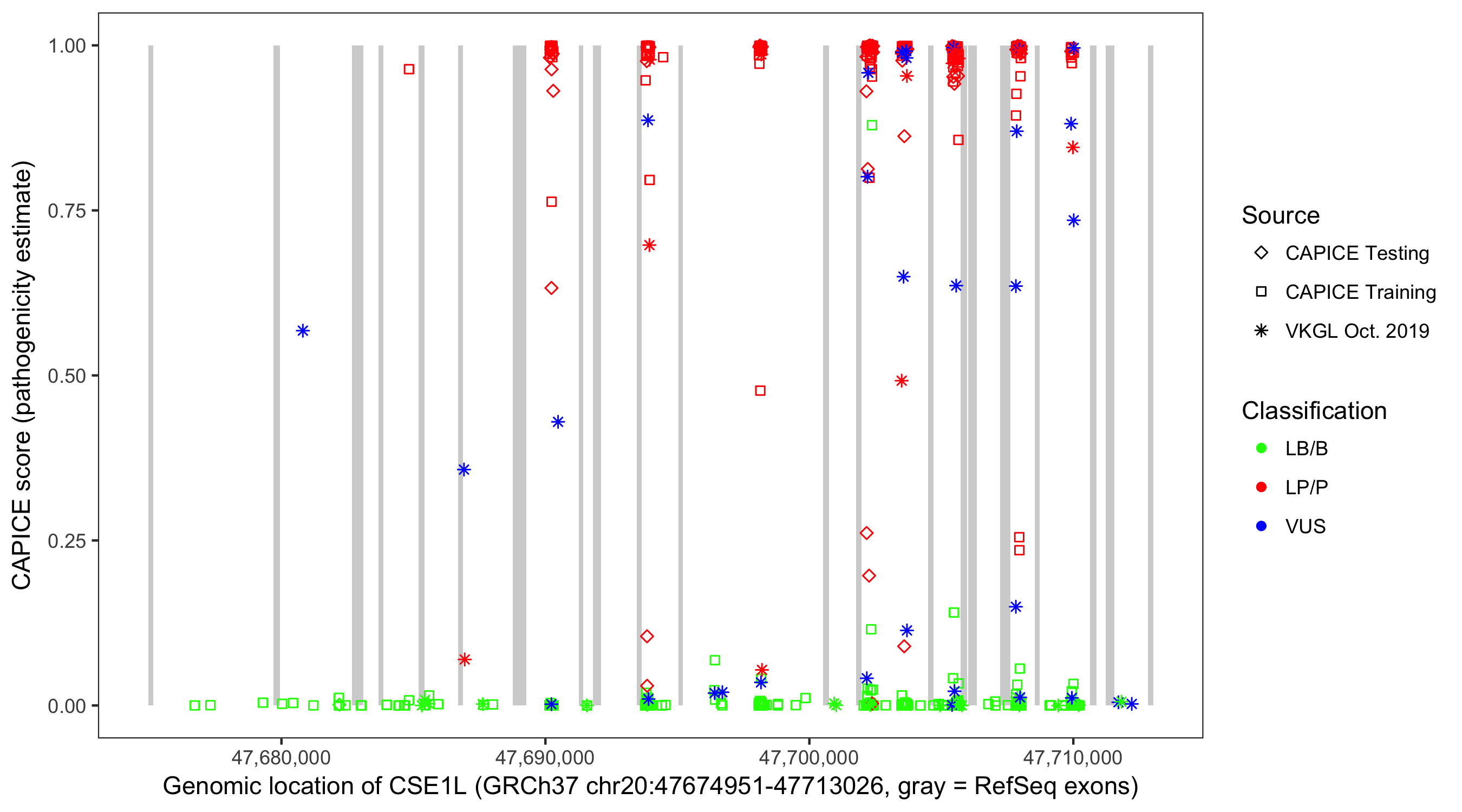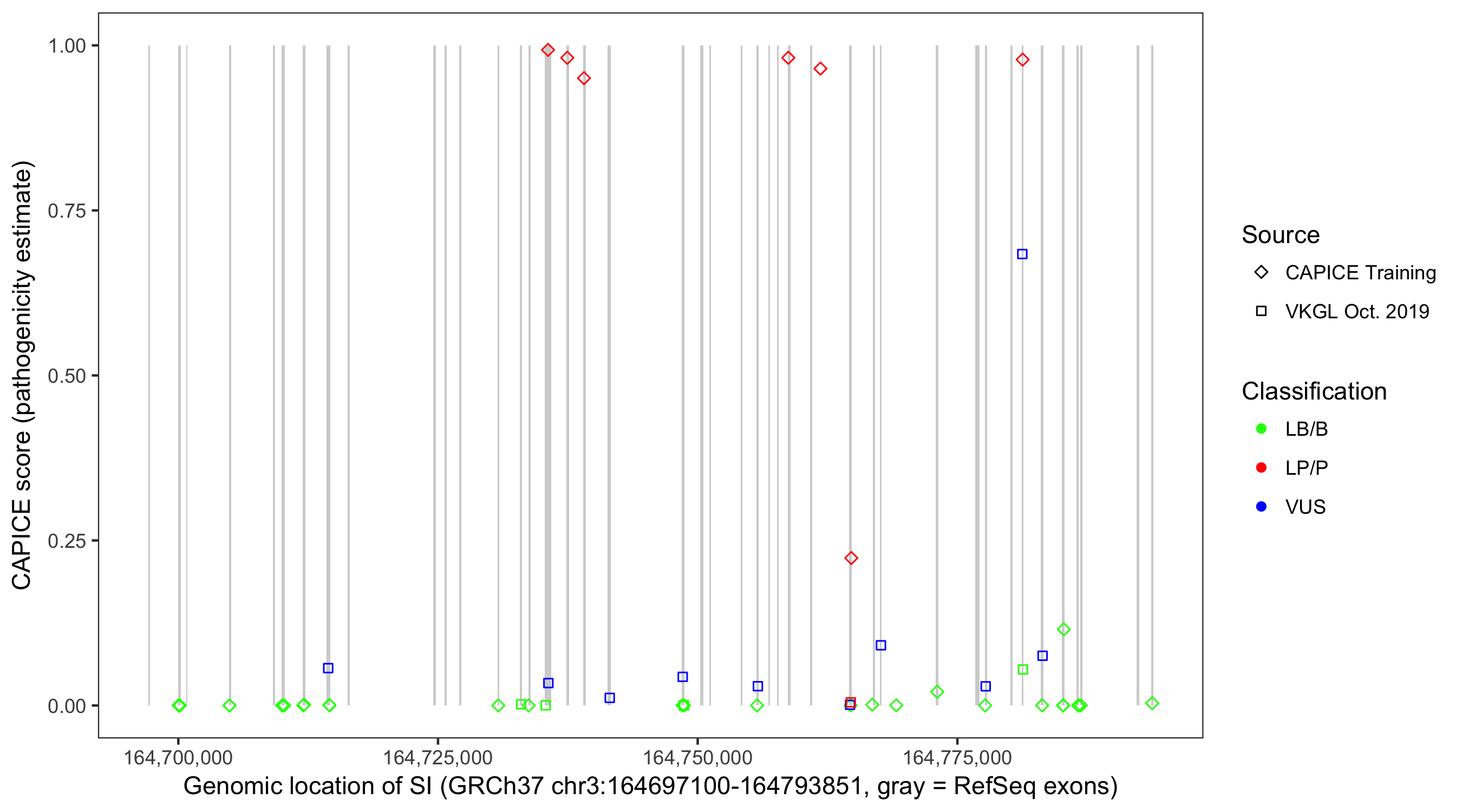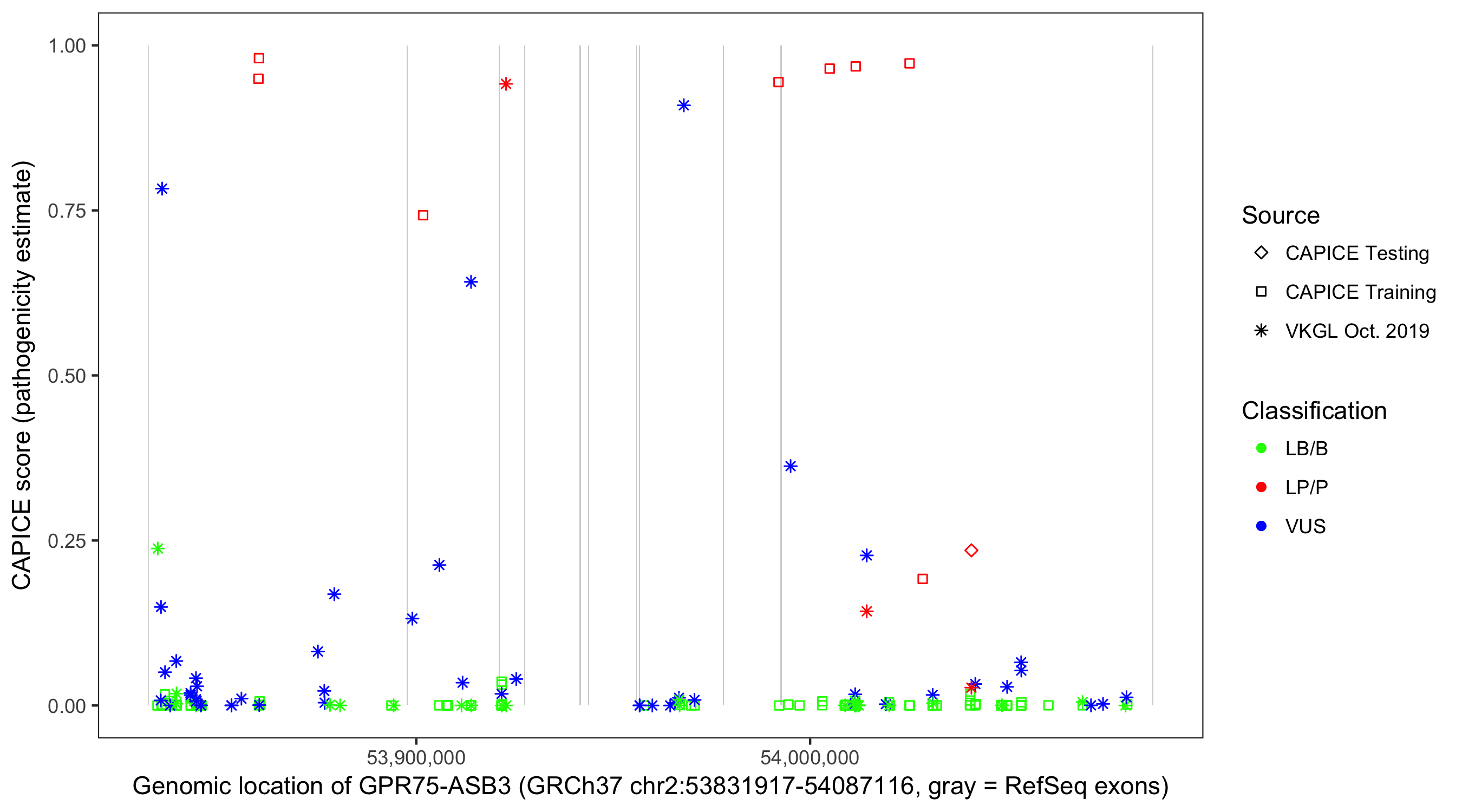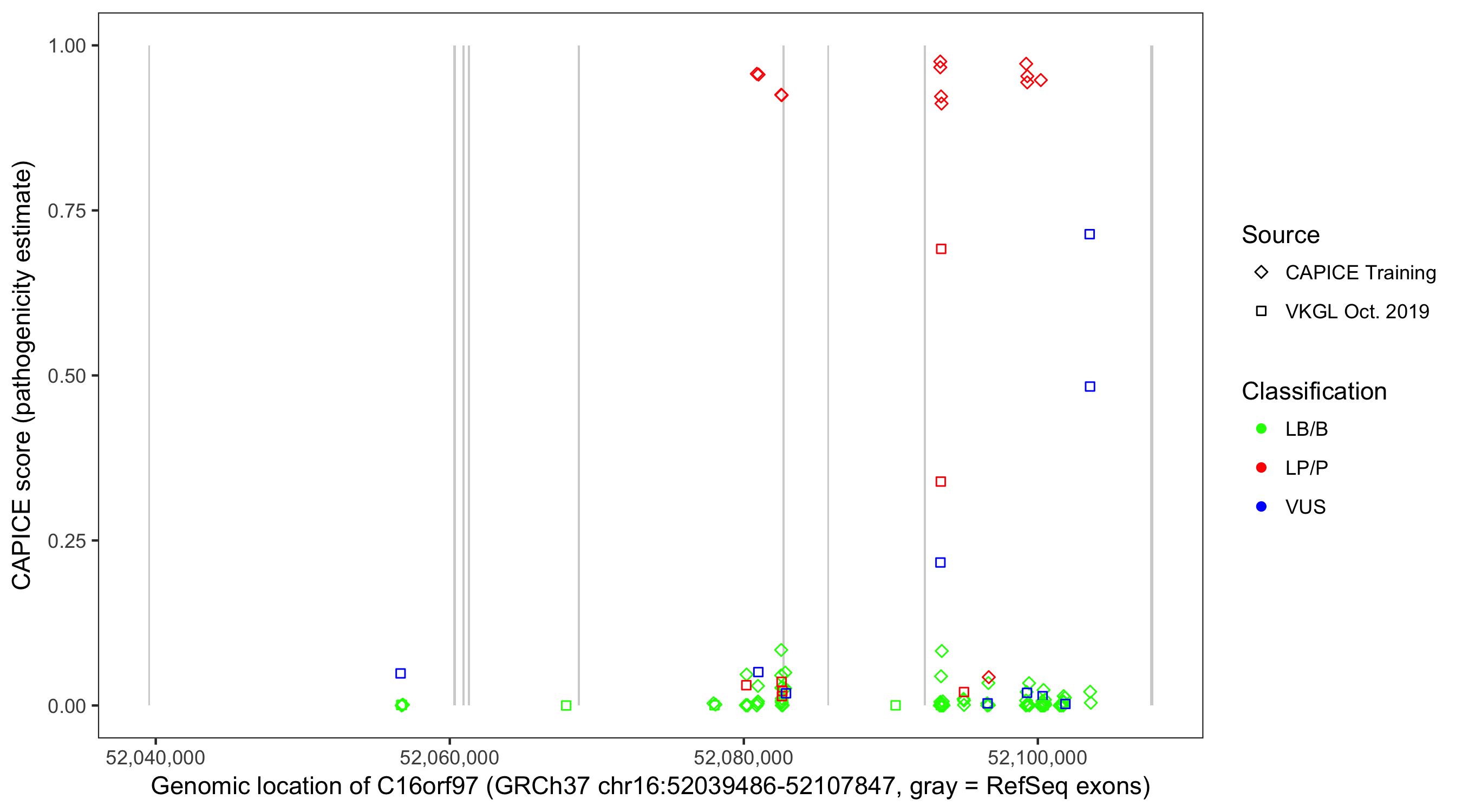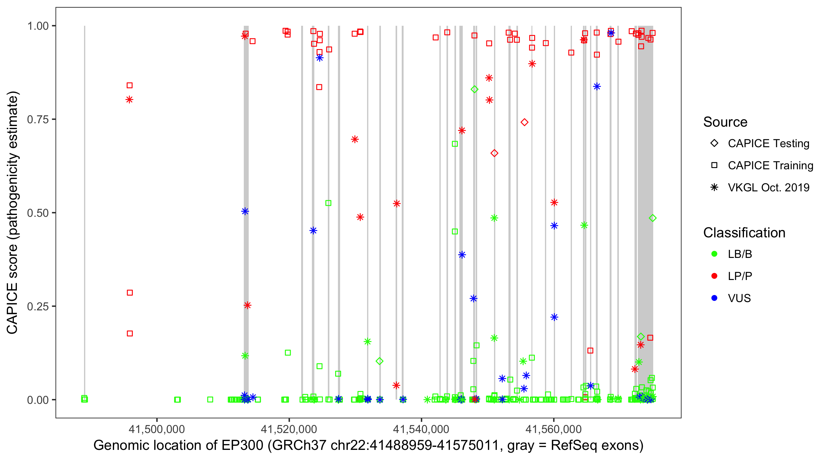 Shown are CAPICE train/test variants plus VKGL Oct 2019.