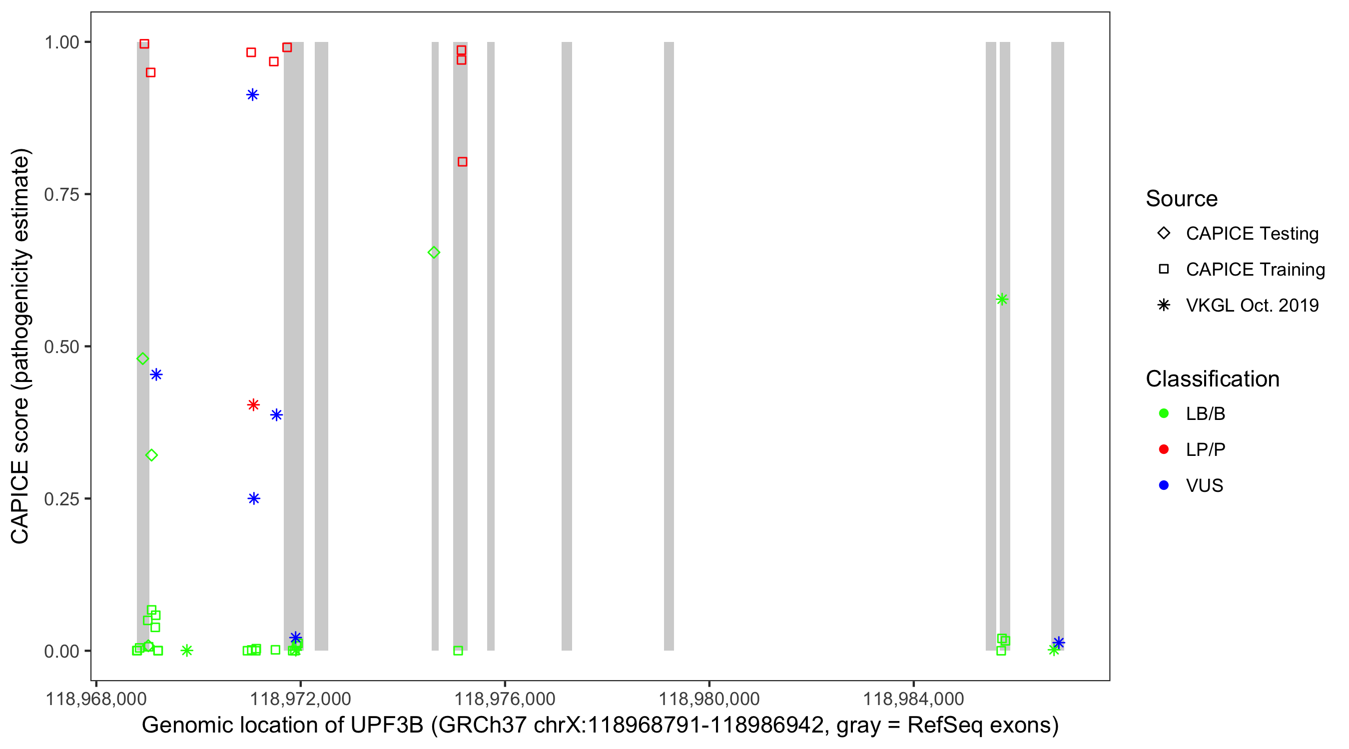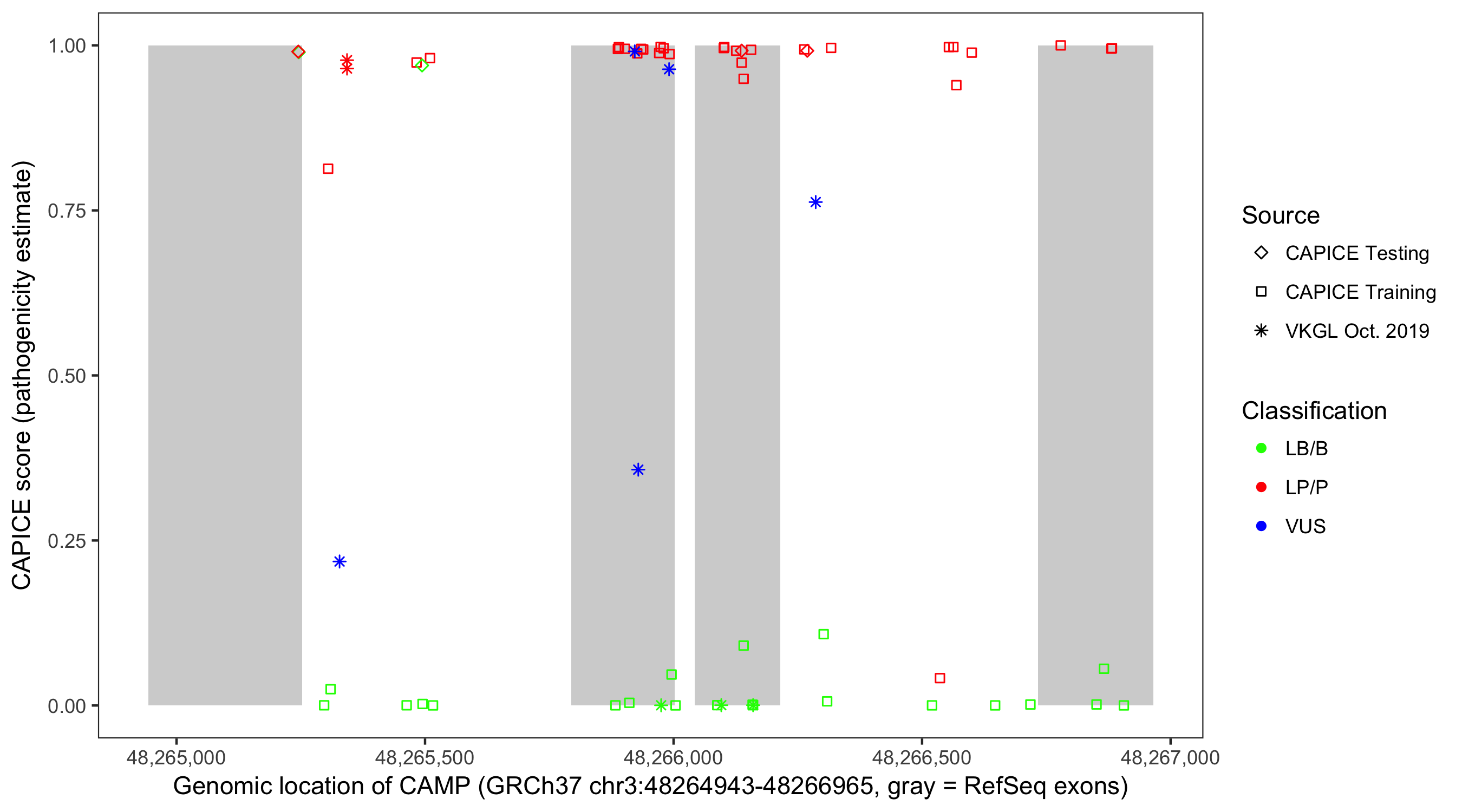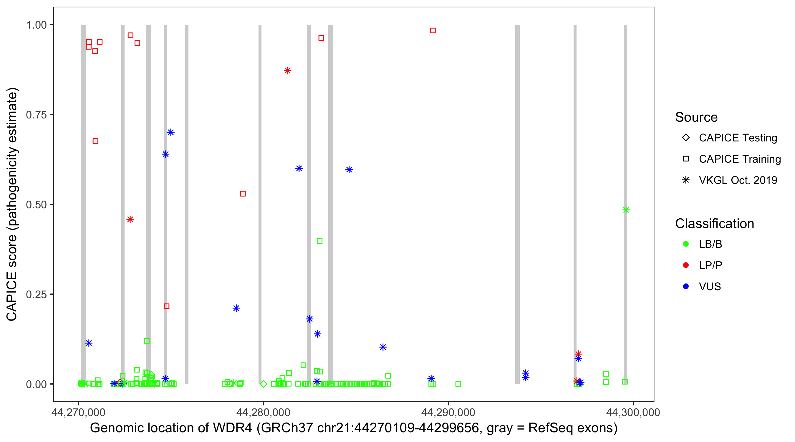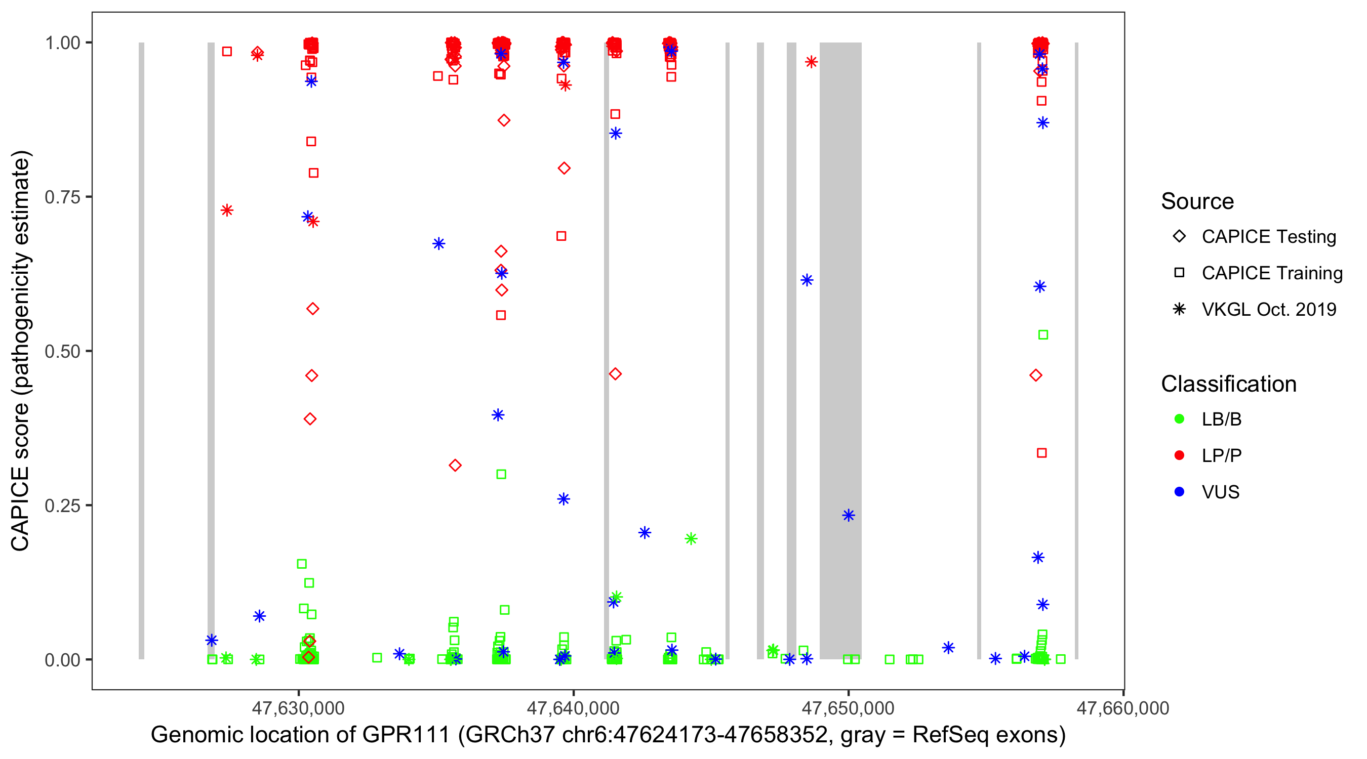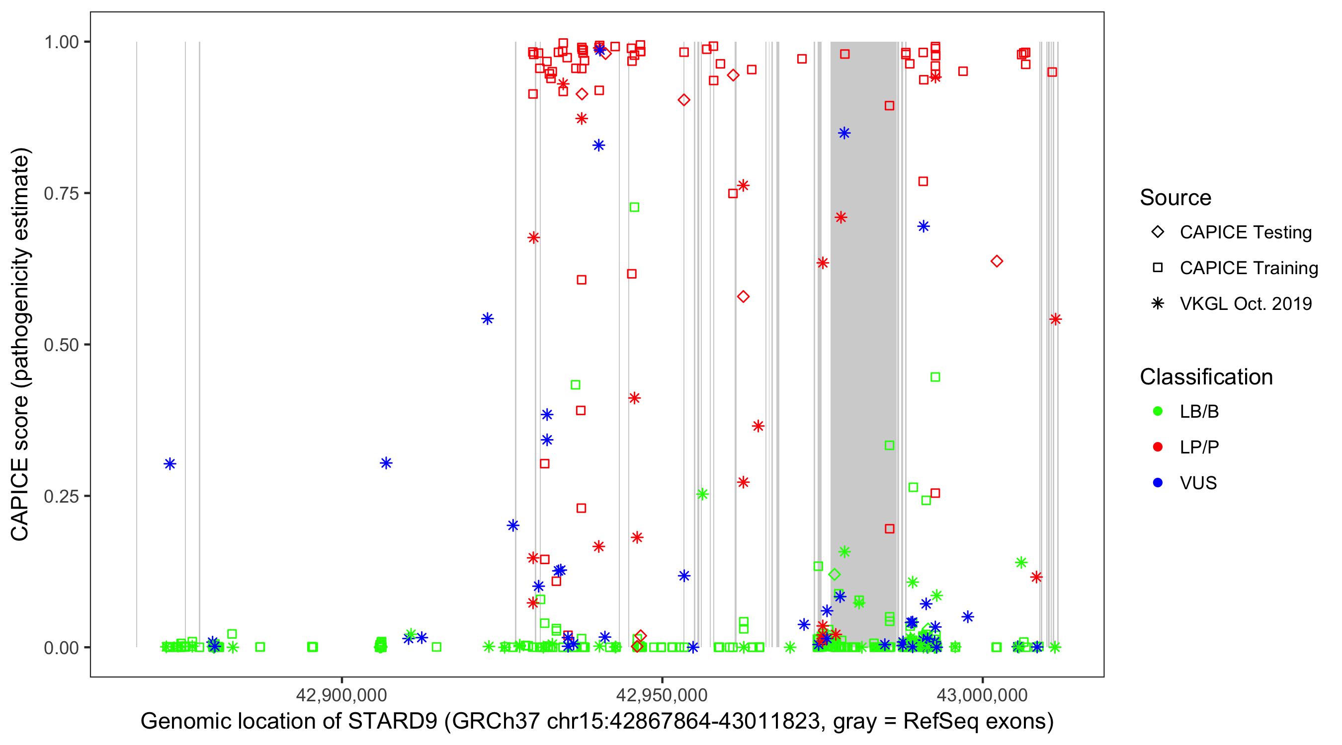 Shown are CAPICE train/test variants plus VKGL Oct 2019.