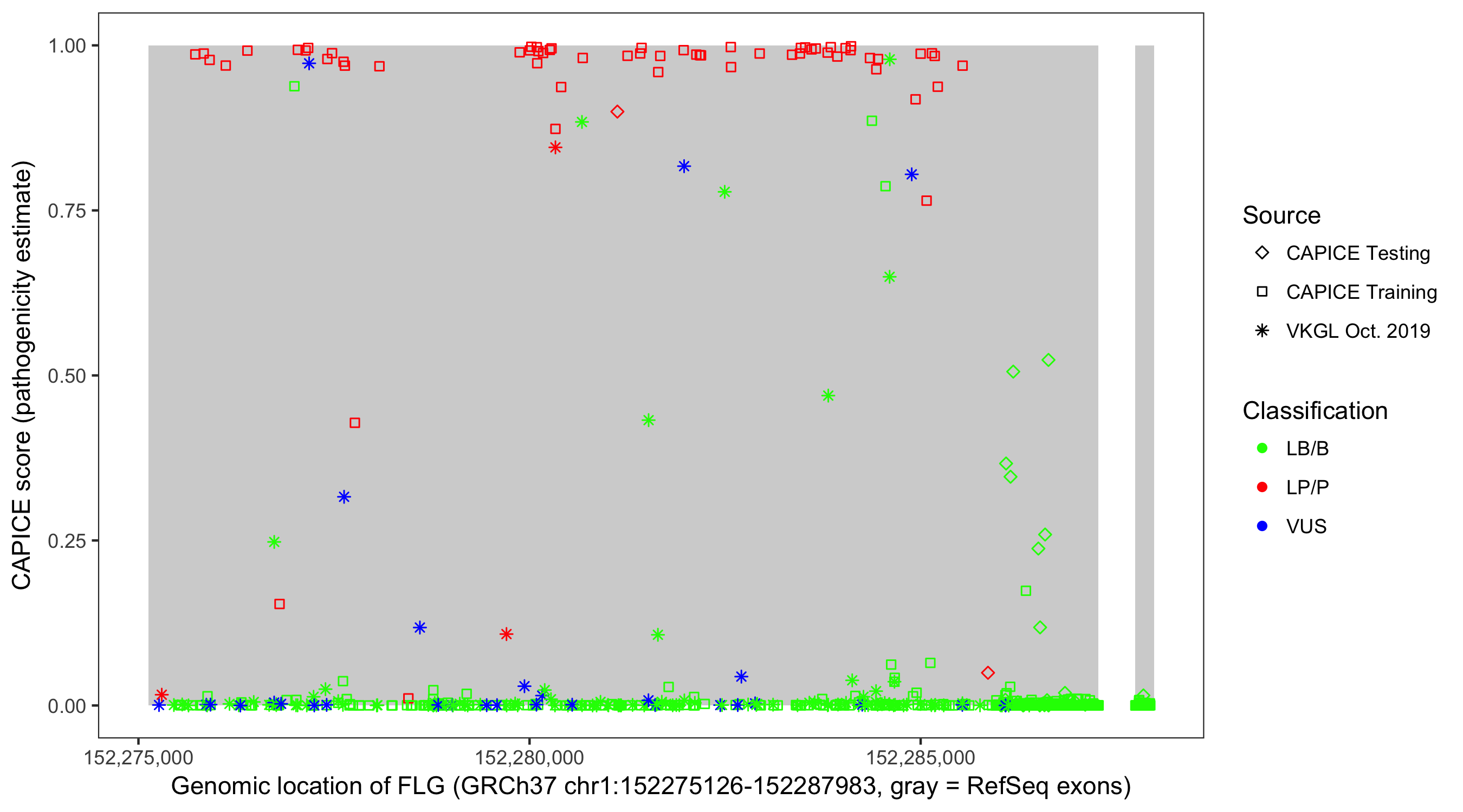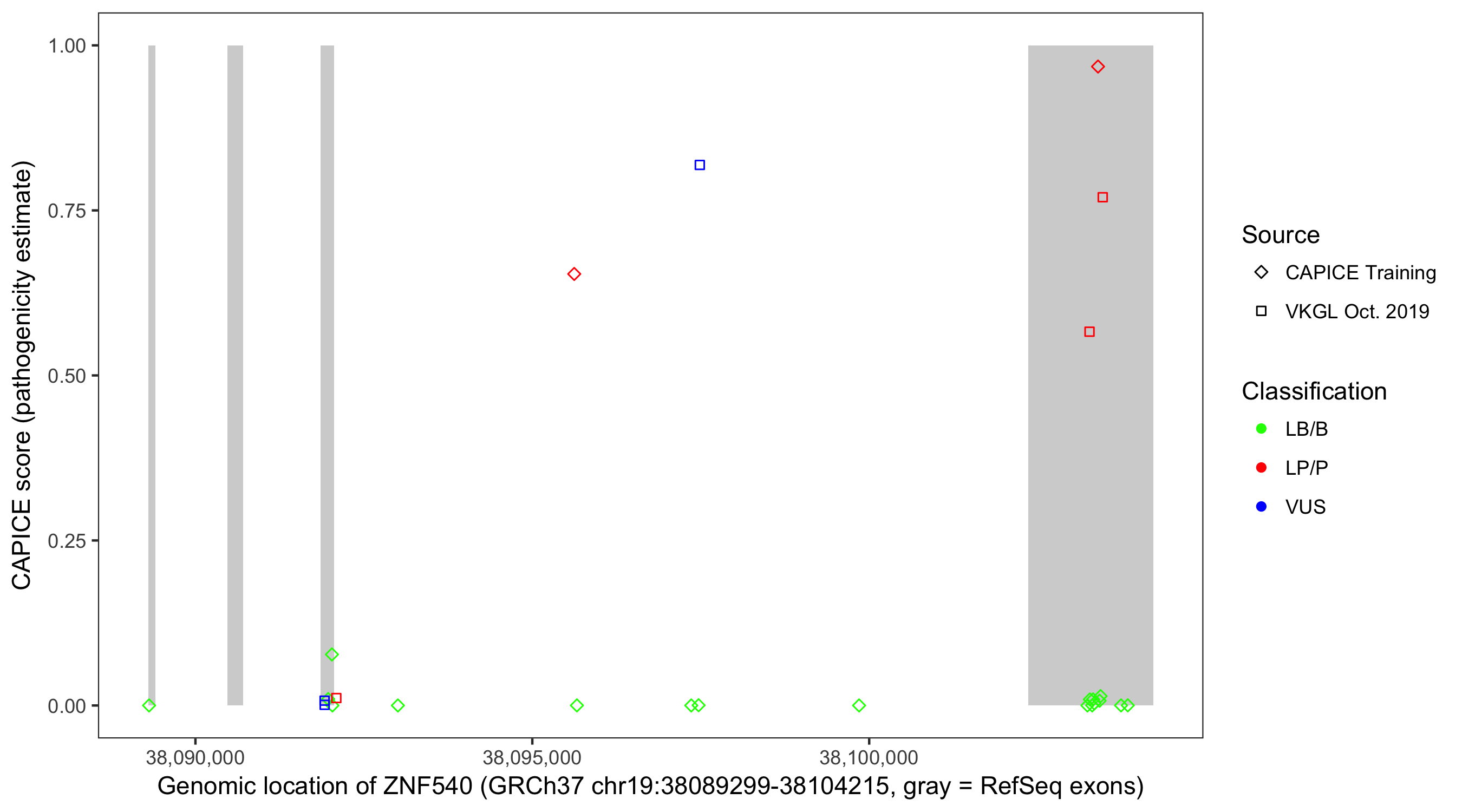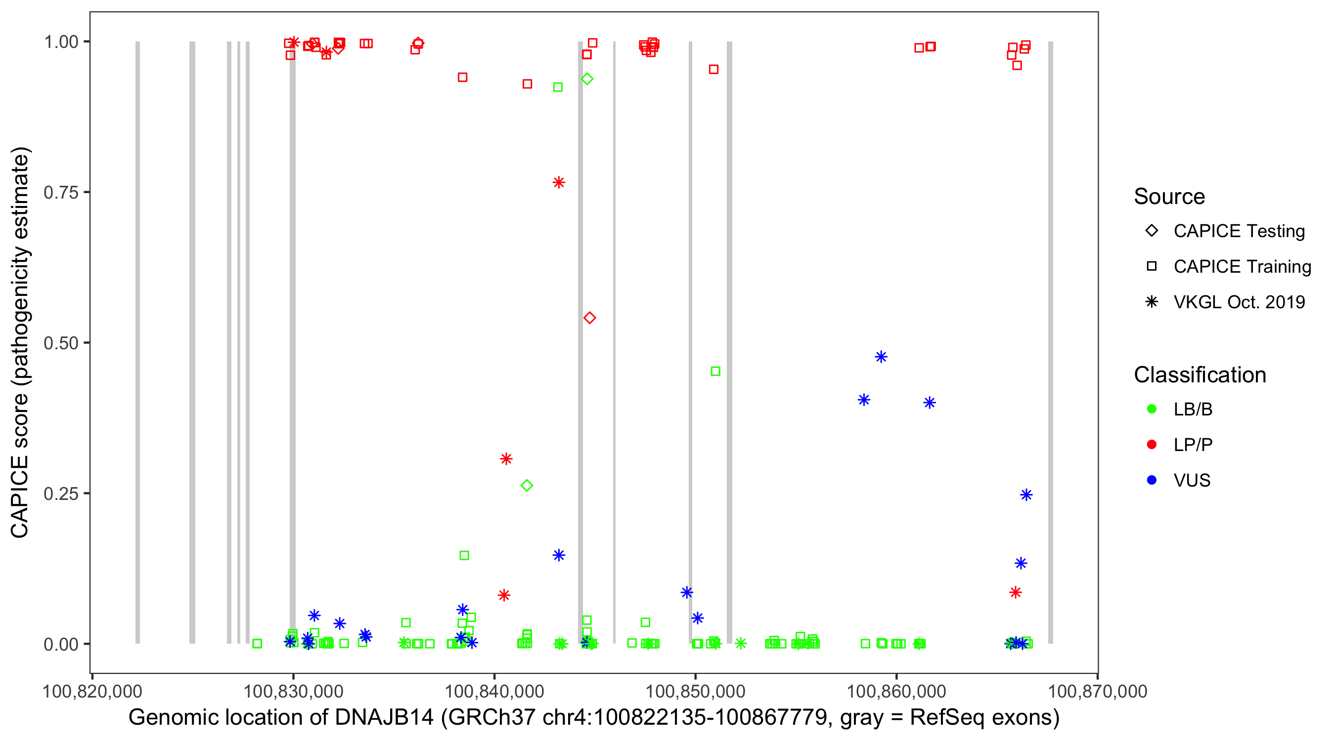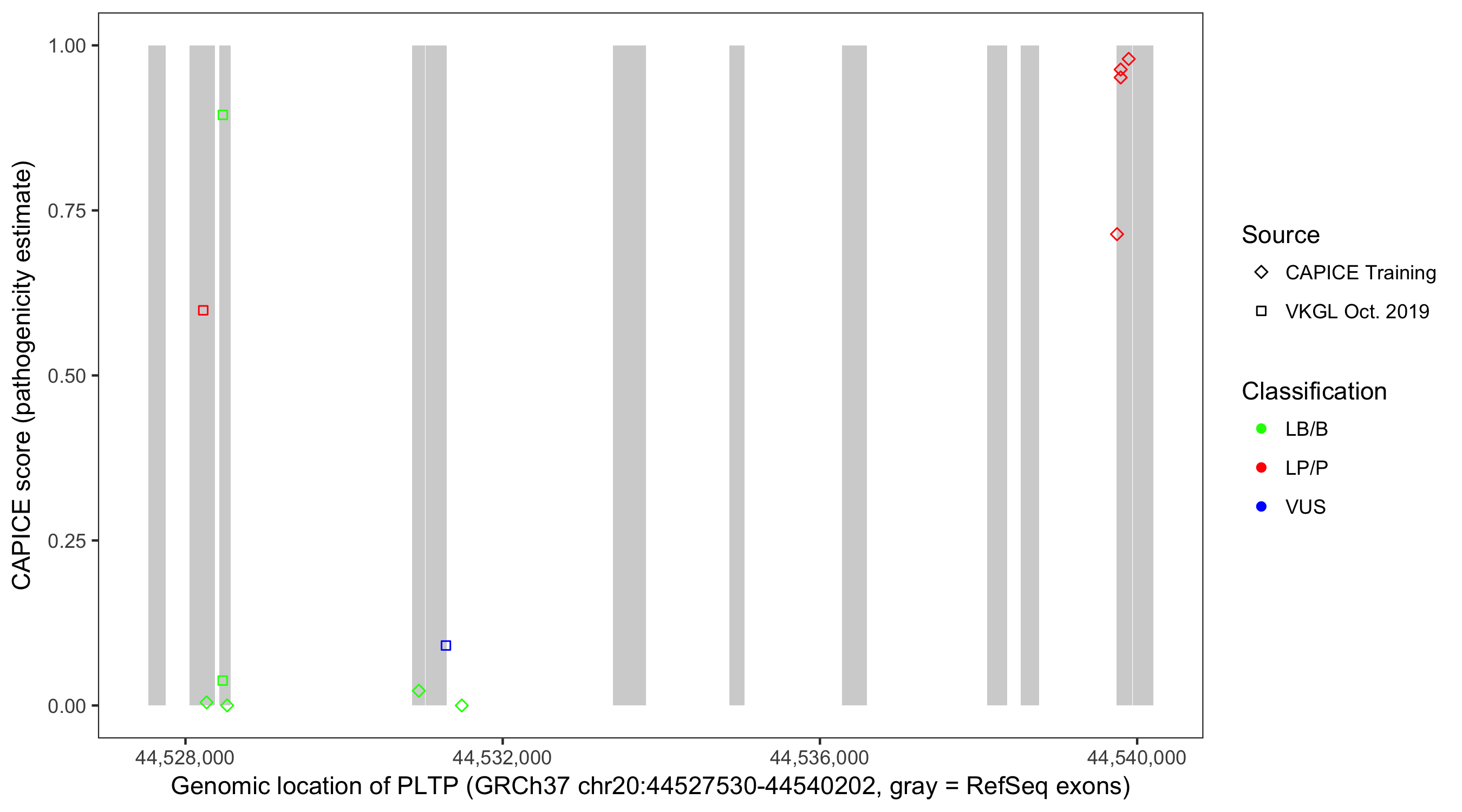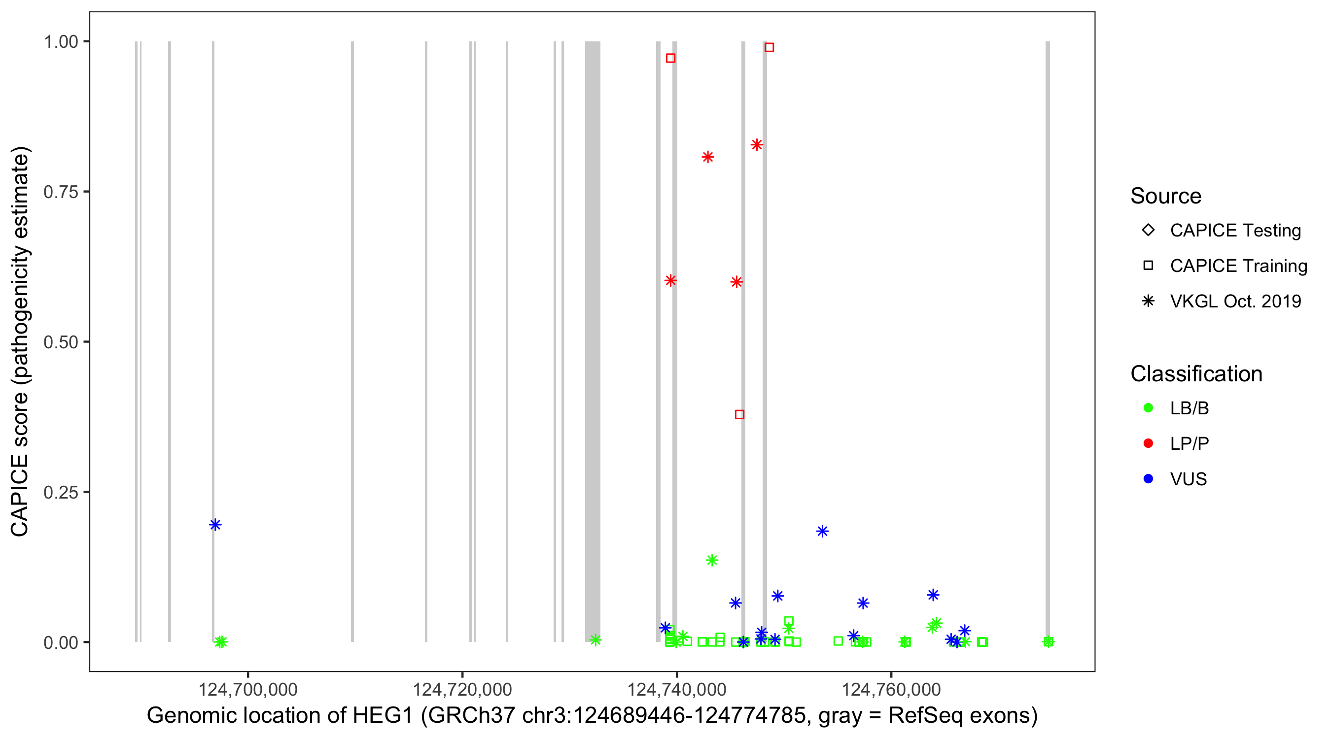 Shown are CAPICE train/test variants plus VKGL Oct 2019.