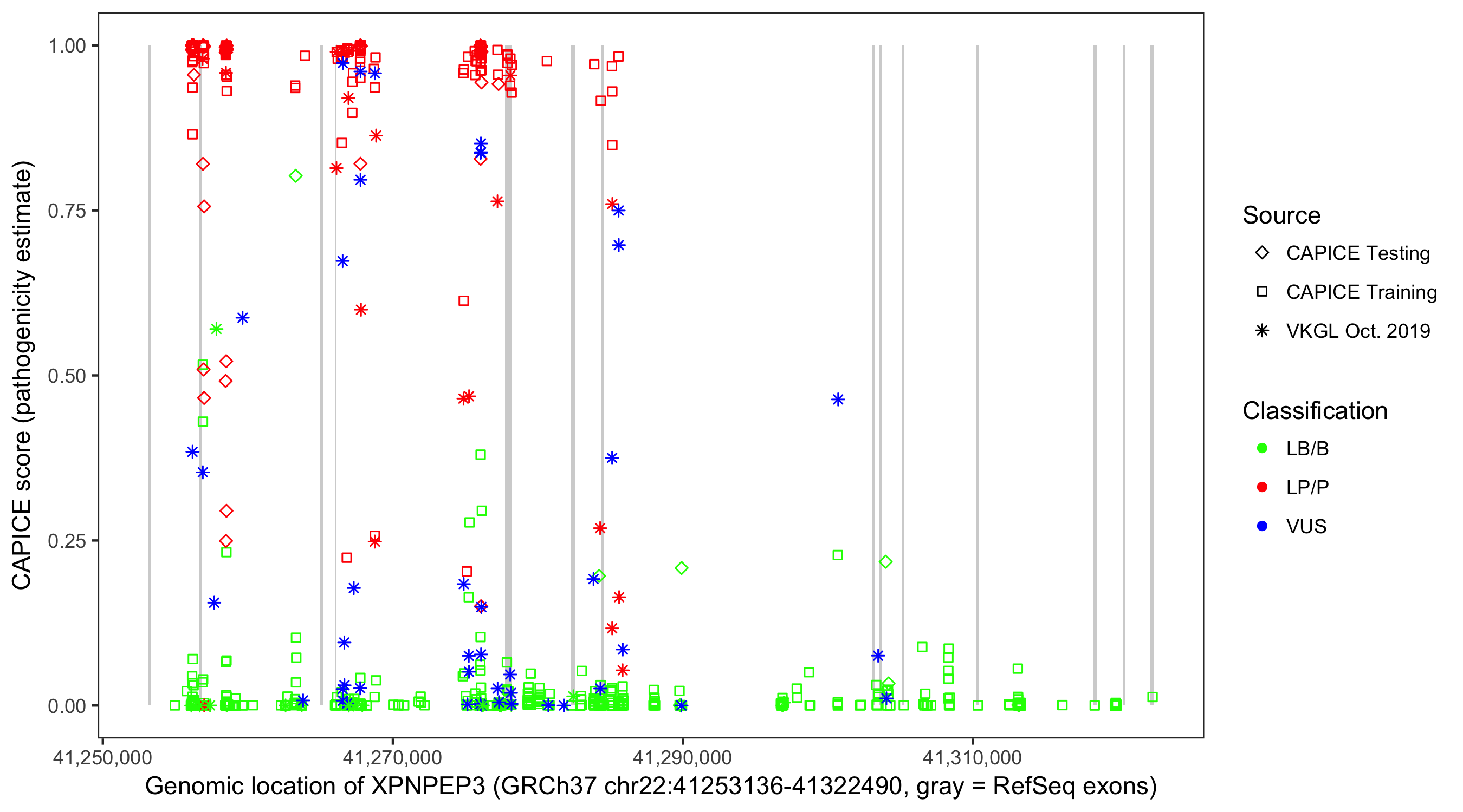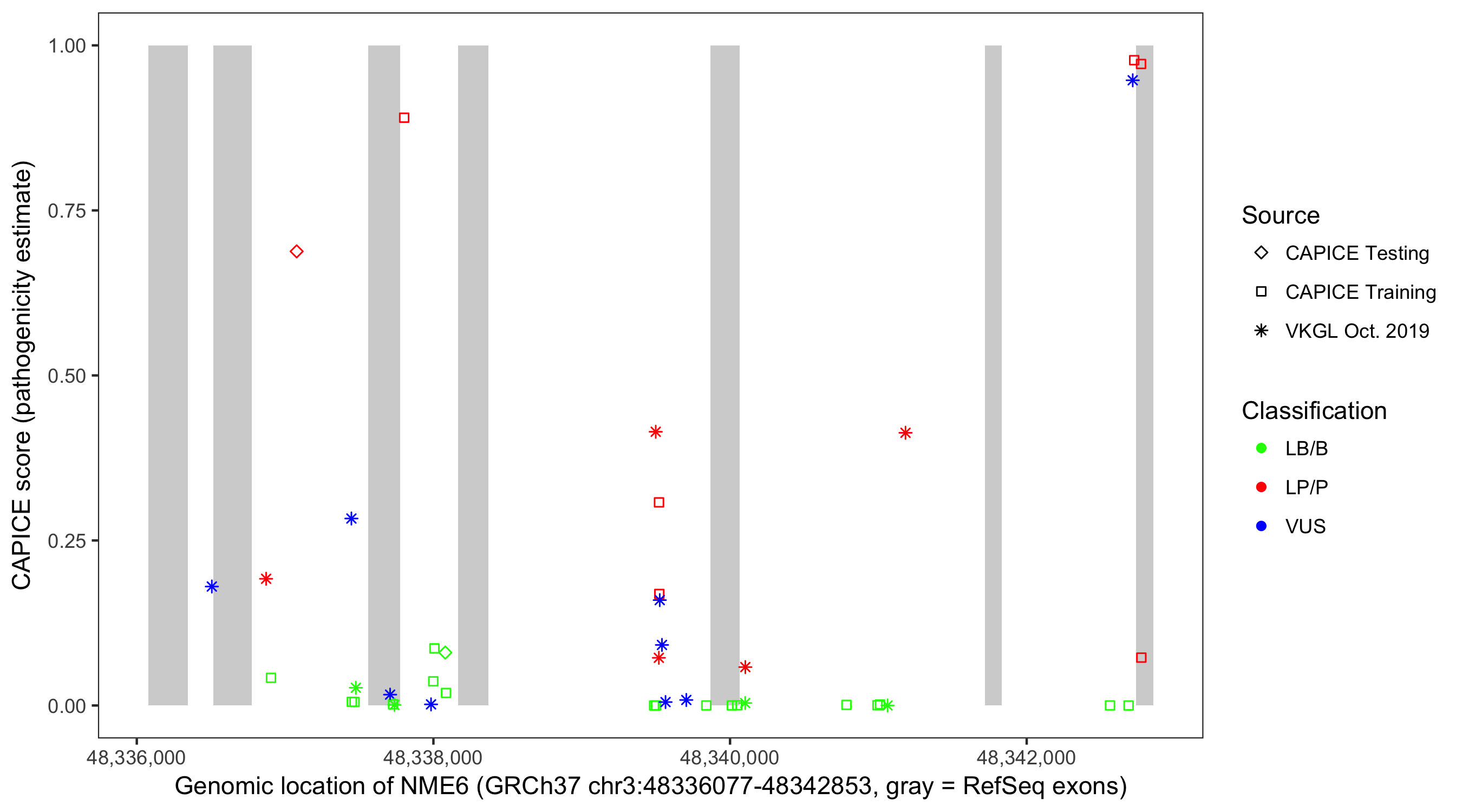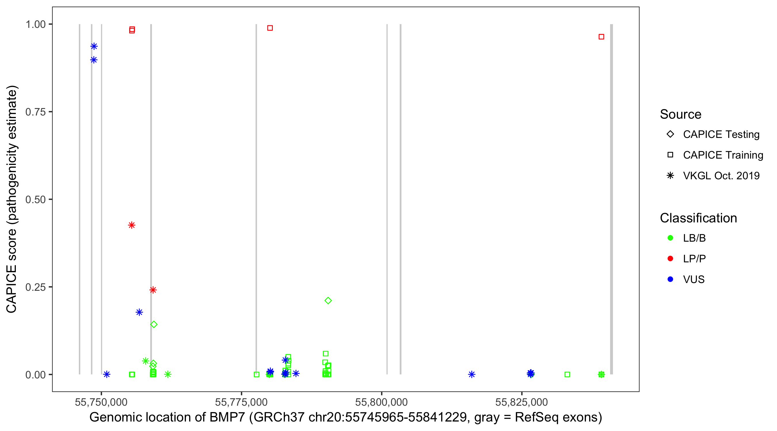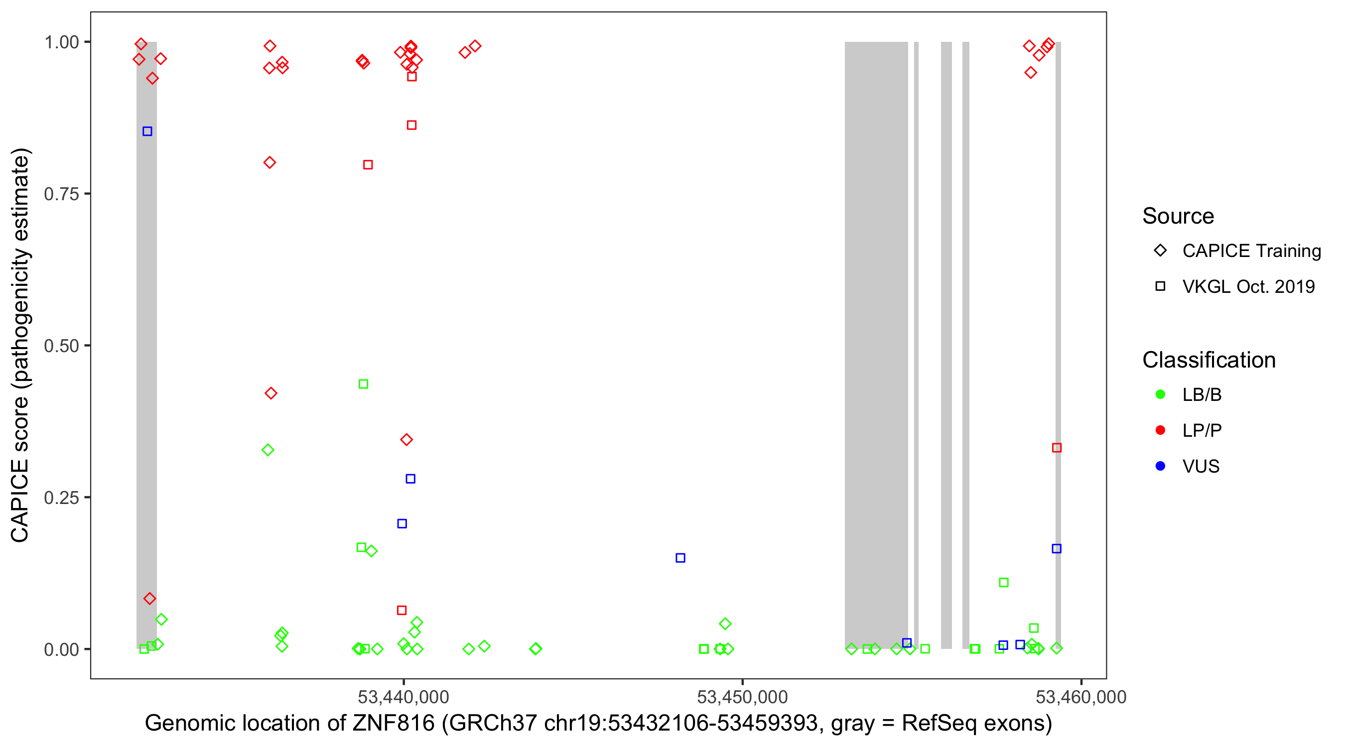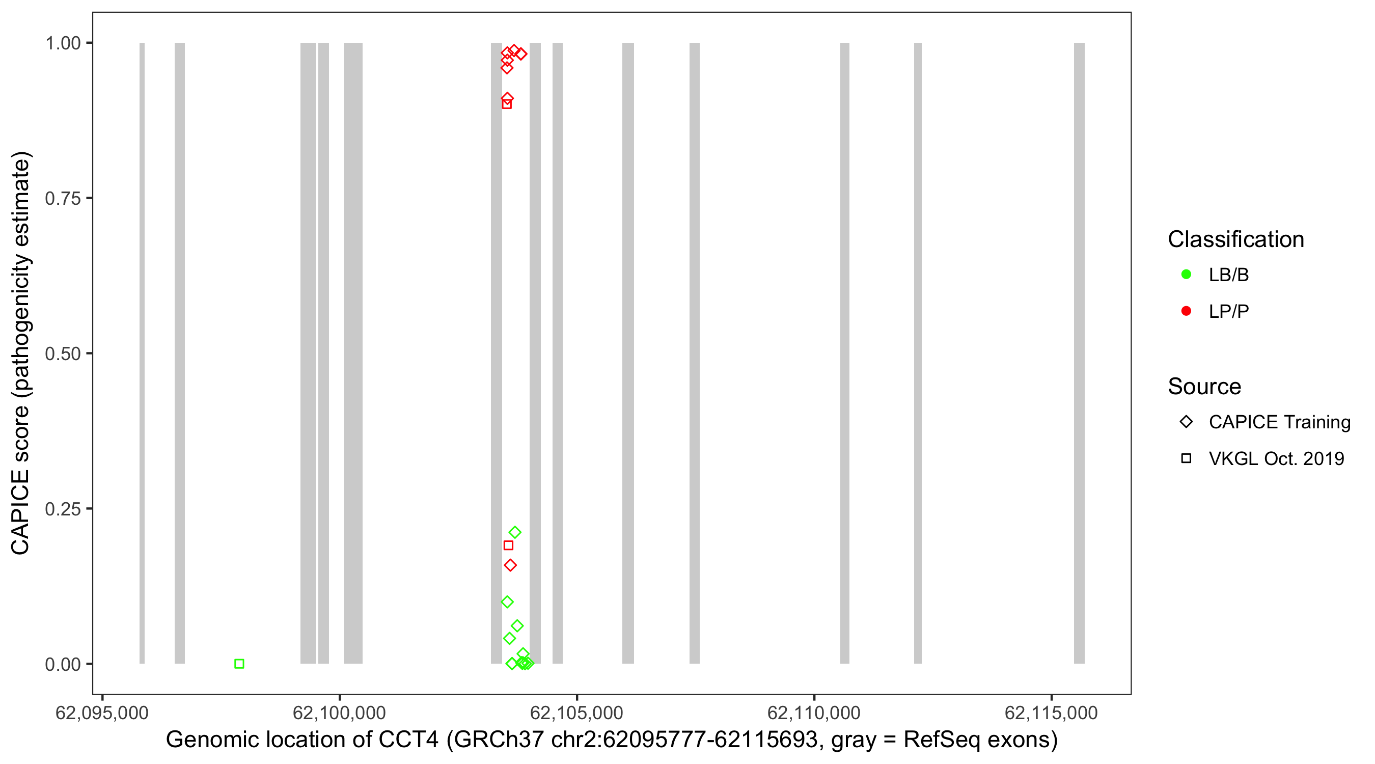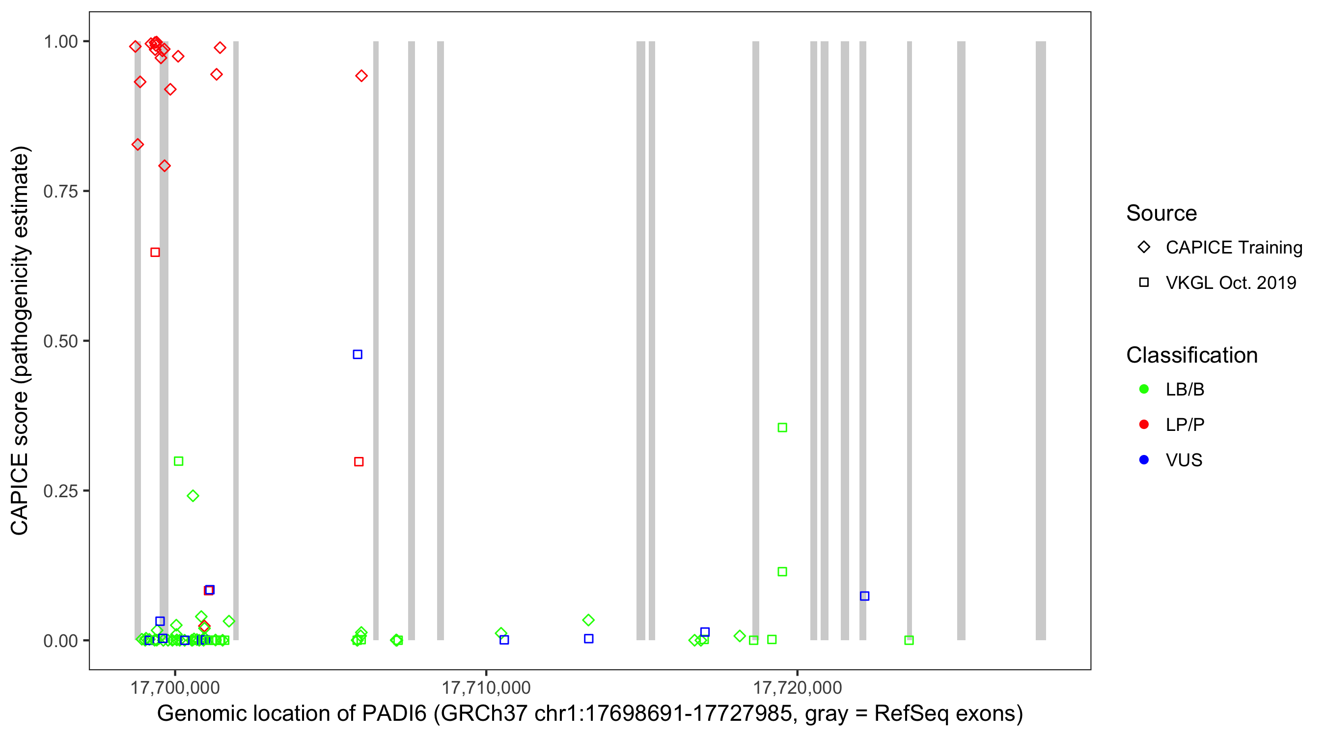 Shown are CAPICE train/test variants plus VKGL Oct 2019.