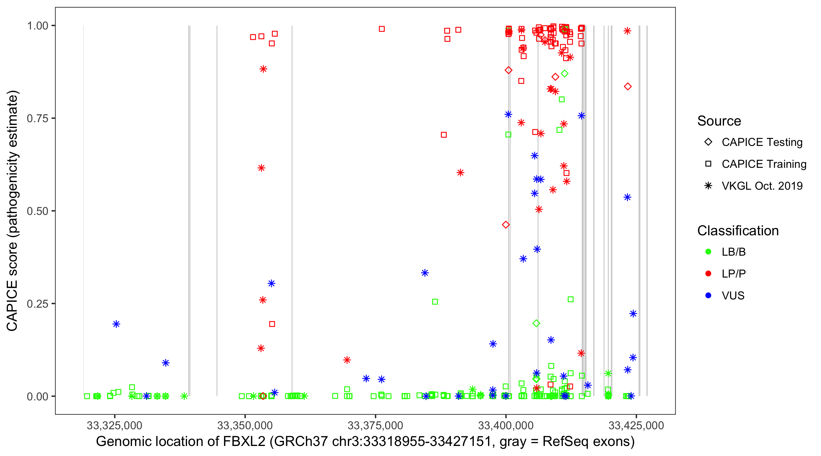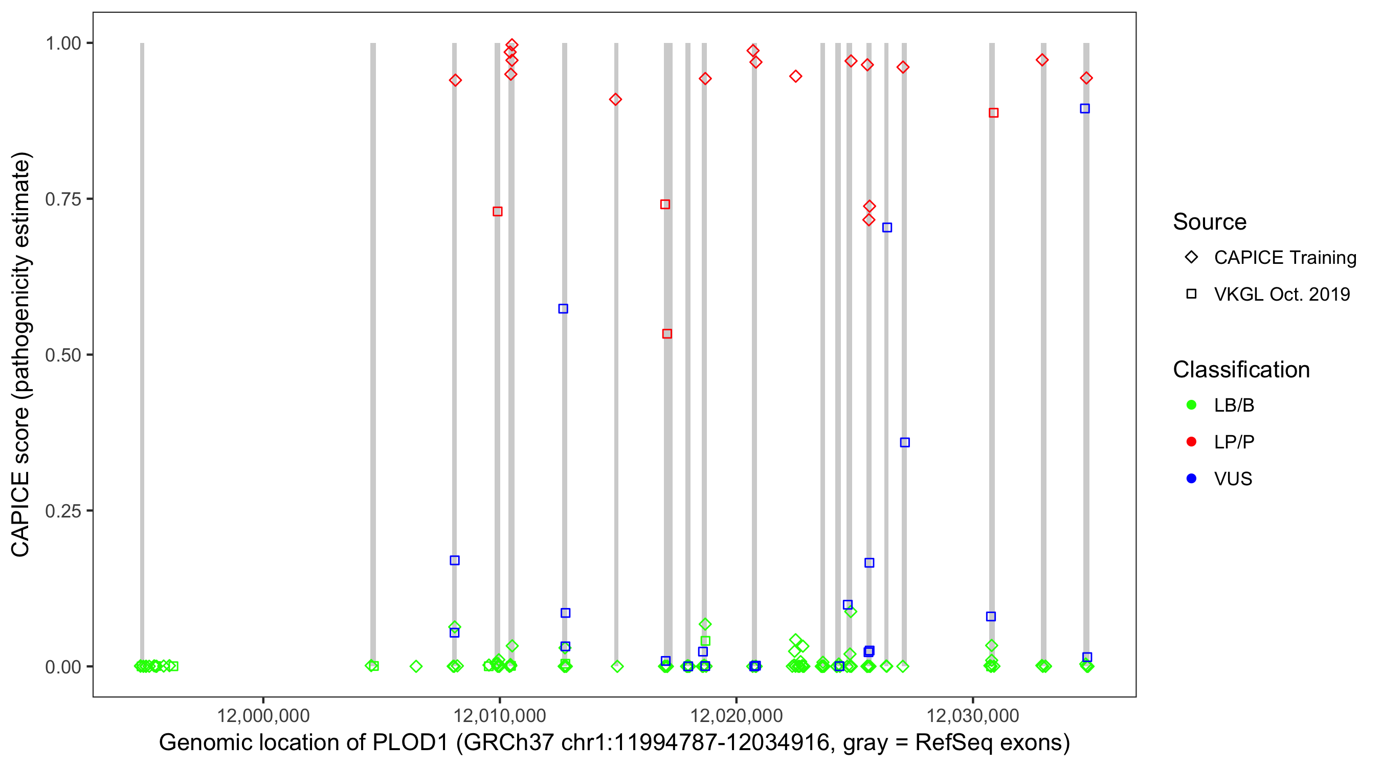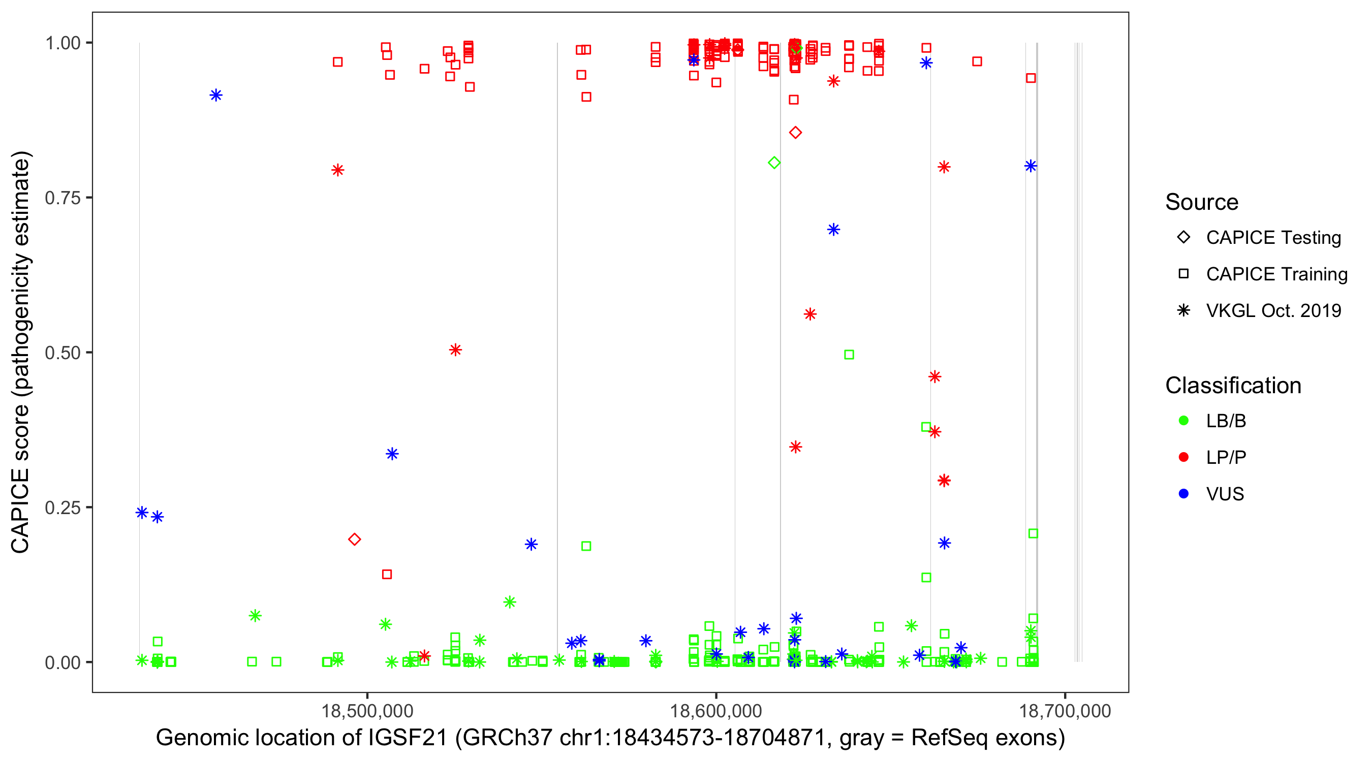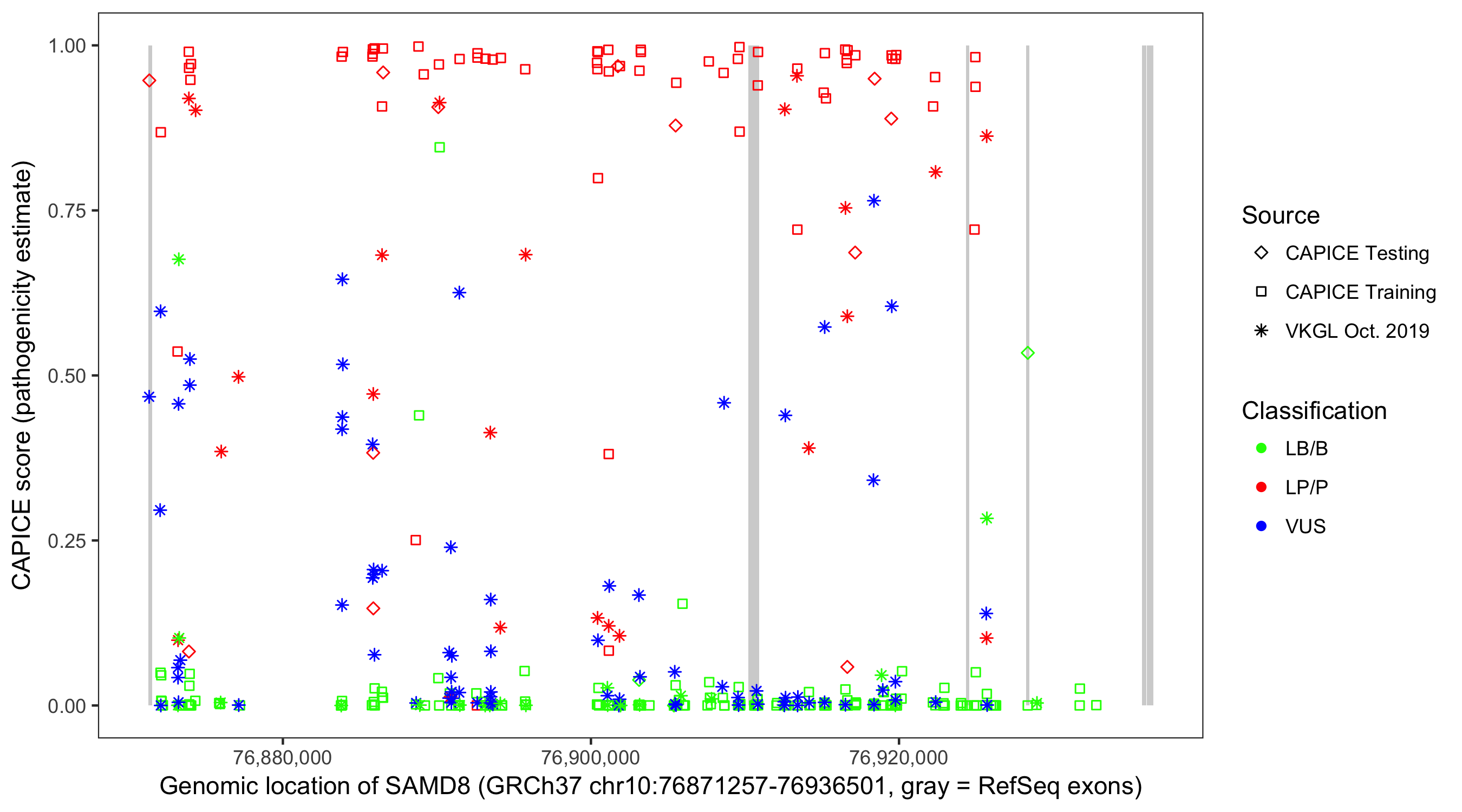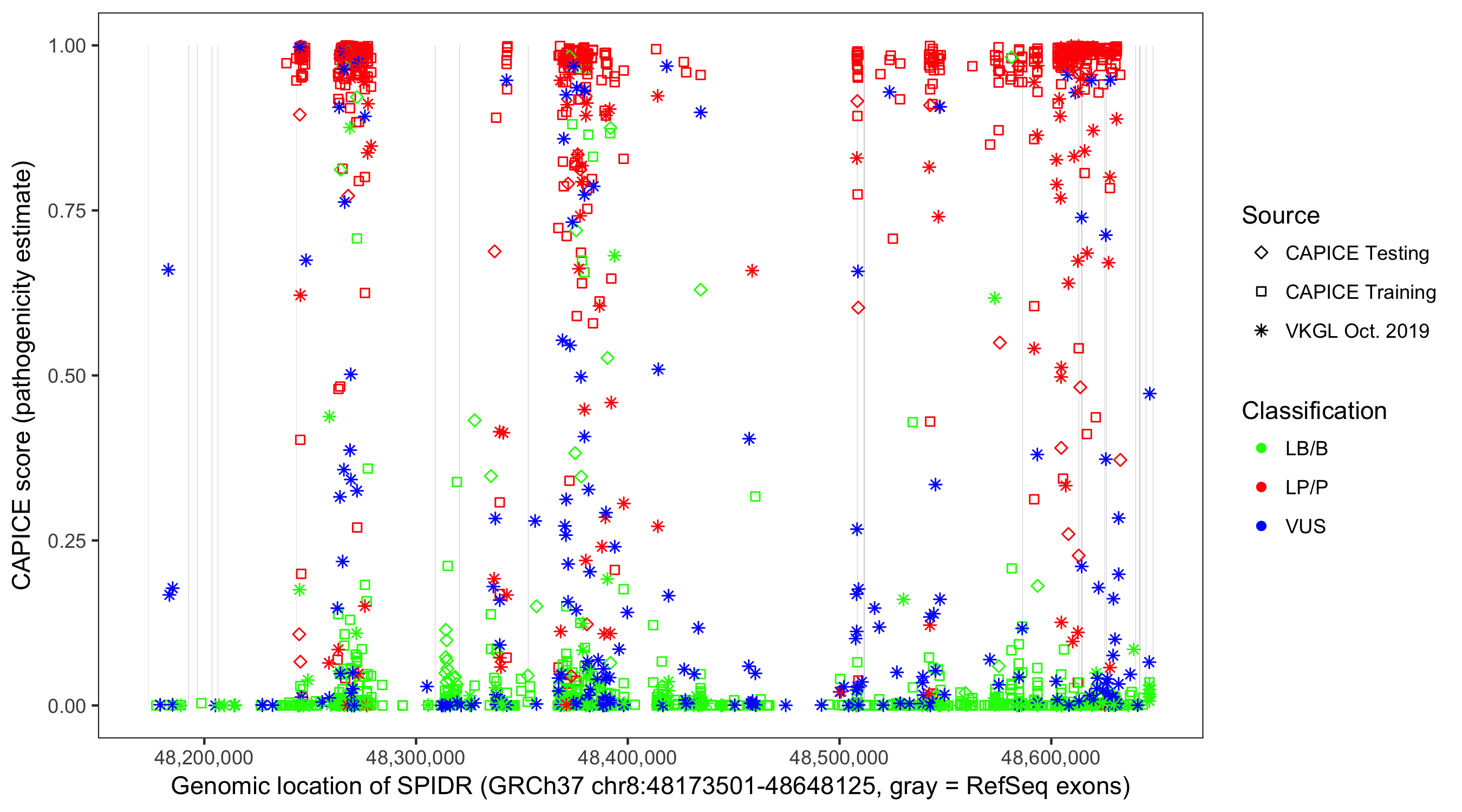 Shown are CAPICE train/test variants plus VKGL Oct 2019.