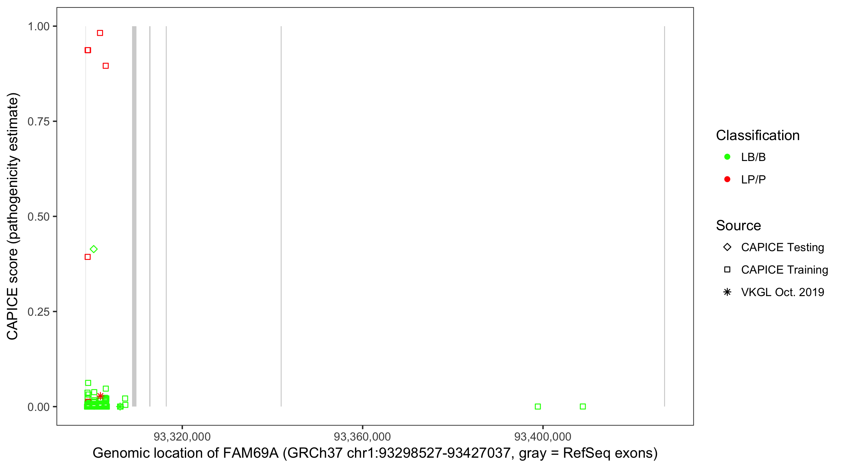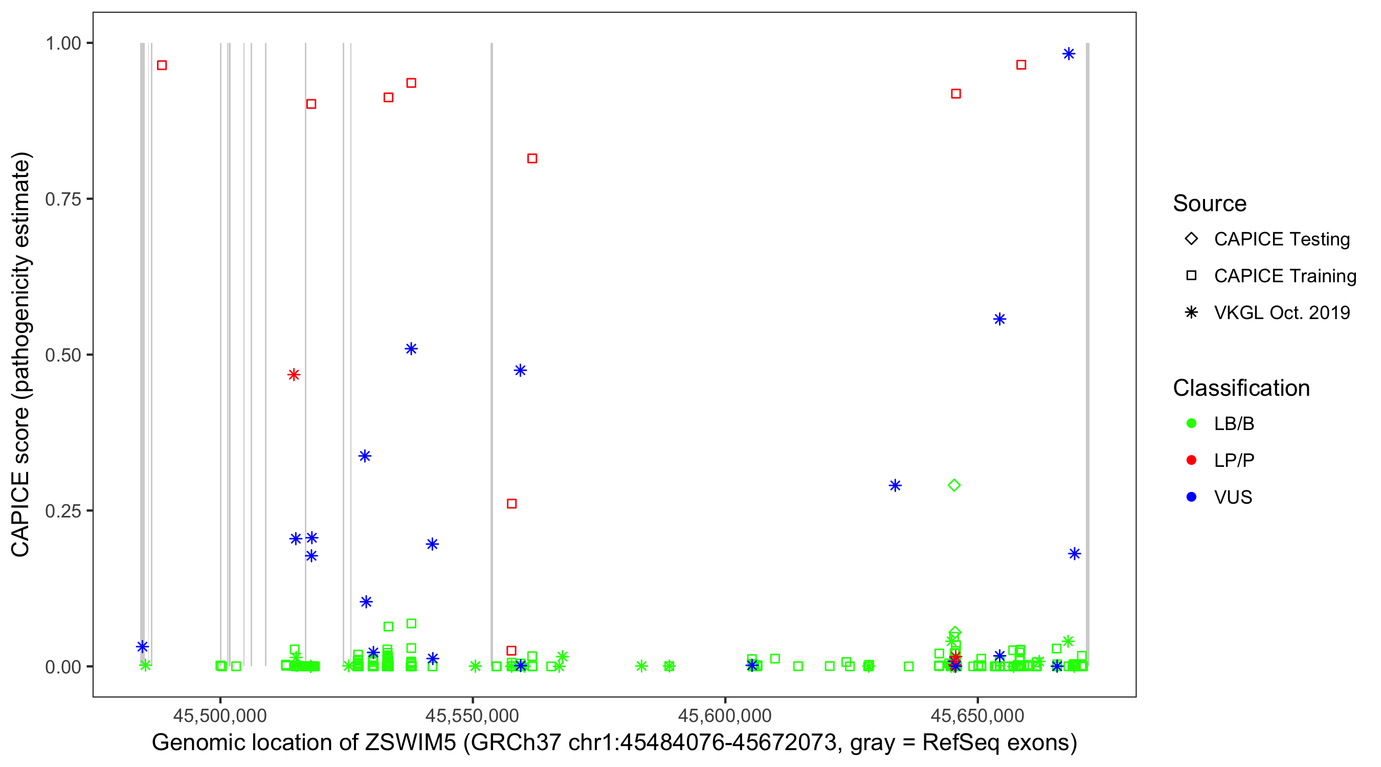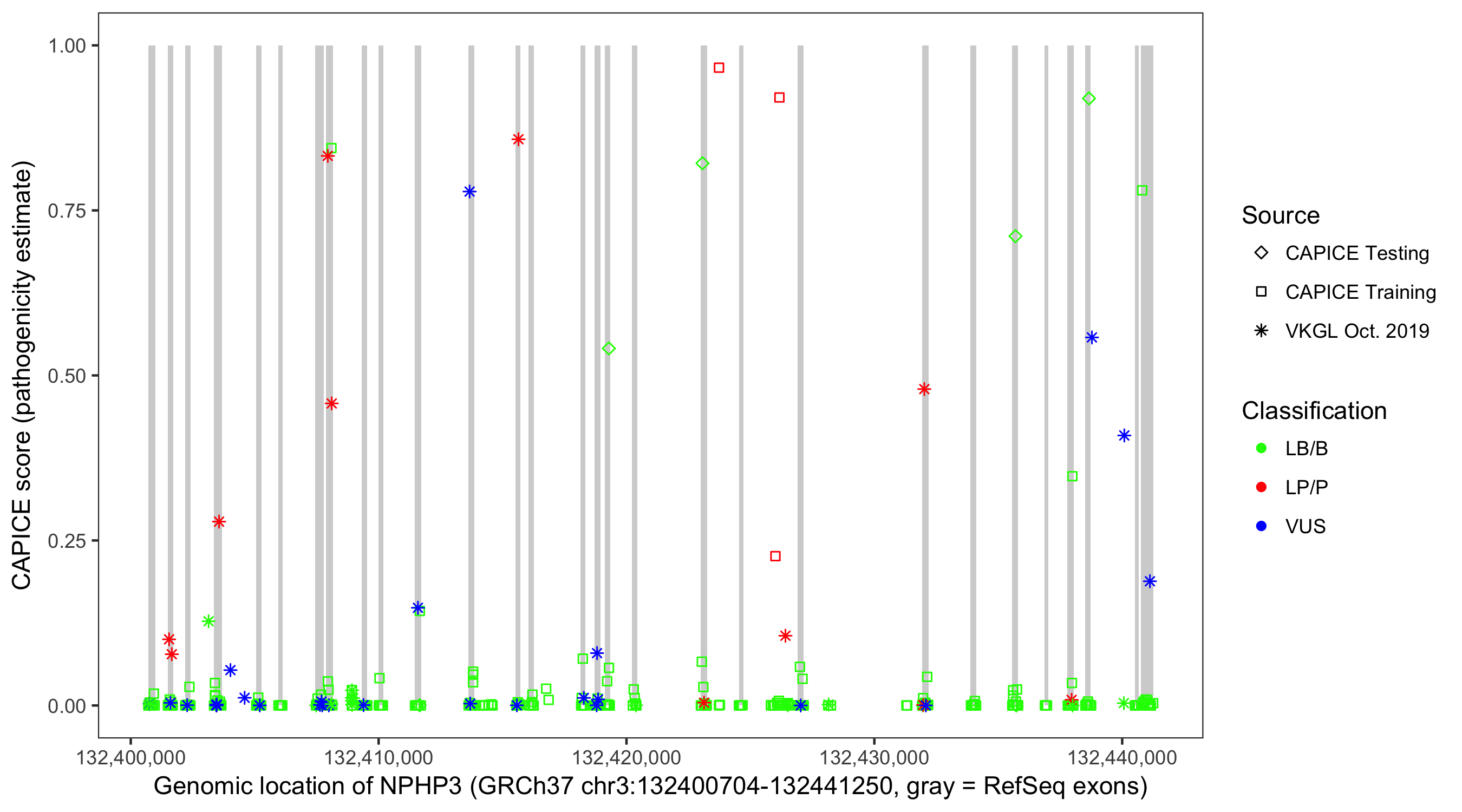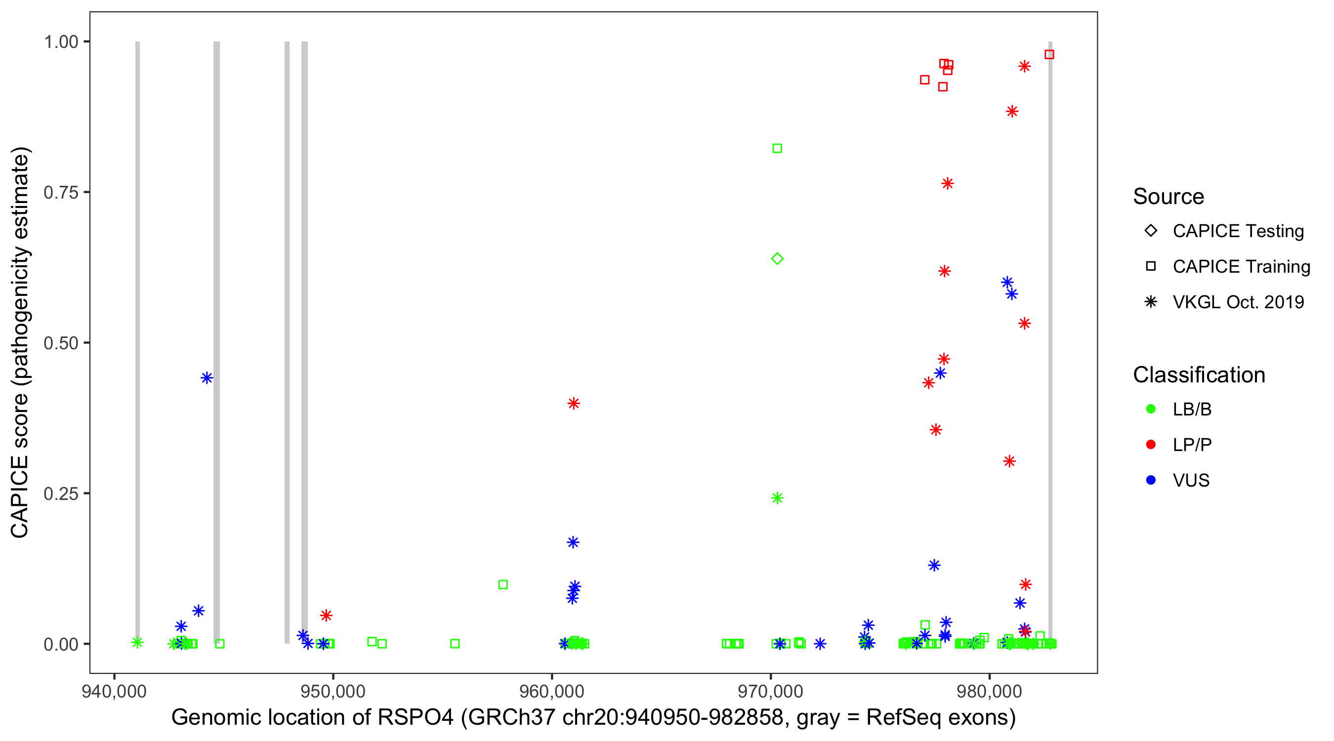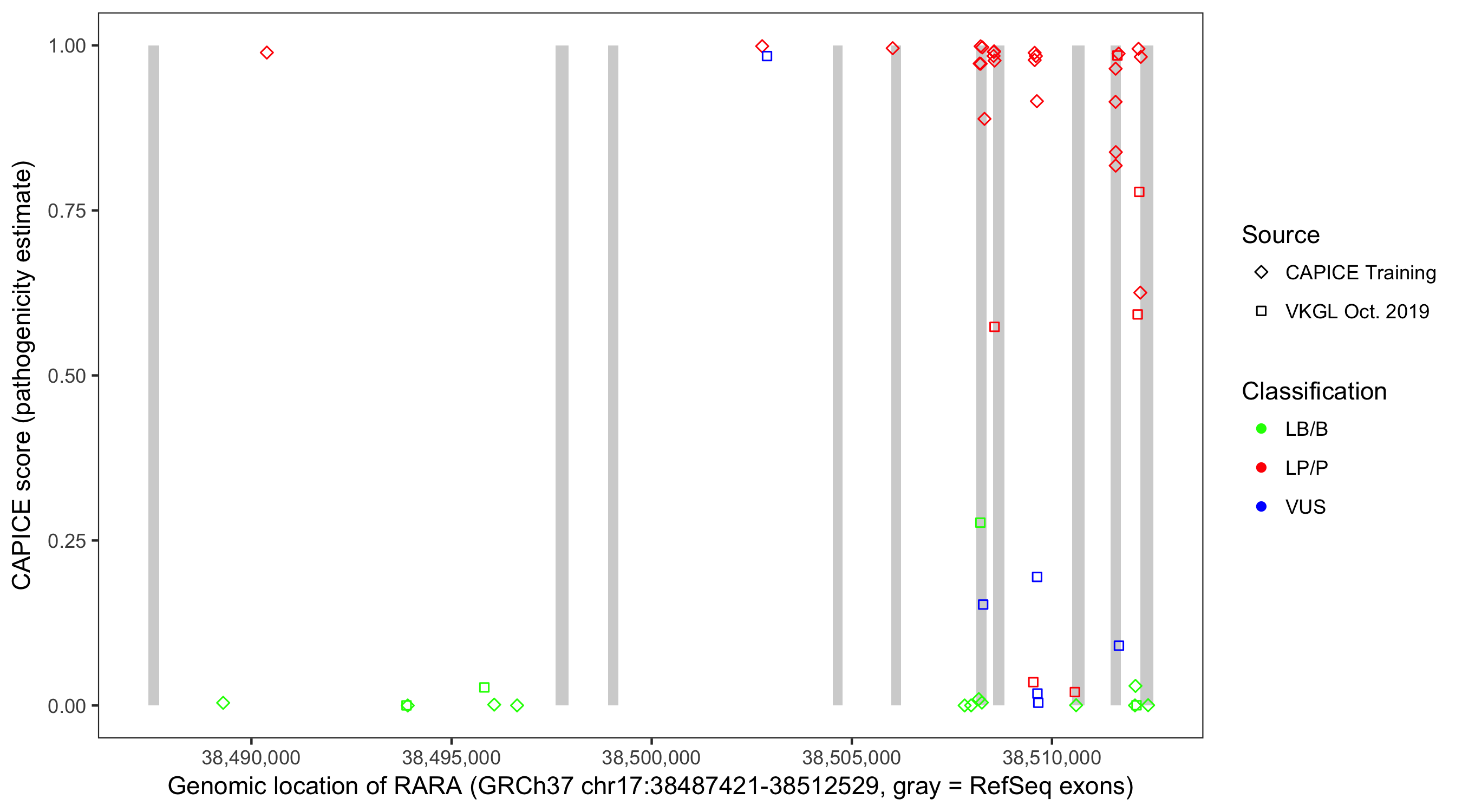 Shown are CAPICE train/test variants plus VKGL Oct 2019.