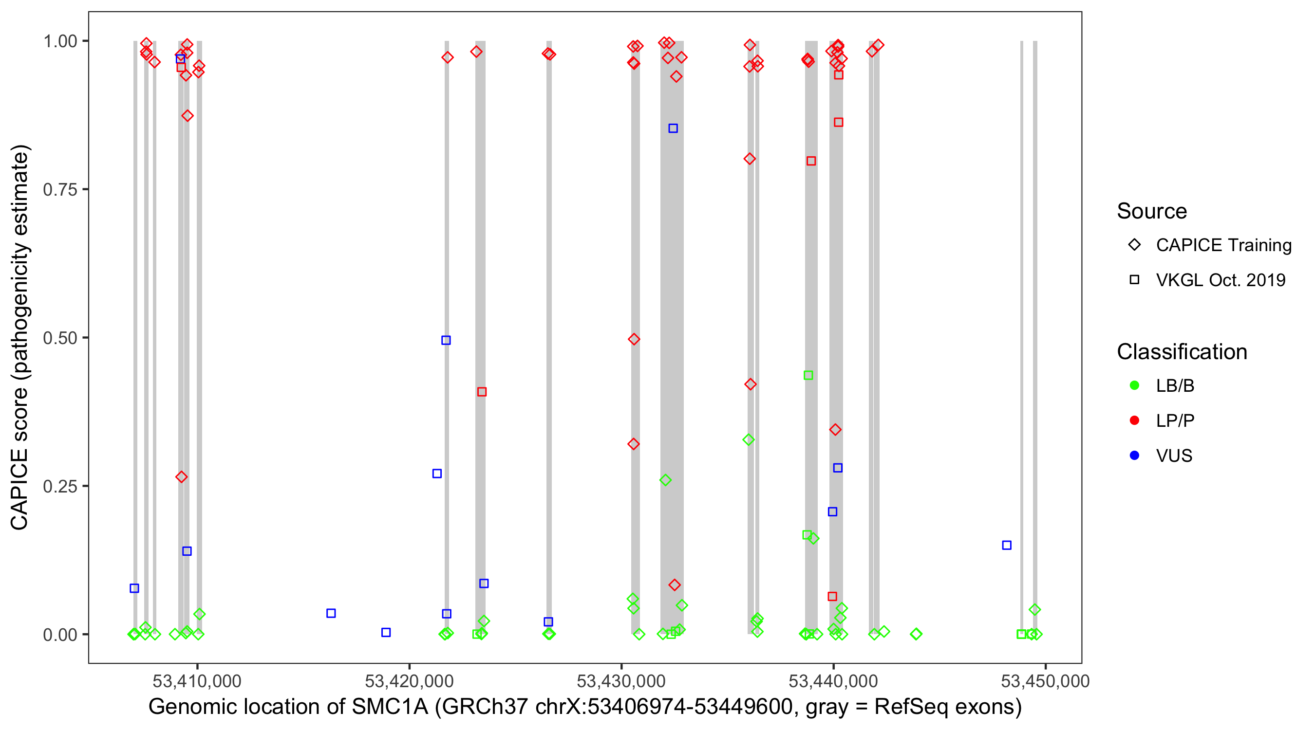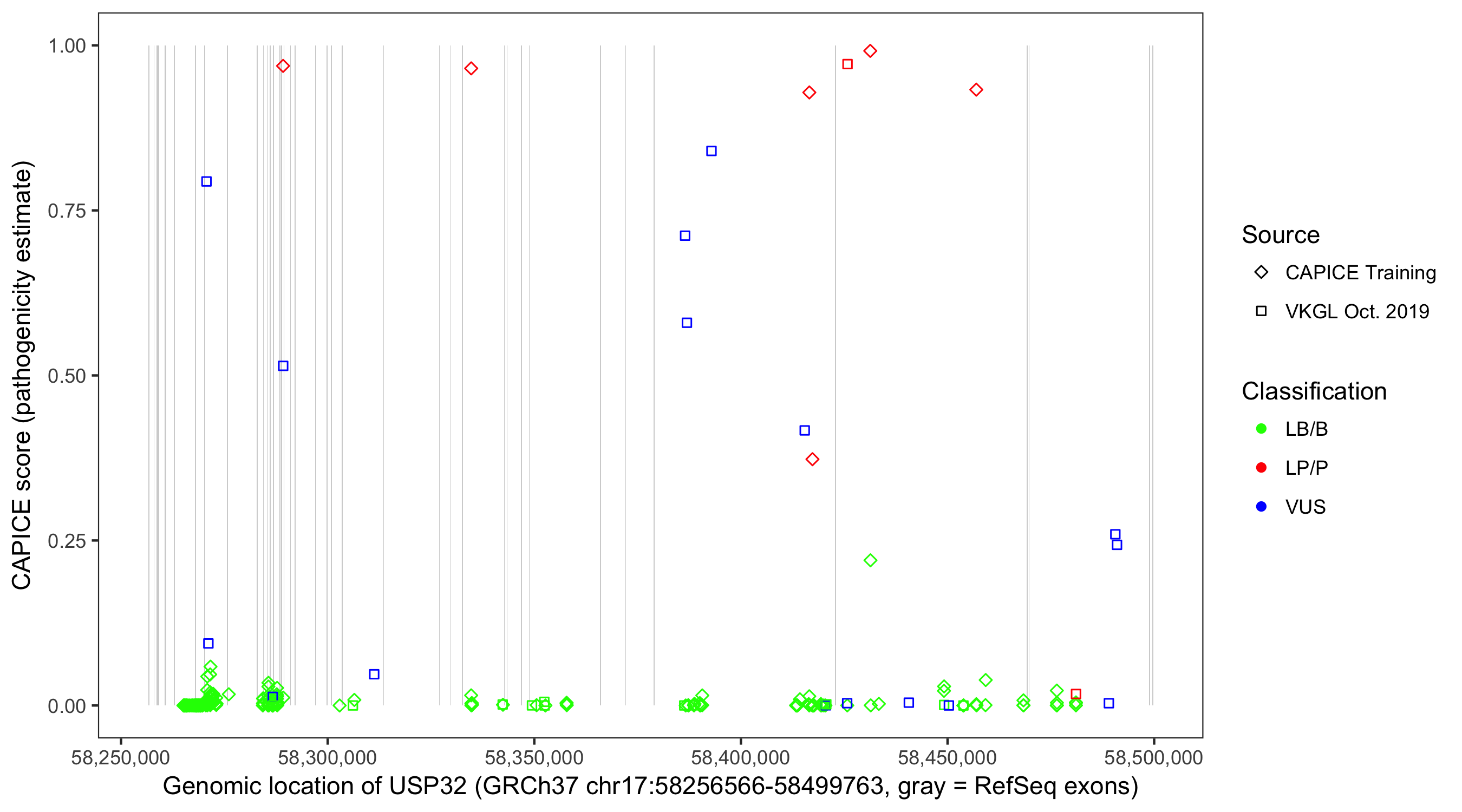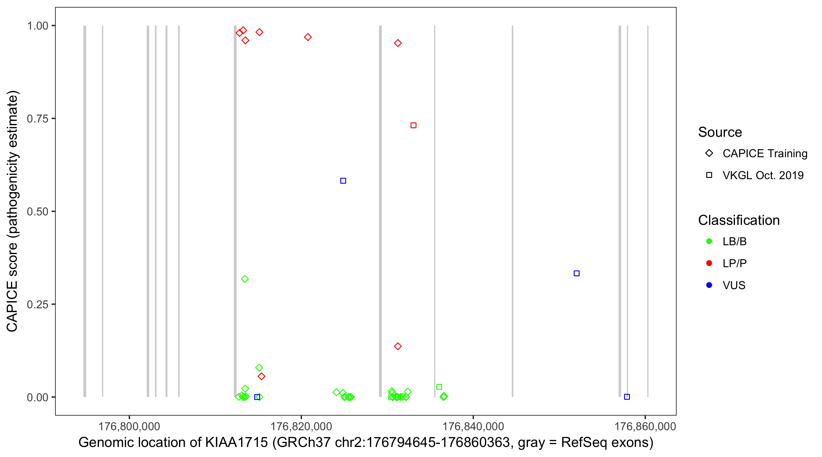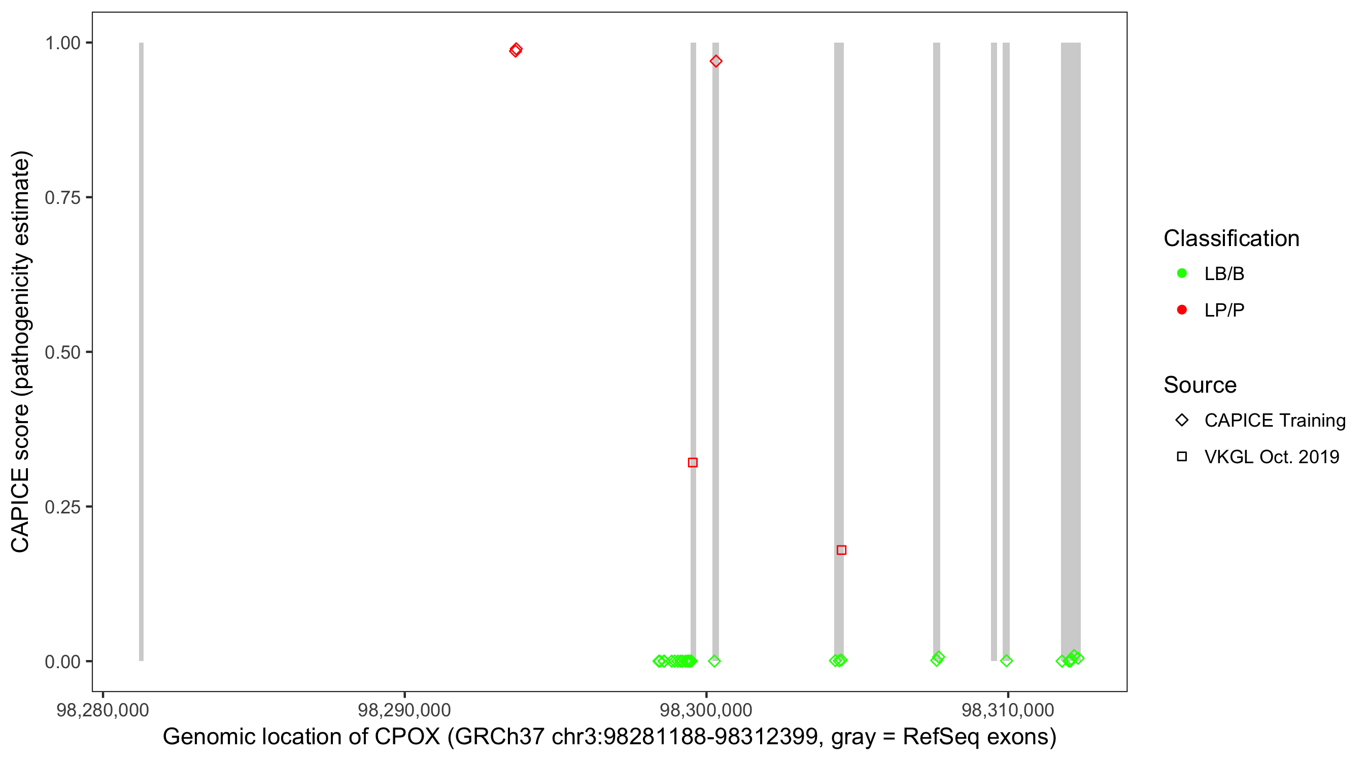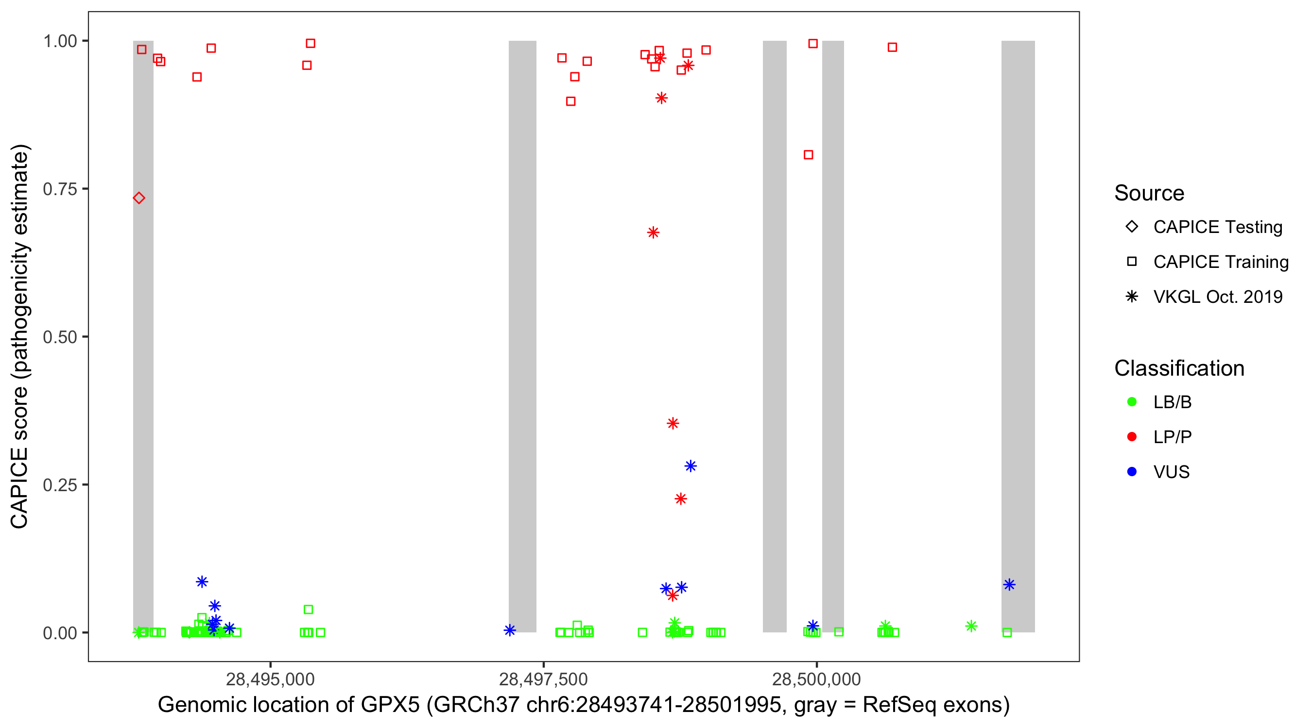Shown are CAPICE train/test variants plus VKGL Oct 2019.