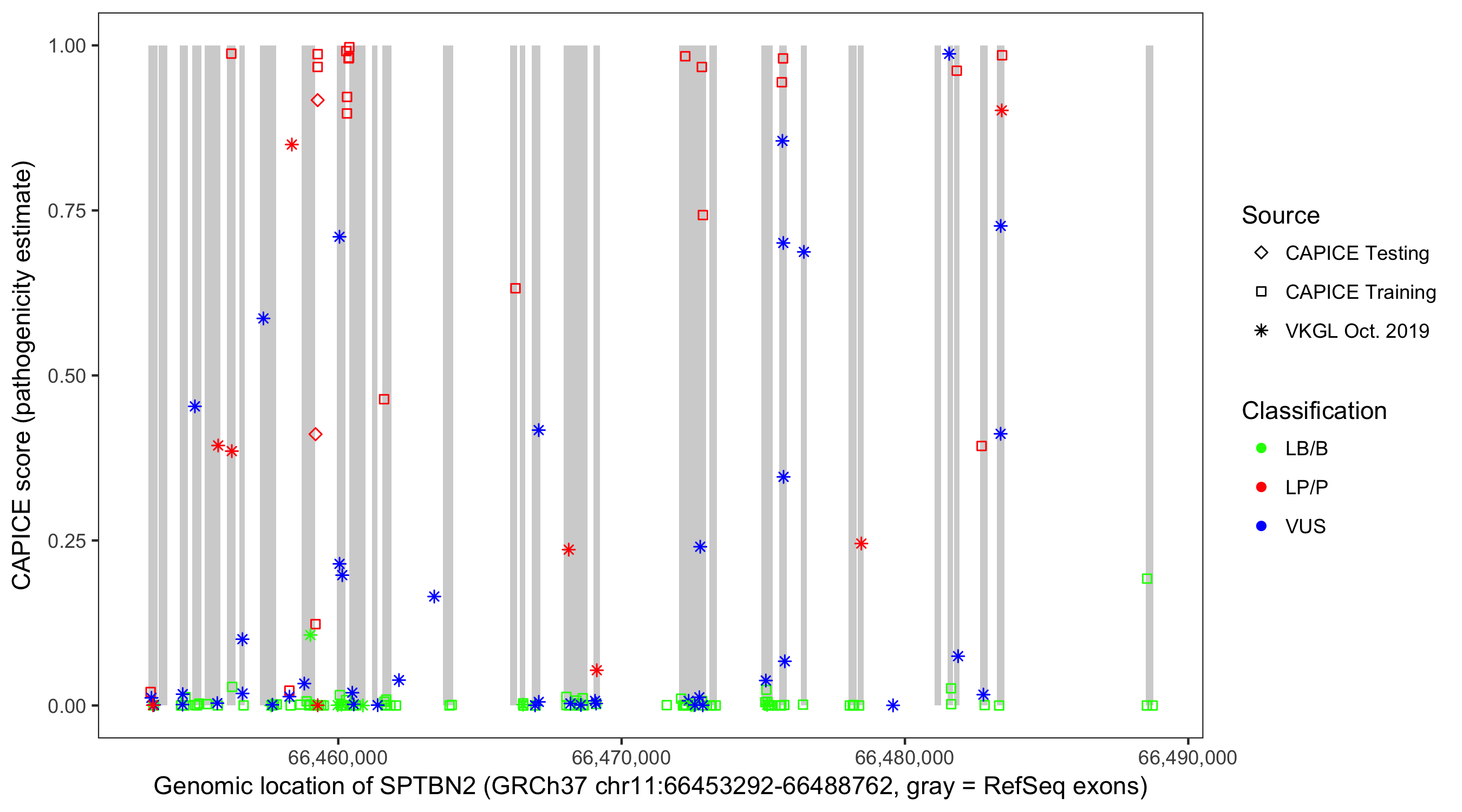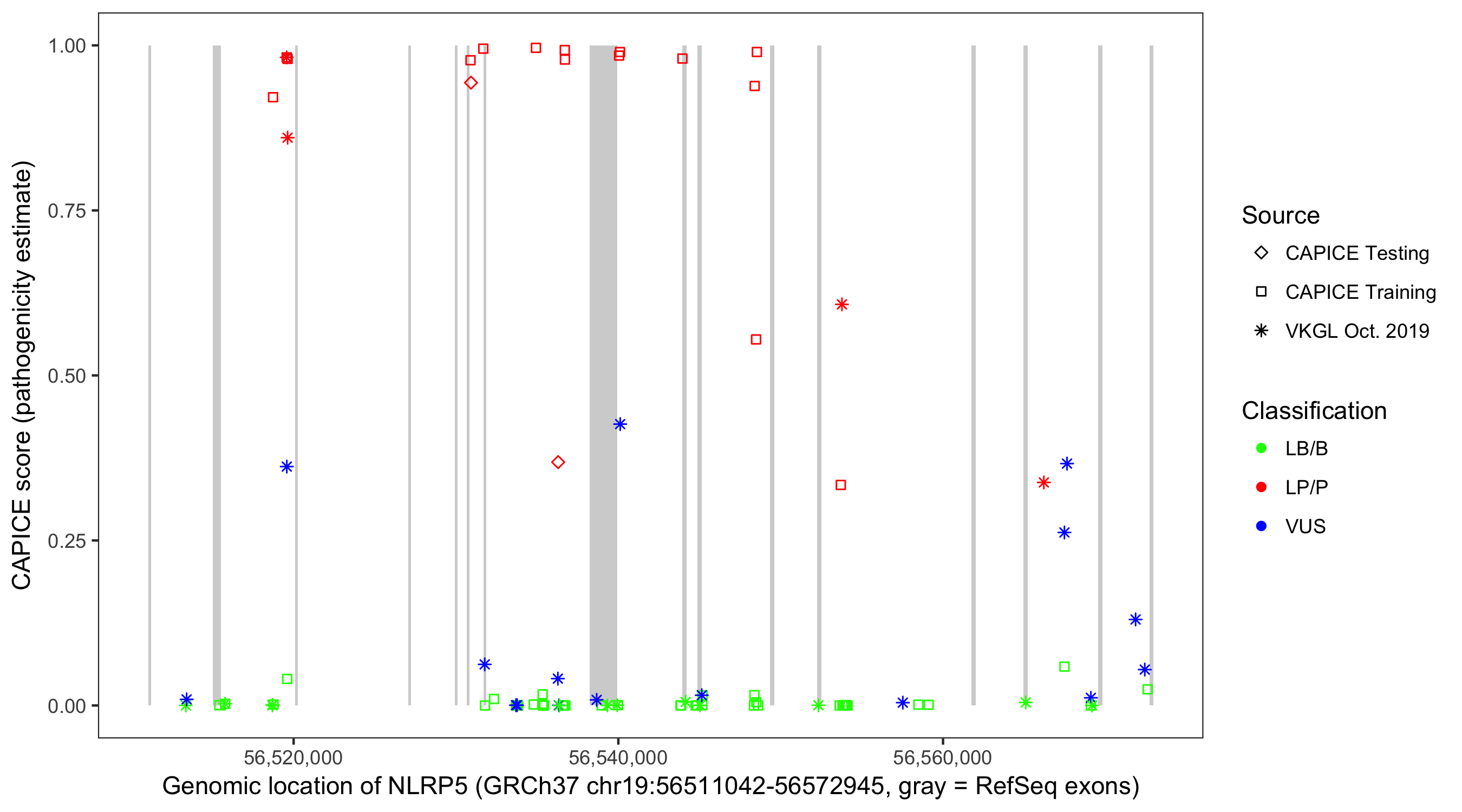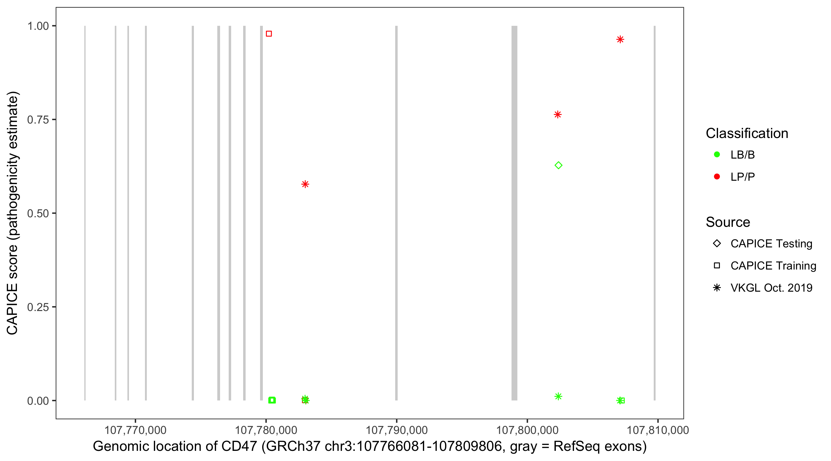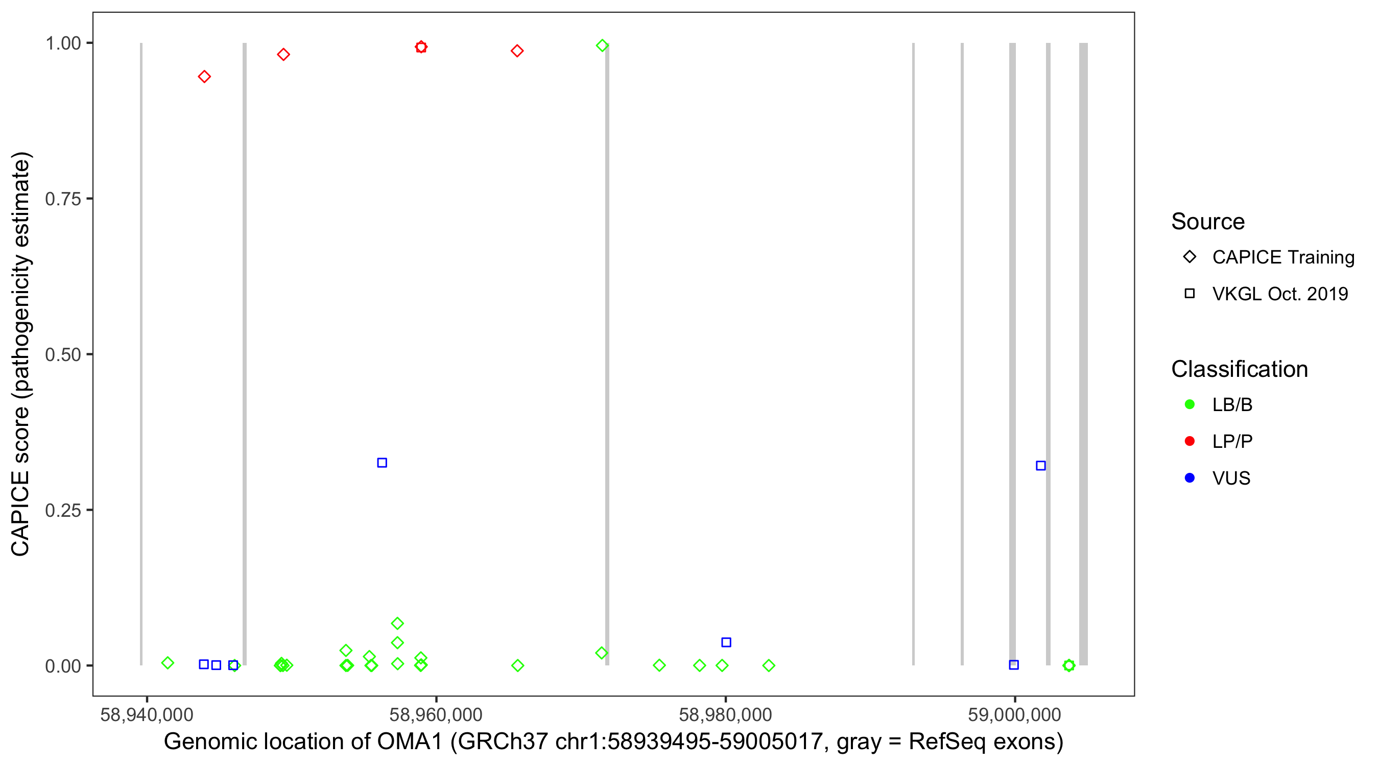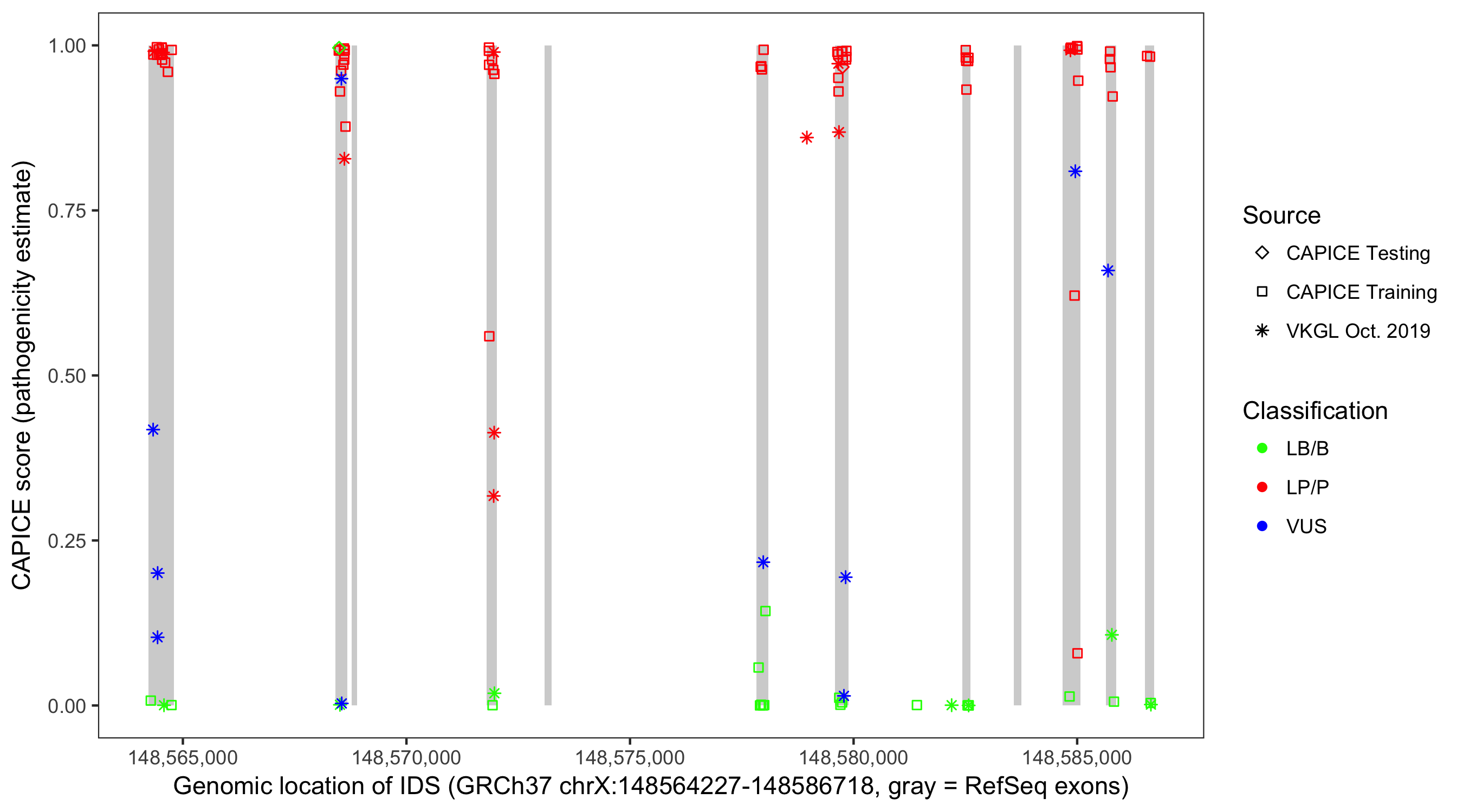 Shown are CAPICE train/test variants plus VKGL Oct 2019.