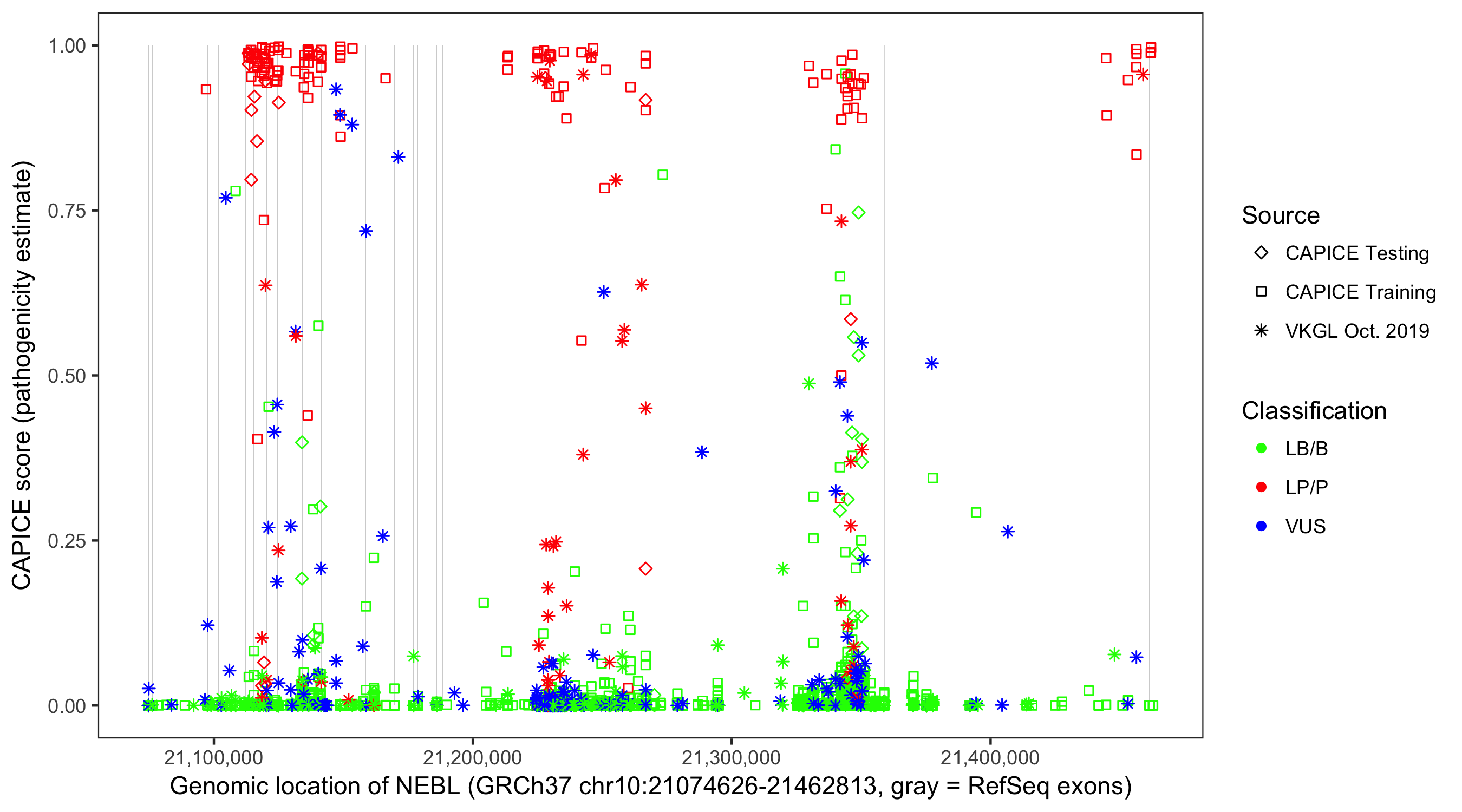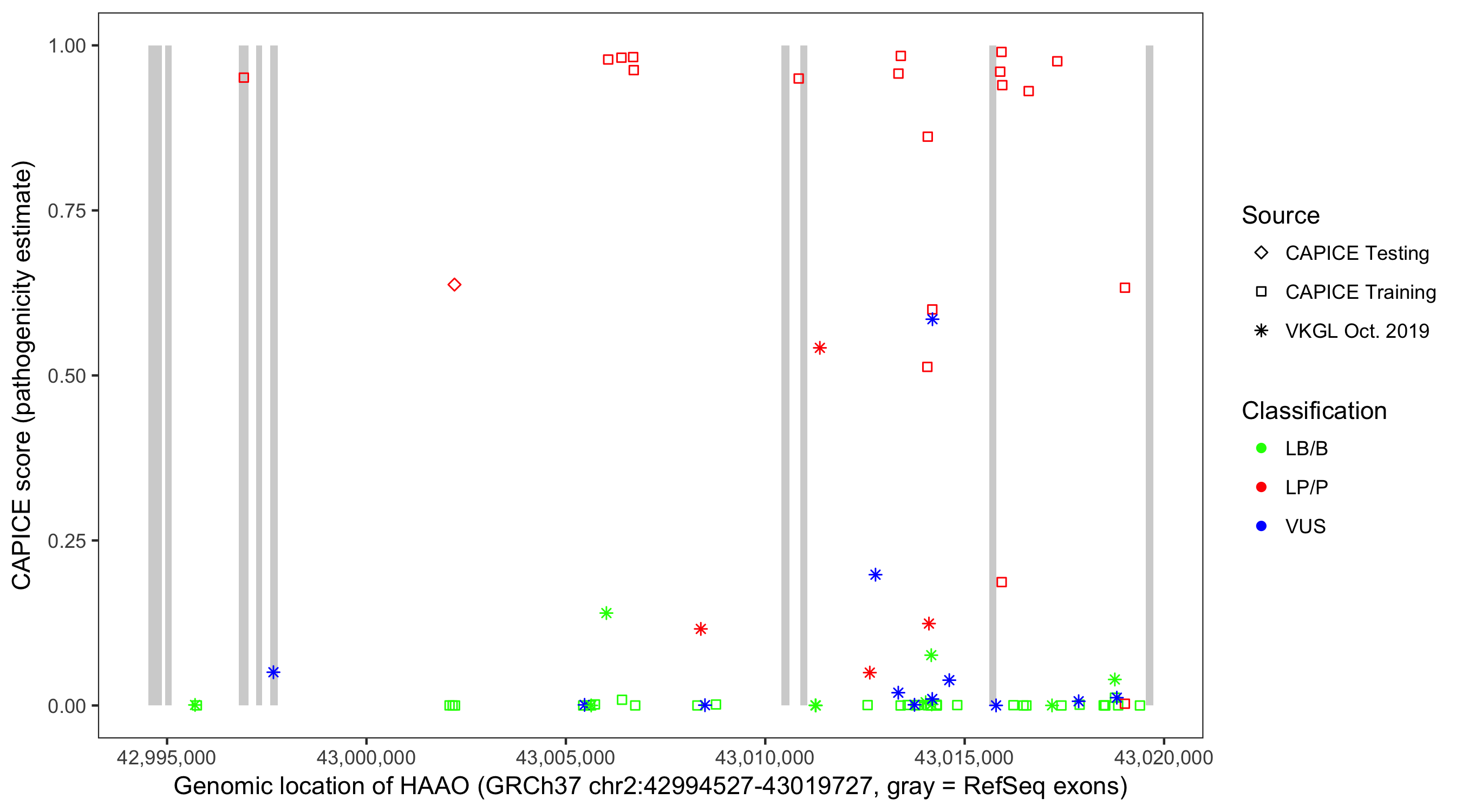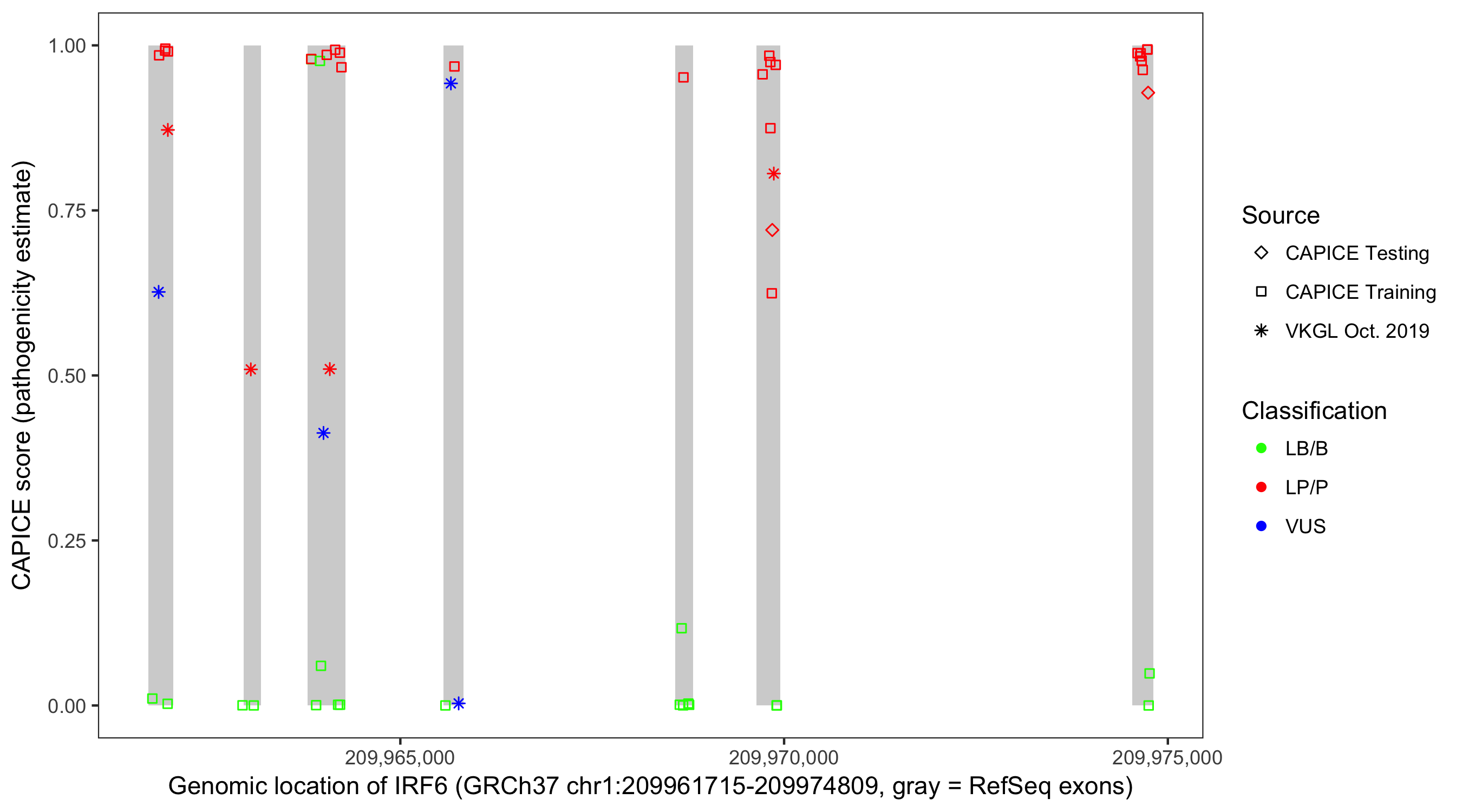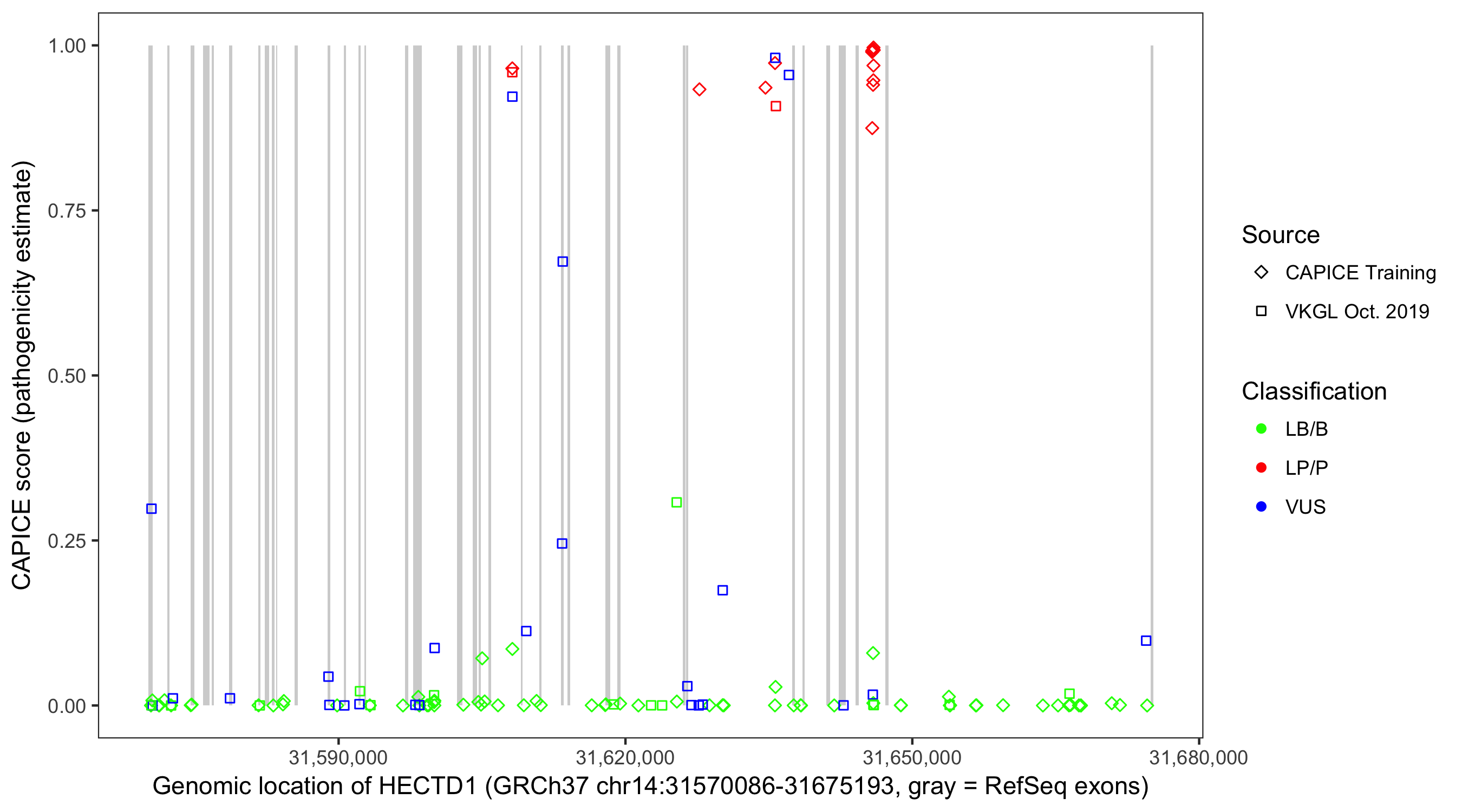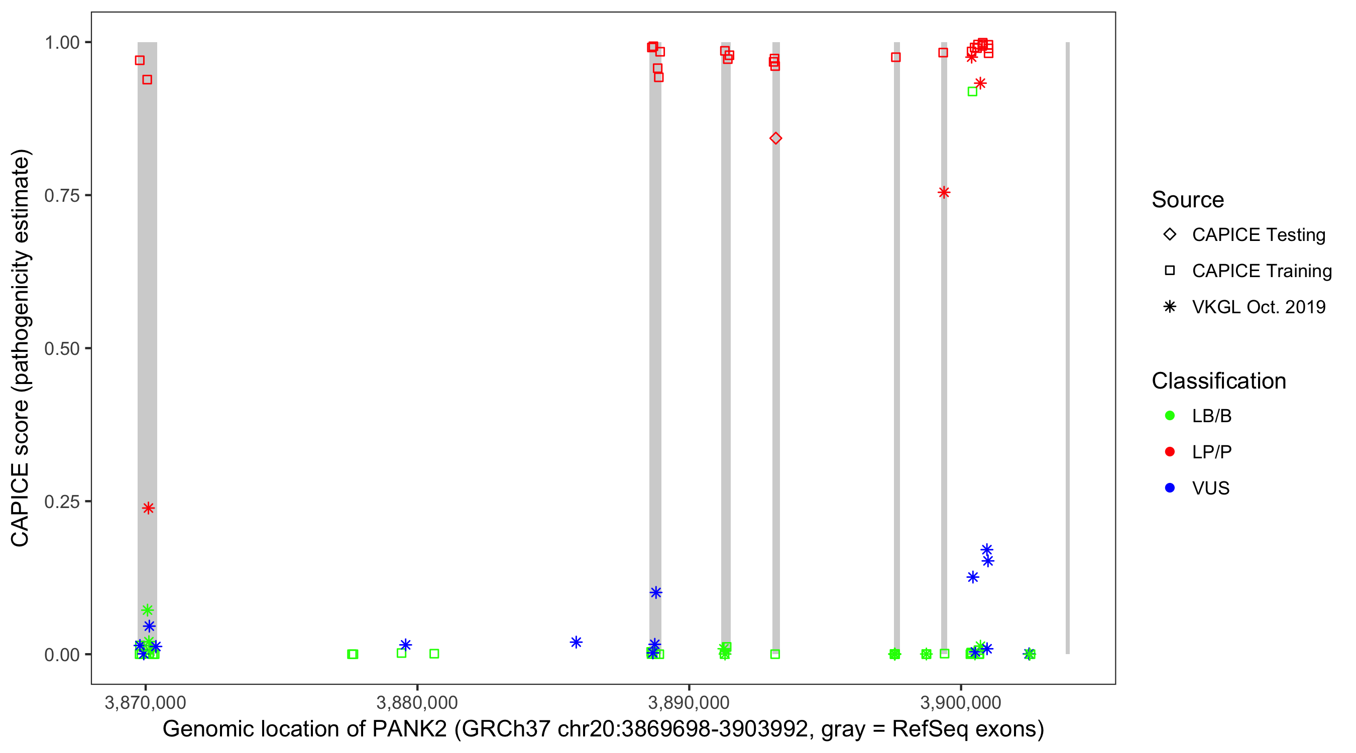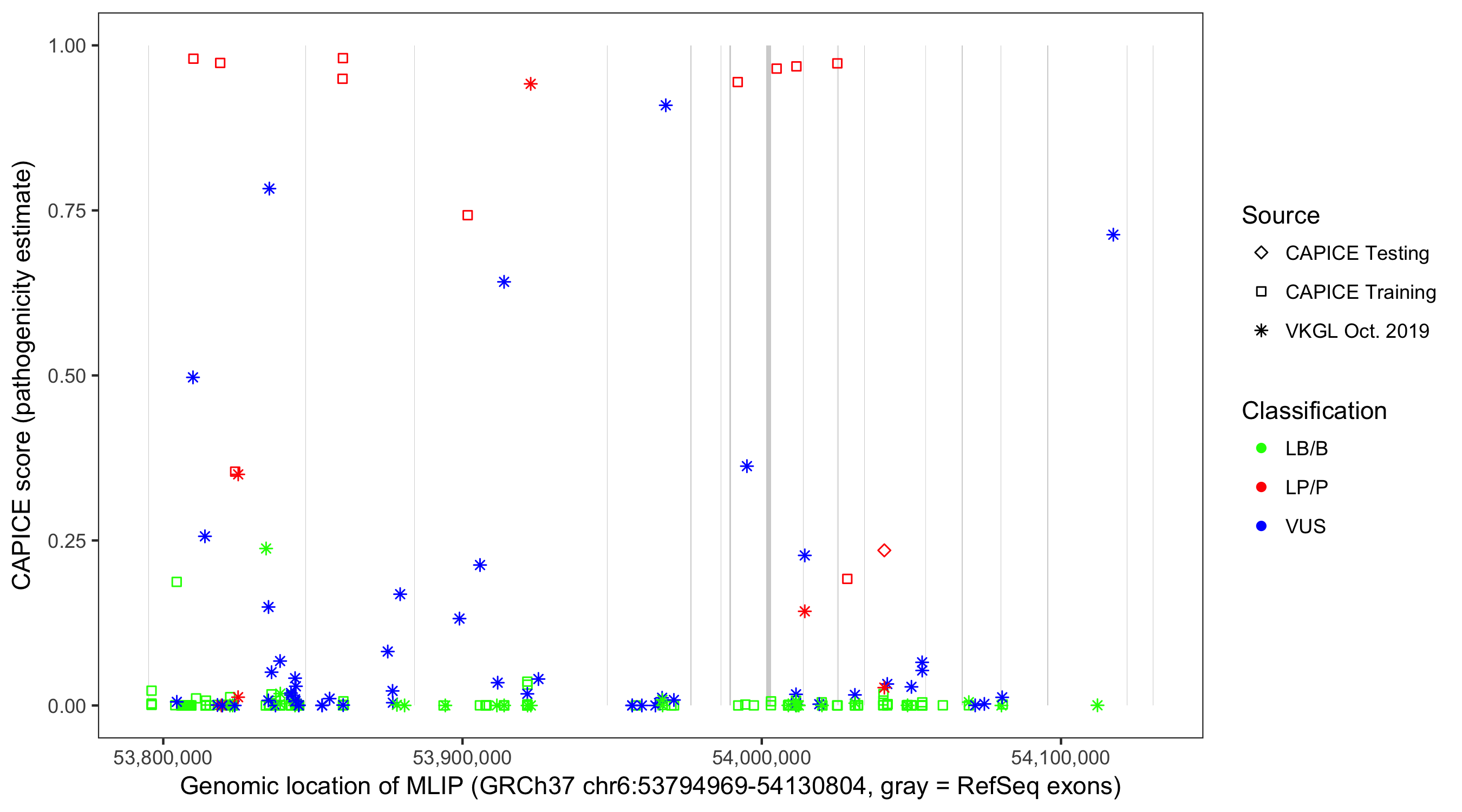 Shown are CAPICE train/test variants plus VKGL Oct 2019.
