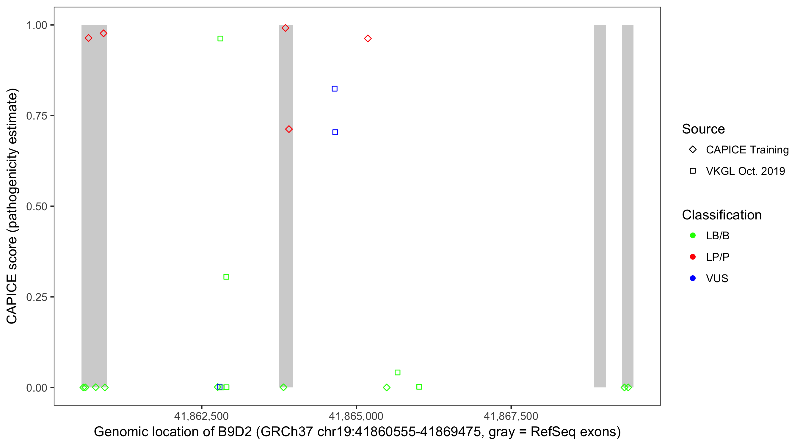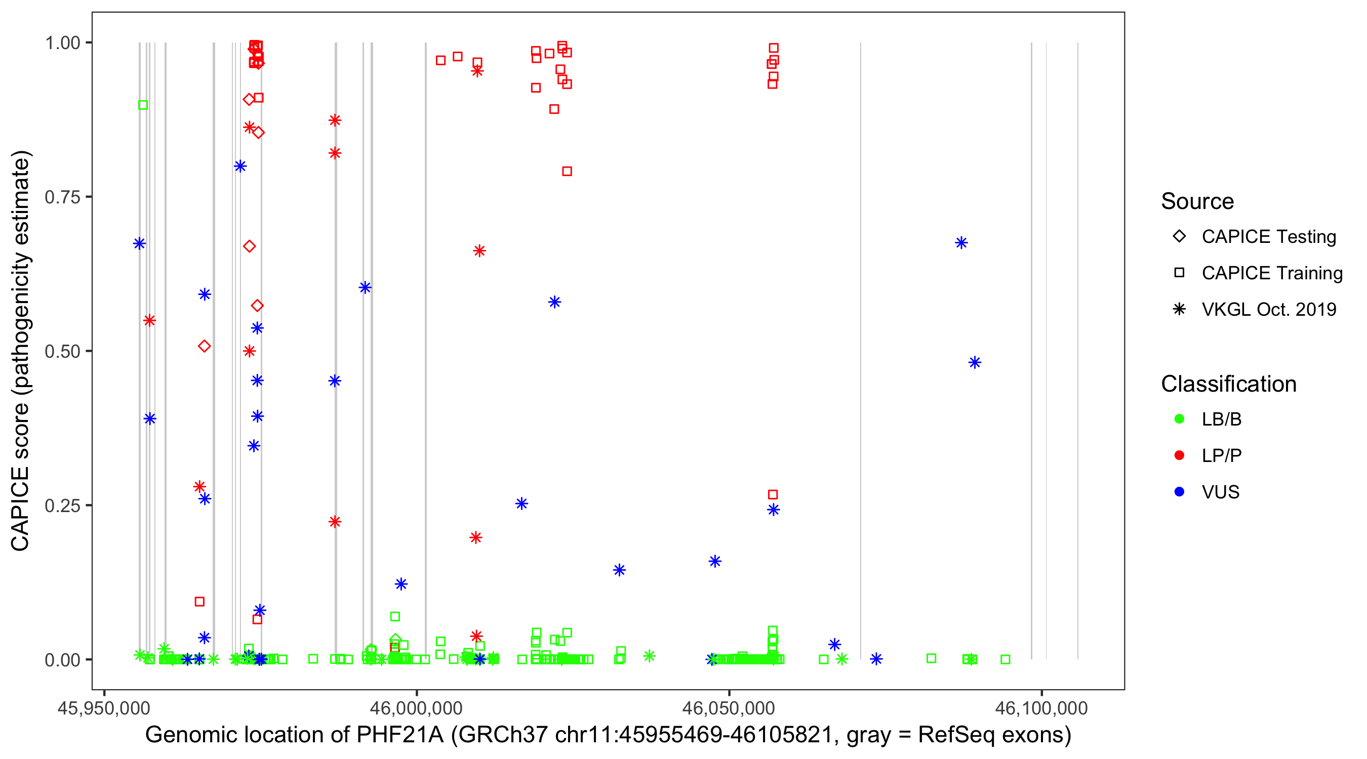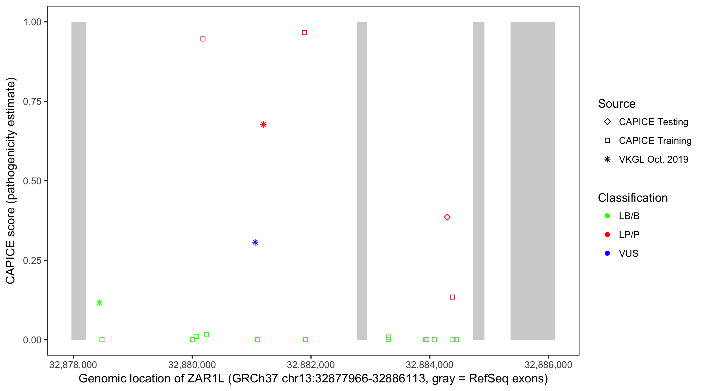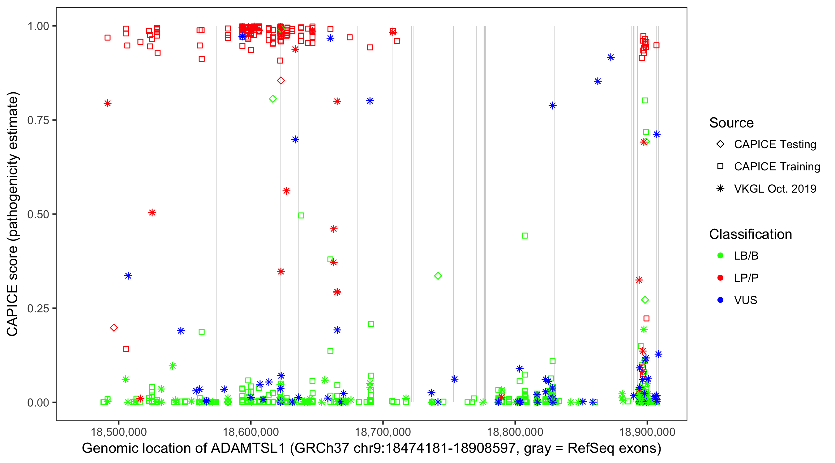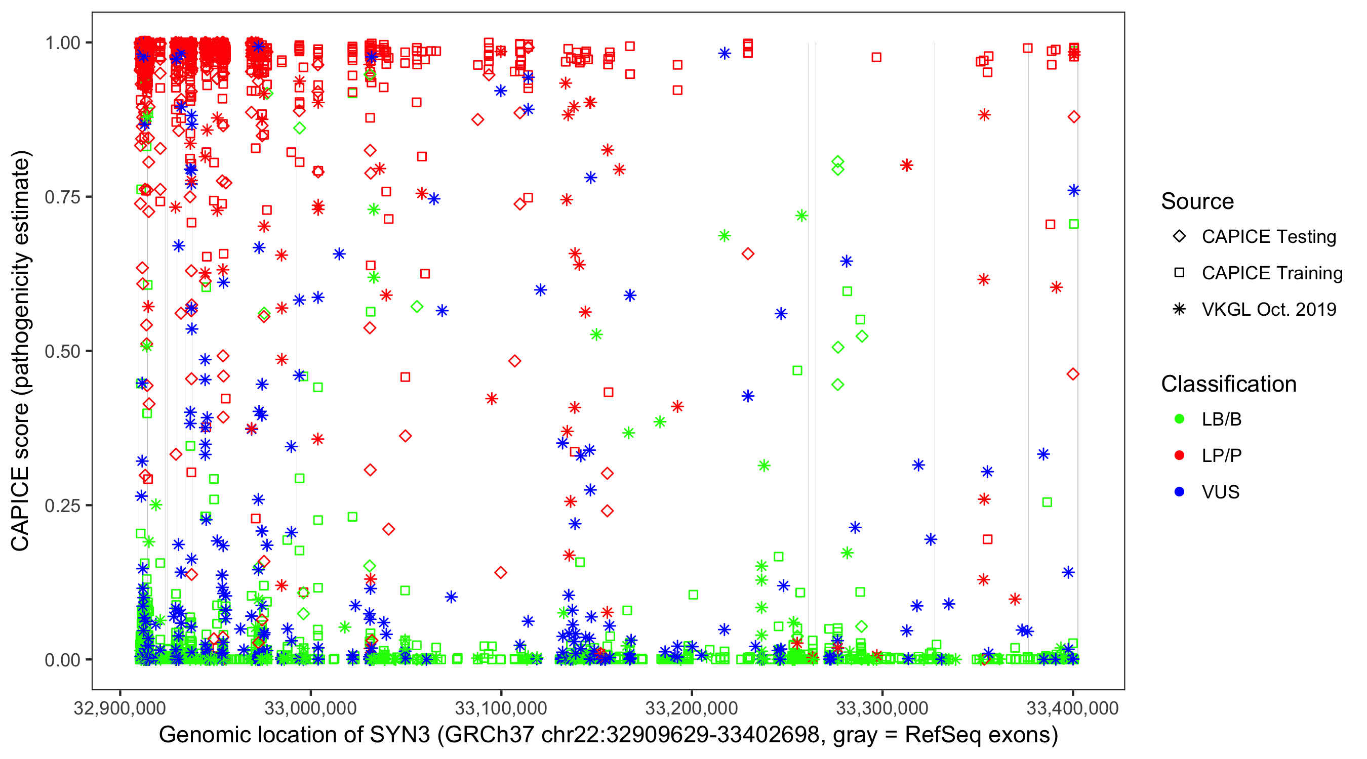Shown are CAPICE train/test variants plus VKGL Oct 2019.