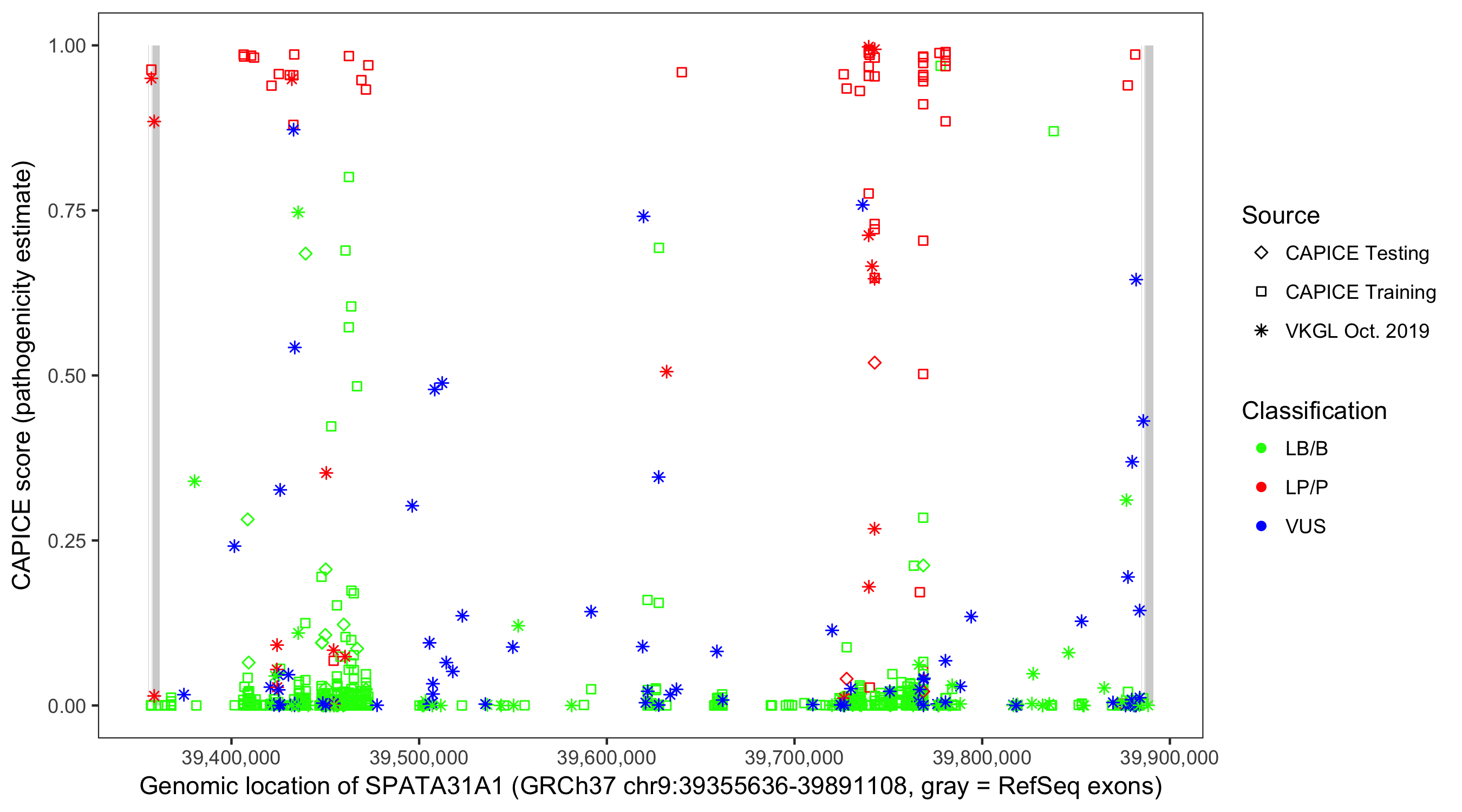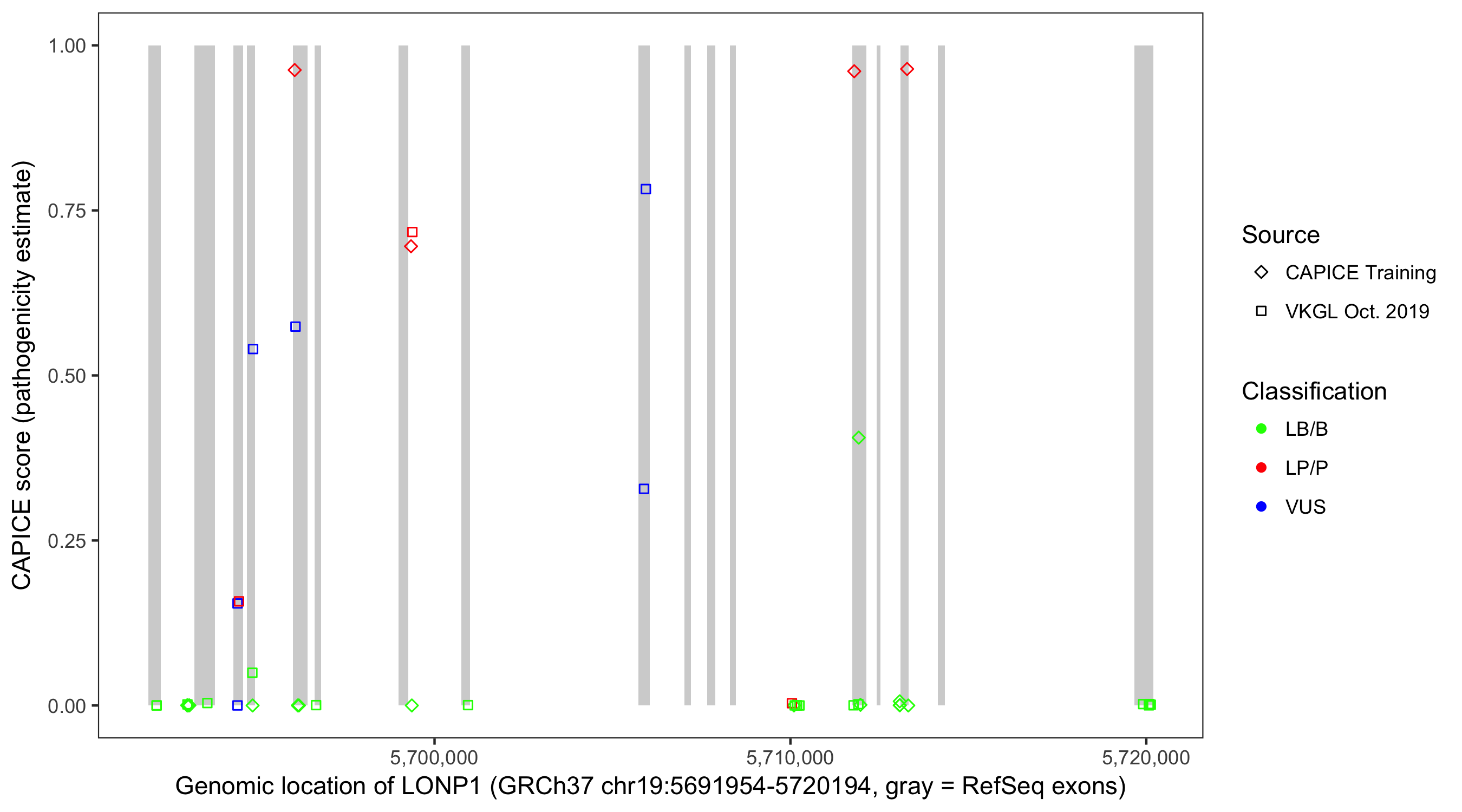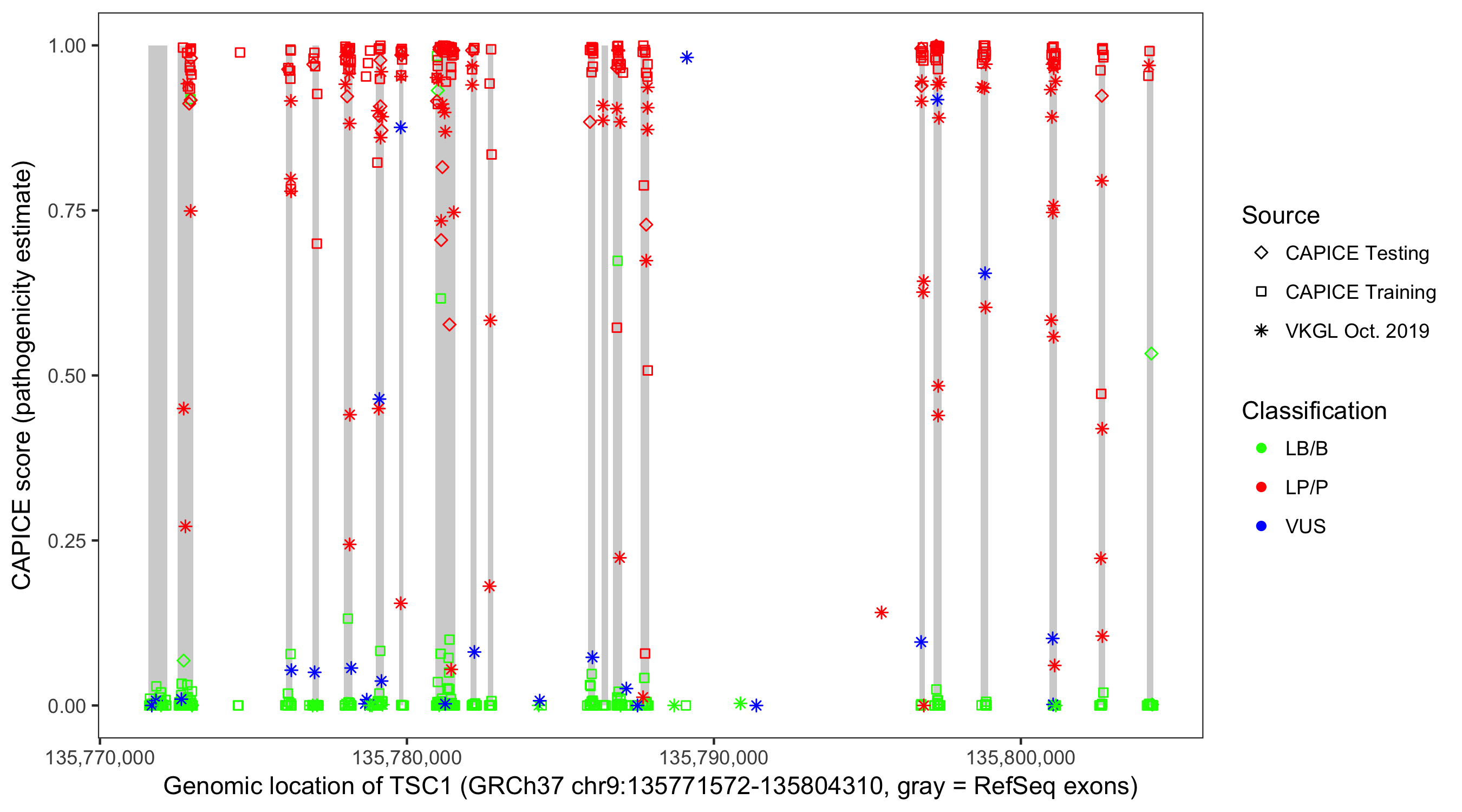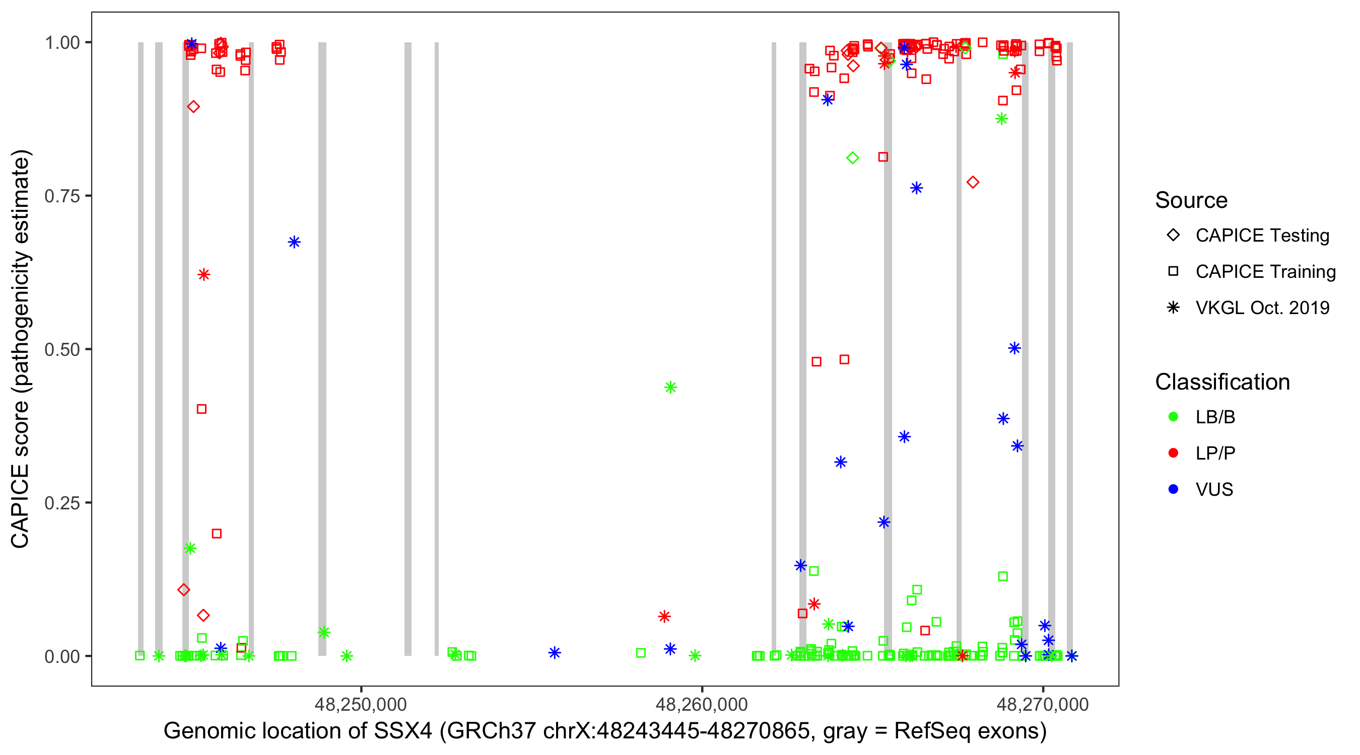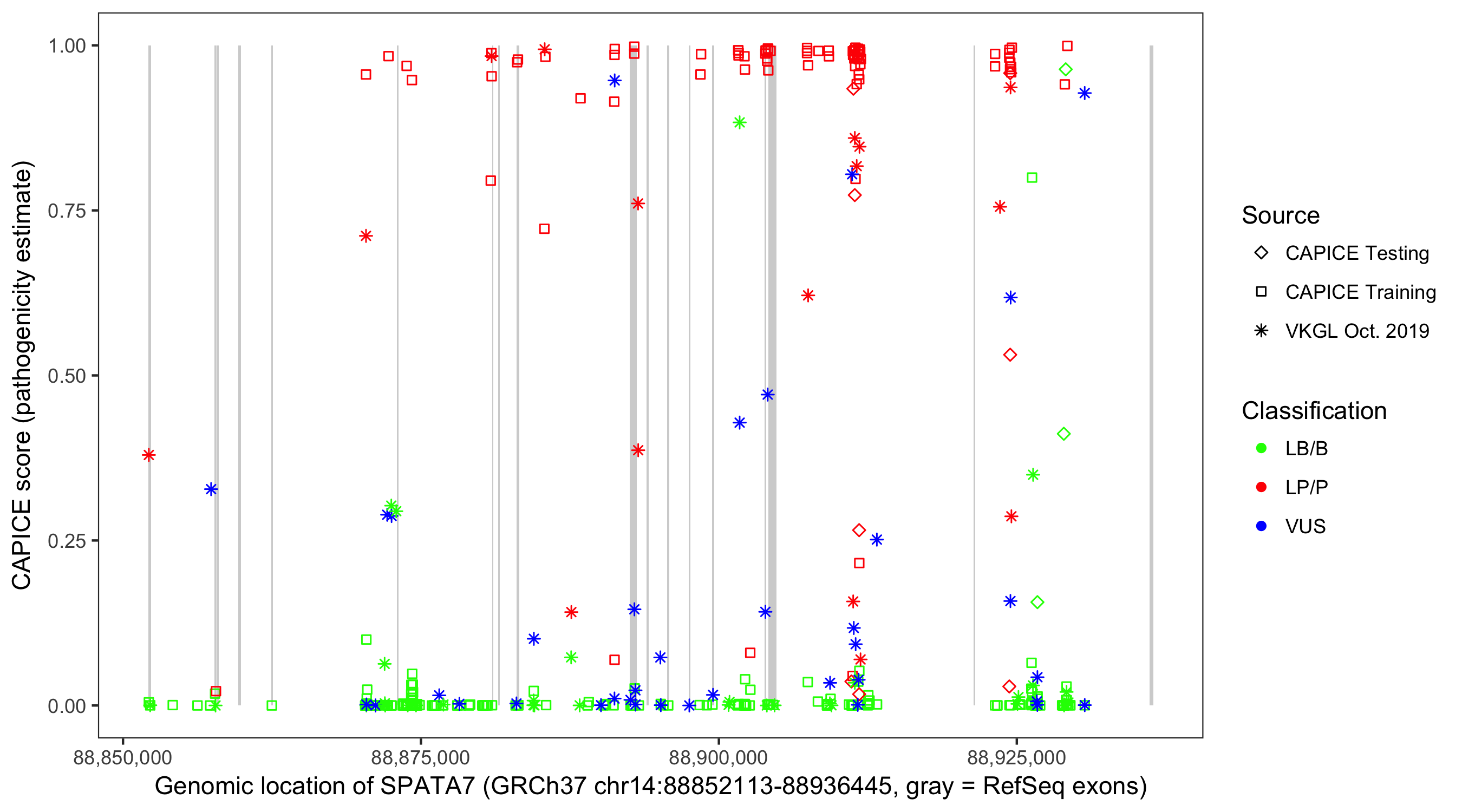 Shown are CAPICE train/test variants plus VKGL Oct 2019.